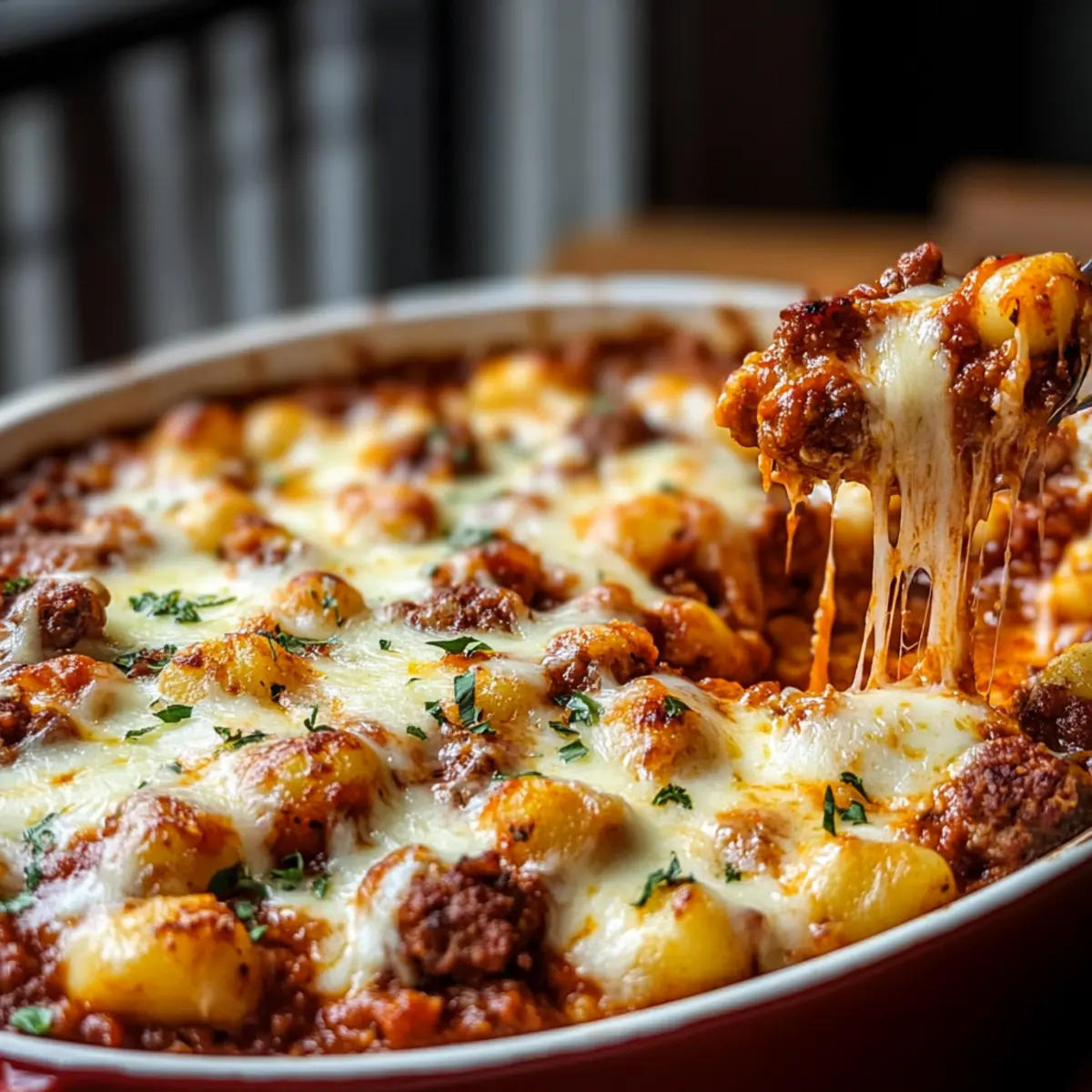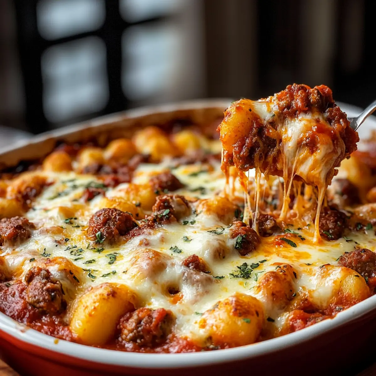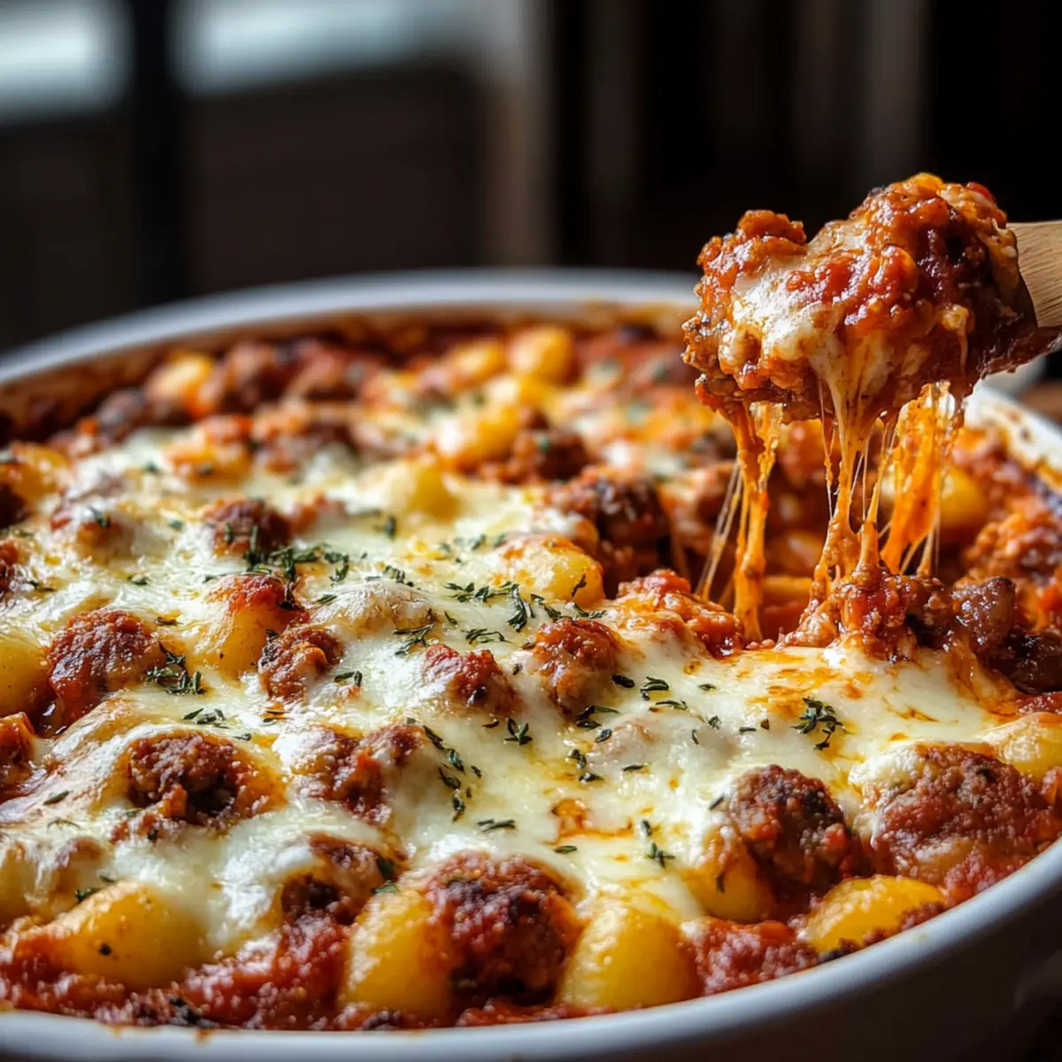 As the aroma of sizzling Italian sausage fills the kitchen, I can’t help but feel a sense of comfort wash over me. This 1-Pan Italian Sausage and Gnocchi Bake is my go-to for those busy weeknights when a home-cooked meal seems like a distant dream. With just a single pan required, this easy dinner saves both time and effort without sacrificing flavor. The melding of pillowy gnocchi, zesty marinara, and that perfect layer of melted cheese creates a satisfying dish that everyone in the family will love. Plus, the beauty lies in its adaptability—feel free to spice it up or throw in your favorite veggies for extra nutrition! Are you ready to dive into this delightful dish and discover how to make your weeknight cooking easy and enjoyable? Why is This Recipe So Irresistible? Simplicity at its finest: This 1-Pan Italian Sausage and Gnocchi Bake requires minimal prep and just one dish, making cleanup a breeze! Flavorful layers of goodness: The combination of savory sausage, fluffy gnocchi, and gooey cheese enveloped in marinara is a guaranteed crowd-pleaser. Customizable options: Adapt this dish to your taste with varying levels of spice or by adding in colorful veggies like bell peppers or spinach. Quick cooking time: In just 30 minutes, you have a hearty meal ready, perfect for busy weeknights when you crave homemade comfort. Perfect for sharing: Whether it’s a family dinner or a small gathering, this dish is sure to satisfy and delight everyone. Don’t forget to pair it with a simple green salad or garlic bread for a complete meal! 1-Pan Italian Sausage and Gnocchi Bake Ingredients For the Bake Italian Sausage – Provides a savory, rich flavor; you can substitute with turkey sausage for a lighter option. Gnocchi – Adds a light, fluffy texture; skip boiling fresh gnocchi for convenience. Marinara Sauce – Serves as the flavorful base; crushed tomatoes can replace it if necessary. Mozzarella Cheese – Melts beautifully for that gooey finish; feel free to use provolone or any melting cheese instead. Parmesan Cheese – Contributes nutty, salty depth; can be omitted or replaced with nutritional yeast for a dairy-free alternative. Olive Oil – Used for cooking the sausage; vegetable oil works as a good substitute. For the Seasoning Basil – Enhances the flavor profile; fresh is great, but dried works too. Oregano – Complements the marinara sauce; adjust to your liking for a personalized taste. Garlic Powder – Adds a savory depth; fresh minced garlic can be used for a stronger flavor. Red Pepper Flakes – Introduces a kick; increase or decrease based on your spice preference. Make this 1-Pan Italian Sausage and Gnocchi Bake an irresistible comfort for your table! Step‑by‑Step Instructions for 1-Pan Italian Sausage and Gnocchi Bake Step 1: Preheat the Oven Begin by preheating your oven to 375°F (190°C). This will ensure that your 1-Pan Italian Sausage and Gnocchi Bake cooks evenly and thoroughly. While the oven heats, gather your ingredients so they’re ready to go, making the cooking process smooth and enjoyable. Step 2: Sear the Sausage In a large oven-safe skillet, heat a drizzle of olive oil over medium heat. Once the oil shimmers, add your Italian sausage, breaking it into crumbles with a spatula. Cook for about 5-7 minutes, stirring occasionally, until browned and thoroughly cooked. The sausage should be nicely caramelized for maximum flavor. Step 3: Add the Marinara Sauce Stir in your marinara sauce along with the basil, oregano, garlic powder, and red pepper flakes. Allow the mixture to simmer gently for about 5 minutes, letting the flavors meld and the sauce thicken slightly. The aroma will start to fill your kitchen, enhancing the comfort of your 1-Pan Italian Sausage and Gnocchi Bake. Step 4: Prepare the Gnocchi While the sauce simmers, cook the gnocchi according to the package directions, typically about 2-3 minutes until they rise to the surface of the water. Once floated, drain them and gently fold the gnocchi into the sausage and sauce mixture in your skillet. Be careful not to break them, preserving their soft texture. Step 5: Assemble for Baking Transfer your sausage, gnocchi, and sauce mixture to a baking dish if your skillet isn’t oven-safe. Cover the top generously with shredded mozzarella and sprinkle Parmesan cheese for added flavor. Make sure to create an even layer of cheese to achieve that bubbly, golden finish during baking. Step 6: Bake to Perfection Place your baking dish in the preheated oven and bake for about 20 minutes. Keep an eye on it; you’ll know your 1-Pan Italian Sausage and Gnocchi Bake is done once the cheese is melted and golden brown, bubbling invitingly on top. The irresistible scent will make it hard to wait! Step 7: Let it Rest Once out of the oven, let the dish rest for about 5 minutes before serving. This step is key to allowing the sauce to thickly set, ensuring the perfect slice every time. The gooey cheese and tender gnocchi will shine through, making for a delightful presentation. Storage Tips for 1-Pan Italian Sausage and Gnocchi Bake Fridge: Store any leftover 1-Pan Italian Sausage and Gnocchi Bake in an airtight container for up to 3 days. Allow it to cool before sealing to preserve freshness. Freezer: This dish can be frozen for up to 2 months. Portion it into freezer-safe containers, and make sure to label them with the date. Thaw overnight in the fridge before reheating. Reheating: For best results, reheat portions in the microwave or place the entire dish in the oven at 350°F (175°C) for about 15 minutes until warmed through. Airtight: Ensure any stored leftovers are completely sealed to prevent drying out and maintain the comforting flavors of your 1-Pan Italian Sausage and Gnocchi Bake. Make Ahead Options These 1-Pan Italian Sausage and Gnocchi Bake components are perfect for meal prep enthusiasts! You can prepare the sausage and sauce mixture up to 24 hours in advance. Simply cook the sausage, mix in the ma