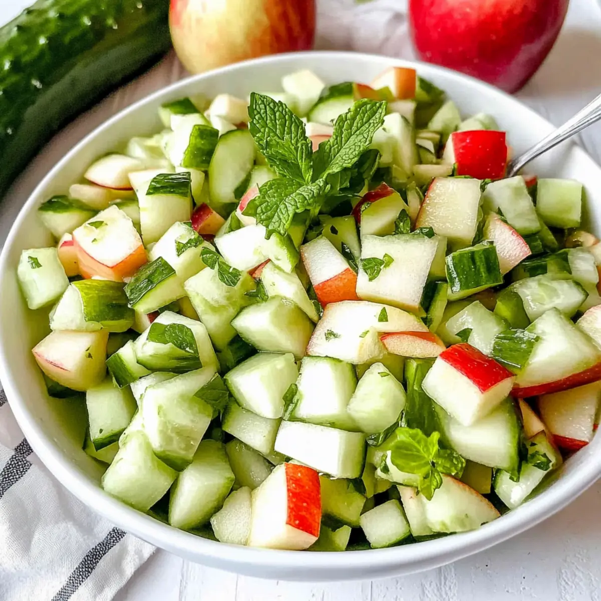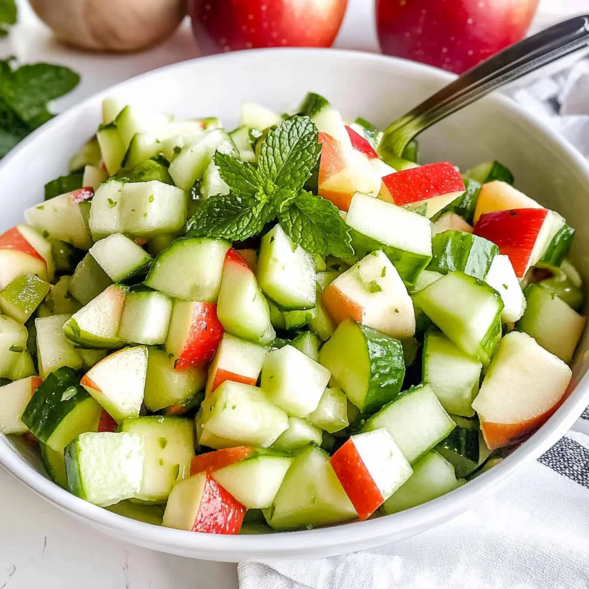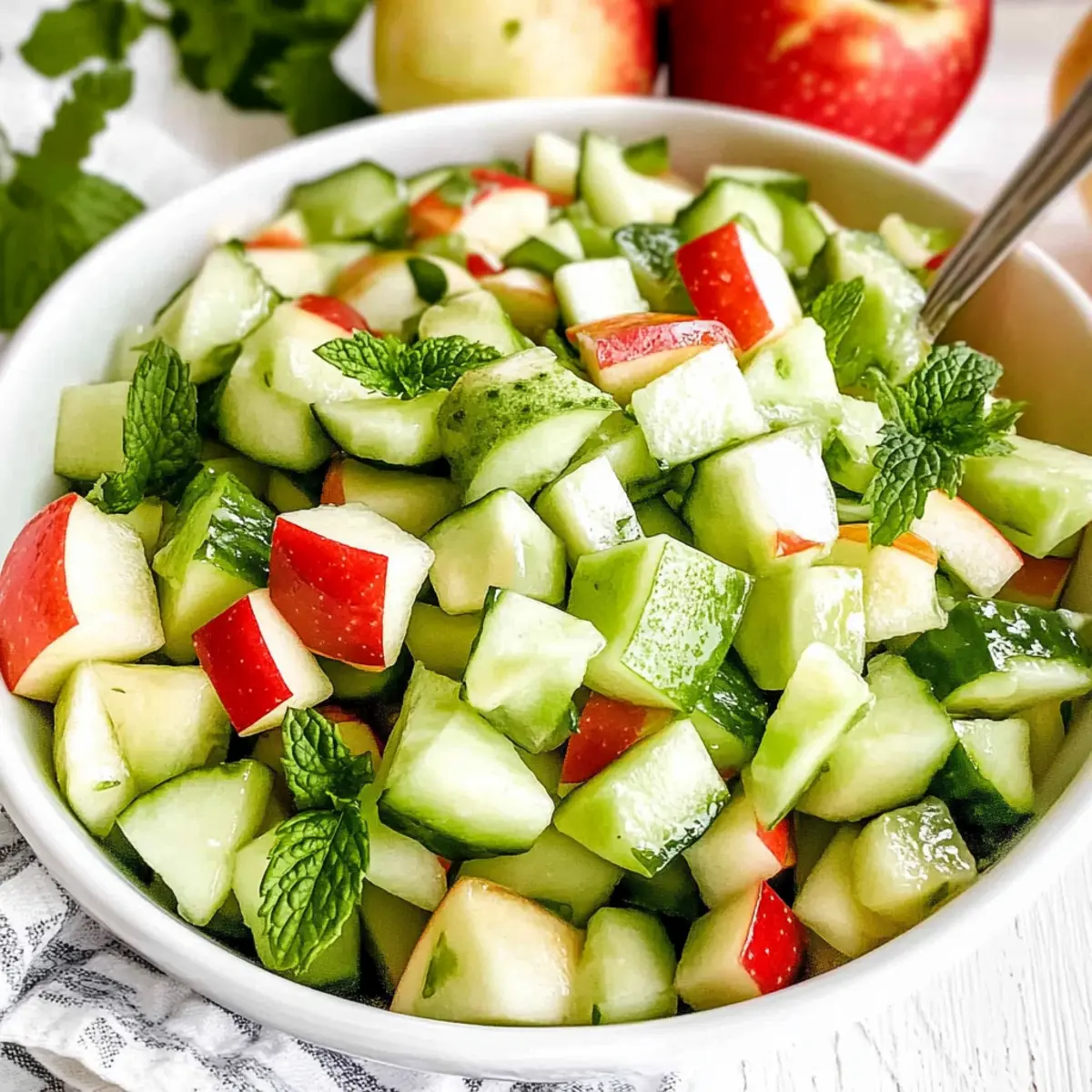 “Summer is here, and I’m all about finding ways to beat the heat in the kitchen. One of my absolute go-to recipes for a refreshing bite is this Apple and Cucumber Salad, featuring a zesty mint dressing that sings with flavor. Not only is it incredibly quick to whip up—ready in just 10 minutes—but it’s also a fantastic crowd-pleaser at barbecues and picnics alike. The crispness of the cucumbers merges beautifully with the sweetness of apples, making it the perfect side dish for your favorite grilled entrees or a light lunch on its own. Plus, it’s vegan and gluten-free, aligning perfectly with a variety of dietary needs. Are you ready to elevate your summer salad game?” Why Is This Salad a Must-Try? Refreshing and perfect for summer, this Apple and Cucumber Salad is your new go-to side dish! Vegan and gluten-free, it caters to a wide array of dietary preferences. Easy preparation means you can whip it up in just 10 minutes—no kitchen skills required! Versatile enough to pair with grilled meats or enjoyed solo for lunch, you’ll crave its vibrant flavors time and again. As a bonus, the use of fresh mint in the dressing adds an unexpected twist, elevating the entire taste experience. If you’re looking for more light dishes, check out the refreshing Cucumber Strawberry Salad or the delicious Cheesecake Fruit Salad for your next gathering! Apple and Cucumber Salad Ingredients For the Salad • English cucumber – Provides a refreshing crunch; Persian cucumber can be substituted if needed. • Red apple – Adds sweetness to the salad; consider using a green apple for a tart twist. • Green apple – Contributes tartness to balance the sweetness; using all red apples increases sweetness. For the Dressing • Extra virgin olive oil – Acts as the rich base of the dressing; always opt for high-quality oil for the best flavor. • Apple cider vinegar – Provides acidity and tang; can be replaced with white distilled vinegar for a low histamine option. • Mint leaves – Imparts a fresh flavor; substitute with fresh basil or cilantro if mint is unavailable. • Salt – Enhances all the flavors in the salad. Step‑by‑Step Instructions for Apple and Cucumber Salad Step 1: Prepare the Produce Start by washing your ingredients thoroughly. Dice the English cucumber, red apple, and green apple into small, bite-sized pieces for an appealing presentation. Optionally peel the cucumber if you prefer a smoother texture. Aim for uniform sizes to ensure a consistent crunch in this refreshing Apple and Cucumber Salad. Set the chopped fruits and vegetables aside in a large mixing bowl. Step 2: Make the Dressing In a small bowl, finely chop a handful of fresh mint leaves. Combine the mint with extra virgin olive oil, apple cider vinegar, and a pinch of salt. Whisk the mixture until the dressing is well blended and creamy, which should take about 30 seconds. This vibrant dressing will elevate your Apple and Cucumber Salad, adding a delightful burst of freshness. Step 3: Combine Ingredients In the bowl with your diced apples and cucumber, drizzle your freshly made dressing over the top. Gently toss the ingredients together using a large spoon, ensuring that every piece is coated in the mint dressing. The colors and textures should meld beautifully, creating a stunning Apple and Cucumber Salad that looks as good as it tastes. Serve immediately for the freshest experience! How to Store and Freeze Apple and Cucumber Salad Fridge: Store leftovers in an airtight container for up to 1 day. Keep in mind that the apples may brown slightly over time. Freezer: Not recommended for freezing as the texture of both cucumbers and apples will suffer once thawed. Enjoy this salad fresh! Reheating: Serve the salad chilled or at room temperature; do not heat, as it is best enjoyed fresh for optimal flavor and crunch. Preparation Tip: For meal prep, you can chop the cucumbers and apples separately and store them, mixing only when ready to serve to maintain freshness. What to Serve with Refreshing Apple and Cucumber Salad? This vibrant salad can effortlessly elevate your meal, pairing beautifully with a range of dishes that complement its crisp and refreshing nature. Grilled Chicken Skewers: Juicy, marinated chicken adds a smoky flavor that contrasts wonderfully with the salad’s bright notes. Quinoa Pilaf: Nutty quinoa brings a hearty texture, making your meal wholesome while maintaining an appealing freshness that echoes the salad. Lemon Herb Grilled Fish: The zingy flavors of lemon and herbs in grilled fish pair flawlessly, enhancing the salad’s crisp experience. Veggie Burger: A satisfying vegetarian option that not only satisfies hunger but also complements the light nature of the salad. Chilled Gazpacho: This refreshing Spanish soup packed with tomatoes and herbs enhances the cooling elements of the Apple and Cucumber Salad. Sparkling Water with Lime: Toast your meal with this refreshing drink, rounding off the flavors and adding a zesty twist. Chocolate Avocado Mousse: For dessert, this creamy and rich indulgence offers a delightful balance to the lightness of the salad, making for a perfectly satisfying meal. Apple and Cucumber Salad Variations Feel free to explore creative twists on this refreshing salad, making it your own! Herb Swap: Substitute mint with fresh basil or cilantro for a different herbal flavor profile. Add Nuts: Toss in some walnuts or almonds for a delightful crunch and added protein. Spicy Kick: Add sliced jalapeños or red pepper flakes to introduce a zesty heat that enlivens each bite. Citrus Zing: Swap apple cider vinegar for lemon or lime juice to brighten the salad’s flavors with a citrusy tang. Creamy Dressing: Use tahini mixed with dill as an alternative dressing for a creamy yet herbaceous twist. Fruity Boost: Incorporate diced mango or pineapple for a tropical touch that complements the apples and cucumber beautifully. Grainy Addition: Mix in cooked quinoa or farro for