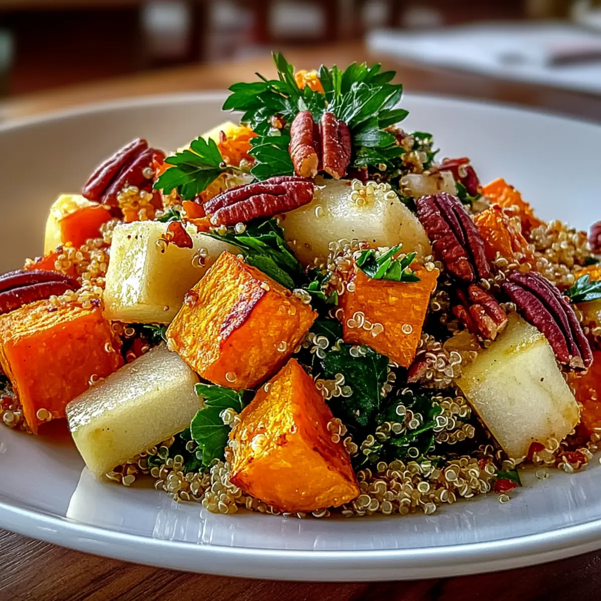 There’s nothing quite like curling up with a warm bowl of comfort as the chilly evenings start to settle in. Enter my Apple Sweet Potato Quinoa Salad—a delightful fusion of roasted sweet potatoes, crisp apples, and fluffy quinoa that’s sure to warm your heart and nourish your body. Not only does this salad come together in under an hour, but it’s also packed with nutrition and flavor, making it a fantastic choice for both family dinners and meal prep. With just the right hint of cinnamon and a satisfying crunch from pecans, it becomes a vibrant centerpiece on your table. Are you ready to elevate your dinner game with this wholesome dish? Let’s dive in! Why choose Apple Sweet Potato Quinoa Salad? Colorful, Wholesome Ingredients: This salad is a beautiful medley of roasted sweet potatoes and crisp apples, making it as pleasing to the eye as it is to the palate. Nutrient-Dense & Satisfying: Packed with protein from quinoa and healthy fats from pecans, it provides a fulfilling, nutritious meal to power your day. Quick & Convenient: Ready in under an hour, it’s ideal for busy weeknights or meal prep, so you can enjoy wholesome goodness without the hassle. Customizable Delight: Feel free to add seasonal ingredients or proteins; try it with chickpeas for an extra boost! Crowd-Pleasing Flavors: With a hint of cinnamon and smoked paprika, this dish strikes the perfect balance between sweet and savory, ensuring everyone will love it – even kids! Perfect Pairing Options: Serve it alongside your favorite roasted meats or as a hearty stand-alone lunch, perfectly complementing any meal. Apple Sweet Potato Quinoa Salad Ingredients For the Salad • Quinoa – a protein-rich base; white or red quinoa is ideal for texture. • Sweet Potatoes – add natural sweetness and essential vitamins; opt for fresh ones for the best flavor. • Apples – impart a delicious crunch and tartness; Honeycrisp or Gala apples work wonderfully. • Pecans – lend a delightful crunch and healthy fats; toasting enhances their flavor. For the Dressing & Seasoning • Olive Oil – used for roasting and dressing, adding richness; avocado oil can be a great alternative. • Cinnamon – elevates the warmth of the sweet potatoes; it’s a must for that comforting vibe! • Smoked Paprika – provides depth without being overpowering; adjust to cater to milder tastes. • Apple Cider Vinegar – introduces a zing that balances the salad’s sweetness; lemon juice is a good swap if needed. For Garnish • Fresh Parsley – brightens the dish and adds a pop of color; feel free to substitute with cilantro if preferred. This Apple Sweet Potato Quinoa Salad is not only packed with flavor but also offers a nutritious boost to your meals! Step‑by‑Step Instructions for Apple Sweet Potato Quinoa Salad Step 1: Prep Ingredients Start by rinsing 1 cup of quinoa under cold water in a fine-mesh strainer to remove any bitterness. Meanwhile, peel and chop 2 medium sweet potatoes into bite-sized cubes and dice 1-2 crisp apples like Honeycrisp or Gala. This step sets the foundation for your Apple Sweet Potato Quinoa Salad, ensuring fresh flavors and textures. Step 2: Roast Sweet Potatoes Preheat your oven to 425°F (220°C). Toss the chopped sweet potatoes in a bowl with 2 tablespoons of olive oil, 1 teaspoon of cinnamon, and ½ teaspoon of smoked paprika until thoroughly coated. Spread them on a baking sheet in a single layer and roast for about 25 minutes, or until golden and tender, stirring halfway through for even caramelization. Step 3: Cook Quinoa While the sweet potatoes roast, bring 2 cups of water to a boil in a saucepan. Add the rinsed quinoa, reduce the heat to low, and cover. Simmer for approximately 15 minutes or until the quinoa is fluffy and water is absorbed. Once cooked, fluff with a fork and set aside to cool slightly while your other ingredients finish. Step 4: Combine Ingredients In a large mixing bowl, combine the cooked quinoa, roasted sweet potatoes, and chopped apples. Add ½ cup of toasted pecans for that satisfying crunch. This combination creates a delightful medley of textures and flavors, truly embodying the essence of the Apple Sweet Potato Quinoa Salad. Step 5: Dress Salad Drizzle the salad mixture with 3 tablespoons of apple cider vinegar and an additional tablespoon of olive oil. Toss everything gently but thoroughly to ensure the flavors meld together beautifully. This dressing will enhance the natural sweetness of the apples and sweet potatoes while providing a delicious tang. Step 6: Serve Garnish the salad with freshly chopped parsley for a touch of color and freshness. Serve the Apple Sweet Potato Quinoa Salad warm or at room temperature, perfect for cozy family dinners or as a nutritious lunch option. This vibrant dish is sure to become a favorite around your table! Storage Tips for Apple Sweet Potato Quinoa Salad Fridge: Store leftovers in an airtight container for up to 3 days. This ensures your Apple Sweet Potato Quinoa Salad stays fresh and flavorful. Freezer: While quinoa salads are best enjoyed fresh, you can freeze portions in airtight containers for up to 1 month. Thaw overnight in the fridge before serving. Reheating: To enjoy warm, gently reheat in the microwave, adding a splash of olive oil or a drizzle of vinegar to maintain moisture. Keep Separate: If prepping for the week, consider storing the dressing separately until ready to serve, preserving the crunch of the pecans and brightness of the flavors. Apple Sweet Potato Quinoa Salad Variations Feel free to get creative and customize this delightful salad with these fun twists! Protein Boost: Add chickpeas or grilled chicken to amp up the protein content. This simple addition will create a heartier meal that’s satisfying and nutritious. Seasonal Exchange: Swap in seasonal veggies like kale or roasted Brussels sprouts for a different vibe. You could even toss in some pomegranate seeds for a burst of tartness! Grain Swap: Chan