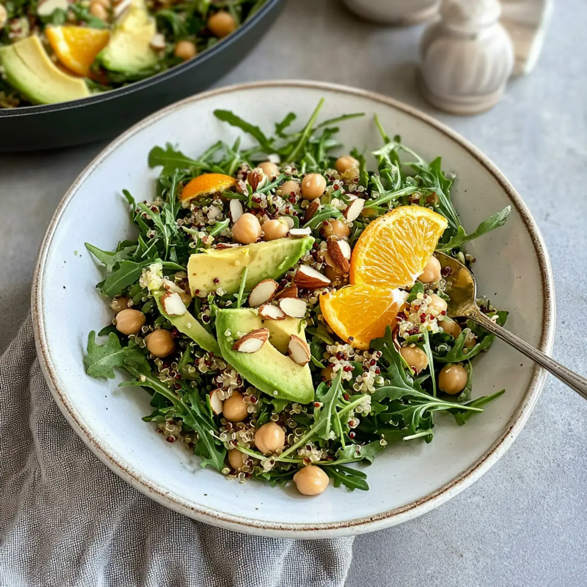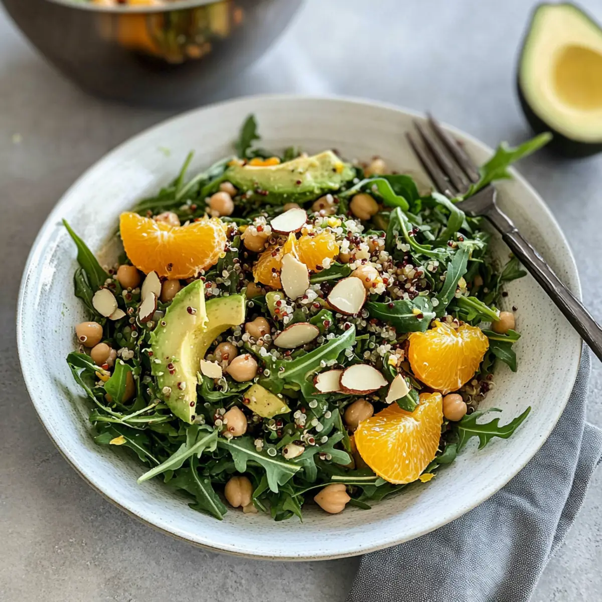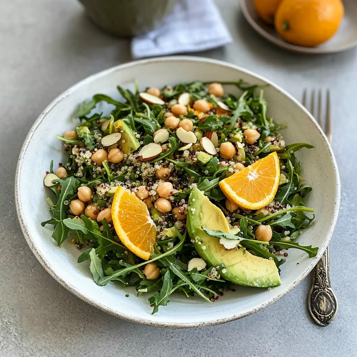 As I sliced into a juicy orange, the bright citrus aroma enveloped my kitchen, transporting me to sun-drenched gardens. This Crisp Arugula Citrus Salad with Chickpeas and Quinoa is a tribute to those vibrant spring days when fresh ingredients take center stage. This recipe celebrates the peppery bite of fresh arugula paired with the sweetness of orange, making it an irresistible option for anyone seeking a nourishing and flavorful meal. Not only is it quick to whip up, but it also caters to various dietary needs, whether you’re gluten-free, vegan, or simply craving a healthy dish that feels indulgent. With the added protein from chickpeas and the hearty texture of quinoa, this salad ensures you’ll be satisfied and refreshed. Ready to dive into a bowl of sunshine? Why is This Salad So Refreshing? Vibrant, Fresh Ingredients: Each component of this salad shines with flavor, from the crispness of arugula to the sweetness of juicy oranges. Nutritious Powerhouse: Packed with protein and fiber from chickpeas and quinoa, it’s a satisfying choice that keeps hunger at bay. Quick and Easy: In just 30 minutes, you can prepare this beautiful dish, making it a perfect option for busy weeknights or spontaneous gatherings. Highly Customizable: Base your salad on seasonal ingredients! Swap oranges for grapefruit or experiment with different leafy greens like spinach to suit your taste. Perfect Pairing: This salad complements grilled salmon or chicken wonderfully, making it not just a meal on its own but a fantastic side dish as well. With these compelling reasons, you’ll see why this Arugula Citrus Salad is a must-try for anyone looking to add a touch of freshness to their table! Arugula Citrus Salad Ingredients • Dive into the vibrant flavors of this refreshing salad! For the Base Quinoa – Provides a satisfying base; substitute with farro or brown rice if preferred. Chickpeas – Adds protein and fiber for a filling aspect; can swap with black beans for variation. For the Greens Arugula – Offers a peppery flavor and fresh texture; other leafy greens like spinach can be substituted. For the Creaminess Avocados – Adds a creamy texture; cut into cubes, or replace with diced cucumber for a lighter option. Feta Cheese – Adds a salty creaminess; omit for a vegan version or substitute with tofu feta. For the Citrus Orange – Provides sweetness and acidity; can substitute with grapefruit for a tangy twist. For the Crunch Slivered Almonds – Adds crunch; ensure they are toasted for enhanced flavor—walnuts or pecans work well too! For the Vinaigrette Olive Oil – Acts as the base for the vinaigrette; any neutral oil like avocado or canola is suitable. Orange Juice – Enhances citrus flavor in the vinaigrette; can be swapped with lemon juice if needed. Lemon Juice – Adds acidity; use more orange juice if you don’t have fresh lemons. Garlic – Provides depth to the vinaigrette; garlic powder can be a quick alternative. Dijon Mustard – Acts as an emulsifier in the dressing; omit if allergic or replace with a vegan-friendly mustard. Maple Syrup – Adds a touch of sweetness to the dressing; honey or agave syrup can also be used. Red Onion/Shallots – Enhances the dressing flavor; green onions can be a nice substitute. For Seasoning Salt & Pepper – Basic seasonings to taste; add a pinch of each to elevate flavors. Get ready to enjoy a delicious Arugula Citrus Salad filled with cheerful ingredients! Step‑by‑Step Instructions for Arugula Citrus Salad Step 1: Cook Quinoa Rinse 1 cup of quinoa under cold water until it runs clear, then transfer it to a pot with 2 cups of vegetable broth. Bring the mixture to a boil over medium-high heat, then reduce to a simmer, cover, and cook for 15-20 minutes until all the liquid is absorbed. Fluff the quinoa with a fork and set aside to cool while you prepare the other ingredients. Step 2: Toast Almonds Preheat your broiler and spread 1/4 cup of slivered almonds evenly on a baking sheet. Place the sheet on the top rack and toast the almonds for 2-3 minutes, watching closely to prevent burning. Once they’re golden brown and fragrant, remove them from the oven and let them cool while you continue with the salad. Step 3: Prepare Dressing In a medium bowl, whisk together 1/4 cup of olive oil, 2 tablespoons of orange juice, and 1 tablespoon of lemon juice. Add 1 clove of minced garlic, 1 teaspoon of Dijon mustard, and a drizzle of maple syrup to the mixture. Season with salt and pepper to taste, whisking until the dressing is well combined and emulsified, perfect for your Arugula Citrus Salad. Step 4: Combine Salad In a large mixing bowl, add 4 cups of fresh arugula and half of the prepared dressing; toss gently to coat the arugula leaves evenly. Next, incorporate the cooled quinoa, 1 can of drained and rinsed chickpeas, sliced oranges, cubed avocado, toasted almonds, and crumbled feta cheese. Drizzle the remaining dressing over the top and toss to combine thoroughly. Step 5: Serve & Enjoy For the best taste, serve your vibrant Arugula Citrus Salad immediately, or you can refrigerate it for half an hour for a refreshing chilled option. This salad not only bursts with flavor but also brings a delightful crunch to your table, making it a perfect dish for any occasion! Arugula Citrus Salad Variations Feel free to get creative and transform this salad into something uniquely yours with these delightful twists! Grilled Chicken: Add sliced grilled chicken for a boost of protein and extra flavor that complements the salad beautifully. Kale Substitute: Swap arugula for kale to create a heartier base; remember to massage the kale slightly to soften it before mixing. Berry Burst: Toss in fresh berries such as strawberries or blueberries for a sweet and vibrant pop of color that brightens every bite. Citrus Mix: Experiment with different citrus fruits, like grapefruit or tangerines, to change the salad’s flavor profile and add tanginess. Creamy Vegan Option: 