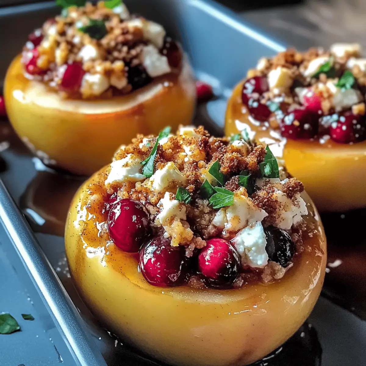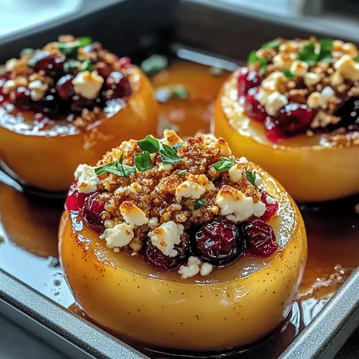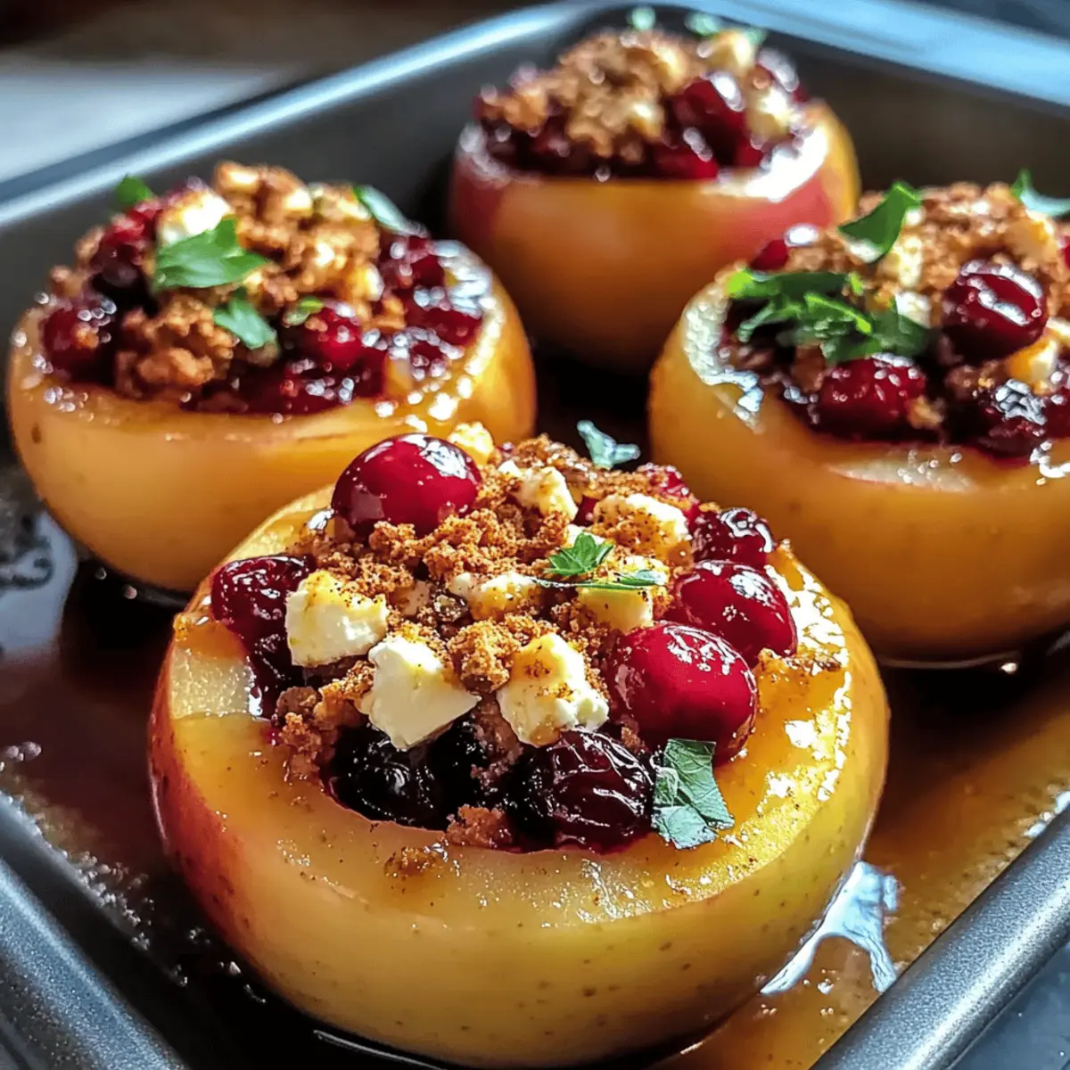 As I breathed in the warm scent wafting from the oven, a sense of nostalgia washed over me. My latest creation, Baked Apples with Feta, Honey, and Cranberries, is not just a dish; it’s a heartfelt embrace in dessert form. This vegetarian delight marries the tender sweetness of baked apples with a tangy feta filling, kissed by honey and tart cranberries. It’s perfect for intimate gatherings or as a cozy evening treat, offering quick prep and comforting flavors that brighten any day. With every bite, you’ll feel the delightful contrast of textures, from the creamy filling to the soft apple. Curious about how this warm, inviting dish will transform your kitchen into a cozy haven? Let’s dive into this sweet and savory adventure together! How can you elevate baked apples? Uniqueness: This recipe combines baked apples with a luscious feta filling, setting it apart from traditional desserts. Versatility: Swap in various fruits or cheeses, like goat cheese or pears, to suit your tastes. Quick Prep: With minimal ingredients and easy instructions, this dish is perfect for spontaneous gatherings. Double Duty: Enjoy it warm as a dessert or serve it chilled as an elegant snack option, similar to my Sweet Potato Black Bean Patties. Crowd-Pleaser: The delightful balance of sweet, savory, and tart flavors will please everyone at the table. Healthy Indulgence: Each serving is approximately 190 calories, making it a guilt-free treat that’s both satisfying and nourishing. Baked Apples with Feta, Honey, and Cranberries Ingredients • Discover the delightful components that create this cozy dessert! For the Apples Firm Apples – Choose Granny Smith or Honeycrisp for the best texture and sweetness. For the Filling Feta Cheese – Provides a creamy, tangy base; goat cheese works beautifully as a mild substitute. Dried Cranberries – Adds a tart contrast; feel free to swap in raisins or chopped dates for sweetness. Ground Cinnamon – Brings warmth to the dish; adjust the spice level to suit your palate. Vanilla Extract – Enhances depth, and consider using homemade for a richer flavor. For the Sweetness Honey – Drizzles over apples for natural sweetness; maple syrup can be an excellent vegan alternative. Butter – Boosts richness and helps caramelize the apples; use plant-based butter for a dairy-free option. Step‑by‑Step Instructions for Baked Apples with Feta, Honey, and Cranberries Step 1: Preheat the Oven Begin by preheating your oven to 375°F (190°C). While it heats up, take a baking dish and grease it generously with butter or a non-stick cooking spray. This ensures the baked apples will be easy to remove later, allowing all those delightful flavors from the Baked Apples with Feta, Honey, and Cranberries to shine. Step 2: Prepare the Apples Next, core each apple carefully using an apple corer or a knife, making sure to leave the bottom intact. This will help hold the delicious filling inside the apple. As you work, place each cored apple upright in your greased baking dish, showcasing their lovely shapes and sturdy bases, ready to be filled with goodness. Step 3: Mix the Filling In a mixing bowl, combine the creamy feta, dried cranberries, ground cinnamon, and vanilla extract. Stir gently until well incorporated. The mixture should have a nice balance of sweetness and tanginess, perfect for the soft baked apples. This filling will bring a burst of flavor to every bite of your Baked Apples with Feta, Honey, and Cranberries. Step 4: Stuff the Apples Using a spoon, fill each cored apple with the feta and cranberry mixture. Press gently to ensure it’s packed nicely, but be careful not to overfill, as they will expand while baking. Each apple should be generously filled so that the delightful flavors meld beautifully during the cooking process. Step 5: Drizzle with Honey Once the apples are filled, take your honey and drizzle a generous amount over each one. This will create a beautiful caramelized layer as they bake, enhancing the flavors of the apples and the filling. Topping each apple with a small pat of butter will add richness, elevating your Baked Apples with Feta, Honey, and Cranberries. Step 6: Bake Covered Cover the baking dish with foil, creating a tent over the apples. This will trap moisture and help soften them as they bake. Place the dish in your preheated oven and let the apples bake for 25–30 minutes. Keep an eye on them; they should become tender yet hold their shape, creating that perfect texture. Step 7: Bake Uncovered After the initial baking time, remove the foil from the dish and return the apples to the oven. Bake uncovered for an additional 5–10 minutes. This step allows the tops to slightly brown and caramelize, providing a delicious contrast to the soft insides of your Baked Apples with Feta, Honey, and Cranberries. Step 8: Cool and Serve Once browned to your liking, take the apples out of the oven and let them cool for a few minutes. This will make them easier to handle and serve. Garnish them with a sprig of fresh mint for a pop of color and a hint of freshness, then serve warm to enjoy all the comforting flavors you’ve created. Make Ahead Options These Baked Apples with Feta, Honey, and Cranberries are ideal for meal prep, allowing you to enjoy a warm dessert on busy weeknights. You can prepare the filling (feta, cranberries, cinnamon, and vanilla) up to 24 hours in advance and store it in the refrigerator to keep it fresh. Additionally, you can core the apples and keep them in water with a splash of lemon juice to prevent browning until you’re ready to fill them. Just before baking, stuff the apples with the prepared filling, drizzle with honey, and bake as directed. This way, you’ll have a delightful, cozy dessert that’s just as delicious and ready in no time! Baked Apples with Feta, Honey, and Cranberries Variations Feel free to personalize your baked apples and make them uniquely yours with these creative twists! Cheese Swap: Use goat chee