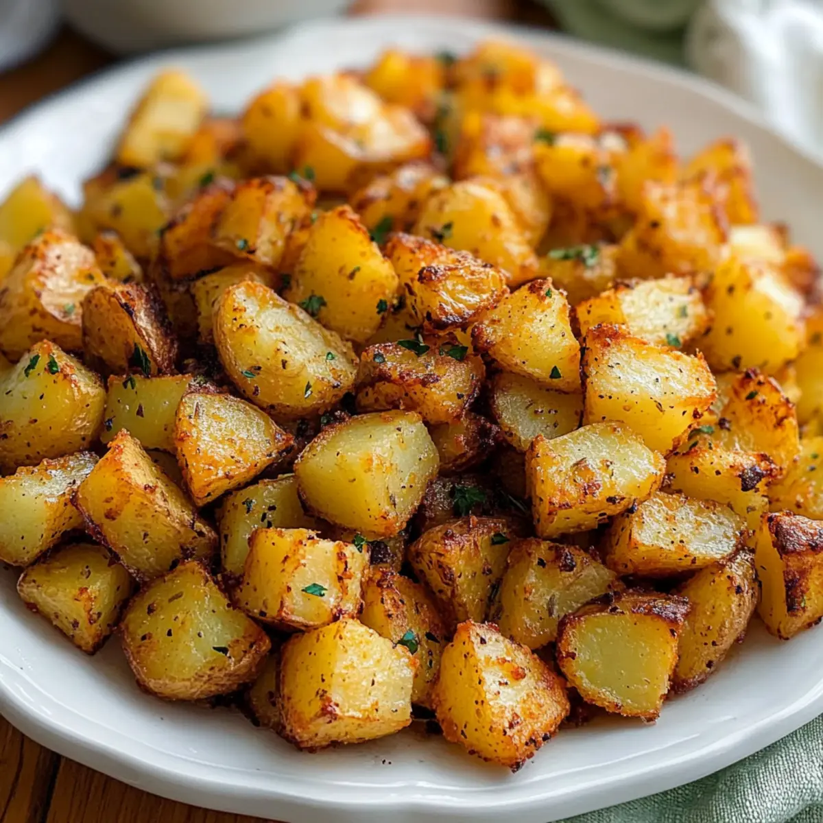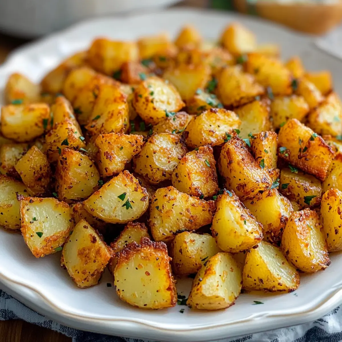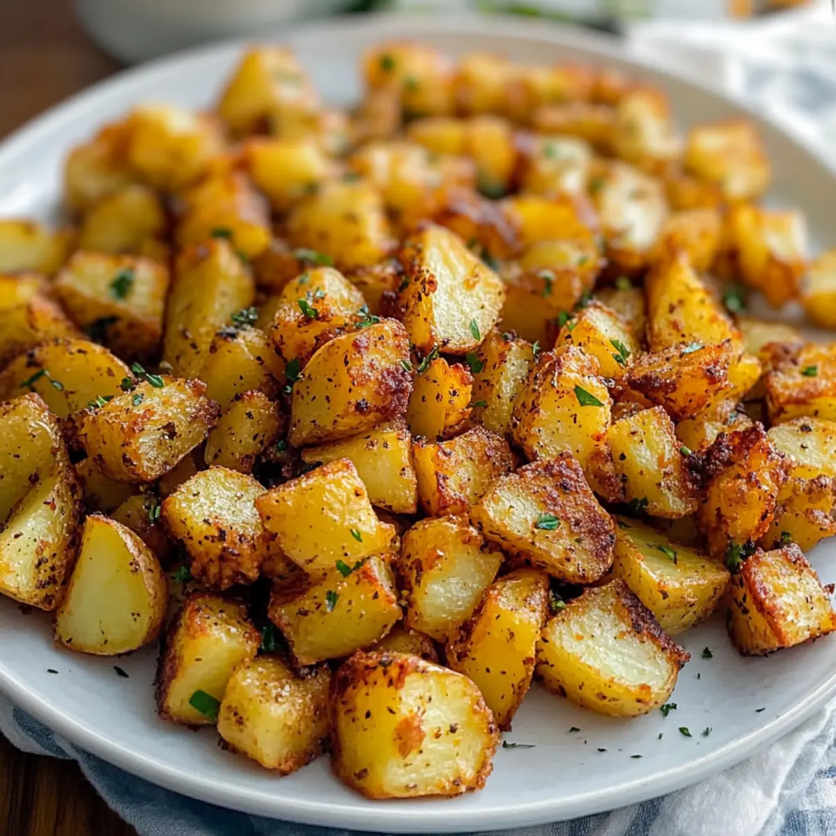 The aroma of crispy, oven-baked breakfast potatoes wafting through the kitchen can turn any ordinary morning into a delightful experience. With just a handful of pantry staples, these easy baked breakfast potatoes not only promise incredible flavor but also bring a much-needed crunch to your plate. Perfect for busy weekdays or a leisurely weekend brunch, they’re a versatile side dish that can be customized to suit your taste. Plus, they’re gluten-free and vegan-friendly, making them an inclusive option for everyone at the table. You’ll love how simple they are to prepare, and I can’t wait to share with you the steps that will have you serving up these golden bites in no time. Ready to elevate your breakfast game? Let’s dive in and discover how to create these irresistible baked breakfast potatoes! Why Are Baked Breakfast Potatoes Amazing? Easy Preparation: With just a few pantry staples and no complicated steps, your mornings just got a lot simpler! Customizable: Personalize your potatoes by adding your favorite herbs or spices; the possibilities are endless! Healthy Alternative: Gluten-free and vegan-friendly, these potatoes are a nutritious way to start your day, leaving greasy fast food behind. Perfect Texture: Enjoy a delightful contrast of crispy edges and creamy interiors that’s sure to impress your family and friends. Versatile Pairing: Whether alongside Turkey Egg Breakfast Casserole or tucked into a breakfast burrito, these potatoes elevate any meal! Baked Breakfast Potatoes Ingredients • Prepare to savor the crispy goodness with these must-have ingredients! For the Potatoes Yukon Gold Potatoes – Their buttery, creamy texture holds up beautifully during roasting. Substitute with red potatoes for variation. Sea Salt – This will accentuate the natural flavors; adjust based on your taste preference. Black Pepper – Adds a warming kick; freshly ground pepper offers the best flavor. For Seasoning Paprika – This spice lends a lovely golden hue and mild smoky flavor; choose sweet or smoked based on your mood. Extra Light Olive Oil – Vital for achieving that crispy exterior; feel free to swap with avocado oil for a different twist. For Garnish Fresh Parsley – An optional touch, this herb adds a burst of color and freshness; chives or thyme also work well as substitutes. These ingredients come together to create the ultimate baked breakfast potatoes, easily customizable to suit everyone’s tastes! Step‑by‑Step Instructions for Crispy Baked Breakfast Potatoes Step 1: Preheat the Oven Begin by preheating your oven to 400°F (200°C). While the oven warms up, prepare a baking sheet by lining it with parchment paper. This will prevent the crispy baked breakfast potatoes from sticking and ensure even cooking. Set the baking sheet aside as you move on to the next step. Step 2: Prep the Potatoes Rinse the Yukon Gold potatoes under cold water, scrubbing away any dirt. You may choose to peel them for a smoother texture, but leaving the skin on adds flavor and nutrition. Dice the potatoes into ½-inch cubes, ensuring they are uniform for even cooking. Once prepped, place the potatoes in a large mixing bowl. Step 3: Season the Potatoes Drizzle a generous amount of extra light olive oil over the diced potatoes in your bowl. Toss the potatoes gently to coat them evenly with the oil. Next, sprinkle in your desired amount of sea salt, black pepper, and paprika. Continue tossing until every piece is well-coated with the seasonings, creating a savory base for your crispy baked breakfast potatoes. Step 4: Bake the Potatoes Spread the seasoned potatoes out evenly on the prepared baking sheet in a single layer, making sure they’re not overcrowded. Place the baking sheet in the preheated oven and bake for about 20 minutes. Keep an eye on them—when fork-tender and golden on the edges, you’ll know they are ready for the next step. Step 5: Broil for Crispiness Once baked, carefully remove the sheet from the oven. Stir the potatoes gently to ensure even browning, then switch the oven setting to broil. Return the baking sheet to the oven and broil for an additional 2-4 minutes. Watch closely as the potatoes turn golden and crispy, but don’t let them burn—they’ll be perfect when they just start to crisp up nicely. Step 6: Serve Finally, take the crispy baked breakfast potatoes out of the oven once they reach that ideal golden color. Allow them to cool slightly before serving. Garnish with freshly chopped parsley, if desired. These delightful potatoes are best enjoyed straight from the oven, adding a delicious crunch to your breakfast table! Tips for the Best Baked Breakfast Potatoes Even Cutting: Ensure uniform potato cubes: Cut the potatoes into ½-inch cubes to promote even cooking and crispiness. Avoid Overcrowding: Limit potato pieces per sheet: Spread them out on the baking sheet to allow proper airflow, achieving crisp baked breakfast potatoes. Room Temperature Potatoes: Let refrigerated potatoes warm up: For the best texture, allow them to come to room temperature before roasting. Broiling Alert: Keep a close watch while broiling: This final step creates a crunchy finish, but it can burn quickly if left unattended. Experiment with Flavors: Use different seasonings: Combine Italian herbs or a dash of cayenne for a fun twist on your baked breakfast potatoes! Baked Breakfast Potatoes Variations Feel free to unleash your creativity and customize these baked breakfast potatoes to suit your taste buds! Herb-Infused: Add fresh rosemary or thyme before baking for an aromatic twist. The added herbs give the potatoes a delightful, earthy flavor. Spicy Kick: Sprinkle a pinch of cayenne or red pepper flakes to the seasoning mix. This adds a lively heat that perfectly contrasts the creamy texture. Cheesy Delight: Top with shredded cheese during the last few minutes of broiling for a melty finish. Imagine the gooeyness paired with crispy potatoes—pure comfort food. Veggie Boost