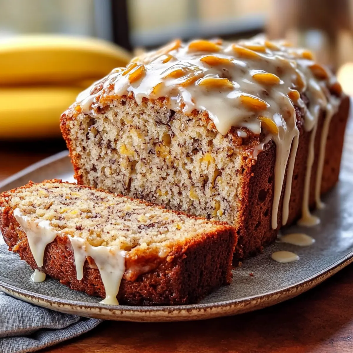 “Isn’t it amazing how the simplest ingredients can create something so comforting?” I found myself smiling as I overheard a friend say this while digging into a slice of my moist banana bread with cream cheese glaze. This recipe transforms overly ripe bananas into a deliciously soft loaf draped with a creamy, tangy glaze that truly elevates its charm. Not only is it incredibly easy to whip up, but it also makes for a stunning centerpiece at family gatherings and brunches. The moment it comes out of the oven, the warm aroma of cinnamon and sweet bananas fills your home, inviting everyone to pause and indulge. Trust me, this banana bread becomes an instant family favorite, and I can’t wait for you to try it. What’s your favorite way to enjoy banana bread? Why is This Banana Bread Irresistible? Moisture Magic: This banana bread is incredibly moist, thanks to those ripe bananas and a touch of melted butter, ensuring each slice melts in your mouth. Creamy Glaze Perfection: The cream cheese glaze adds a decadent creaminess that beautifully balances the natural sweetness of the bananas, making it a showstopper. Simple Ingredients: Made from everyday items, this recipe is perfect for both beginners and seasoned bakers looking for a quick yet rewarding bake. Family Favorites Unite: It’s not just a treat; it’s a comforting family favorite that sparks joy at gatherings, alongside dishes like Garlic Butter Cream or a delightful Pistachio Mushroom Cheesecake. Versatile Delight: This loaf can be modified with additions like chocolate chips or nuts, giving it your unique twist. No wonder it’s destined to become a staple in your kitchen! Banana Bread with Cream Cheese Glaze Ingredients Here are all the key ingredients you’ll need to bake this delightful banana bread! For the Batter All-Purpose Flour – Measure accurately by spooning and leveling for the best texture. Baking Soda – Essential for lift; ensure it’s fresh for optimal results. Salt – Do not omit, as it enhances the overall flavor of the banana bread. Ground Cinnamon – Adjust for personal taste to bring warmth and spice. Granulated Sugar – Sweetness and moisture retention, or opt for brown sugar for a richer flavor. Unsalted Butter (melted and cooled) – Adds richness and moisture; margarine can be an alternative, but may alter flavor. Large Eggs – Binds ingredients and adds moisture; an egg replacer can be used for a vegan option. Vanilla Extract – High-quality extract enhances flavor wonderfully. Very Ripe Large Bananas (mashed) – The star ingredient providing moisture and flavor; frozen bananas can work if drained well. Chopped Dried Peaches or Apricots (optional) – Textural and flavorful bursts; can substitute with chocolate chips or nuts. Chopped Pecans – Adds a delightful crunch; walnuts or almonds can be suitable alternatives. For the Cream Cheese Glaze Cream Cheese (softened) – The base of the glaze, adding creaminess to your banana bread. Unsalted Butter (softened) – Contributes richness in the glaze; can substitute with margarine if desired. Powdered Sugar – Sweetens the glaze and aids in achieving the perfect texture; essential for glaze consistency. Milk – Adjusts the glaze consistency; non-dairy milk can be used for a vegan version. Get ready to create a slice of heavenly banana bread with cream cheese glaze that your family will adore! Step‑by‑Step Instructions for Banana Bread with Cream Cheese Glaze Step 1: Preheat the Oven Begin by preheating your oven to 350°F (175°C). While the oven warms up, generously grease a 9×5 inch loaf pan to ensure your moist banana bread slides out perfectly after baking. Take a moment to gather your ingredients for a smoother preparation process. Step 2: Mix Dry Ingredients In a medium bowl, whisk together 2 cups of all-purpose flour, 1 teaspoon of baking soda, ½ teaspoon of salt, and 1 teaspoon of ground cinnamon. This step is crucial as it combines the leavening agent and spices evenly, contributing to the flavor and structure of your banana bread. Set this mixture aside as you prepare the wet ingredients. Step 3: Combine Wet Ingredients In a large mixing bowl, whisk together 1 cup of granulated sugar with ½ cup of melted and cooled unsalted butter until well combined. Then, add in 2 large eggs, one at a time, mixing thoroughly after each addition. Finish by stirring in 1 teaspoon of vanilla extract, creating a rich and flavorful base for your banana bread. Step 4: Add Bananas Next, fold in 2 very ripe, mashed bananas to the wet mixture until just combined. The bananas are the star of this banana bread, providing natural sweetness and moisture. Mixing them gently will ensure they don’t over-mix, which helps maintain the desired tender texture. Step 5: Combine Mixtures Gradually add the bowl of dry ingredients into the wet mixture in two batches. Gently fold each batch until just combined, being careful not to overmix. This gentle approach helps keep your banana bread light and fluffy. If desired, it’s now the perfect time to include any optional mix-ins, such as chopped dried fruits or pecans. Step 6: Bake the Bread Pour your banana bread batter into the prepared loaf pan. Optionally, sprinkle some chopped pecans on top for added crunch. Place the pan in the preheated oven and bake for 50-60 minutes, or until a toothpick inserted into the center comes out clean. The aroma of cinnamon and bananas will fill your kitchen, signaling that it’s almost ready. Step 7: Cool the Bread Once baked, remove the banana bread from the oven and let it cool in the pan for about 10 minutes. Afterward, carefully transfer the loaf to a wire rack to cool completely. This cooling step is vital for the perfect slice; ensure it has reached room temperature before adding the glaze. Step 8: Prepare the Cream Cheese Glaze While your banana bread cools, prepare the creamy glaze. In a mixing bowl, beat together 4 ounces of softened cream cheese and ¼ cup of soft