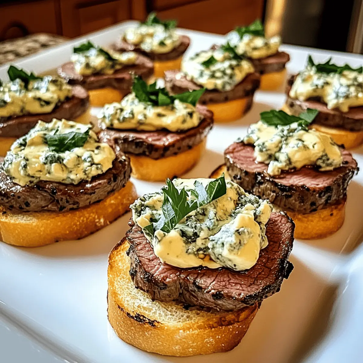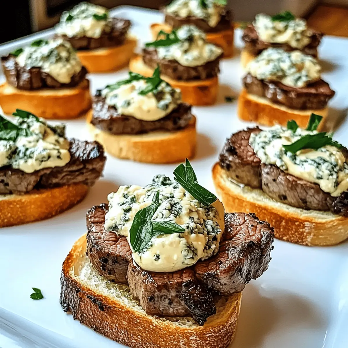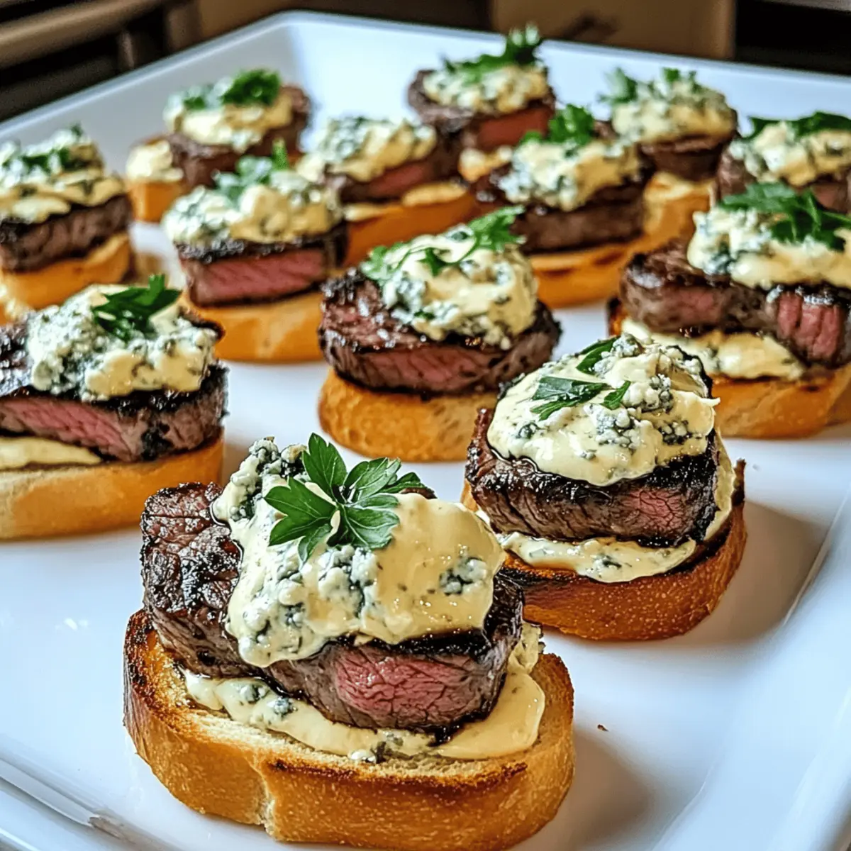 As I stood in the kitchen, the savory aroma of searing beef filled the air, instantly transporting me back to delightful dinner parties where every bite was a celebration. Today, I’m excited to share my Beef Tenderloin Gorgonzola Crostini recipe—a gourmet appetizer that marries the tenderness of perfectly cooked beef with the creamy richness of Gorgonzola cheese atop a crisp baguette. Not only is this dish a standout at any gathering, but it also comes together in about 50 minutes, making it a quick yet impressive option for those cozy family dinners. Plus, with a gluten-free alternative available, everyone can indulge in this delicious treat. Are you ready to elevate your appetizer game? Why is this crostini a must-try? Gourmet Delight: This Beef Tenderloin Gorgonzola Crostini elevates ordinary gatherings into extraordinary experiences with its visually stunning presentation and exquisite taste. Quick and Easy: With just 50 minutes of prep time, you’ll wow friends and family without spending hours in the kitchen. Flavor Fusion: The savory beef and creamy Gorgonzola create a symphony of flavors that linger delightfully on your palate. Versatile Alternatives: Feel free to experiment with toppings or even try it on gluten-free bread to accommodate diverse dietary needs. Crowd-Pleaser: Perfect for parties or cozy dinners, it’s an appetizer guaranteed to impress everyone at the table! Whether paired with a glass of your favorite red wine or alongside a light salad, this dish promises to be a charming addition to any meal. Beef Tenderloin Gorgonzola Crostini Ingredients For the Beef • Beef Tenderloin – A premium cut that delivers incredible flavor and tenderness; sirloin can be a more affordable alternative. • Salt and Pepper – Essential for bringing out the meaty flavors; adjust to your taste preference. For the Topping • Gorgonzola Cheese – Adds a creamy tang that beautifully complements the beef; feel free to swap with Roquefort or feta for a different touch. • Balsamic Vinegar – Provides a sweet and tangy finish; consider using a balsamic glaze for extra richness or omitting for a lighter taste. • Fresh Parsley – A delightful garnish that enhances the dish’s freshness and presentation; substitute chives or microgreens if desired. For the Base • Baguette – Provides the crispy foundation for your crostini; gluten-free bread options work wonderfully for those with dietary restrictions. • Olive Oil – Necessary for cooking the beef and toasting the bread to perfection; ensure you use a good quality oil for the best flavor. Note: These ingredients come together to create the memorable Beef Tenderloin Gorgonzola Crostini, a showstopper for any occasion! Step‑by‑Step Instructions for Beef Tenderloin Gorgonzola Crostini Step 1: Preheat the Oven Begin by preheating your oven to 400°F (200°C). This temperature is ideal for roasting beef tenderloin, ensuring even cooking and a beautifully browned exterior. As the oven warms up, prepare your workspace for the next steps, which will bring your Beef Tenderloin Gorgonzola Crostini to life. Step 2: Season the Beef Generously season the beef tenderloin with salt and pepper on all sides, enhancing its natural flavors. A good coating of seasoning will create a delicious crust when seared. Make sure to let it sit for a few minutes to absorb the seasonings, which will deepen the taste of your final dish. Step 3: Sear the Beef In a large skillet, heat a tablespoon of olive oil over medium-high heat until shimmering. Carefully add the beef tenderloin and sear for 2-3 minutes on each side, or until a rich, golden brown crust forms. This step not only locks in juices but also adds an irresistible flavor to your Beef Tenderloin Gorgonzola Crostini. Step 4: Roast the Beef Transfer the seared beef to your preheated oven and roast for 15-20 minutes. Use a meat thermometer to check the internal temperature, aiming for 130°F for medium-rare. This not only assures perfect doneness but ensures that your tenderloin remains juicy and tender for assembling your crostini. Step 5: Rest the Beef Once your beef reaches the desired temperature, remove it from the oven and allow it to rest for 10 minutes. Resting is crucial as it allows the juices to redistribute throughout the meat, keeping it moist. This patience will pay off in the flavor and tenderness of each slice in your Beef Tenderloin Gorgonzola Crostini. Step 6: Prepare Baguette While the beef is resting, slice your baguette into half-inch rounds. Lay them on a baking tray, brush each slice generously with olive oil, and toast them in the oven for 5-7 minutes, or until they are golden and crispy. These crunchy bases will perfectly support the rich toppings of your crostini. Step 7: Slice the Beef After the beef has rested, slice it thinly against the grain. This ensures that every bite is tender and easy to chew. Aim for thin slices, about a quarter-inch thick, to maximize the flavor in your Beef Tenderloin Gorgonzola Crostini while making assembly a breeze. Step 8: Assemble Crostini To assemble your Beef Tenderloin Gorgonzola Crostini, start with a toasted baguette slice, place a piece of the sliced beef on top, then add a generous dollop of creamy Gorgonzola cheese. Drizzle with balsamic vinegar for extra flavor and finish with freshly chopped parsley for a pop of color. Serve immediately and enjoy the delightful combination of flavors! How to Store and Freeze Beef Tenderloin Gorgonzola Crostini Room Temperature: Serve the crostini immediately after assembling to enjoy the best texture and flavor. If left at room temperature, consume within 2 hours. Fridge: Store leftover ingredients separately in airtight containers for up to 3 days. Keep the sliced beef, baguette, and toppings individually to maintain crispness and prevent sogginess. Freezer: The beef can be frozen for up to 3 months. Wrap each slice tightly in plastic wrap and then in foil or a freezer bag to prevent free