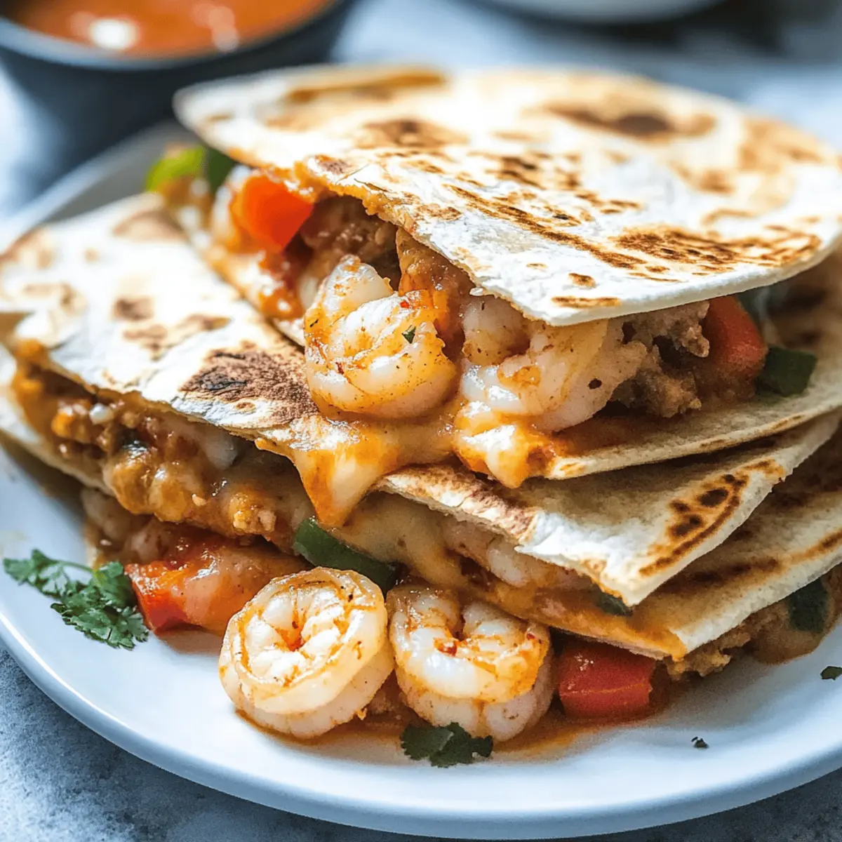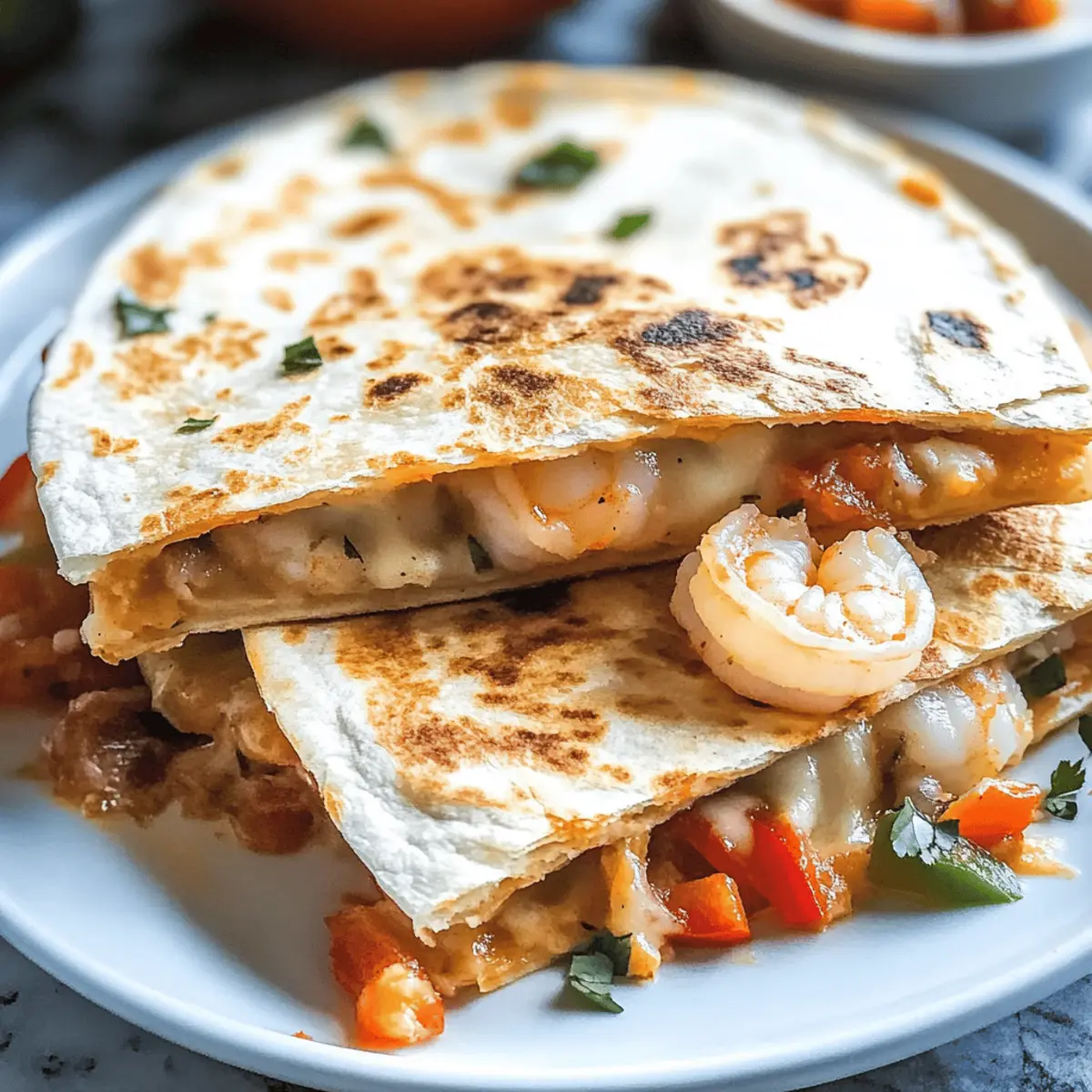 Before I started experimenting with different fillings, I had a mini crisis trying to find the perfect weeknight dinner that was both satisfying and quick to prepare. Enter the Best Shrimp Quesadillas—a marvelous solution that combines crispy, golden tortillas with deliciously seasoned shrimp, vibrant veggies, and creamy melted cheese. In just 15 minutes, you can whip up this dish, making it an ideal choice for busy evenings or casual gatherings. Plus, the customizable nature allows you to adjust the spice levels or toss in your favorite ingredients, ensuring there’s something for everyone. Are you ready to elevate your homemade meals with this delightful recipe? Let’s dive in! Why Are These Shrimp Quesadillas So Irresistible? Quick and Easy: This recipe comes together in just 15 minutes, making weeknight meals a breeze without sacrificing flavor. Customizable: Whether you’re a spice lover or prefer milder flavors, these quesadillas are easily tailored to your tastes. Family-Friendly: Even picky eaters will devour these crispy delights, making them perfect for family dinners or gatherings. Satisfying Crunch: Enjoy golden brown, crisp tortillas encasing a savory shrimp filling—each bite bursting with flavor and texture! Elevate your seafood game! If you’re looking for more seafood options, check out the mouthwatering Honey Blackened Shrimp for a quick bite or the delightful Shrimp Tempura Rolls for a full meal! Best Shrimp Quesadilla Ingredients • For the Filling Uncooked Medium Shrimp – Adds protein and flavor; can substitute with frozen shrimp for convenience. Onion (1/2 cup, chopped) – Provides sweetness; yellow or red onions can be used based on preference. Bell Pepper (1/2 cup, chopped) – Adds a crunchy sweetness; substitute with poblano pepper for a spicier kick. Garlic (2 cloves, minced) – Enhances flavor; fresh is ideal, but powdered can be used as a fallback. Taco Seasoning (2 tablespoons) – Infuses the shrimp with rich flavor; homemade mixes are a great alternative. • For the Tortillas Medium Flour Tortillas (6-8) – The base for quesadillas; opt for gluten-free versions if needed. • For the Cheesy Goodness Melting Cheese (1-2 cups) – Essential for creamy richness; options include mozzarella, cheddar, or a Mexican blend. • For Cooking Olive Oil – Essential for sautéing; vegetable oil or butter are suitable alternatives. Step‑by‑Step Instructions for Best Shrimp Quesadillas Step 1: Heat the Skillet Begin by heating 2 tablespoons of olive oil in a large non-stick skillet over medium heat. Allow the oil to shimmer for about 1 minute, signaling it’s ready. This step is crucial as it creates a nice base for the sautéed vegetables, providing flavor to your Best Shrimp Quesadillas. Step 2: Sauté the Vegetables Add ½ cup of chopped onions and ½ cup of chopped bell peppers to the hot oil. Sauté them for about 1 minute until they become tender and fragrant, creating a colorful aroma in your kitchen. Include 2 minced garlic cloves and stir for an additional 30 seconds until the garlic is golden, enhancing the filling’s flavors. Step 3: Cook the Shrimp Stir in the uncooked medium shrimp along with 2 tablespoons of taco seasoning. Cook the mixture for approximately 2 minutes, or until the shrimp turns pink and opaque, indicating they are fully cooked. This will make the filling rich in flavor, ensuring your Best Shrimp Quesadillas are a hit. Step 4: Prepare the Tortillas In a separate skillet, place a medium flour tortilla over medium heat. Sprinkle a generous amount of melting cheese (1-2 cups) on half of the tortilla, followed by the shrimp mixture, and top it with more cheese. This layering technique will help create a gooey, flavorful filling when folded. Step 5: Cook the Quesadilla Fold the tortilla in half and carefully place it in the heated skillet. Cook for 2-3 minutes per side, gently pressing down with a spatula. Look for a golden brown color on both sides and a crispy texture, ensuring your Best Shrimp Quesadillas are perfectly toasted and appetizing. Step 6: Slice and Serve Once golden brown and crispy, transfer the quesadilla to a cutting board. Allow it to cool for a moment before slicing into wedges for easy serving. Enjoy these warm, delicious Best Shrimp Quesadillas fresh, accompanied by dips like sour cream, salsa, or guacamole for added flavor and enjoyment! Storage Tips for Best Shrimp Quesadillas Fridge: Store leftover quesadillas in an airtight container for up to 3 days to keep them fresh and delicious. Freezer: For longer storage, wrap extras in plastic wrap and then foil. Freeze for up to 2 months; they’ll retain better quality when reheated in a skillet. Reheating: Avoid using the microwave, as it can make quesadillas soggy. Instead, reheat in a non-stick skillet over medium heat until heated through and crispy again. Room Temperature: Do not leave shrimp quesadillas out at room temperature for more than 2 hours to ensure food safety. Make Ahead Options These Best Shrimp Quesadillas are a fantastic option for meal prep, allowing you to save precious time on busy weeknights! You can prepare the shrimp filling (cooked shrimp, sautéed onions, bell peppers, and seasoning) up to 24 hours in advance and store it in an airtight container in the refrigerator. For optimum taste, assemble the quesadillas just before cooking. When you’re ready to enjoy, simply lay a tortilla in a skillet, add the cold filling, sprinkle with cheese, and cook for 2-3 minutes on each side until golden brown. This way, you’ll have that delightful crunch and flavor, just as if you’d made them fresh! Best Shrimp Quesadillas: Fun Variations! Feel free to explore the exciting twists on the classic quesadilla recipe, adding your unique flair! Spicy Kick: Add jalapeños or serrano peppers for a zesty surprise that will tantalize your taste buds! Creamy Twist: Swap regular cheese for pepper jack for an extra kick, or use cream cheese for a rich, 