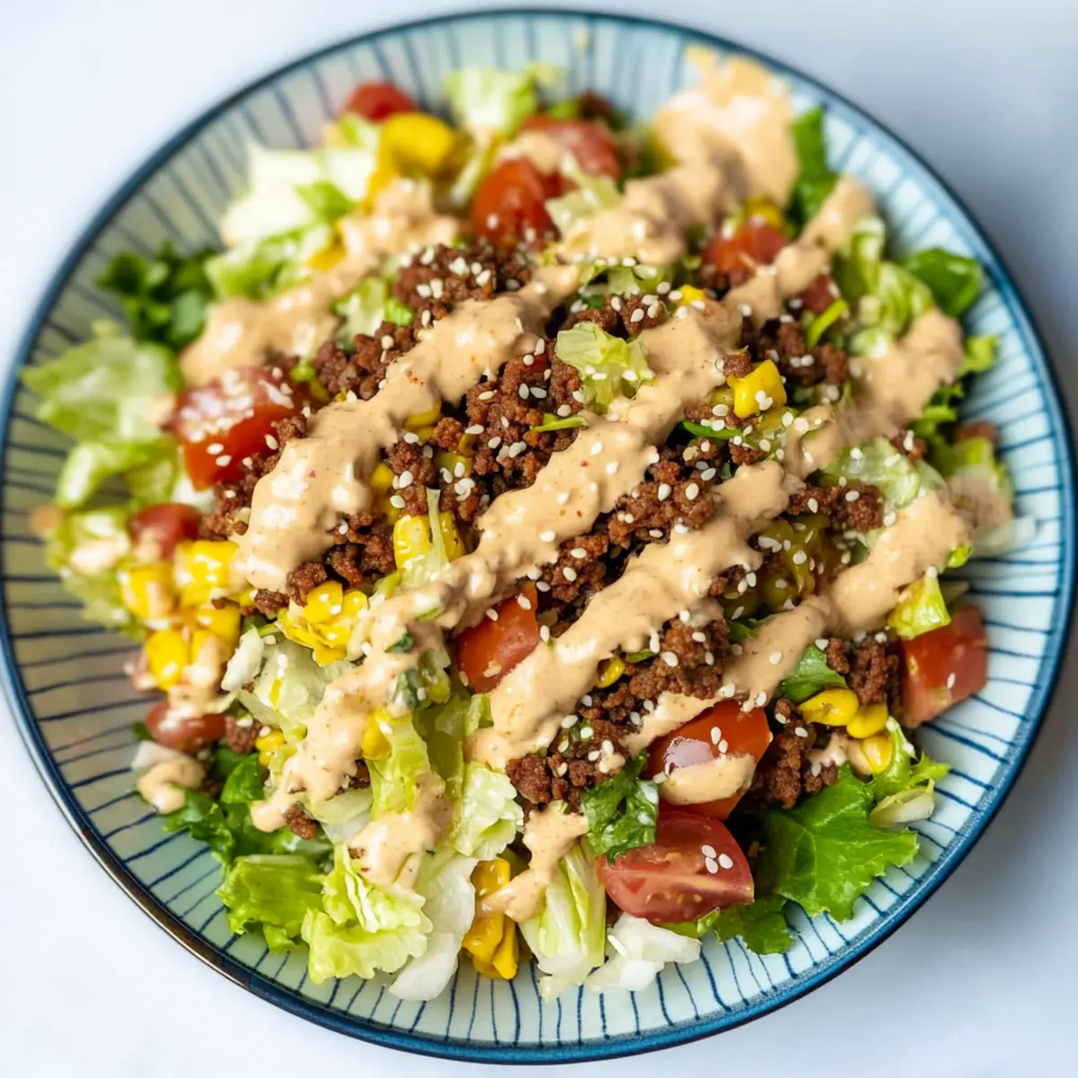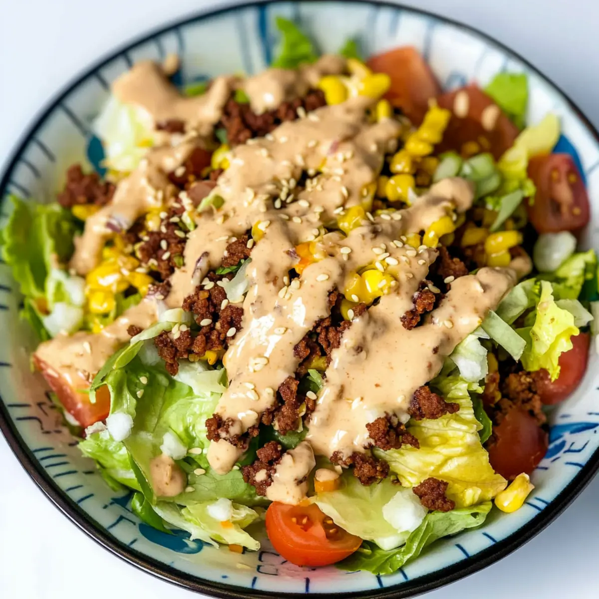 As I rummaged through my fridge on a busy weeknight, the idea for a Vegan Big Mac Salad suddenly struck me. It is incredible how the vibrant crunch of fresh veggies combined with savory, seasoned vegan beef can transform a classic fast-food craving into a guilt-free delight. This salad captures all the beloved flavors of the iconic burger while being low-carb and entirely plant-based! In just 15 minutes, you can whip up a hearty meal that promises to satisfy even the pickiest of eaters. Perfect for those days when time is short and cravings are high, this dish makes healthy eating feel like an indulgence. Are you ready to give your taste buds a treat without the carbs? Let’s dive into this colorful twist! Why Try This Big Mac Salad? Flavor Explosion: The creamy dressing mixed with vegan beef creates a satiating blend, far surpassing boring fast-food offerings. Quick Preparation: In just 15 minutes, you have a delicious, hearty meal that’s ready to impress your family. Healthy Twist: With low-carb and vegan ingredients, this salad allows you to indulge without guilt. Versatile Ingredients: Swap in your favorite greens or protein sources for a custom salad like the refreshing Cucumber Strawberry Salad or the Mediterranean Chickpea Salad. Crowd-Pleaser: Perfect for family gatherings or a casual dinner with friends, everyone will love this comforting yet nutritious take on a classic. Let’s transform your kitchen into a hub for exciting, health-conscious meals! Big Mac Salad Ingredients • Here’s everything you need for a delicious Big Mac Salad! For the Dressing Vegan Mayo – Adds creaminess to the dressing; substitute with avocado or regular mayo for a non-vegan version. Garlic Powder – Enhances flavor depth in the dressing; fresh garlic can be used as an alternative. Onion Powder – Provides additional taste in the dressing; fresh onions can be used but adjust quantity to taste. Mustard – Gives a tangy note to the dressing; Dijon or yellow mustard works well. Ketchup – Brings sweetness and moisture; low-sugar ketchup can be substituted for a healthier option. Salt and Pepper – Season to taste for both dressing and salad. For the Salad Base Iceberg Lettuce – Provides a crunchy base; Romaine or mixed greens can be used as substitutes. Olive Oil – Used for sautéing the vegan ground beef; can be replaced with avocado oil for a different flavor. Vegan Ground Beef – Acts as the main protein source; crumbled tempeh or lentils can be used as alternatives. Garlic – Freshly pressed to flavor the vegan ground beef; use less if sensitive to strong flavors. Paprika – Adds sweetness and smokiness; smoked paprika can enhance the flavor profile. Tomatoes – Offer juiciness and freshness; any ripe variety, such as cherry or vine, can be used. Vegan Cheddar – Provides a cheesy flavor; substitute with nutritional yeast for a cheesy taste without dairy. Pickles – Add a satisfying crunch and tang; any type of dill pickle works well. Onions – For added crunch and flavor; green onions can work for a milder taste. Sesame Seeds – Sprinkle for texture and nutty flavor; poppy seeds can be substituted. Step‑by‑Step Instructions for Big Mac Salad Step 1: Cook the Vegan Beef Heat a tablespoon of olive oil in a large skillet over medium heat. Once the oil shimmers, add the vegan ground beef, seasoning it with minced garlic, paprika, salt, and pepper. Sauté for about 4-5 minutes, stirring frequently, until the beef is browned and slightly crispy. Remove from heat and set aside to allow the flavors to meld as you prepare the dressing. Step 2: Prepare the Dressing In a mixing bowl, combine the vegan mayo, mustard, garlic powder, onion powder, ketchup, and a pinch of salt and pepper. Whisk the ingredients together until smooth and creamy. Taste the dressing, adjusting seasoning to your preference; it should be tangy and flavorful. Set aside your dressing while you assemble the salad, ensuring those delicious flavors are ready to shine. Step 3: Assemble the Salad In a large salad bowl, layer the chopped iceberg lettuce as your base. Add in the diced tomatoes, cooked vegan beef, and sprinkle in vegan cheddar for a cheesy touch. Next, toss in sliced pickles and onions for crunch. Finally, drizzle the prepared dressing over the salad ingredients, ensuring everything is well coated with that deliciously creamy Big Mac Salad dressing. Step 4: Toss and Serve Gently toss all the ingredients together until everything is evenly distributed and coated in dressing. Serve immediately for the freshest taste, garnishing with a sprinkle of sesame seeds if desired. This vibrant Big Mac Salad is not only visually appealing but also packed with vibrant flavors that will surely delight everyone at the table! Big Mac Salad: Flavorful Variations Feel free to customize your Big Mac Salad with these fun and delightful twists that will elevate your meal! Dairy-Free: Substitute vegan cheddar with nutritional yeast for a cheesy flavor without dairy. This option is great for those who want to keep it entirely plant-based without sacrificing taste. Extra Crunch: Add shredded carrots to your salad for an extra layer of texture and color. The sweetness of the carrots complements the savory elements beautifully, creating a vibrant summer dish. Protein Power: Swap the vegan ground beef for black beans or quinoa to switch up the protein source. This variation boosts fiber and adds a unique flavor profile, making your salad even heartier! Creamy Avocado: Incorporate diced avocado for a burst of creaminess. Its rich texture pairs perfectly with the crunchy salad ingredients, giving a luxurious mouthfeel that enhances every bite. Smoky Flavor: Use smoked paprika instead of regular paprika for a deeper, more complex flavor. This subtly elevates the dish, making it even more reminiscent of a freshly grilled burger! Spicy Kick: Add jalapeños or a drizzle of hot sauce for some heat. This fiery twist embodies the classic