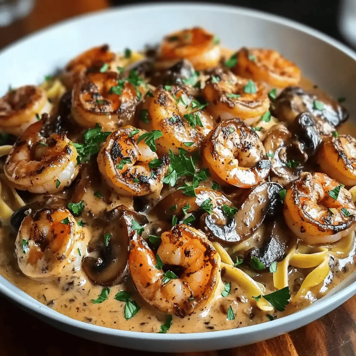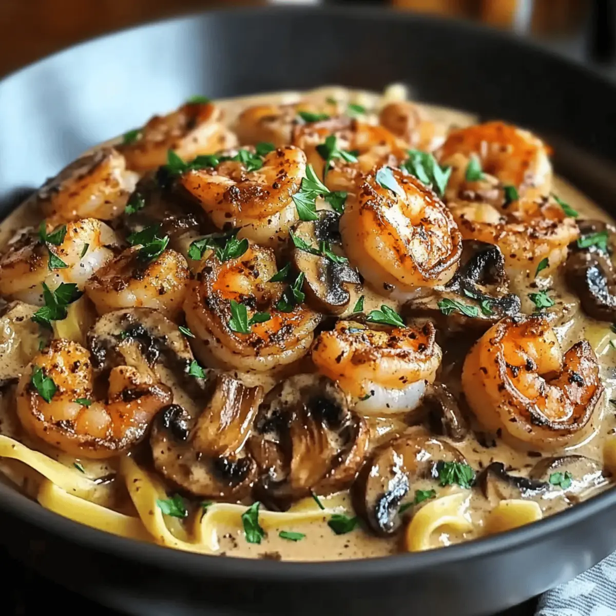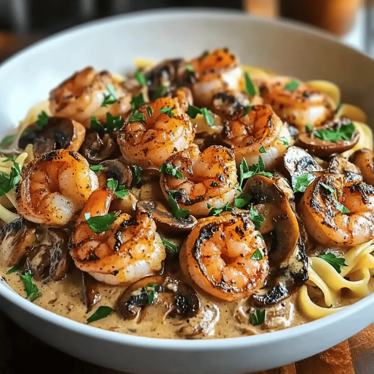 As the skillet sizzled to life, a tantalizing aroma filled my kitchen—a bold invitation to dive into this delicious Blackened Shrimp Stroganoff. Who would have thought this classic comfort dish could be transformed into a quick weeknight dinner that packs such a flavor punch? With juicy shrimp coated in zesty blackening spice, nestled in a creamy mushroom sauce over tender egg noodles, this meal offers the best of both worlds: comfort and adventure. Plus, it’s perfect for impressing guests or satisfying hungry family members without spending hours in the kitchen. Ready to uncover the secret to this delightful fusion of Cajun flair and cozy tradition? Let’s cook together! Why is Blackened Shrimp Stroganoff a Must-Try? Comforting, Bold Flavor: This dish takes classic stroganoff to new heights with rich, zesty notes that dance on your palate. Quick Weeknight Win: Perfect for busy evenings, it comes together in no time without skimping on taste! Versatility at Its Best: Swap shrimp for chicken or try Honey Walnut Shrimp for an interesting twist! Crowd-Pleasing Delight: Impress family or guests alike—everyone will be asking for seconds! Creamy, Hearty Texture: The silky mushroom sauce envelops the tender shrimp and noodles, creating a delightful mouthfeel. This Blackened Shrimp Stroganoff is not just a meal; it’s an experience to savor! Blackened Shrimp Stroganoff Ingredients For the Shrimp • 1 lb large shrimp – A flavorful main protein; it can be substituted with chicken or tofu for a different twist. • 2 tablespoons blackening seasoning – This spice blend adds a bold kick; feel free to adjust for your desired heat level. • 2 tablespoons olive oil – Perfect for cooking; swap it with butter or avocado oil for varied flavor. For the Sauce • 1 small onion, finely chopped – Brings sweetness and depth; shallots could be a milder alternative. • 8 oz cremini mushrooms, sliced – Provides umami and texture; try using button mushrooms for a different profile. • 2 cloves garlic, minced – Infuses the dish with flavor; garlic powder serves as a viable substitute. • ½ cup chicken broth – This enhances the flavor and adds necessary liquidity; opt for vegetable broth for a vegetarian version. • 1 cup sour cream – Offers creaminess to the sauce; Greek yogurt can be a healthier alternative if you prefer. • Salt and pepper to taste – Essential seasonings to elevate the overall flavor. For the Noodles • 8 oz egg noodles – The hearty base of the dish; whole wheat or gluten-free pasta are great substitutes if needed. For Garnishing • 2 tablespoons fresh parsley, chopped – Adds a pop of color and freshness; you can omit it if you’re out of fresh herbs. Now, are you ready to create this incredible Blackened Shrimp Stroganoff? Let’s get cooking! Step‑by‑Step Instructions for Blackened Shrimp Stroganoff Step 1: Prepare the Shrimp Begin by patting the 1 pound of large shrimp dry with paper towels to ensure a good sear. Coat each shrimp evenly with 2 tablespoons of blackening seasoning, making sure they’re fully covered. This bold flavor is key to the Blackened Shrimp Stroganoff. Set the seasoned shrimp aside while you heat the skillet. Step 2: Sear the Shrimp In a large skillet, heat 2 tablespoons of olive oil over medium-high heat until shimmering. Carefully add the seasoned shrimp to the skillet and cook for 1-2 minutes on each side until they are nicely blackened and opaque, indicating they are cooked through. Once done, transfer the shrimp to a plate and set aside to keep warm. Step 3: Cook the Egg Noodles While the shrimp is resting, bring a pot of salted water to a boil. Add 8 ounces of egg noodles and cook according to the package instructions, usually about 6-8 minutes, until al dente. Once cooked, drain the noodles and set aside, ready to mix with your creamy sauce later in the Blackened Shrimp Stroganoff. Step 4: Sauté the Vegetables In the same skillet, add another tablespoon of olive oil over medium heat. Incorporate the finely chopped small onion and sliced 8 ounces of cremini mushrooms, sautéing for about 5 minutes until the onion is soft and translucent, and the mushrooms are browned. Add 2 cloves of minced garlic and cook for an additional minute until fragrant, stirring occasionally. Step 5: Make the Sauce Pour in ½ cup of chicken broth, scraping up any flavorful bits stuck to the pan as you bring it to a gentle simmer. Reduce the heat to low, and mix in 1 cup of sour cream until smooth and combined. Season with salt and pepper to taste, adjusting according to your preference in the creamy sauce for the Blackened Shrimp Stroganoff. Step 6: Combine and Serve Now, return the cooked shrimp and drained egg noodles to the skillet. Toss everything together gently, ensuring the noodles and shrimp are well-coated in the rich sauce and heated through, about 2-3 minutes. Finally, garnish with 2 tablespoons of freshly chopped parsley for a pop of color before serving your delightful Blackened Shrimp Stroganoff. Expert Tips for Blackened Shrimp Stroganoff Avoid Overcooking: Keep a close eye on the shrimp while cooking, as they only need 1-2 minutes per side to avoid becoming tough and rubbery. Customize Spice Levels: Feel free to adjust the amount of blackening seasoning according to your taste; add more for a spicy kick or reduce for milder flavors. Use Fresh Ingredients: Fresh shrimp and high-quality mushrooms will elevate your Blackened Shrimp Stroganoff, creating a more vibrant and delicious dish. Creaminess Check: Stir the sour cream in slowly to ensure a smooth, creamy consistency without curdling; this maintains the sauce’s luxurious texture. Serve Immediately: This dish tastes best when served hot right out of the skillet, so have your plates ready for a delightful dining experience! Blackened Shrimp Stroganoff Variations Feel free to make this dish your own with some fun and delicious twists that enhance its already captivating flavors