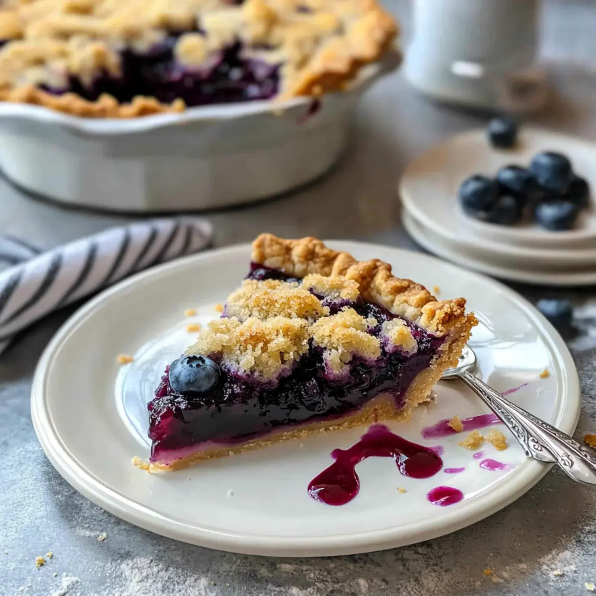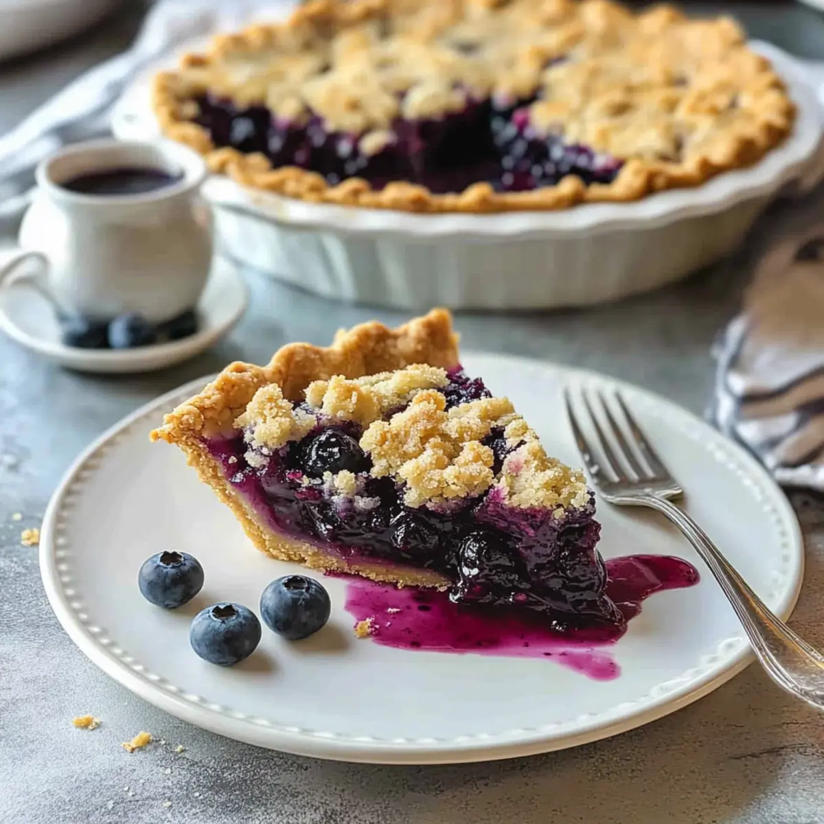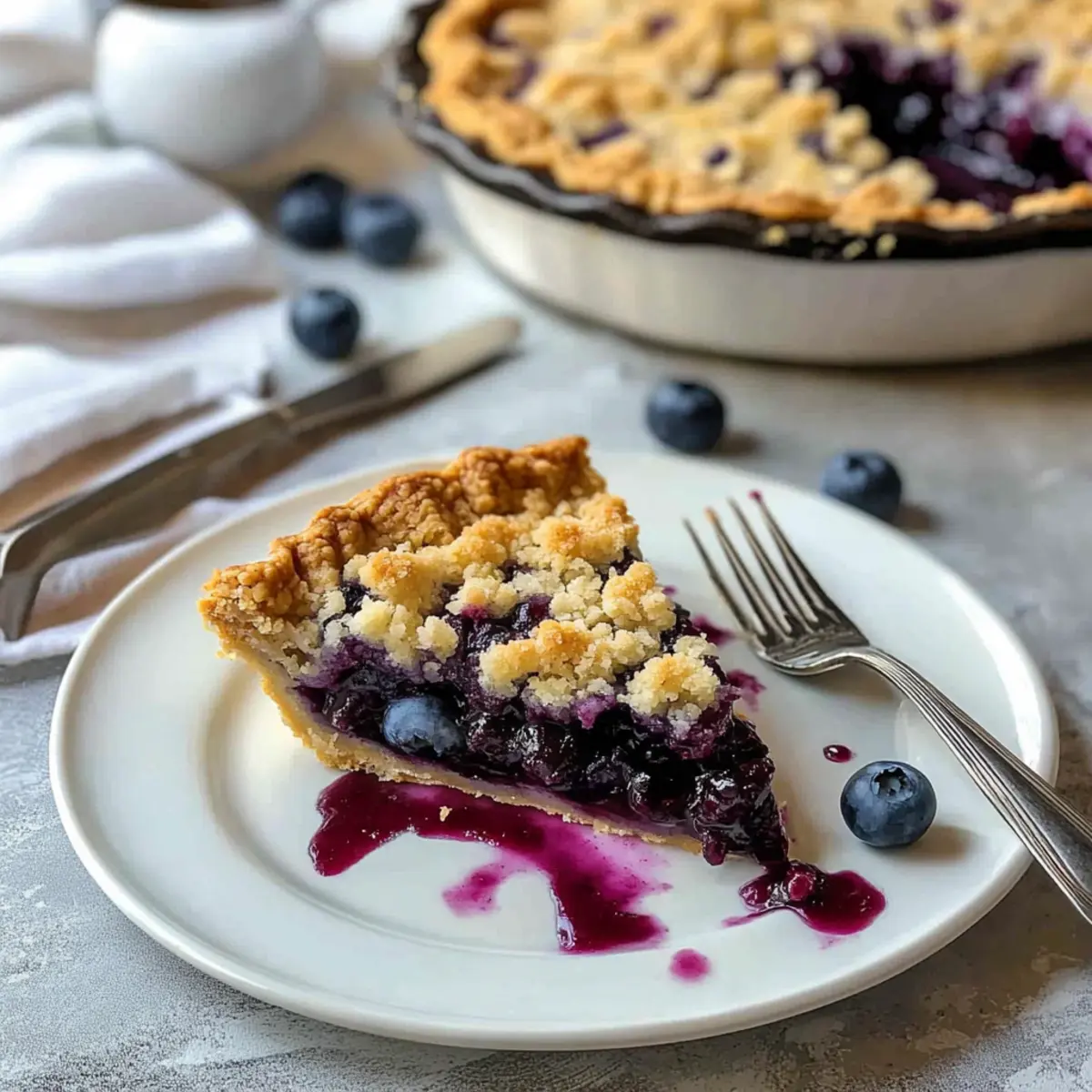 As the aroma of sweet blueberries wafted through the kitchen, I couldn’t help but feel transported to lazy summer picnics with family and friends. This Easy Blueberry Crumb Pie is my go-to dessert that captures those sweet moments without the hassle of complicated pastry work. Crafted with a flaky crust that cradles a luscious filling made from either fresh or frozen blueberries, this recipe ensures you can whip up something delightful even on busy weeknights. The buttery crumble topping adds a wonderfully crisp contrast to the juicy filling, making it perfect for celebrations or simple weeknight treats. Plus, it’s incredibly forgiving—no need for fancy techniques when creating this homemade gem. Ready to impress your loved ones? Let’s dive into how to create this pie together! Why is this Blueberry Crumb Pie special? Simplicity at its best: With just a few essential ingredients, this recipe is perfect for both novice cooks and seasoned chefs. Versatile variations: Customize your pie using blackberries, raspberries, or a mix of your favorite berries for unique flavors. Time-saving: Quick preparation means you can easily bake this pie on a busy weeknight or for last-minute gatherings. Crowd-pleaser: Serve it warm with ice cream or chilled with whipped cream, and watch your guests delight in every bite. Nostalgic charm: Embrace the tradition of homemade desserts while enjoying a pie that’s reminiscent of summer picnics and family fun. If you’re looking for more delicious ideas to complement this pie, consider trying my Blueberry Pancakes Breakfast or indulge in a delightful Mixed Berry Crumble. Blueberry Crumb Pie Ingredients For the Pie Crust • All-purpose flour – 1 ¼ cups: Provides structure to the crust. • Salt – ½ teaspoon: Enhances flavor. • Cold unsalted butter – ½ cup, cut into cubes: Adds flakiness and richness. • Ice water – 3 to 4 tablespoons: Helps the dough come together without becoming tough. For the Blueberry Filling • Fresh or frozen blueberries – 4 cups: Main filling component; sweet and flavorful for your Blueberry Crumb Pie. • Granulated sugar – ¾ cup: Sweetens the filling. • Lemon juice – 1 tablespoon: Adds acidity to balance sweetness. • Cornstarch – 2 tablespoons: Thickens the filling to prevent a soupy pie. • Vanilla extract – 1 teaspoon: Enhances the flavor profile. For the Crumb Topping • All-purpose flour – ¾ cup: Forms the base of the crumble. • Brown sugar – ⅓ cup: Adds moisture and depth of flavor. • Granulated sugar – ⅓ cup: Sweetens the topping. • Cinnamon – ½ teaspoon: Adds warmth and spice. • Melted unsalted butter – ½ cup: Binds the crumble and adds richness. Step‑by‑Step Instructions for Blueberry Crumb Pie Step 1: Prepare the Pie Crust In a mixing bowl, combine 1 ¼ cups of all-purpose flour and ½ teaspoon of salt. Cut in ½ cup of cold unsalted butter using a pastry cutter or your fingers until the mixture resembles coarse crumbs. Gradually add 3 to 4 tablespoons of ice water, stir until the dough forms, and gather it into a ball. Chill the dough in the refrigerator for 30 minutes to ensure a flaky texture. Step 2: Preheat Oven While the pie crust is chilling, preheat your oven to 375°F (190°C). This ensures your Blueberry Crumb Pie bakes evenly, allowing the crust to become golden and the filling to bubble with delicious juices. Prepare a 9-inch pie pan by gathering it close, as you will need it shortly. Step 3: Roll Out Dough After the dough has chilled, lightly flour your work surface and roll out the dough to fit your 9-inch pie pan. Aim for a thickness of about 1/8 inch, making sure the dough is large enough to cover the sides of the pan. Carefully transfer the rolled dough to the pan, trim any excess, and crimp the edges to create a decorative border. Step 4: Make Blueberry Filling In a large mixing bowl, combine 4 cups of fresh or frozen blueberries, ¾ cup of granulated sugar, 1 tablespoon of lemon juice, 2 tablespoons of cornstarch, and 1 teaspoon of vanilla extract. Gently toss the mixture until the blueberries are evenly coated. Pour this vibrant filling into your prepared crust, spreading it evenly for a satisfying layer. Step 5: Prepare Crumb Topping In a separate bowl, mix ¾ cup of all-purpose flour, ⅓ cup of brown sugar, ⅓ cup of granulated sugar, and ½ teaspoon of cinnamon. Pour in ½ cup of melted unsalted butter and stir until the mixture becomes crumbly. This delightful topping will add the perfect crunch to your Blueberry Crumb Pie, so make sure it’s well combined. Step 6: Bake Sprinkle the crumb topping evenly over the blueberry filling in the pie. Place the pie in the preheated oven and bake for 45-50 minutes, or until the crumb topping is golden brown and you see the filling bubbling up at the edges. The enticing aroma will fill your kitchen as it bakes. Step 7: Cool Once baked, remove the pie from the oven and let it cool for at least 2 hours at room temperature. This cooling time allows the filling to set properly, preventing a runny pie when you slice into your scrumptious Blueberry Crumb Pie. Patience is key for the best results! Make Ahead Options Making this Easy Blueberry Crumb Pie ahead of time is a fantastic way to save time on busy days! You can prepare the pie crust and blueberry filling up to 24 hours in advance. Simply roll out the crust, fit it into the pie pan, and refrigerate. For the filling, mix together the blueberries, sugar, lemon juice, cornstarch, and vanilla, then cover and store it in the refrigerator. When you’re ready to bake, just pour the chilled filling into the prepared crust, top with the crumb mixture, and bake as instructed. This method ensures your Blueberry Crumb Pie retains its fresh flavor and delightful texture, allowing you to enjoy a homemade dessert with minimal effort when it counts! What to Serve with Easy Blueberry Crumb Pie? As you savor each bite of this delightful pie, consider these scrum