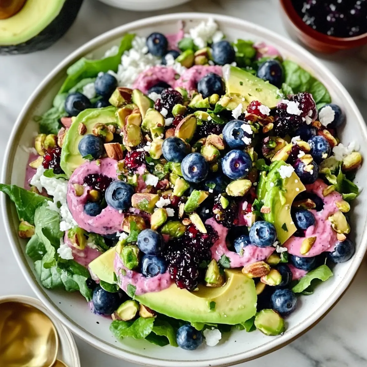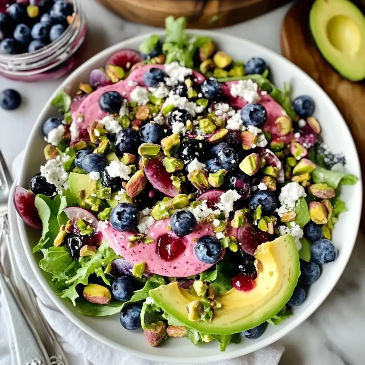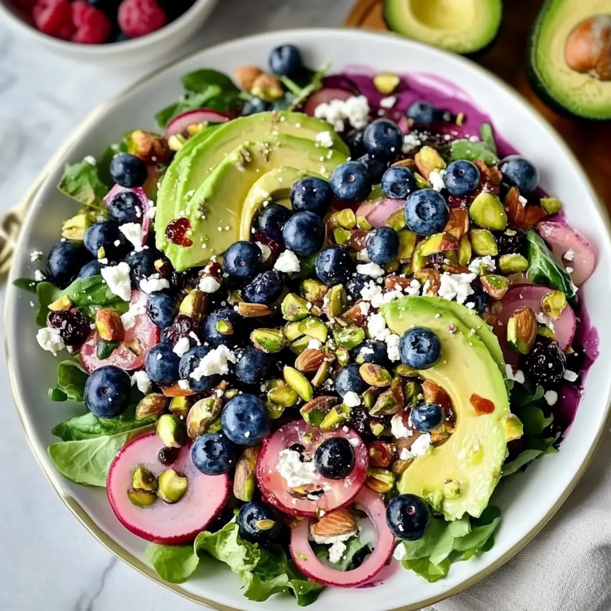 Vibrant Blueberry Pistachio Spring Salad showcases sweet blueberries, creamy avocado, and crunchy nuts, perfect for a fresh meal.