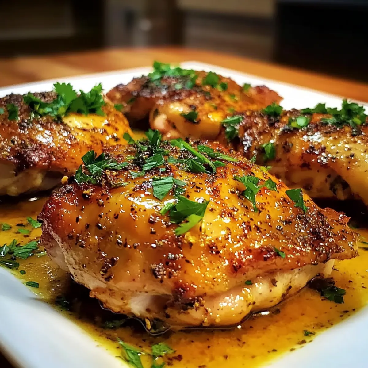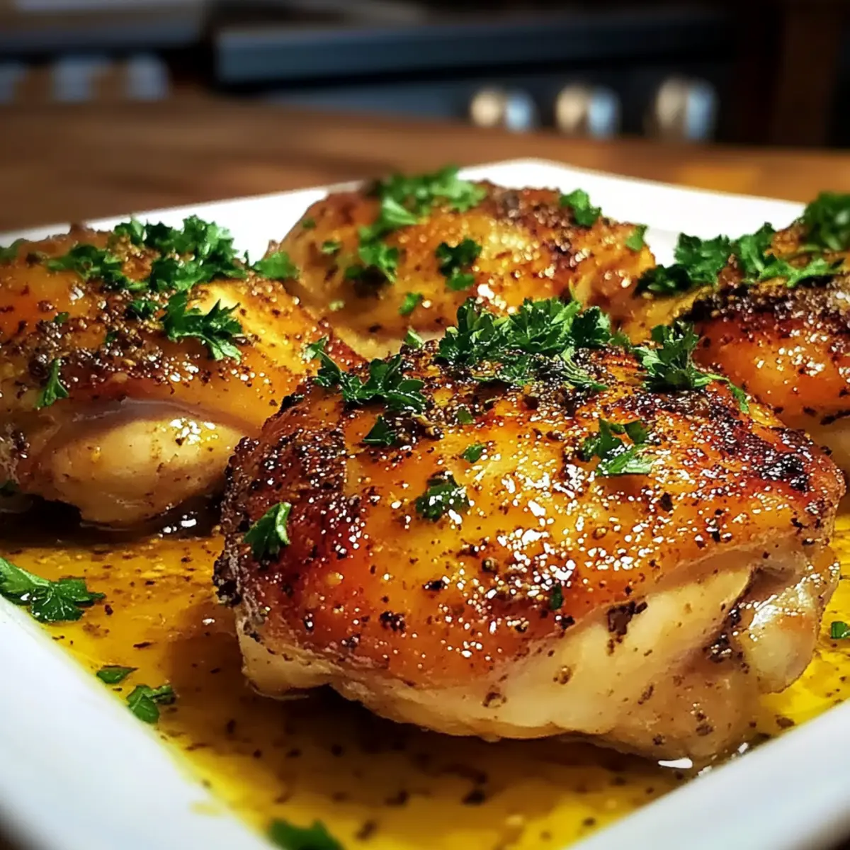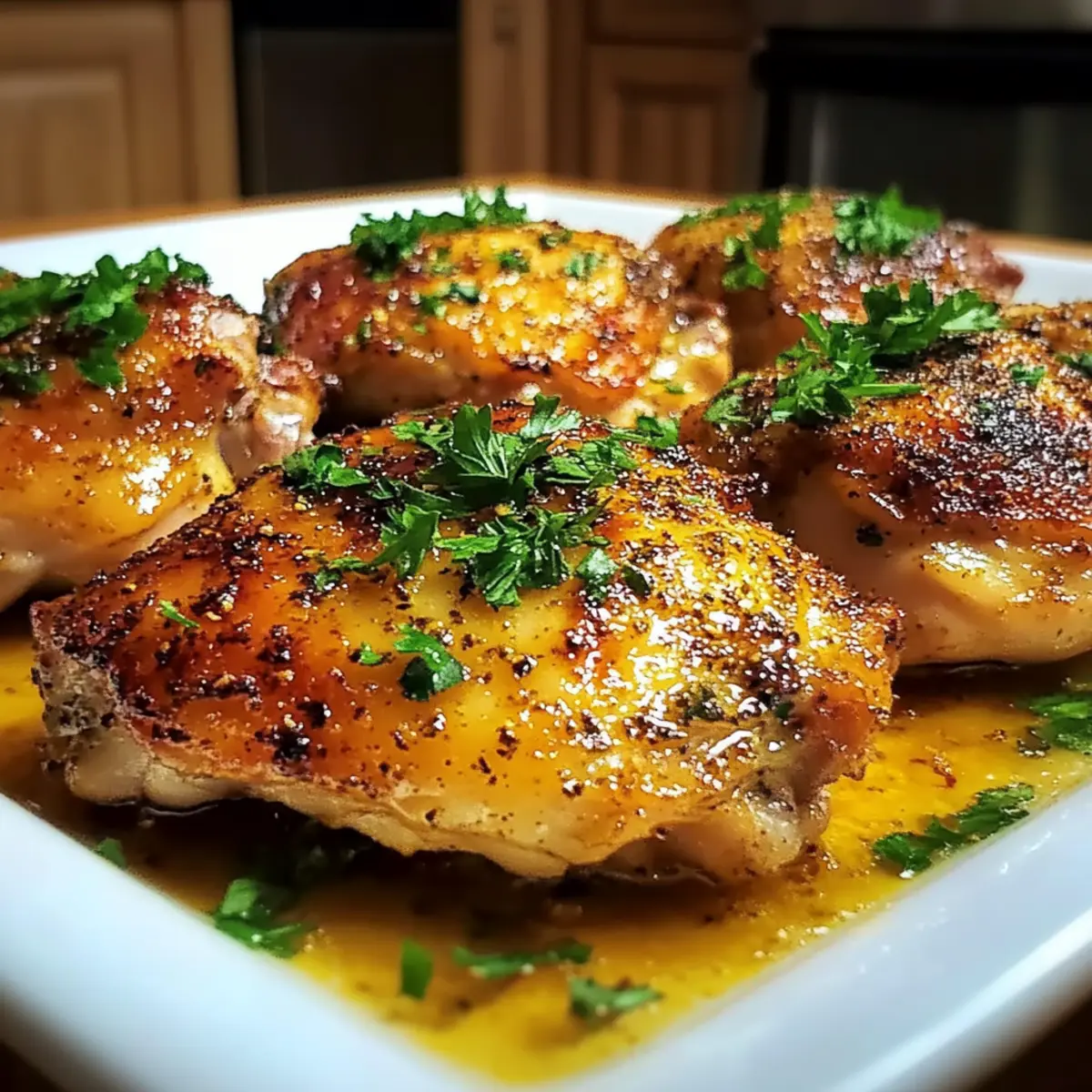 6. Remove the chicken thighs from the oven and let them rest for a few minutes. Garnish with fresh parsley before serving.