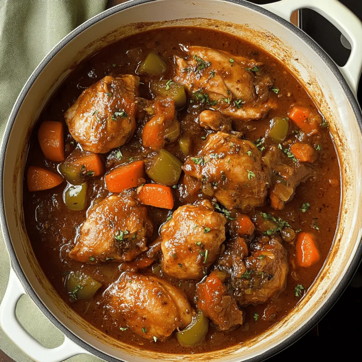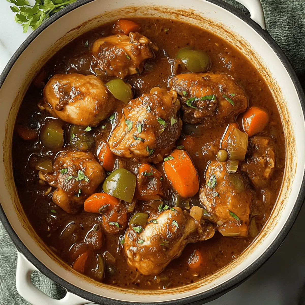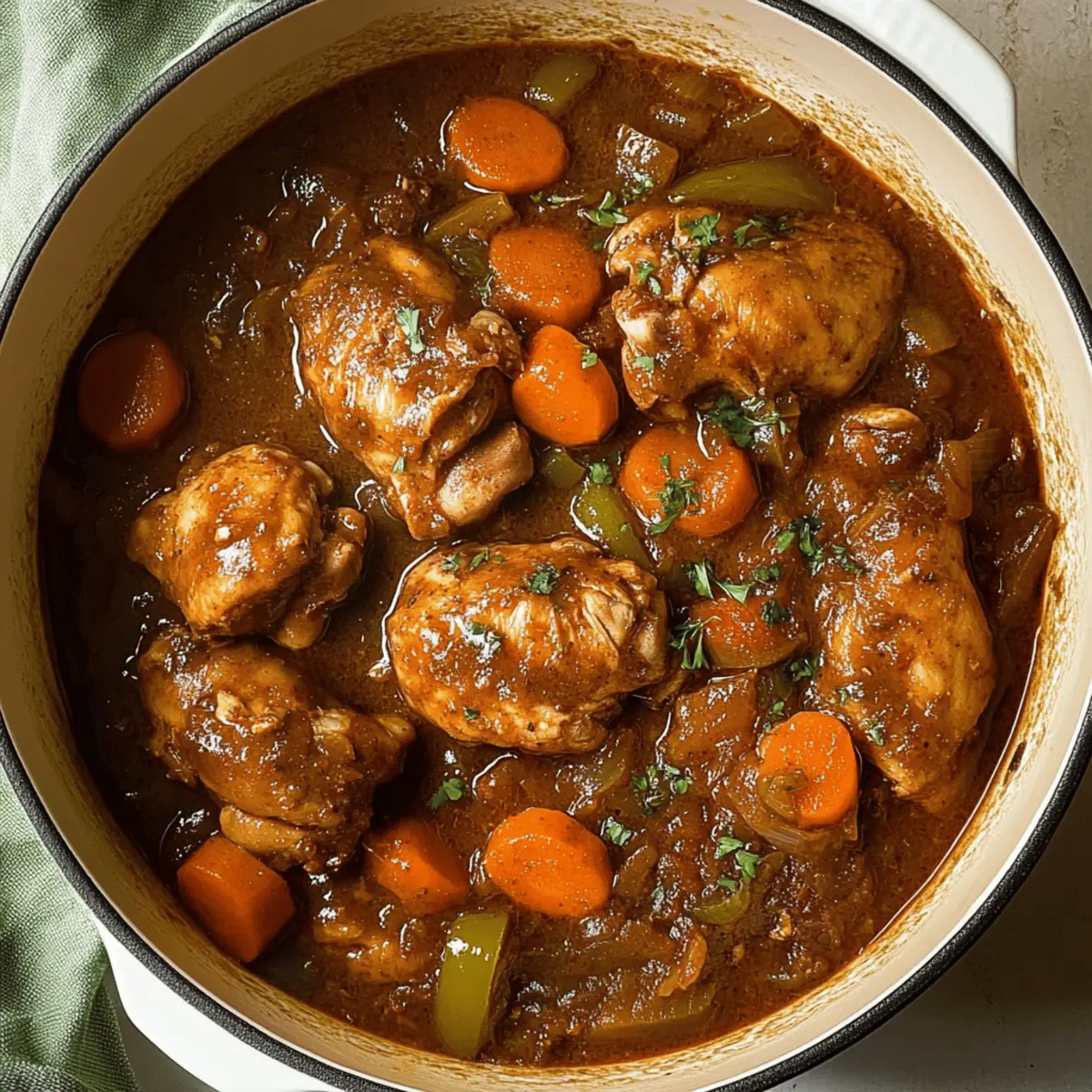 A rich and inviting aroma wafts through my kitchen as I think about the last time I made Jamaican Brown Stew Chicken. This traditional Caribbean dish is much more than a meal; it’s a comforting hug in a bowl, perfect for those evenings when you crave something hearty yet flavorful. With tender chicken simmered in a thick, aromatic gravy infused with vibrant vegetables and spices, this stew promises to transport you straight to the sun-soaked shores of Jamaica. Best of all, it comes together quickly and is gluten-free, making it easy to share with family and friends. Curiosity piqued? Let’s dive into the magic of making this delightful dish! Why is Brown Stew Chicken a must-try? Comforting Warmth: This dish offers a cozy hug in a bowl, filled with tender chicken and rich flavors that will warm your heart. Bursting with Flavor: The unique combination of spices, from habanero to smoky paprika, delivers an unforgettable taste that excites the palate. Quick Cooking: With a simple marinade and straightforward steps, you can whip up this hearty meal in no time, perfect for busy weeknights! Versatile Ingredients: Feel free to customize it by adding your favorite veggies or adjusting the spice level, ensuring it suits everyone’s tastes. Cultural Experience: Each bite brings a taste of the Caribbean, making your dining experience not just a meal but a journey to Jamaica. Enjoy it alongside fluffy rice, or consider serving it with some baked plantains for a true island feast! Brown Stew Chicken Ingredients For the Stew Bone-in Chicken Thighs or Drumsticks – The main protein that delivers a juicy and rich flavor. Substitution: Boneless chicken thighs or breasts can be used, adjusting cooking time accordingly. Chicken Bouillon or Chicken Base – Provides depth and enhances the chicken flavor. Substitution: None recommended. Chopped Scallions – Adds freshness and mild onion flavor. Substitution: Green onions can also be used. Habanero Peppers – Contributes heat and spice. Substitution: Jalapeños can be used for a milder flavor. Minced Garlic – Adds aromatic richness. Substitution: Garlic powder can be used (1 teaspoon for 2 cloves). Fresh Thyme Leaves – Enhances flavor with its earthy aroma. Substitution: Dried thyme can be used, but fresh is preferred. Freshly Grated Ginger – Provides warmth and spice. Substitution: Ground ginger (1 tsp) can be used in a pinch. Smoked Paprika – Adds a smoky flavor. Substitution: Sweet paprika can be used for a different flavor profile. Black Pepper – Seasoning that enhances the overall flavor. Substitution: Cayenne pepper for more heat. Oil – For browning the chicken and sautéing vegetables. Substitution: Canola or vegetable oil. Onion – A base flavor that adds sweetness when cooked. Substitution: Shallots can be used. Carrots – Adds sweetness and texture. Substitution: Parsnips can be a suitable alternative. Bell Pepper – Provides sweetness and a pop of color. Substitution: Any sweet pepper variety can be used. Ketchup – Contributes sweetness and body to the sauce. Substitution: Tomato paste can be used but adjust the sugar accordingly. Brown Sugar – Balances the savory elements. Substitution: Coconut sugar for a different sweetness. Browning Seasoning – A critical ingredient that gives the stew its characteristic flavor and color. Substitution: Maggi seasoning, soy sauce, or Worcestershire sauce can work in a pinch. Bay Leaves – Infuses flavor during cooking. Substitution: Dried thyme can be added for depth. Water – The base for the stew. No direct substitution; it forms part of the cooking liquid. Step‑by‑Step Instructions for Brown Stew Chicken Step 1: Marinate the Chicken In a large zip bag, combine the bone-in chicken thighs or drumsticks with chicken bouillon, chopped scallions, minced habanero, garlic, fresh thyme, grated ginger, smoked paprika, and black pepper. Massage the bag to ensure each piece is well coated, then refrigerate for at least 2 hours, preferably overnight, to enhance the flavors of your Brown Stew Chicken. Step 2: Brown the Chicken Heat a Dutch oven over medium-high heat and add enough oil to coat the bottom. Once the oil is shimmering, carefully place the marinated chicken pieces in the pot. Sear them for about 5-7 minutes on each side until they develop a deep golden-brown crust. Remove the chicken and set it aside on a plate while you prepare the vegetables. Step 3: Sauté Vegetables In the same pot, add a touch more oil if necessary, and throw in the chopped onion, diced carrots, and bell pepper. Sauté the vegetables for about 5 minutes, stirring frequently, until they soften and begin to caramelize, releasing a delicious aroma. This step builds the robust foundation for the rich gravy of your Brown Stew Chicken. Step 4: Prepare the Stew Return the browned chicken to the pot with the sautéed vegetables. Add ketchup, brown sugar, browning seasoning, bay leaves, and enough water to cover the chicken about halfway. Stir everything together to combine all the flavors, then bring it to a gentle simmer. Cover the pot with a lid, allowing the stew to cook for 20 minutes, soaking in all the deliciousness. Step 5: Simmer After 20 minutes, remove the lid, give the stew a good stir, and let it simmer uncovered for another 10 minutes. This will allow the sauce to thicken and intensify in flavor, while the chicken becomes tender. Keep an eye on the consistency; adjust seasoning with salt and pepper as necessary to complete the harmony of your Brown Stew Chicken. What to Serve with Jamaican Brown Stew Chicken Whether you’re planning a cozy family dinner or entertaining friends, pairing the flavors of this hearty dish can elevate your meal to new heights. Fluffy White Rice: The perfect canvas for your stew, soaking up the rich gravy and balancing its spices. Coconut Rice: Infused with sweet coconut milk, this option adds a tropical twist that complements the savory elements beautifully. Traditional Pe