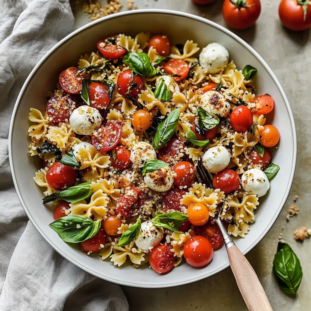 Transfer the Bruschetta Pasta Salad to a serving dish or individual bowls. For an appealing presentation, you can garnish with additional fresh basil leaves or a sprinkle of extra breadcrumbs on top. This refreshing salad is best served chilled or at room temperature, making it perfect for summer gatherings or as a nourishing lunch option that’s ready in under 30 minutes.