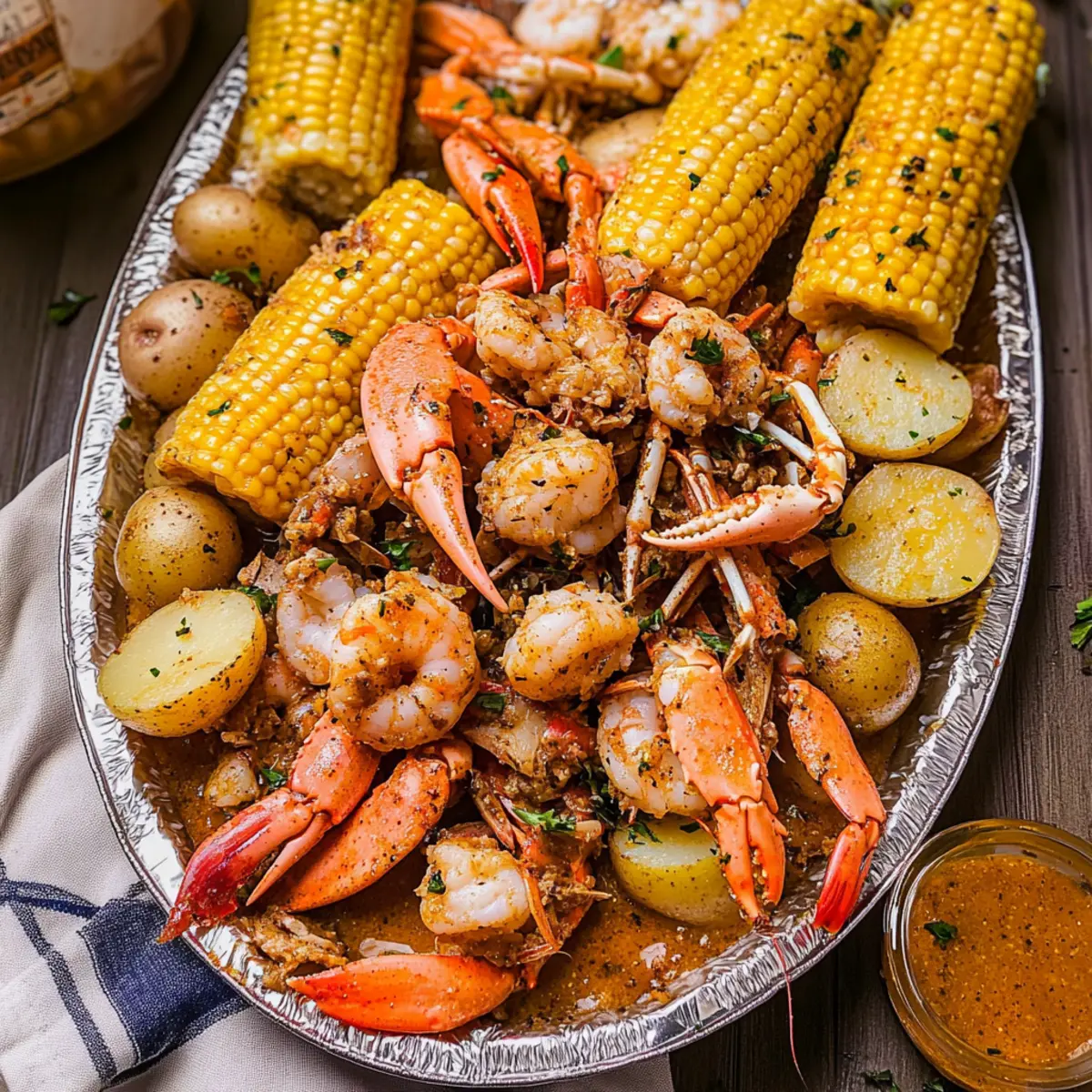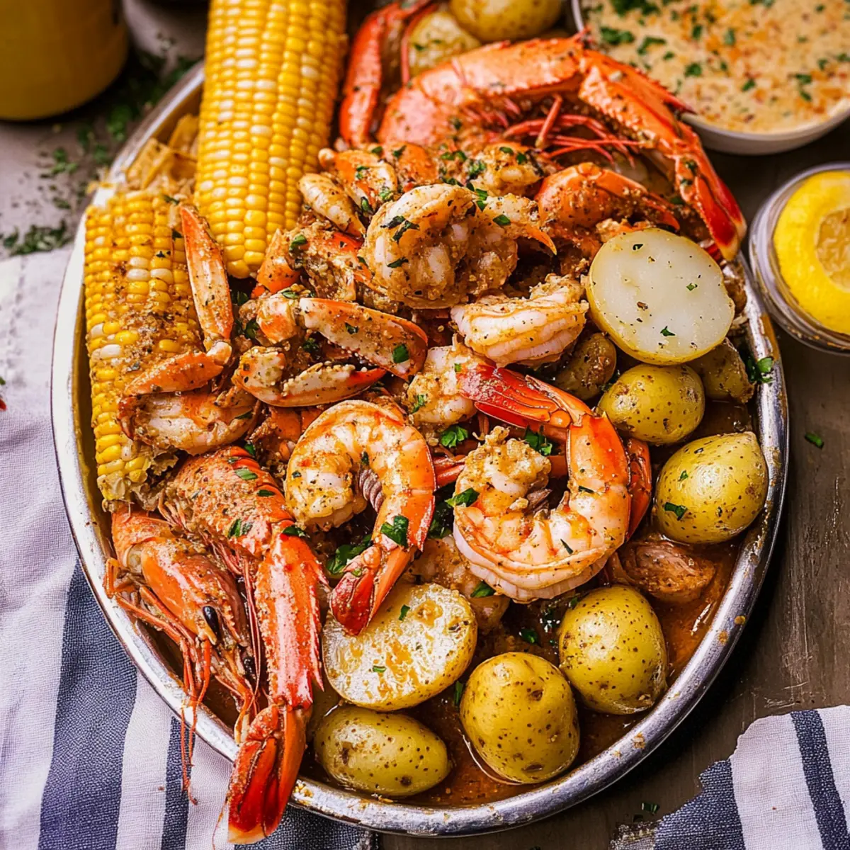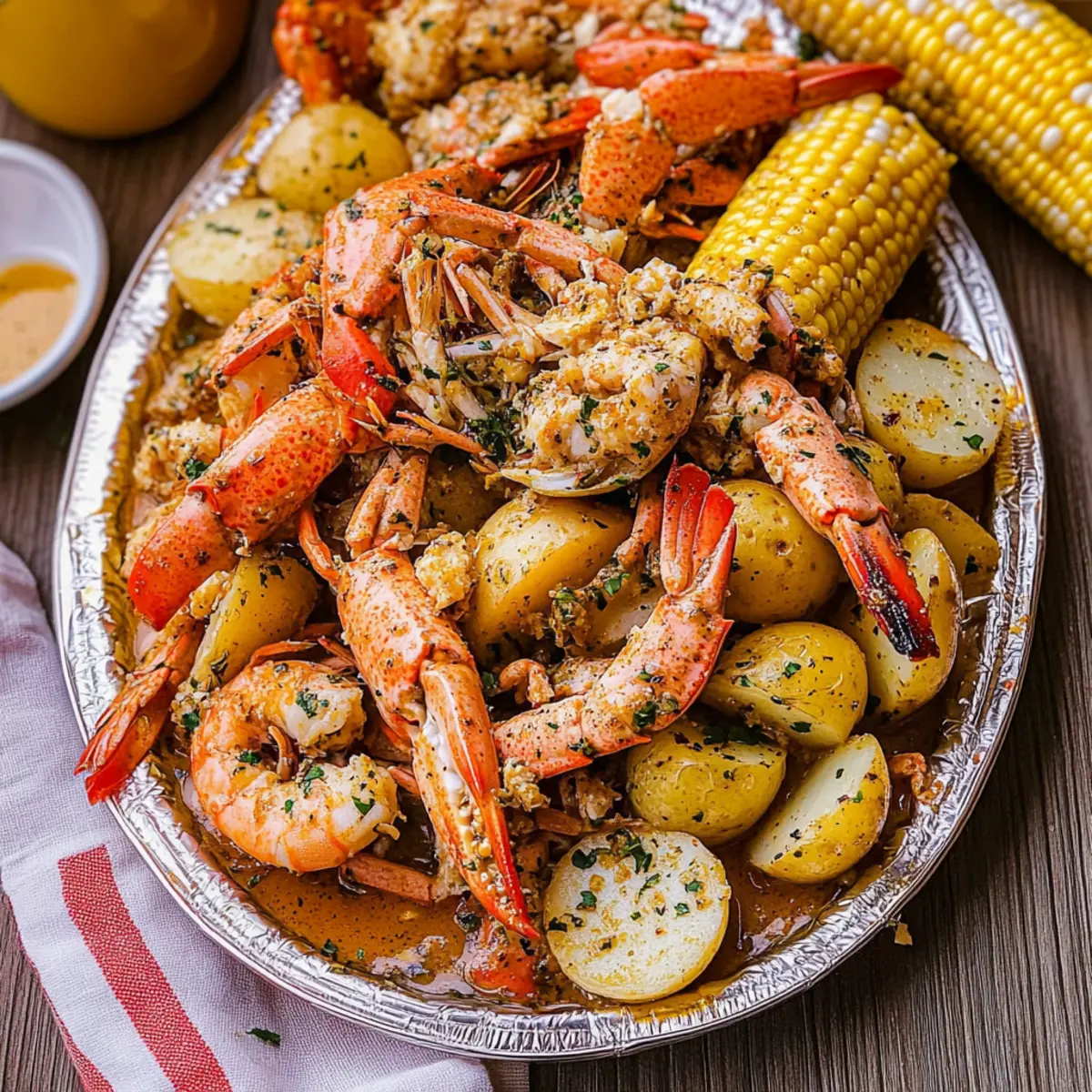 The savory aroma of this Cajun Seafood Boil wafts through the air like a warm invitation to gather around the table. With a sensational blend of succulent jumbo shrimp, sweet crab, and spicy andouille sausage mingling happily with hearty potatoes and fresh corn on the cob, this dish becomes a feast for both the eyes and the taste buds. Best of all, my Cajun Seafood Boil with Garlic Butter Sauce is not only a crowd-pleaser, but it’s also remarkably easy to prepare, making it a perfect choice for casual summer gatherings. Whether you’re a seasoned home chef or just looking to elevate your dinner game, this recipe allows for delightful customization—swap in your favorite seafood or adjust the spice level to suit your taste. Are you ready to dive into a dish that promises messy hands and happy hearts? Why Is This Recipe a Must-Try? Unforgettable Flavors: This Cajun Seafood Boil with Garlic Butter Sauce brings vibrant, zesty flavors to your table that will have everyone coming back for seconds. Community Feast: Enjoy digging into this lively dish that encourages laughter and conversation—a true celebration of togetherness! Customizable Delight: Feel free to swap shrimp for luxurious lobster tails or add seasonal veggies for a personal twist that caters to everyone’s taste. Quick Preparation: Simple preparation allows you to spend less time in the kitchen and more time enjoying the company of family and friends. Pair it with crusty bread to soak up that delicious garlic butter sauce! If you’re intrigued by more of these flavorful dishes, check out this Garlic Butter Steak you might also enjoy! Crowd-Pleaser: Perfect for summer gatherings, this dish impresses with its bold colors and aromas. Cajun Seafood Boil Ingredients • The key to a flavorful Cajun Seafood Boil lies in the quality and variety of ingredients you choose. For the Seafood Jumbo Shrimp – The star of the show; use fresh or frozen, deveined for convenience. Snow Crab Clusters – Adds delicate sweetness; opt for pre-cooked for easy preparation. Andouille Sausage – This smoky sausage provides a zesty kick; feel free to substitute with kielbasa for a milder flavor. For the Vegetables Small Potatoes – Baby or red potatoes add heartiness and absorb flavor beautifully. Corn on the Cob – Fresh and sweet; chop into halves for delightful bite-sized pieces. For the Extras Eggs – Hard-boiled for extra protein; a unique addition that brings richness to the boil. Cajun Seasoning – The key spice for that authentic Cajun flavor; tailor it to your heat preference with homemade or store-bought versions. Old Bay Seasoning – An optional enhancement for seafood flavor; highly recommended for an extra layer of taste. For the Sauce Garlic Butter Sauce – A luscious mix of melted butter, minced garlic, and seasonings that brings this dish together; don’t skimp on it! With these ingredients, your Cajun Seafood Boil with Garlic Butter Sauce is set to be a full-blown flavor festival. Enjoy customizing it to your palate and savor the experience of shared meals with loved ones! Step‑by‑Step Instructions for Cajun Seafood Boil with Garlic Butter Sauce Step 1: Prepare the Garlic Butter Sauce In a small saucepan over medium heat, melt 1 cup of unsalted butter until bubbly. Stir in 6 cloves of minced garlic and a teaspoon of Cajun seasoning, cooking for 2-3 minutes until fragrant but not browned. Once ready, remove from heat and set aside the garlic butter sauce, allowing it to infuse the flavors while you prepare the boil. Step 2: Boil the Base Ingredients In a large, heavy-bottomed pot, bring 4 quarts of water (or beer for flavor) to a vigorous boil over high heat. Add a generous 1/4 cup of Cajun seasoning and 2 tablespoons of Old Bay seasoning, stirring to combine. Allow the mixture to boil for 5 minutes, releasing the enticing aromas of Cajun seafood boil with garlic butter sauce that will fill your kitchen. Step 3: Cook the Potatoes Carefully add 1.5 pounds of small potatoes to the boiling mixture. Cook them for 10-15 minutes or until tender when pierced with a fork. The potatoes should be soft but not falling apart. This will create a hearty base for the seafood and absorb those delicious spices as they cook. Step 4: Add Corn and Sausage Next, toss in 4 halved ears of corn and 1 pound of sliced andouille sausage. Stir everything gently and allow it to boil together for another 5 minutes. You’ll see the corn brightening and the sausage plumping up, releasing its smoky flavors into the pot, marrying beautifully with the Cajun seasoning. Step 5: Incorporate the Seafood Add 2 pounds of jumbo shrimp and 1 pound of snow crab clusters to the pot. Carefully stir everything and let it cook for 5-7 minutes, until the shrimp turns bright pink and opaque. Watch for the crab to become hot, indicating it’s all ready to be drained and served for your Cajun seafood boil with garlic butter sauce. Step 6: Drain and Serve Using a large colander, carefully drain the pot, allowing all the flavorful broth to escape. Pour the seafood and vegetable medley onto a large platter or a newspaper-lined table for a rustic presentation. The vibrant colors and aromas will surely entice everyone to dig in! Step 7: Drizzle with Garlic Butter Sauce Generously drizzle the garlic butter sauce over the seafood and vegetables, ensuring every bite gets that rich, flavorful coating. Serve immediately while everything is warm and aromatic, and don’t forget to provide plenty of napkins for a hands-on dining experience with your Cajun seafood boil. Make Ahead Options Preparing your Cajun Seafood Boil with Garlic Butter Sauce in advance is a game-changer for busy weeknights or gatherings! You can chop the vegetables and clean the seafood up to 24 hours ahead of time, storing them in airtight containers in the refrigerator to maintain freshness. For the garlic butter sauce, simply prepare it a day before and store it in the fridge, reheating it before drizzling