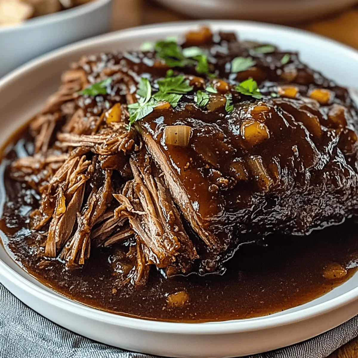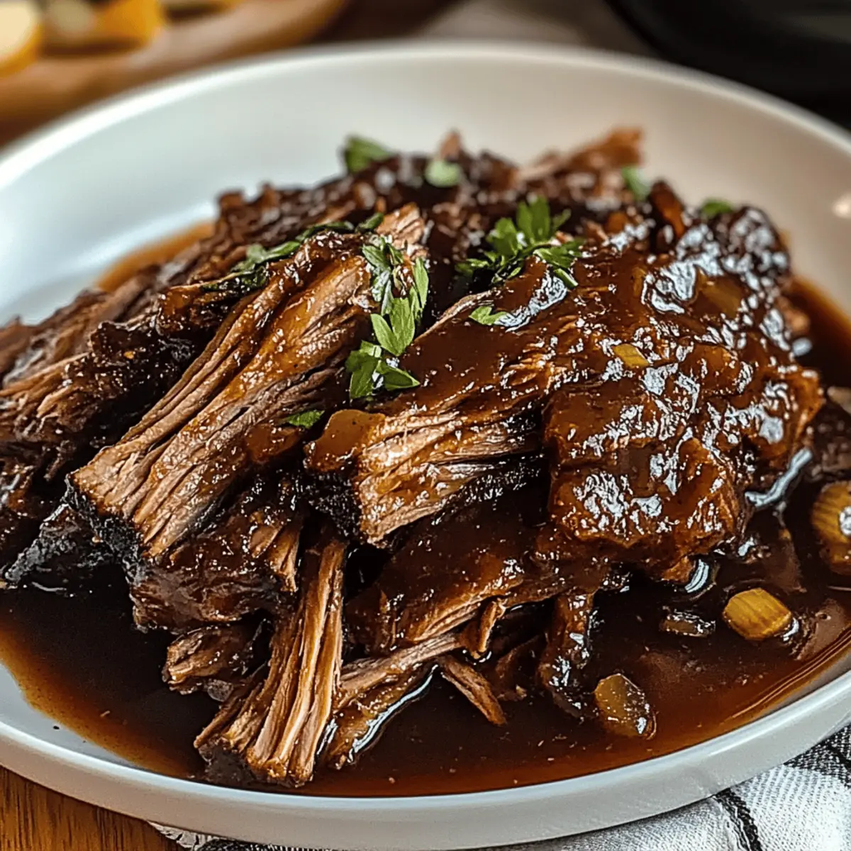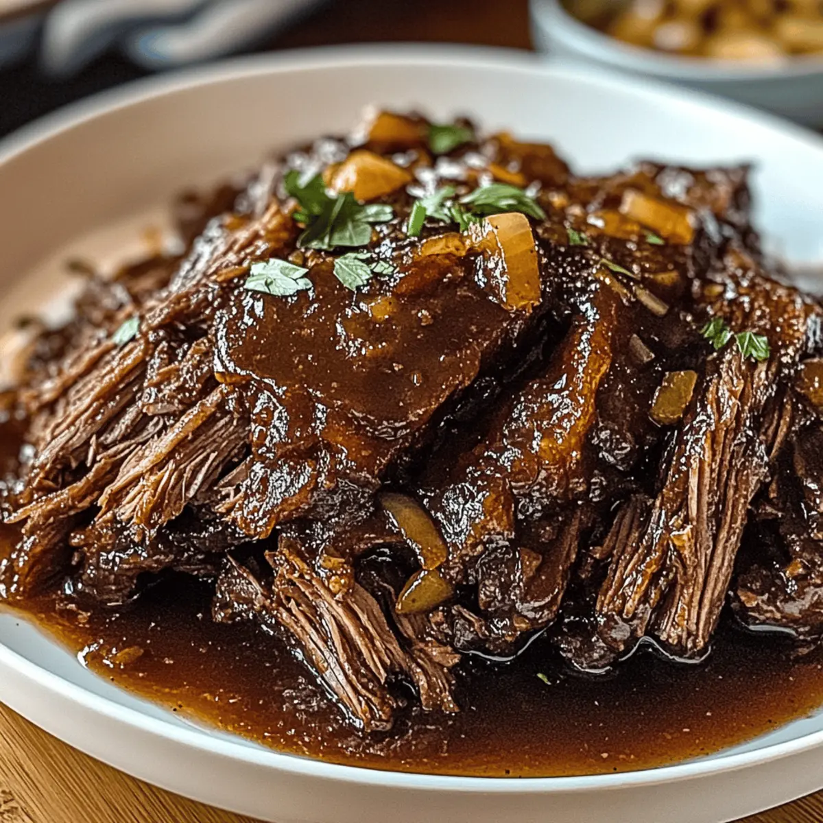 As the aroma of slow-cooked goodness fills your kitchen, it’s hard not to feel the warm embrace of nostalgia for family gatherings and cozy nights in. Our Caramelized Pulled Beef Brisket is that perfect dish that brings everyone together, serving up savory flavors that linger long after the meal is over. You’ll love how this recipe is not only meal prep-friendly, but it also transforms a humble cut of meat into a melt-in-your-mouth delight that’s versatile enough for tacos, sandwiches, or even crowned atop loaded fries. The caramelized glaze adds a beautiful finish, making it visually stunning as well as delicious. Ready to make your kitchen the heart of your home with this crowd-pleaser? Let’s dive into the details of this unforgettable recipe! Why is Caramelized Pulled Beef Brisket Amazing? Tender, Melt-in-Your-Mouth Goodness: The slow cooking method ensures a juicy brisket that simply falls apart. Flavor Explosion: Sweet caramelization combines beautifully with smoky spices, creating a robust taste that resonates with every bite. Versatile Dish: Enjoy this brisket in tacos, sandwiches, or atop loaded fries, transforming any meal into a feast! Perfect for Meal Prep: Make a big batch in one go and enjoy leftovers all week—just store in an airtight container to keep it fresh. Check out Savory Ground Beef for another easy weeknight meal! Impressive Presentation: The glossy caramelized finish not only tastes great but looks stunning on any table, ready to wow your guests. Caramelized Pulled Beef Brisket Ingredients For the Brisket • Beef Brisket – This tender cut benefits immensely from slow cooking; feel free to substitute with chuck roast for a leaner option. • Olive Oil – Used for searing brisket to enhance flavor; can replace with vegetable oil if preferred. • Salt & Black Pepper – Essential for seasoning, adjust to your taste for that perfect savory note. • Smoked Paprika – Infuses a beautiful smokiness; sweet paprika works well in its place. • Garlic Powder & Onion Powder – Provide aromatic depth; replace with fresh garlic and onion, adjusting the amounts as needed. • Chili Powder (optional) – Adds a bit of heat; simply omit if you prefer zero spice. • Beef Broth – Keeps the brisket moist and flavorful; low-sodium is preferred for less salt. • Barbecue Sauce – Adds that sweet and tangy touch; try a homemade or low-sugar version as an alternative. • Worcestershire Sauce – Introduces umami depth; soy sauce can also work if you’re in a pinch. • Dijon Mustard – Essential for a pop of tang; yellow mustard is a great substitute if needed. • Brown Sugar – Aids in caramelization; feel free to swap it for honey or coconut sugar for a natural sweetener. • Onion (sliced) & Garlic (minced) – Adds aromatic layers during cooking to enhance the overall flavor. For Caramelization • Butter – Combines beautifully with sugar for a rich glaze; olive oil can be used if you have dietary preferences. • Brown Sugar – This is a crucial ingredient for achieving caramelization; alternatives like maple syrup can also be used. • Beef Drippings – Enhances the flavor during caramelization; however, this can be omitted if unavailable. Step‑by‑Step Instructions for Caramelized Pulled Beef Brisket Step 1: Prepare Brisket Start by patting the beef brisket dry using paper towels. In a small bowl, mix together the salt, black pepper, smoked paprika, garlic powder, onion powder, and optional chili powder, then rub this spice blend all over the brisket. Ensure it’s well coated, as this will enhance the flavor during the cooking process. Step 2: Sear Brisket Heat a large skillet over medium-high heat and drizzle in olive oil. Once hot, carefully place the seasoned brisket in the pan and sear for about 2-3 minutes per side until it develops a golden-brown crust. This step caramelizes the exterior, deepening the flavor before slow cooking the brisket for ultimate tenderness. Step 3: Cook Brisket Transfer the seared brisket to a slow cooker or a roasting pan. Pour in the beef broth, barbecue sauce, Worcestershire sauce, and add the sliced onion and minced garlic. If using a slow cooker, set it on low for 6-8 hours, or preheat your oven to 300°F (150°C) and cook for 3-4 hours. The brisket should be fork-tender when done. Step 4: Shred Meat Once cooked, remove the brisket from the heat and let it rest for about 15 minutes. Using two forks, carefully shred the meat into bite-sized pieces, making sure to reserve the flavorful cooking liquid. This ensures your Caramelized Pulled Beef Brisket remains juicy and packed with flavor. Step 5: Caramelize Shredded Meat In a large skillet, combine butter, brown sugar, a splash of the reserved drippings, and a touch of Worcestershire sauce over medium heat. Once melted, add the shredded brisket and toss to coat. Cook for about 5-7 minutes, or until the meat is caramelized and the edges are starting to crisp, enhancing the overall flavor of your dish. Variations & Substitutions for Caramelized Pulled Beef Brisket Feel free to take this recipe to new heights with your own creative twist! Dairy-Free: Substitute butter with olive oil during caramelization for a creamy texture without the dairy. Spicy Kick: Add a tablespoon of your favorite hot sauce or diced jalapeños in the cooking phase for an exciting heat level. Smoky Flavor Boost: Incorporate a few drops of liquid smoke to give a deeper BBQ flavor, even without a grill. Vegetarian Option: Swap brisket for jackfruit or mushrooms, using the same spices and cooking method for a hearty plant-based alternative. Asian Influence: Replace barbecue sauce with hoisin or teriyaki sauce for an Asian twist. Serve it in buns or over rice for fusion goodness. BBQ Meatballs: Use the pulled beef to make meatballs, combining with breadcrumbs and baking until golden. Pair with spicy sauce for a fun appetizer! Zesty Touch: Mix in a tablespoon of lime juice before serving for a re