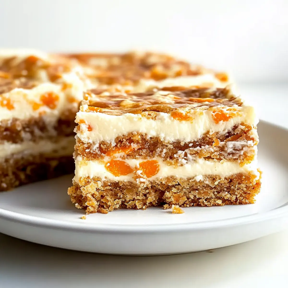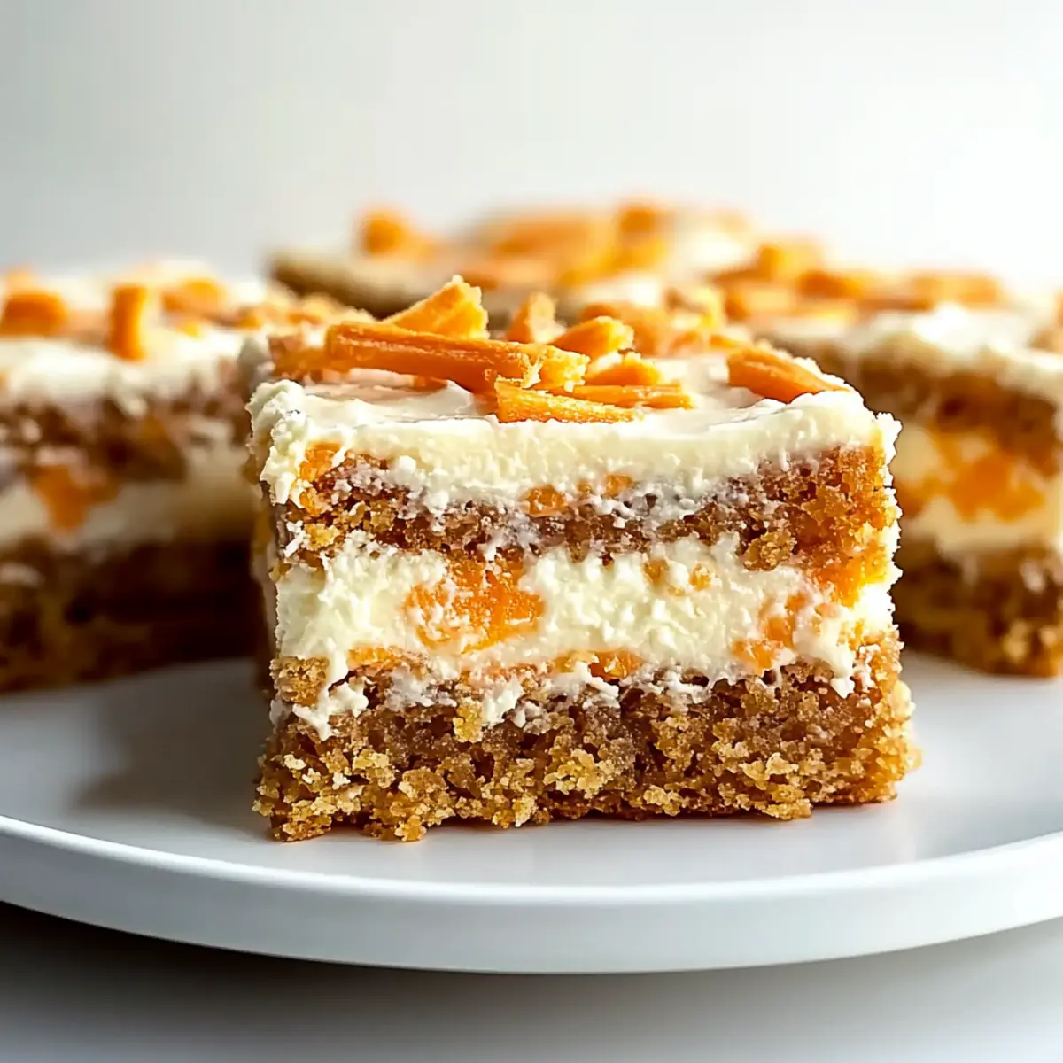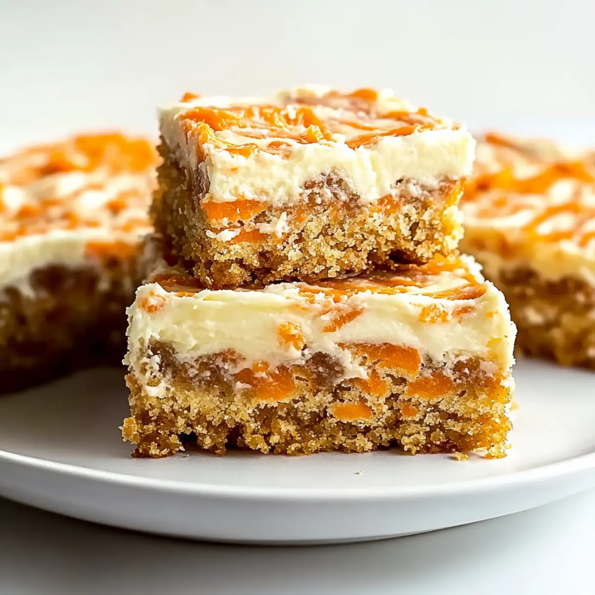 The aroma of freshly baked carrot cake wafted through my kitchen, instantly creating a cozy atmosphere reminiscent of family gatherings. As I savored each moment, I realized that these One-Bowl Cream Cheese Frosted Carrot Cake Bars were not only a delightful spin on the classic dessert but also incredibly simple to whip up. Packed with shredded carrots and warm spices, this easy-to-make treat delivers the perfect harmony of comfort and convenience, making it an ideal choice for last-minute gatherings or casual snacking. The rich cream cheese frosting takes these bars to another level of indulgence. Are you ready to delight your taste buds with this fantastic recipe? Let’s dive in! Why are these Carrot Cake Bars irresistible? Moist and Flavorful: These bars are incredibly moist, thanks to sweet shredded carrots and a blend of warm spices that resonate with your comfort cravings. One-Bowl Convenience: The simplicity of a one-bowl recipe means less cleanup and more time to enjoy with friends and family. Creamy Bliss: Topped with rich cream cheese frosting, they bring a delightful tang that perfectly complements the sweetness of the cake. Versatile Delight: Enjoy them as an afternoon snack, or dress them up as dessert at your next party—these bars will shine on any occasion! Make Ahead Magic: Store them for a few days or freeze them; they’re just as delicious after a little time in the fridge. You might also want to check out our Lemon Eclair Cake or Cheesecake Fruit Salad for more delightful dessert options! Carrot Cake Bars Ingredients For the Bars • Butter – Adds richness and moisture; use unsalted for better control of salt levels. • Brown Sugar – Provides sweetness and a hint of caramel flavor; can substitute with white sugar for a lighter texture. • Egg – Acts as a binder and adds moisture; free-range eggs can enhance flavor. • Vanilla Extract – Adds warmth and depth; opt for pure vanilla for best results. • All-Purpose Flour – Gives structure to the bars; alternatively, use gluten-free flour for a gluten-free version. • Ground Cinnamon – Infuses warm spice flavors; adjust amount to taste, or substitute with a mixed spice blend. • Baking Powder – Helps the bars rise; ensure freshness to avoid flat bars. • Salt – Enhances flavor and balance; use kosher salt for a less strong salty taste. • Shredded Carrots – Main flavor component, providing moisture and sweetness; freshly grated carrots are preferred over pre-shredded. For the Cream Cheese Frosting • Cream Cheese – Used in frosting for a tangy and creamy texture; make sure it’s at room temperature to avoid lumps. • Powdered Sugar – Sweetens and thickens the frosting; can substitute with a sugar alternative for reduced-sugar options. The perfect Carrot Cake Bars start with these simple ingredients, setting the stage for a delightful baking experience! Step‑by‑Step Instructions for One-Bowl Cream Cheese Frosted Carrot Cake Bars Step 1: Preheat and Prepare Begin by preheating your oven to 350°F (175°C). While the oven warms up, grease an 8×8 inch baking pan with a little butter or line it with parchment paper for easy removal. This preparation will ensure a nice golden crust on your carrot cake bars when they come out of the oven. Step 2: Melt the Butter In a microwave-safe bowl, melt ½ cup of unsalted butter until completely liquid—this should take about 30-45 seconds. Once melted, mix in 1 cup of brown sugar until the mixture is smooth and glossy. This creamy base will add richness to your carrot cake bars, setting the stage for the delightful flavors to come. Step 3: Incorporate Eggs and Vanilla Add 1 large egg and 1 teaspoon of pure vanilla extract to the melted butter and sugar mixture. Vigorously stir until completely integrated, creating a smooth, rich batter. The egg acts as a binder, ensuring your carrot cake bars have that moist texture, while vanilla adds depth and warmth to the flavor profile. Step 4: Combine Dry Ingredients Sift in 1 ½ cups of all-purpose flour, 1 teaspoon of ground cinnamon, 1 teaspoon of baking powder, and ¼ teaspoon of salt into the batter. Gently mix with a spatula or wooden spoon just until combined—be careful not to overmix, as this can make your bars dense. You want a thick batter that is still slightly lumpy for the best texture. Step 5: Fold in Carrots Carefully fold in 1 ½ cups of freshly shredded carrots into the batter. The carrots add both natural sweetness and moisture, providing a beautiful orange hue. Take your time to ensure the carrots are evenly incorporated without overworking the batter, which is key to achieving those perfect One-Bowl Cream Cheese Frosted Carrot Cake Bars. Step 6: Prepare the Cream Cheese Frosting In a separate bowl, beat together 8 oz of room-temperature cream cheese and 1 cup of powdered sugar until the mixture is smooth and creamy, about 2-3 minutes. Add in an egg yolk and another splash of vanilla, blending until fully combined. This luscious frosting will create a delightful layer atop your carrot cake bars. Step 7: Layer the Batter Spoon half of the carrot batter into the prepared baking pan and spread it evenly. Dollop the cream cheese mixture over the top in spoonfuls, then layer the remaining carrot batter on top. Use a spatula to spread it gently, ensuring the cream cheese remains visible in places for a marbled effect. Step 8: Create a Marble Effect Using a butter knife or skewer, softly swirl the batters together. This will create a beautiful marbled look and infuse the flavors throughout your One-Bowl Cream Cheese Frosted Carrot Cake Bars without completely mixing the layers. Aim for a design that highlights both the carrot and cream cheese layers. Step 9: Bake to Perfection Place the pan in the preheated oven and bake for 35-40 minutes. The edges should be golden brown while the center remains slightly jiggly—this means they are perfectly cooked and will firm up as they cool. Avoid opening 