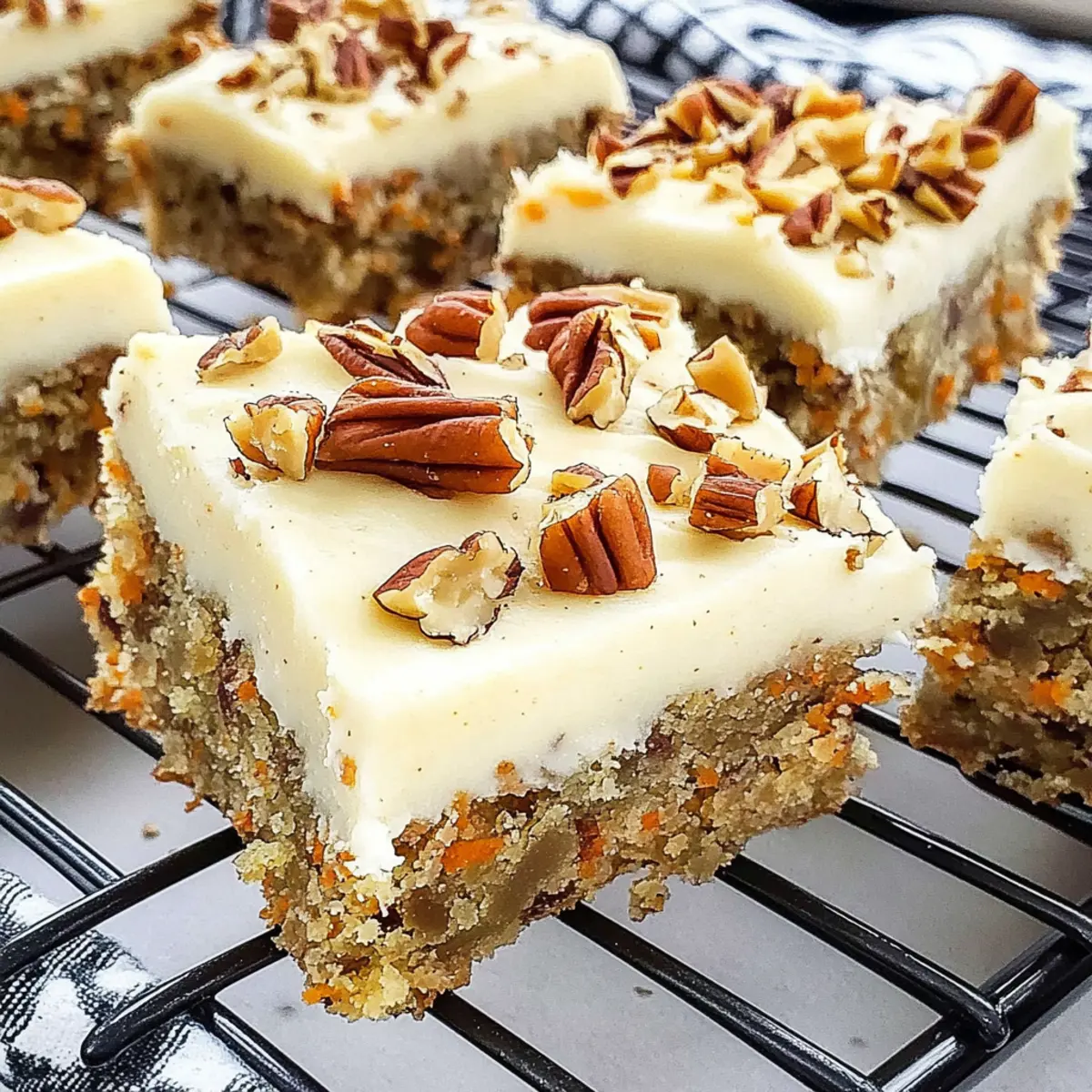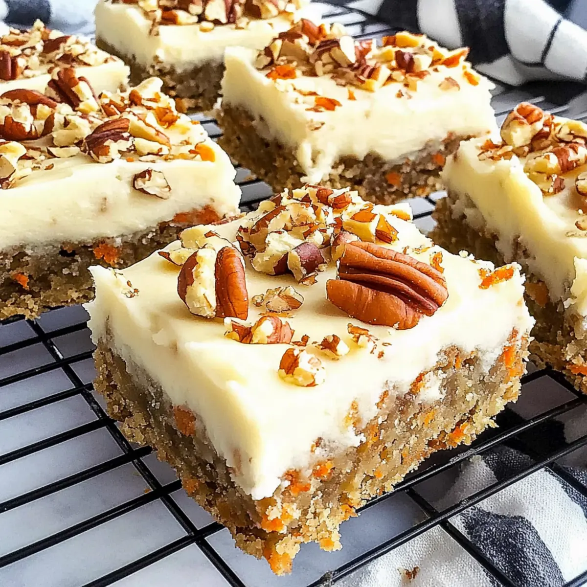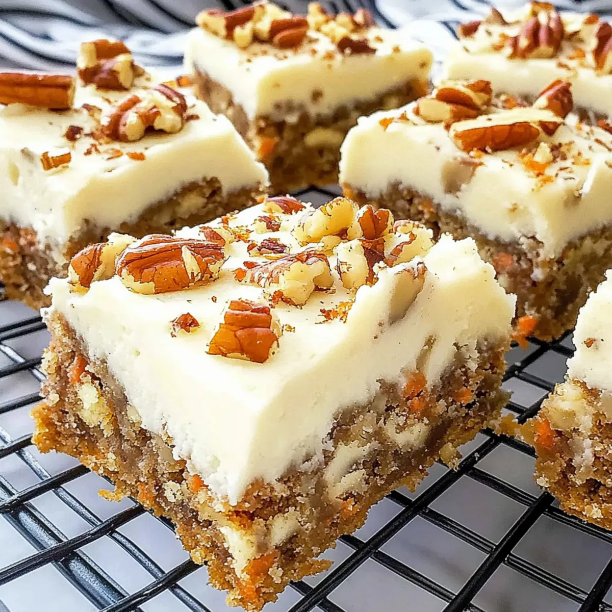 Spring is in the air, and with it comes the sweet aroma of baking that’s sure to awaken your senses! I’m thrilled to share my favorite recipe for Easy Carrot Cake Blondies with Cream Cheese Frosting—these delightful dessert bars are not only soft and chewy, but they can be whipped up in no time, making them perfect for last-minute gatherings. Infused with warm spices and topped with a velvety cream cheese frosting, they’re truly a crowd-pleaser that can be customized with your favorite mix-ins, like walnuts or a sprinkle of cinnamon. Whether it’s for a festive brunch or simply a cozy afternoon treat, these blondies are a go-to comfort that promises to deliver smiles. Ready to bake something that will leave everyone wanting more? Let’s dive into the recipe! What Makes These Blondies Irresistible? Soft, Chewy Texture: These Carrot Cake Blondies offer the same comforting bite as your favorite carrot cake, all while being presented in a convenient bar form. Easy to Customize: With optional additions like cinnamon and pecans, you can tailor these blondies to suit your mood or guests—add chocolate chips for an extra sweet twist! Quick Baking Time: Need a last-minute dessert? These blondies whip up quickly, making them an ideal treat for unexpected visitors or spring gatherings. Delicious Frosting Magic: The cream cheese frosting is the crowning glory, adding a rich, tangy flavor that perfectly complements the warm spices of the blondies. Memorable for Any Occasion: These dessert bars are perfect for brunches, holiday parties, or simply as a cozy afternoon snack. They will definitely leave your friends and family asking for the recipe! Pair them with a light Cheesecake Fruit Salad for a refreshing touch or serve alongside a slice of Bourbon Peach Cake to impress your guests even more! Carrot Cake Blondies Ingredients For the Blondies • Butter – Adds moisture and richness; melted butter mixes seamlessly into the batter. • Brown Sugar – Provides sweetness with a hint of caramel flavor; can substitute with granulated sugar for a lighter taste. • Large Egg – Binds ingredients and adds moisture; replace with a flax egg for a vegan alternative. • Vanilla Extract – Enhances depth of flavor; you can use vanilla bean paste for an even richer aroma. • Grated Carrot – Infuses natural sweetness and moisture; zucchini can be a great substitute for similar texture. • Flour – The backbone of the blondies; opt for a gluten-free flour blend to keep it gluten-free. • Salt – Balances sweetness and enhances flavor; be sure not to skip it! • Cinnamon (optional) – Adds warmth and spice; feel free to omit if a milder taste is preferred. • Chopped Pecans (optional) – Provides a crunchy, nutty flavor; substitute with walnuts or omit for a nut-free version. For the Frosting • Cream Cheese – Offers a tangy, creamy texture; mascarpone can be used for a different flavor profile. • Additional Butter – Creates a creamy and rich frosting; make sure it’s softened for easy mixing. • Powdered Sugar – Sweetens and thickens the frosting; you can use a sugar substitute for lower-calorie options. • Vanilla Extract (for frosting) – Enhances the frosting flavor; use the same as in the blondies. • Chopped Pecans (for garnish) – Adds visual appeal and crunch; omit for a simpler presentation. These Carrot Cake Blondies are as delicious as they are customizable—so gather your ingredients and let’s get baking! Step‑by‑Step Instructions for Easy Carrot Cake Blondies Step 1: Preheat the Oven Begin by preheating your oven to 350°F (175°C). This ensures that your Carrot Cake Blondies bake evenly and achieve that perfect golden-brown crust. While the oven is heating up, gather your baking supplies, including an 8×8-inch pan and parchment paper to line it later. Step 2: Melt Butter and Mix Sugar In a saucepan over medium heat, melt ½ cup of butter until it turns light golden, stirring often for about 3 minutes. Once melted, mix in 1 cup of brown sugar until the mixture is smooth and well combined. Remove from heat and allow it to cool for around 10 minutes; this step is crucial to avoid cooking the egg in the next step. Step 3: Incorporate Wet Ingredients Stir in 1 cup of grated carrots, 1 large egg, and 1 teaspoon of vanilla extract into the cooled butter-sugar mixture. Mix until all ingredients are thoroughly combined, creating a vibrant and fragrant batter. The grated carrots will provide natural sweetness and moisture, essential for the chewy texture of your Carrot Cake Blondies. Step 4: Add Dry Ingredients Next, sift in 1 cup of flour, ½ teaspoon of salt, and 1 teaspoon of cinnamon (if using) into the wet mixture. Gently fold these ingredients together until just combined, ensuring not to overmix. If you’re using chopped pecans, now’s the time to add them in for an added crunch that perfectly complements the flavors. Step 5: Prepare the Baking Pan Line your 8×8 baking pan with parchment paper, allowing some to overhang for easy removal later. Pour the prepared batter into the pan, spreading it evenly with a spatula for uniform baking. The batter should have a lovely, thick consistency, ready to rise and become glorious blondies. Step 6: Bake the Blondies Slide the pan into your preheated oven and bake for 19 to 23 minutes, or until a toothpick inserted into the center comes out clean. Keep an eye on them toward the end of baking; they should have a golden crust and a soft, chewy center. Once done, remove them from the oven and let them cool completely in the pan. Step 7: Prepare the Cream Cheese Frosting While the blondies cool, prepare the frosting. In a mixing bowl, beat together 4 oz of softened cream cheese and ¼ cup of softened butter for about 2 minutes until smooth and creamy. Gradually add in 2 cups of powdered sugar along with 1 teaspoon of vanilla extract, whipping for an additional 2 minutes until fluffy and well blended. Step 8: Frost and 