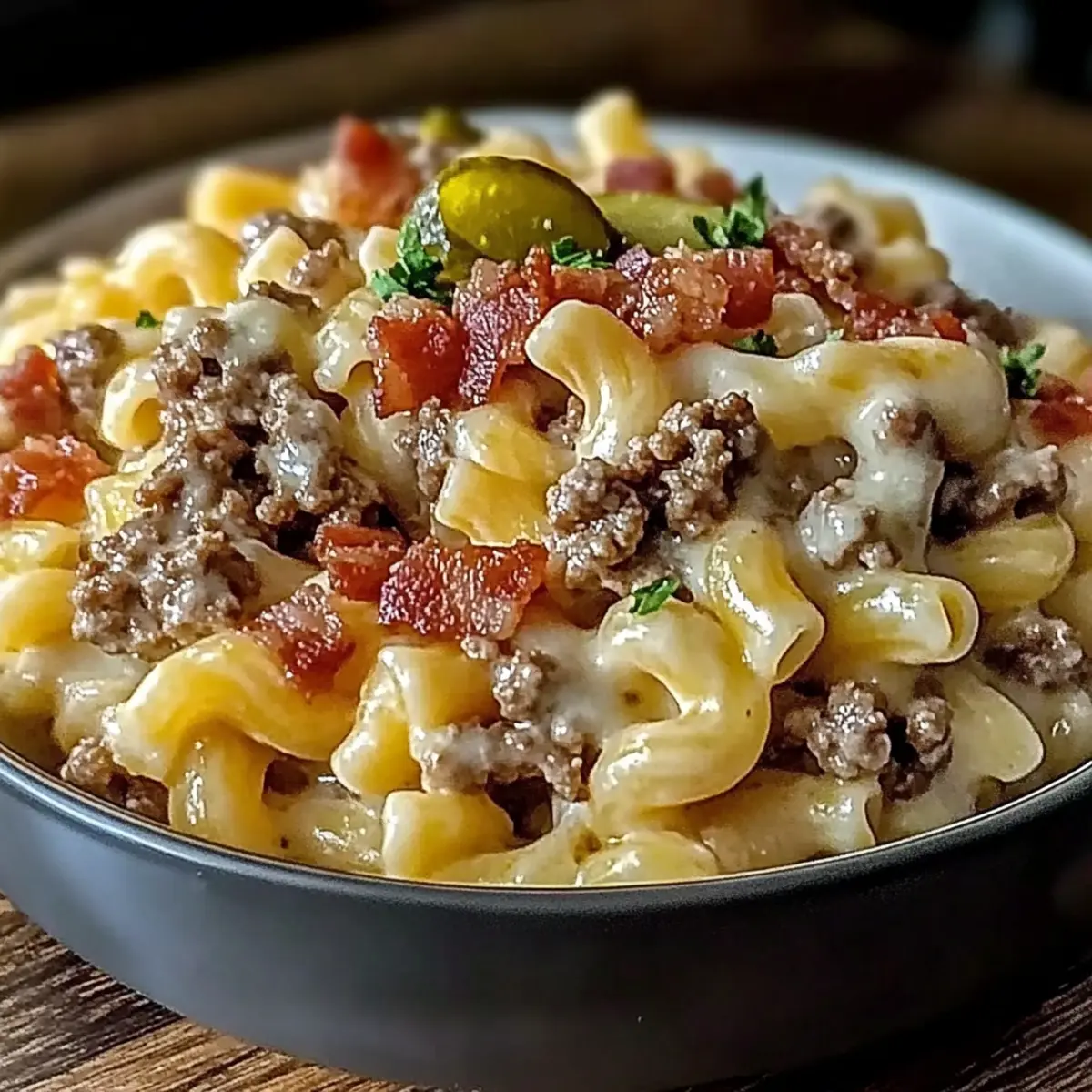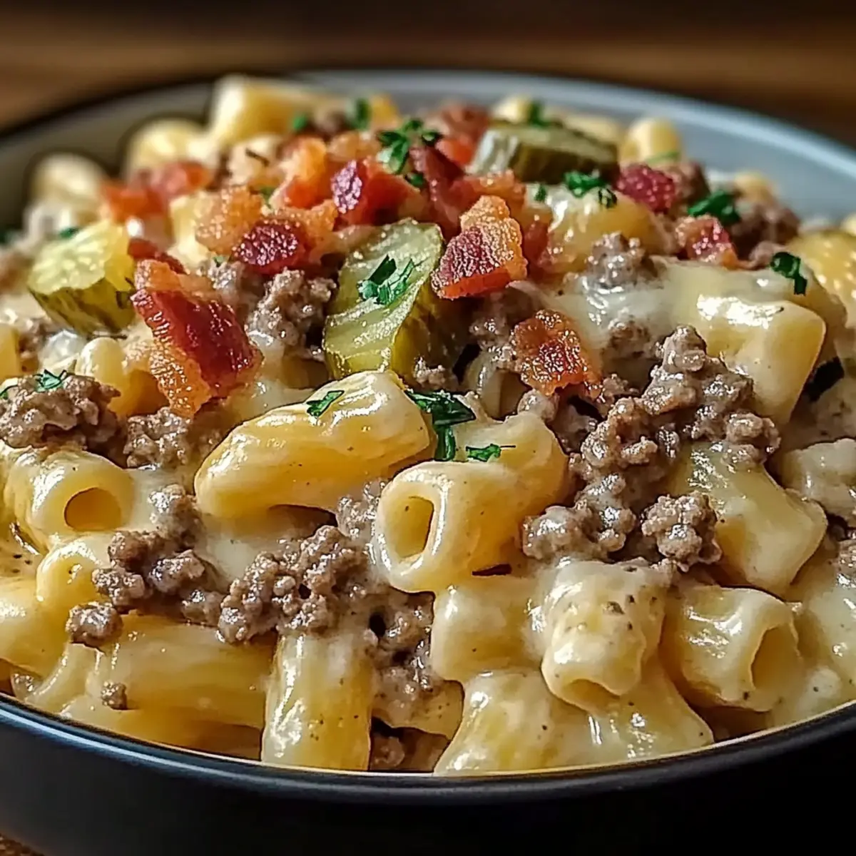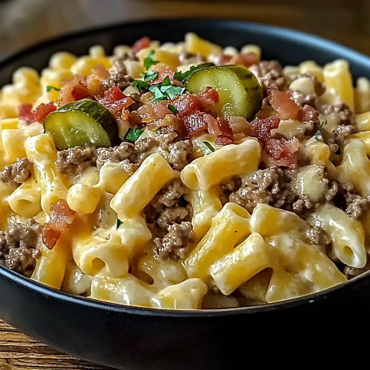 As I stirred the pot, an intoxicating aroma of rich Alfredo sauce and sizzling beef filled my kitchen, taking me back to backyard barbecues with family and friends. This Loaded Cheeseburger Alfredo Pasta is my go-to comfort food, making it a favorite for those busy weeknights when I crave something hearty and fulfilling. Not only is this one-pan recipe a breeze to whip up, but it also combines the nostalgic flavors of a classic cheeseburger with the creamy indulgence of pasta—a meal that everyone in the family will rave about. Just picture a plate piled high with gooey cheese, savory bacon, and crunchy pickles mingling together in perfect harmony. Ready to dive into this ultimate mash-up? Let’s set the stage for a delicious dinner! Why is this Cheeseburger Alfredo Pasta a Must? Ultimate Comfort: You’ll find this dish is the perfect solution for busy weeknights, combining the nostalgia of a cheeseburger with creamy pasta in one simple recipe. One-Pan Wonder: No one enjoys a mountain of dishes; that’s why this delicious Taco Pasta Bake is made all in one pan! Customizable Flavors: Switch up the ingredients with ground turkey or sautéed veggies for a lighter twist or even add spicy sausage for a kick! Crowd-Pleasing: It’s a surefire hit at family gatherings and casual get-togethers, just like the beloved Garlic Parmesan Pasta. Rich, Savory Satisfaction: The mixture of rich cheeses, seasoned beef, and crispy bacon creates a meal that is as satisfying as it is indulgent. Quick and Easy: With minimal prep and cook time, you can whip this up and enjoy a hearty meal in under 30 minutes! Cheeseburger Alfredo Pasta Ingredients For the Pasta Pasta – Use short shapes like penne or rotini for the best texture and to hold onto the creamy sauce. For the Beef Ground Beef – Choose well-seasoned beef to capture that classic cheeseburger essence. Olive Oil – This is essential for sautéing and helps prevent the meat from sticking. Onion Powder – Adds savory depth; feel free to swap with fresh onions if desired. Garlic Powder – It gives a wonderful aroma and enhances the overall flavor profile. Smoked Paprika – Brings in warmth and a hint of smokiness that complements the dish beautifully. Salt & Pepper – Basic seasonings that elevate the overall flavor; don’t skip these! For the Sauce Alfredo Sauce – A creamy base that brings richness to the pasta; opt for store-bought or homemade for convenience. Cheddar Cheese – Freshly shredded adds flavor and creaminess; it’s just what this cheesy delight needs. Mozzarella Cheese (optional) – For those who love a little extra creaminess and stretch in their pasta. For the Toppings Bacon – Crumbled for that delightful crunch and smoky flavor; turkey bacon works too if you want a lighter option. Pickles – They introduce a lovely freshness and tang, mimicking classic cheeseburger toppings; using relish is an easy substitute. Tomatoes or Lettuce (optional) – Consider these for a fresh pop before serving for added texture. Now that we’ve gathered all our ingredients, are you ready to create a comforting masterpiece with this delicious Cheeseburger Alfredo Pasta? Let’s dive into the cooking process! Step‑by‑Step Instructions for Loaded Cheeseburger Alfredo Pasta Step 1: Cook the Pasta In a large pot, bring salted water to a rolling boil over high heat. Add the pasta of your choice, such as penne or rotini, and cook until al dente, about 8–10 minutes, stirring occasionally. Once cooked, drain the pasta in a colander, and set it aside while you prepare the rest of your Loaded Cheeseburger Alfredo Pasta. Step 2: Brown the Beef In a large skillet, heat 1 tablespoon of olive oil over medium-high heat until shimmering. Add the ground beef to the skillet, breaking it apart with a spatula. Cook for 5–7 minutes or until the meat is browned and no longer pink, stirring occasionally to ensure even cooking. Once browned, drain any excess grease so the flavors can shine in your dish. Step 3: Season the Beef Reduce the heat to medium-low and sprinkle in the onion powder, garlic powder, smoked paprika, salt, and pepper over the browned beef. Stir well to incorporate all the spices, allowing them to coat the meat evenly. Cook for about 1–2 minutes until fragrant, letting the savory aromas fill your kitchen and set the stage for your Loaded Cheeseburger Alfredo Pasta. Step 4: Add the Alfredo Sauce Next, pour in the Alfredo sauce and mix thoroughly to combine it with the seasoned beef. Allow the mixture to simmer gently over low heat for 2–3 minutes, stirring occasionally until heated through. The sauce should coat the beef evenly, creating a rich and creamy blend that will envelop the pasta beautifully. Step 5: Combine with Pasta Add the cooked pasta directly into the skillet with the beef and Alfredo sauce. Toss everything together gently until the pasta is evenly coated with the creamy sauce. Fold in the freshly shredded cheddar cheese and, if desired, mozzarella cheese until melted and gooey, creating a luscious texture for your Loaded Cheeseburger Alfredo Pasta. Step 6: Add Toppings Remove the skillet from heat and sprinkle crumbled bacon on top for that irresistible crunch. Incorporate diced pickles to add freshness and tang, echoing those classic cheeseburger flavors. If using, consider adding fresh tomatoes or shredded lettuce as a vibrant garnish right before serving. Step 7: Serve and Enjoy Spoon generous portions of your Loaded Cheeseburger Alfredo Pasta into serving bowls, making sure to capture the delightful layers of cheesy goodness and savory beef. Serve hot, and watch as everyone raves about this creamy comfort food delight, ready to be devoured! Expert Tips for Cheeseburger Alfredo Pasta Perfect Pasta Texture: Cook pasta until al dente to prevent it from becoming mushy in the creamy Alfredo sauce. Freshly Shredded Cheese: Opt for freshly shredded cheddar and mozzarella; pre-shredded varieties contain anti-caking agents