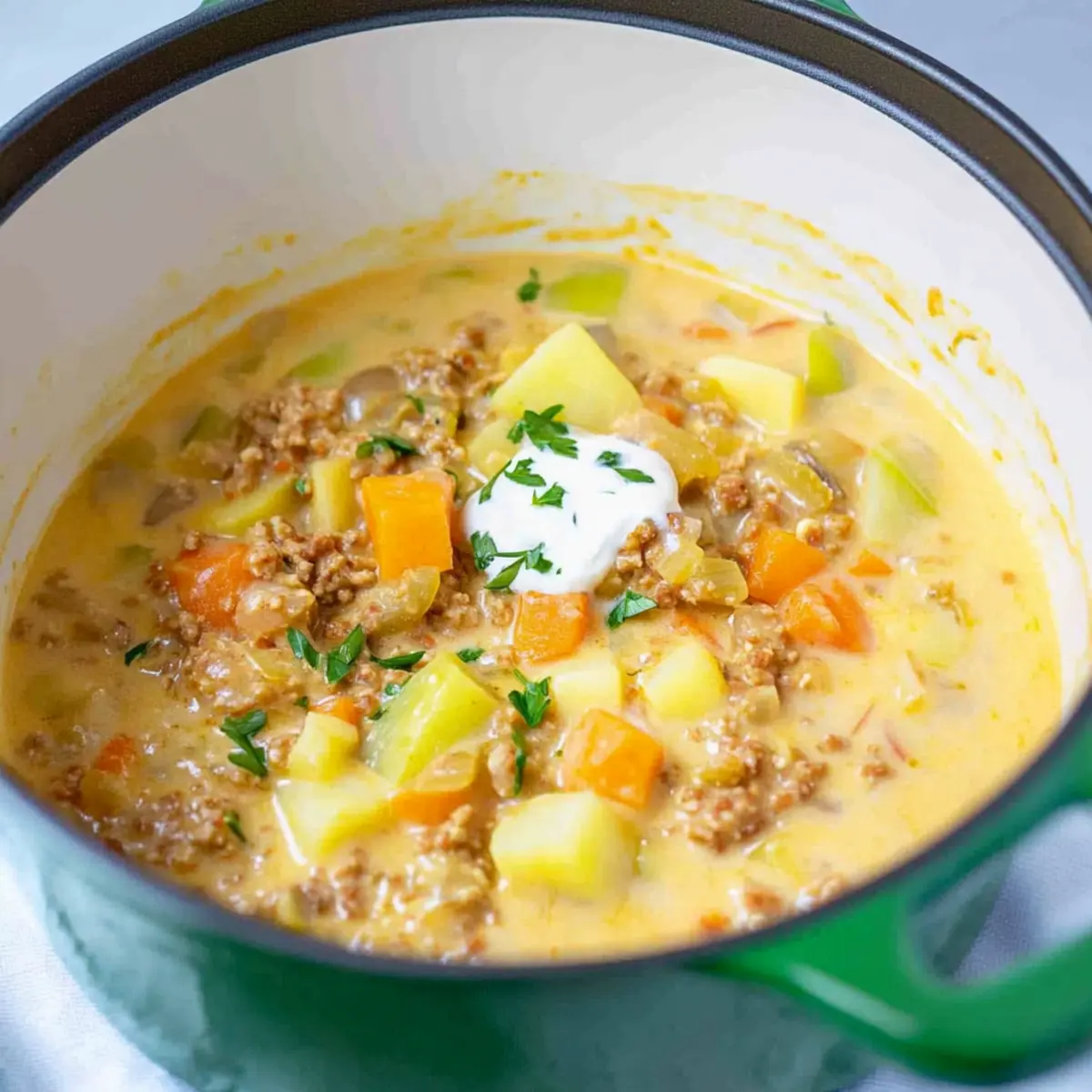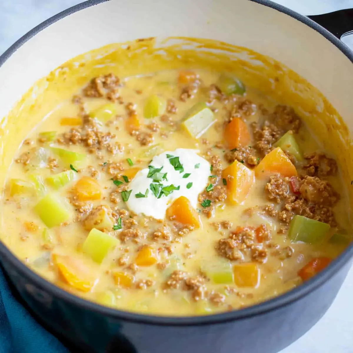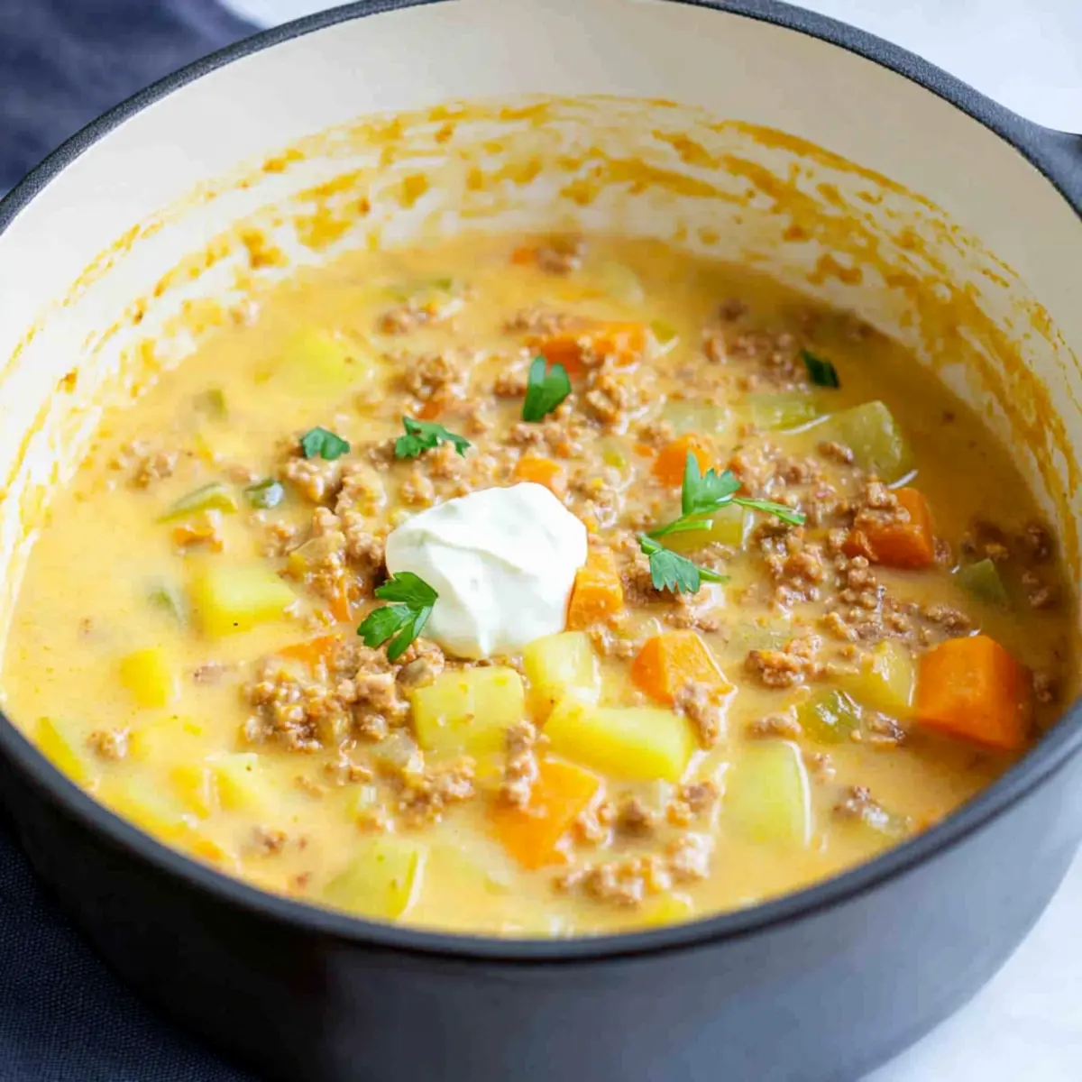 As I stirred the pot, the rich aroma of sizzling vegetables brought me back to my cozy childhood kitchen, where comfort food reigned supreme. This vegan Cheeseburger Soup transforms the beloved flavors of a classic cheeseburger into a warm, creamy delight that can be whipped up in under 30 minutes. Not only is it a one-pot meal that makes cleanup a breeze, but it’s also a dish that even the pickiest eaters will adore. Imagine serving up a steaming bowl filled with hearty potatoes, savory vegan beef, and melty dairy-free cheese, all in a luscious broth that invites you to savor each spoonful. Ready to learn how to create this cozy masterpiece that’s sure to become a family favorite? Let’s dive in! Why is Cheeseburger Soup a must-try? Comforting Warmth: This Creamy Cheeseburger Soup wraps you in a cozy embrace, perfect for chilly nights. Quick Preparation: Ready in under 30 minutes, it’s ideal for busy weeknights. Crowd-Pleasing Flavor: Flavorful and satisfying, this dish appeals to everyone, even the pickiest of eaters. One-Pot Wonder: Minimal cleanup means more time enjoying the dish—perfect for busy cooks. Customizable Goodness: Feel free to mix in your favorite veggies or adjust the spice level for a tailored taste! For more comforting soup options, check out our delicious Ravioli Soup Cozy and Hearty Longevity Soup. Cheeseburger Soup Ingredients • Ready to recreate this comforting bowl of joy? Here’s what you need! For the Soup Base Potatoes – Adds heartiness and texture; Yukon Gold or Russet work best for creaminess. Dairy-free Butter – Provides a rich base flavor; olive oil is an excellent substitute if needed. Vegan Ground Beef – Mimics traditional beef flavors; try lentils or mushrooms for a different twist. Celery – Contributes crunch and flavor; bell peppers can be used as a substitute. Carrot – Brings sweetness and vibrant color; use parsnips for a unique taste. Vegetable Broth – Forms the liquid backbone of the soup; opt for homemade or low-sodium versions for the best taste. Onion (diced) – Enhances the flavor profile; shallots are a great alternative for a milder touch. Garlic (pressed) – Elevates the soup’s taste significantly; fresh garlic always yields the best results. For the Creamy Blend Vegan Cheese – Gives the soup a creamy, cheesy texture; try brands like Violife or Daiya for the best melt. Vegan Sour Cream – Adds a luscious creaminess and tang; blend cashews with lemon juice as a fantastic alternative. For Finishing Touches Dried Parsley – Perfect for garnish and adds a hint of herbal notes; fresh parsley can also shine here. Hot Sauce – Adds a bit of heat; adjust according to your spice preference to make this Cheeseburger Soup truly yours! Salt and Pepper – Essential seasonings to bring all the flavors together; always season to taste. Now that you have all the ingredients ready, let’s get cooking and create some warmth in your kitchen! Step‑by‑Step Instructions for Cheeseburger Soup Step 1: Prepare the Base In a large casserole pot, melt 2 tablespoons of dairy-free butter over medium heat. Once bubbling, add 1 cup of vegan ground beef, cooking for 2 minutes until slightly browned. Remove the beef from the pot while preserving the melted butter; this will enhance the soup’s flavor as we build our creamy Cheeseburger Soup. Step 2: Sauté the Vegetables Add 1 diced onion, 2 pressed garlic cloves, 1 chopped celery stalk, and 1 diced carrot to the pot. Sauté for about 3 minutes or until the vegetables become tender and fragrant, stirring occasionally. The colorful medley will create a delightful aroma that sets the stage for your delicious cheeseburger soup. Step 3: Add Potatoes and Broth Next, incorporate 2 diced potatoes into the mix, followed by 4 cups of vegetable broth. Bring to a gentle simmer over medium-high heat and cook for 10 minutes, allowing the potatoes to soften. They should be tender enough to pierce with a fork, contributing to the soup’s hearty texture. Step 4: Creamy Enrichment Stir in ½ cup of vegan sour cream, mixing until fully blended with the broth. This will create a luxuriously creamy consistency. Allow the soup to simmer for another 2 minutes so the flavors can meld together beautifully, creating the heartwarming essence of cheeseburger soup. Step 5: Melt in the Cheese Gradually add 1 cup of vegan cheese to the pot, stirring constantly until it melts completely into the soup. Return the cooked vegan ground beef to the pot and mix well. This step is crucial to achieve that classic cheeseburger flavor, making your Cheeseburger Soup irresistibly creamy. Step 6: Final Seasoning Season your soup with salt and pepper to taste, and mix in a sprinkle of dried parsley and a few dashes of hot sauce. Heat the soup for an additional 2 minutes, allowing the seasonings to penetrate every bite. The vibrant blend will finish off your delicious meal warmly. Step 7: Serve and Enjoy Ladle the Cheeseburger Soup into bowls, garnishing with fresh parsley if desired. Serve it alongside crusty bread or a fresh side salad for a complete meal. Relish every creamy spoonful of this comforting dish, sure to please everyone at your table! Make Ahead Options These Cheeseburger Soup preparations are perfect for busy home cooks looking to save time during the week! You can chop all your vegetables—like potatoes, carrots, celery, and onions—up to 24 hours in advance and store them in an airtight container in the fridge. The vegan ground beef can be cooked and refrigerated for up to 3 days, which helps enhance the flavors. When you’re ready to serve, simply reheat the soup base, add the sautéed vegetables, and stir in the previously cooked ground beef along with the vegan cheese and sour cream. This way, you’ll enjoy a warm, comforting bowl of soup that’s just as delicious and satisfying but requires minimal effort! What to Serve with Vegan Cheeseburger Soup The warm aroma of creamy soup wafts through your kitc