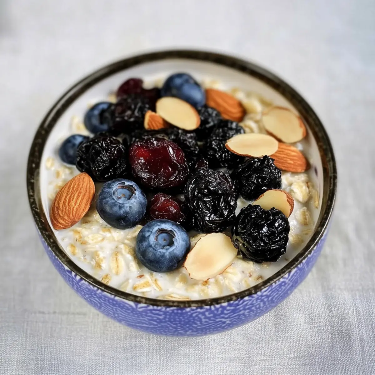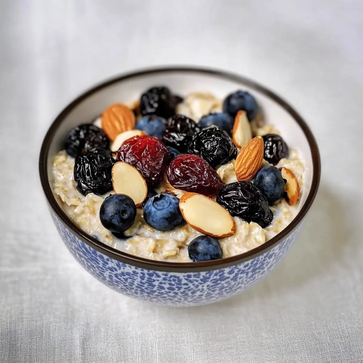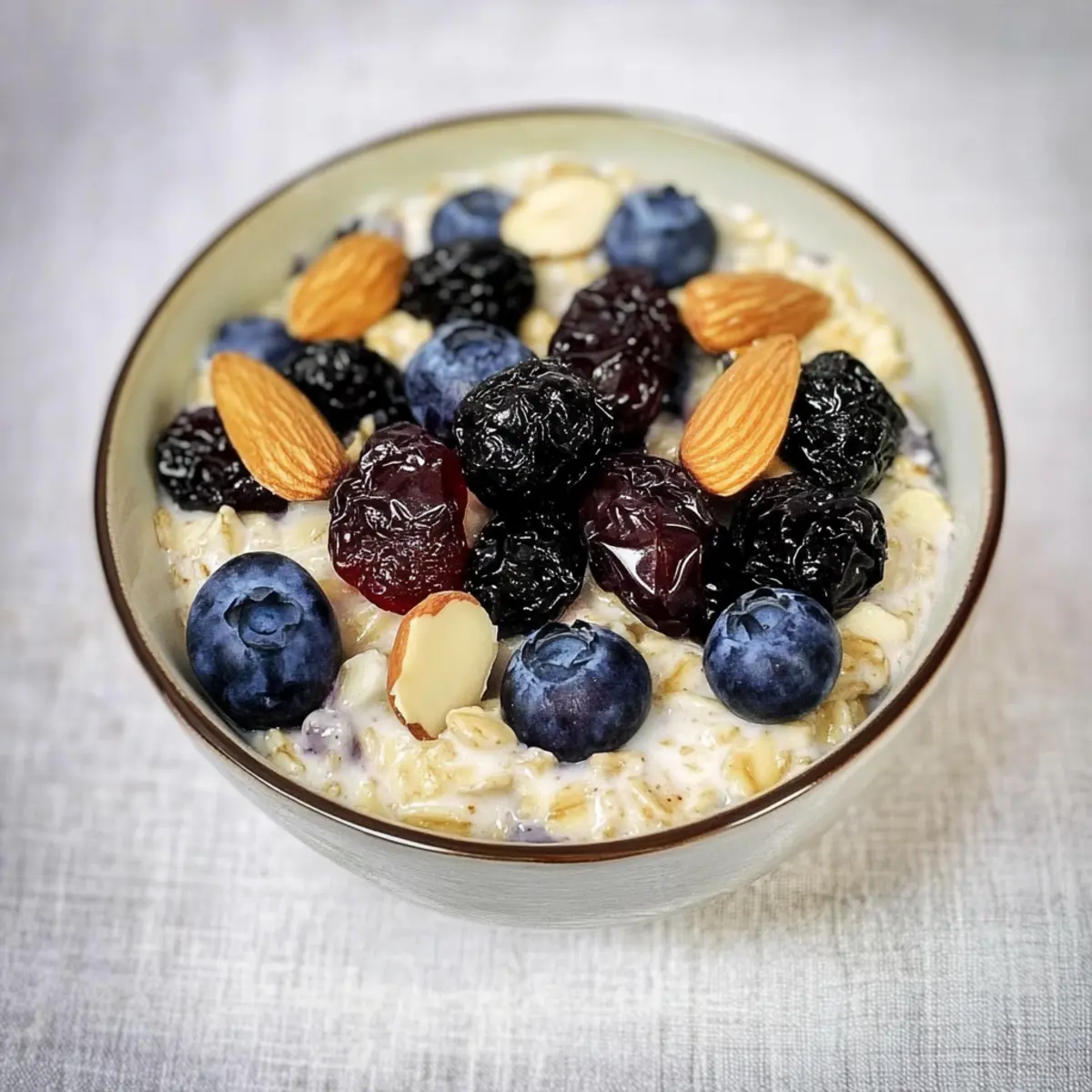 The next morning, give your oats a good stir. They should be thick and creamy, with the dried cherries plump and bursting with flavor. If you reserved fresh blueberries, scatter them on top along with any leftover almonds for additional crunch. You can enjoy the oats cold straight from the fridge, or heat them gently in the microwave if you prefer a warm breakfast.