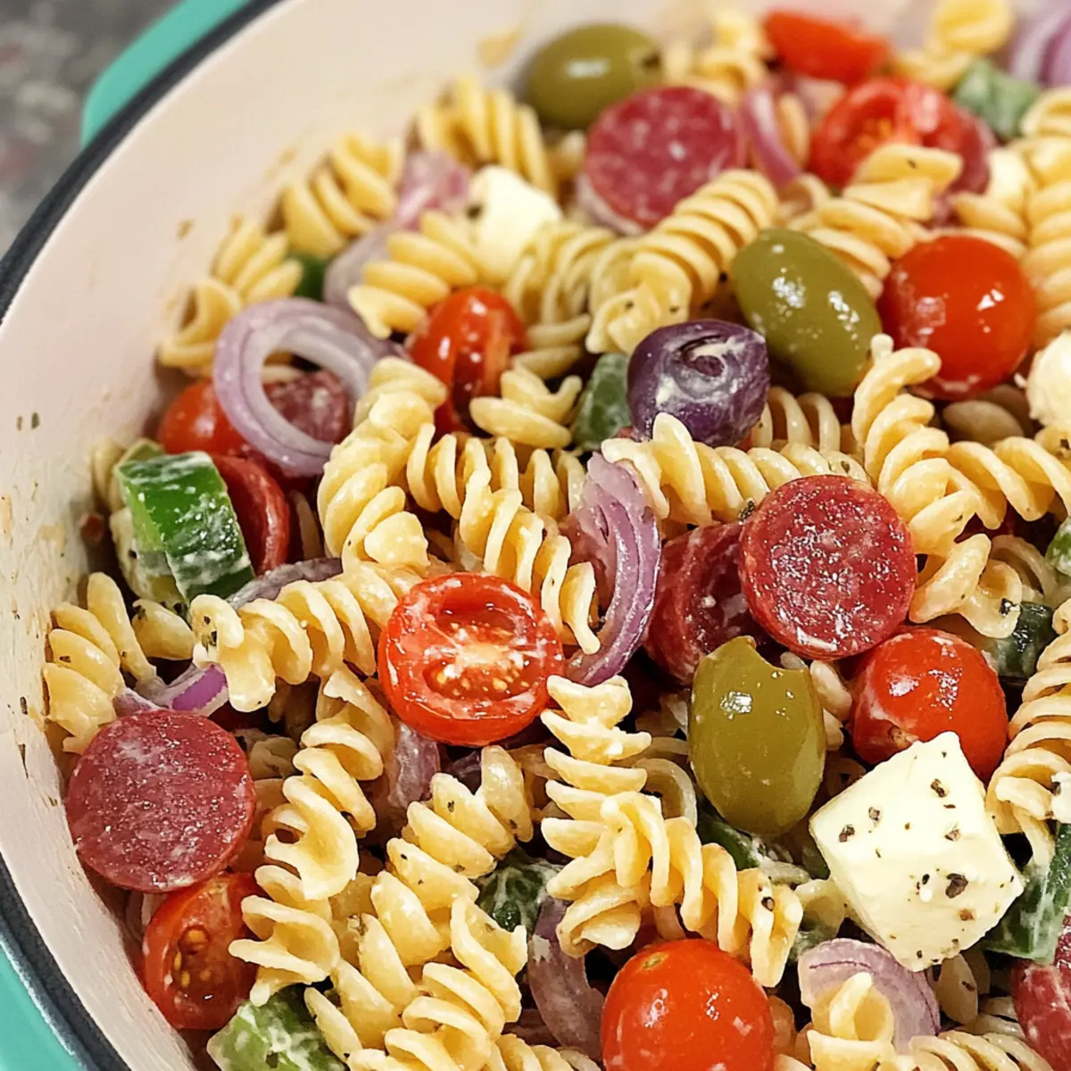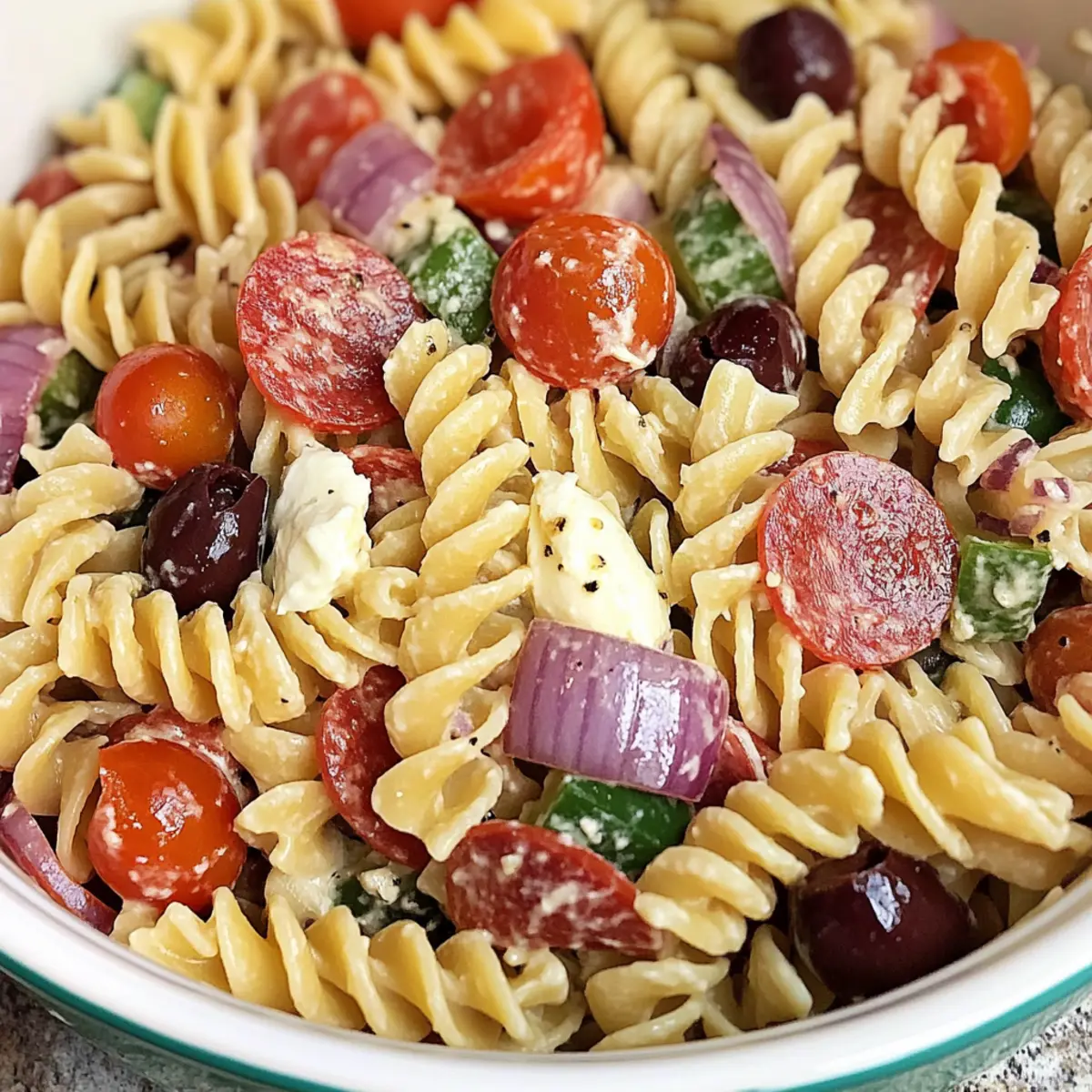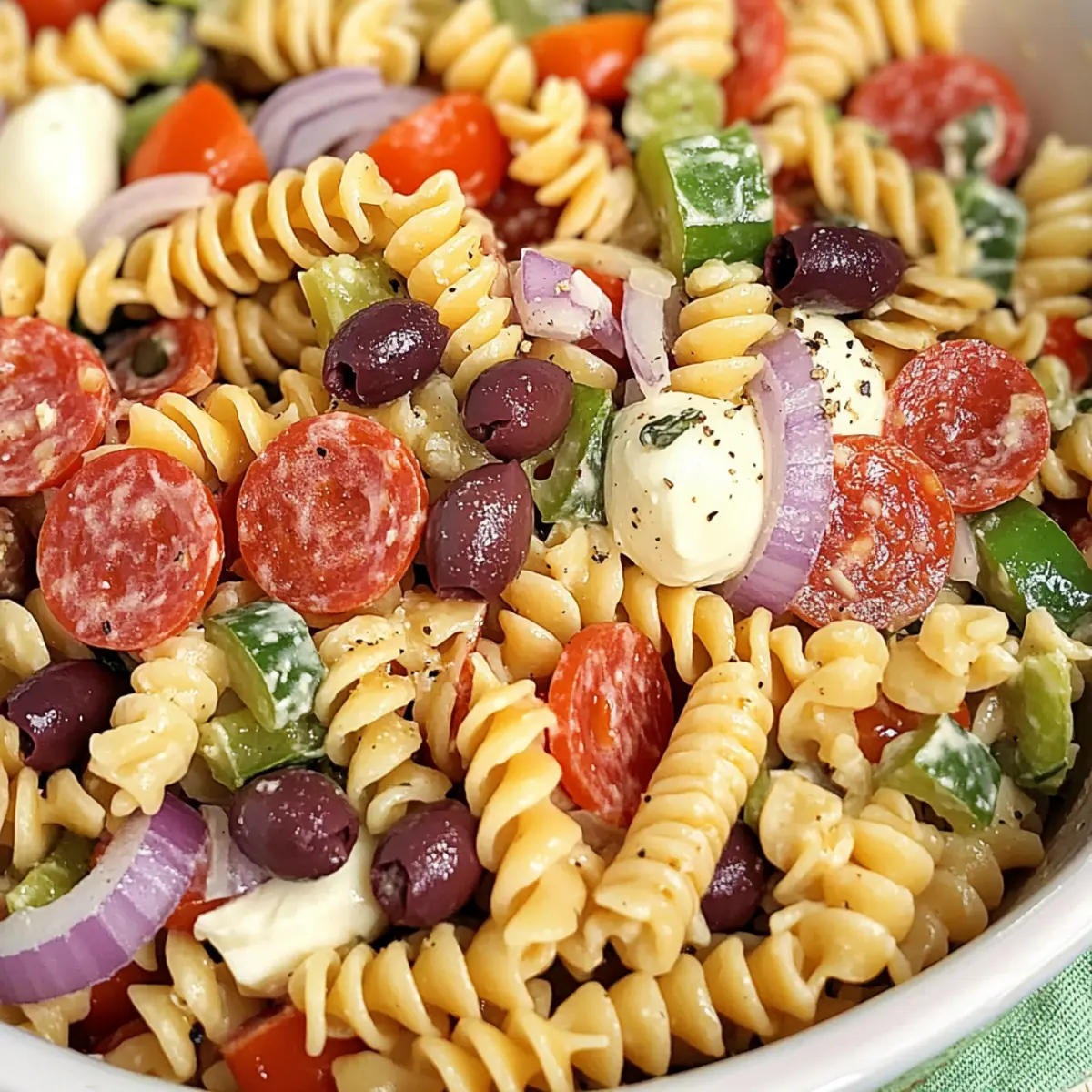 The kitchen is my playground, and nothing brings people together quite like a refreshed Classic Pasta Salad. This vibrant dish stands out with its rotating mix of tri-color rotini, fresh veggies, and creamy cheeses, perfectly dressed in a zesty homemade vinaigrette. What’s even better? It’s a crowd-pleaser that can be made ahead of time, offering that elusive blend of convenience and taste. You have the freedom to customize it, swapping in different pasta shapes or proteins to suit your mood or pantry. So, whether you’re hosting a summer barbecue or just need a quick weeknight meal, this recipe promises to impress without the fuss. Curious about how to whip it up? Let’s dive in! Why Is Classic Pasta Salad So Popular? Crowd-Pleasing Delight: This Classic Pasta Salad is a favorite at gatherings, thanks to its bright colors and fresh flavors that appeal to everyone. Customizable Options: With multiple substitutions available, it’s easy to mix things up. Try different pasta shapes or swap meats like salami for a unique twist! Great Make-Ahead Dish: Prepare it in advance for parties or busy weeknights, as it tastes even better after sitting in the fridge for a while. Perfect Pairing: This salad makes an excellent side for barbecues or potlucks, effortlessly complementing grilled meats or enjoying as a standalone vegetarian meal. Balanced Nutrition: At approximately 283 calories per serving, it’s not only satisfying but also offers a nice balance of carbohydrates, proteins, and fats. Ready to elevate your cooking game? Dive into my recipe for this refreshing Classic Pasta Salad! You can also check out my Mediterranean Chickpea Salad for another vibrant option. Classic Pasta Salad Ingredients • Here’s what you need to create a delightful Classic Pasta Salad bursting with flavors! For the Salad • Tri-color Rotini Pasta – This colorful pasta forms the perfect base; any medium-sized pasta can work as a fun substitute. • Cherry Tomatoes – They add fresh sweetness; diced bell peppers or cucumbers can add a nice crunch. • Sliced Pepperoni – A savory touch; opt for salami instead, or leave it out for a vegetarian twist. • Red Onion – Provides a pungent bite; consider using green onions or shallots for a milder flavor. • Green Bell Pepper – Offers crunch and vibrant color; colored bell peppers make for a lovely alternative. • Mozzarella Cheese – Adds creaminess; cheese pearls or cubed provolone can also be delicious. • Grated Parmesan Cheese – Elevates the savory profile; Pecorino Romano lends a sharper taste. • Sliced Olives – A briny kick; capers or pickles are great swaps for a tangy twist. For the Vinaigrette • Olive Oil – The heart of the dressing, adding richness; vegetable oil works as a substitute in a pinch. • Red Wine Vinegar – Balances the flavors; feel free to swap in white wine or apple cider vinegar for a different profile. • Italian Seasoning – A blend of herbs that brings flavor; fresh herbs like basil or oregano could brighten things up. • Garlic Powder – Infuses warm garlicky notes; using fresh minced garlic is a tasty alternative. • Salt and Pepper – Essential for seasoning; adjust to your taste, considering dietary needs. • Red Pepper Flakes – Adds a spicy kick; omit them for a gentler flavor, or use black pepper if preferred. Dive into these ingredients and prepare to enjoy a Classic Pasta Salad that’s both delicious and customizable! Step‑by‑Step Instructions for Classic Pasta Salad Step 1: Cook the Pasta Begin by bringing a large pot of salted water to a rolling boil. Add in the tri-color rotini pasta and cook according to package instructions, typically around 8-10 minutes, until it reaches an al dente texture. Once cooked, drain the pasta and rinse it under cold water until completely cool to stop the cooking process and firm up the pasta. Step 2: Prepare the Vegetables and Meats While the pasta cools, take a large mixing bowl and add the cherry tomatoes, sliced pepperoni, finely chopped red onion, and diced green bell pepper. These fresh ingredients form the colorful base of your Classic Pasta Salad. Give everything a gentle stir to mix the flavors, ensuring they’re evenly distributed before adding the cooled pasta. Step 3: Cheese and Olives Addition Next, incorporate the creamy mozzarella cheese and sliced olives into the bowl with the mixed vegetables and meats. This combination adds richness and a briny bite to the salad. Carefully fold in the ingredients, maintaining the pasta’s integrity while ensuring the components are spread throughout the mixture for even flavor. Step 4: Whisk the Vinaigrette In a separate bowl, whisk together olive oil, red wine vinegar, Italian seasoning, garlic powder, and a pinch of salt and pepper. Aim for a smooth and well-emulsified vinaigrette, which will beautifully coat the pasta salad. Taste the dressing and adjust the seasonings or acidity, if needed, to achieve your desired flavor profile. Step 5: Combine and Toss Pour the prepared vinaigrette over the pasta salad mixture and gently toss with a spatula or large spoon until everything is well coated. This step is crucial for the flavors of your Classic Pasta Salad to meld. Ensure that every piece of pasta and vegetable is covered in the dressing, giving it a vibrant and inviting appearance. Step 6: Chill for Flavor Enhancement Cover the bowl with plastic wrap or a lid and refrigerate the salad for at least 1 hour before serving. This refrigeration will allow the flavors to deepen and develop, making each bite even more delightful. If you plan to serve the pasta salad cold, let it rest at room temperature for 20-30 minutes beforehand for optimal flavor. Step 7: Serve the Salad When ready to serve your Classic Pasta Salad, give it a gentle stir to redistribute the dressing. Present it in a beautiful serving bowl, showcasing the vibrant colors and textures. The combination of al dente pasta, fresh veggies, and z