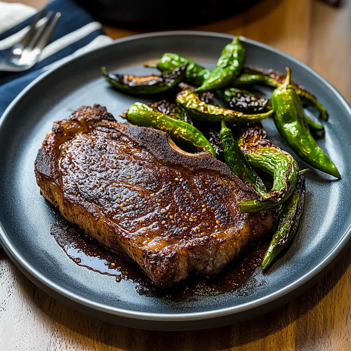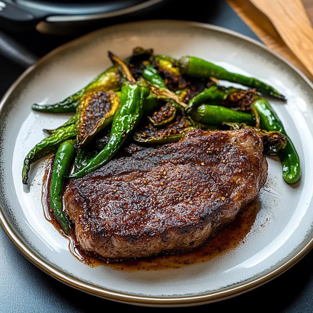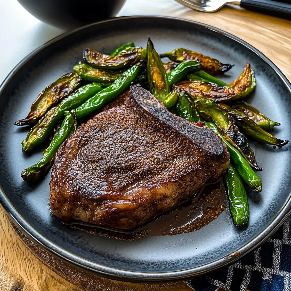A delightful Cocoa Crusted Steak with Shishito Peppers that offers a unique flavor fusion and a quick cooking method, perfect for any weeknight dinner.