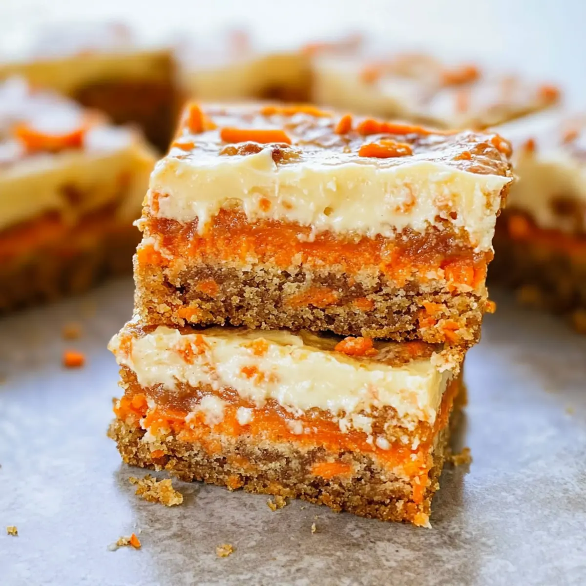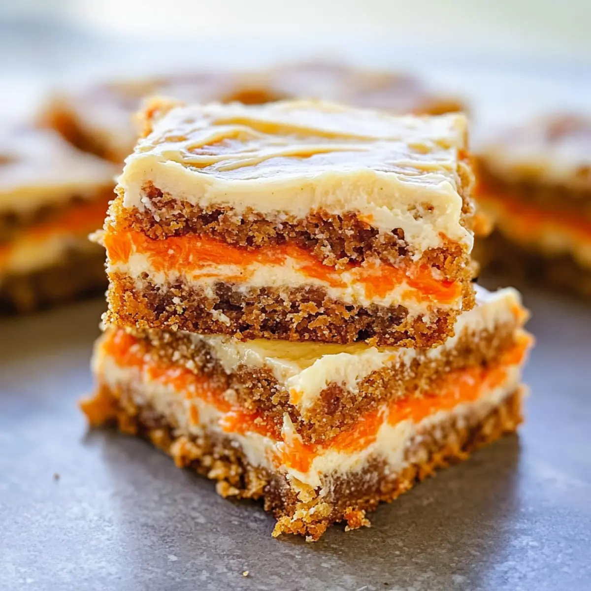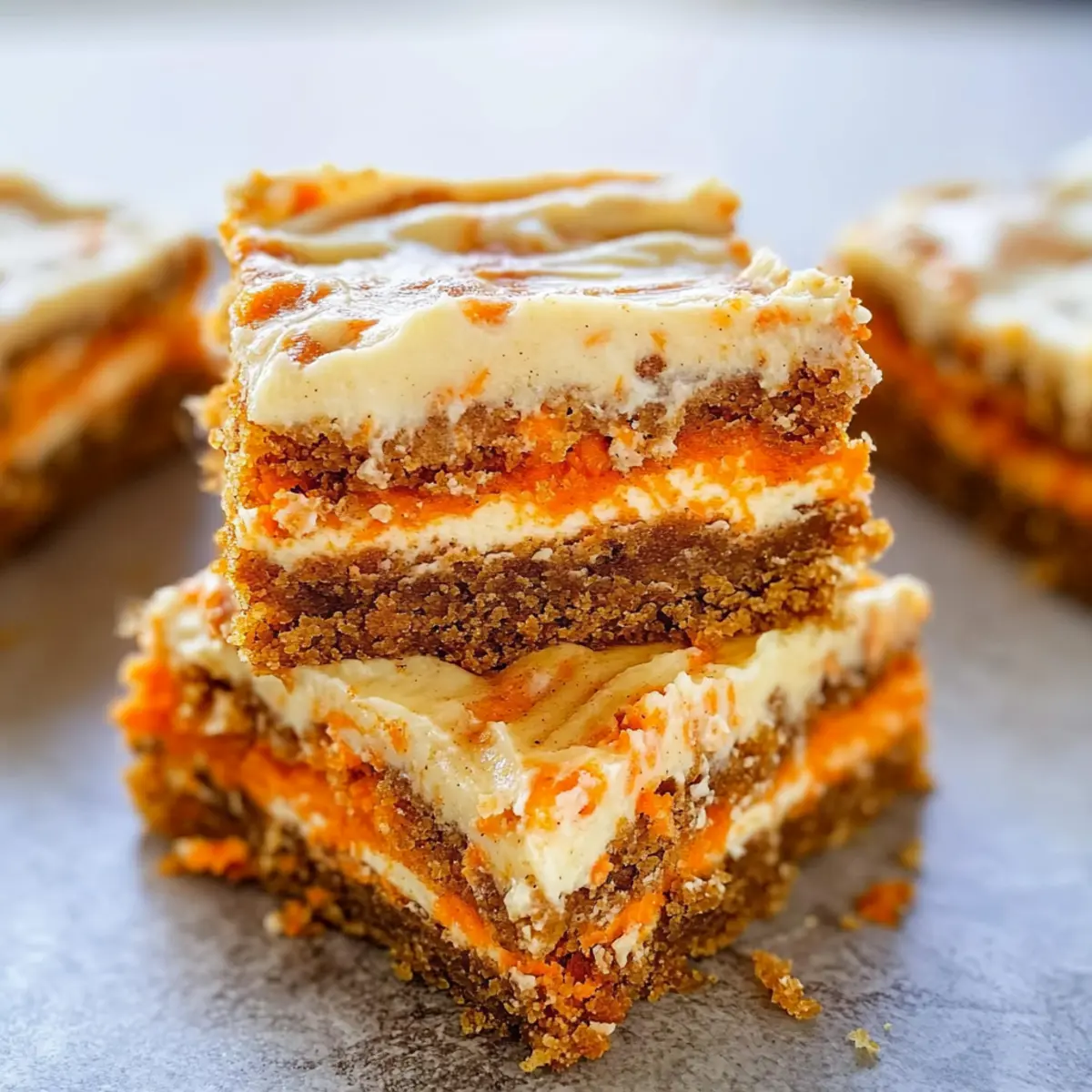 As I sifted through my spice cabinet, the warm aroma of cinnamon and ginger was like a nostalgic embrace, whisking me back to countless family gatherings. It’s that time of year when I crave something truly special, and these Easy Cream Cheese Carrot Cake Bars fit the bill perfectly. This recipe marries the rich, comforting flavors of classic carrot cake with a creamy cream cheese layer, creating a dessert that’s not only easy to make but also festive enough for any occasion—especially Easter! Plus, the bars are a crowd-pleaser, perfect for sharing with loved ones, and save you the hassle of frosting, making them a joy to serve. Curiosity piqued? Let’s dive into this sweet adventure together! Why Are These Carrot Cake Bars Unique? Easy to Make: From start to finish, you can whip these up with minimal fuss, perfect for busy bakers. Rich, Moist Texture: Each bite delivers the classic moistness of carrot cake, enhanced by a luscious cream cheese layer. Festive Appeal: Ideal for celebrations, these bars bring a touch of spring, making them great for Easter and gatherings alike. Crowd Favorite: Their chewy goodness keeps everyone coming back for more—just like with my Stuffed Cheesecake Pancakes or Turtle Cheesecake Dessert! Customizable Options: Add your favorite mix-ins, like nuts or coconut, for added flavor and texture—this recipe encourages creativity! Make-Ahead Convenience: Prepare them in advance, making your celebrations simpler without sacrificing taste. Cream Cheese Carrot Cake Bars Ingredients For the Batter Unsalted Butter – Adds rich flavor and moisture; melted for easy mixing. Large Egg – Binds ingredients together and adds richness. Light Brown Sugar – Provides sweetness and moisture; packed for density. Cinnamon – Adds warm spice; adjust amount to preference. Ground Ginger – Adds a warm, zesty flavor profile. Allspice – Complements the cinnamon and ginger with its unique flavor. Ground Cloves – Adds depth and warmth; use sparingly for balance. Vanilla Extract – Enhances overall flavor; pure extract is preferred. All-Purpose Flour – Gives structure to the bars. Kosher Salt – Enhances flavors and balances sweetness; adjust to taste. Grated Carrots – The primary flavoring and moisture source; fresh is best. For the Cream Cheese Layer Cream Cheese – Creates a luscious creamy layer baked in; full-fat recommended. Egg Yolk – Adds richness and helps with the cream cheese filling. Granulated Sugar – Sweetens the cream cheese layer; adjust based on taste. Enjoy whipping up these Cream Cheese Carrot Cake Bars that promise delightful flavors and a comforting texture! Step‑by‑Step Instructions for Cream Cheese Carrot Cake Bars Step 1: Preheat and Prepare the Baking Pan Begin by preheating your oven to 350°F (175°C). While the oven warms, line an 8×8-inch baking pan with foil, leaving some overhang for easy removal. Once lined, lightly spray the foil with cooking spray to ensure your Cream Cheese Carrot Cake Bars release effortlessly after baking. Step 2: Melt the Butter and Mix Wet Ingredients In a microwave-safe bowl, melt the unsalted butter. Allow it to cool slightly before adding one large egg, along with light brown sugar. Whisk these together until smooth and well-combined, creating a rich base for your carrot cake bars. Ensuring that the butter isn’t too hot prevents the egg from cooking. Step 3: Add Spices and Vanilla Next, whisk in the warm spices: cinnamon, ground ginger, allspice, and ground cloves. The warm aroma will envelop your kitchen. Then, pour in the vanilla extract, mixing until everything is thoroughly combined. This fragrant step enhances the flavor profile of the Cream Cheese Carrot Cake Bars, making each bite memorable. Step 4: Incorporate the Dry Ingredients Carefully stir in the all-purpose flour and kosher salt. Mix until just combined, taking care not to overmix the batter, as this could affect the texture. Once the flour is no longer visible, gently fold in the grated carrots; the bright orange bits will add moisture and a delightful crunch to your cake bars. Step 5: Spread the Batter in the Pan Pour the carrot cake batter into the prepared baking pan. Use a spatula to smooth the top, ensuring it’s evenly distributed. This step is crucial for even baking, allowing each bite of the Cream Cheese Carrot Cake Bars to cook consistently and beautifully. Step 6: Prepare the Cream Cheese Layer In a separate bowl, beat the cream cheese with the egg yolk and granulated sugar until fluffy and smooth. The mixture should be light and creamy, ready to provide a luscious layer that complements the dense carrot cake. This frosting-like layer is what makes these bars so irresistible. Step 7: Dollop and Swirl the Cream Cheese Mixture Dollop the cream cheese mixture over the carrot batter sporadically, creating generous spoonfuls across the surface. Use a toothpick or a knife to lightly swirl the cream cheese into the batter. This technique ensures a marbled appearance that enhances the presentation of your Cream Cheese Carrot Cake Bars. Step 8: Bake to Perfection Place the pan in the preheated oven and bake for 25-30 minutes. Keep an eye on them; the bars are done when a toothpick inserted into the center comes out clean or with a few moist crumbs. The edges should be lightly golden, signaling that your delightful bars are ready to cool. Step 9: Cool Before Slicing Once baked, remove the pan from the oven and let it cool at room temperature for at least 2 hours. This cooling period is essential for the Cream Cheese Carrot Cake Bars to set properly, making slicing easier and ensuring the flavors meld beautifully. Expert Tips for Cream Cheese Carrot Cake Bars Cool Butter First: Allow melted butter to cool slightly before mixing to prevent cooking the egg, which affects texture. Use Fresh Carrots: Grate your own fresh carrots for optimal moisture and flavor; pre-shredded versions can alter the texture of your bars. Don’t Overmi