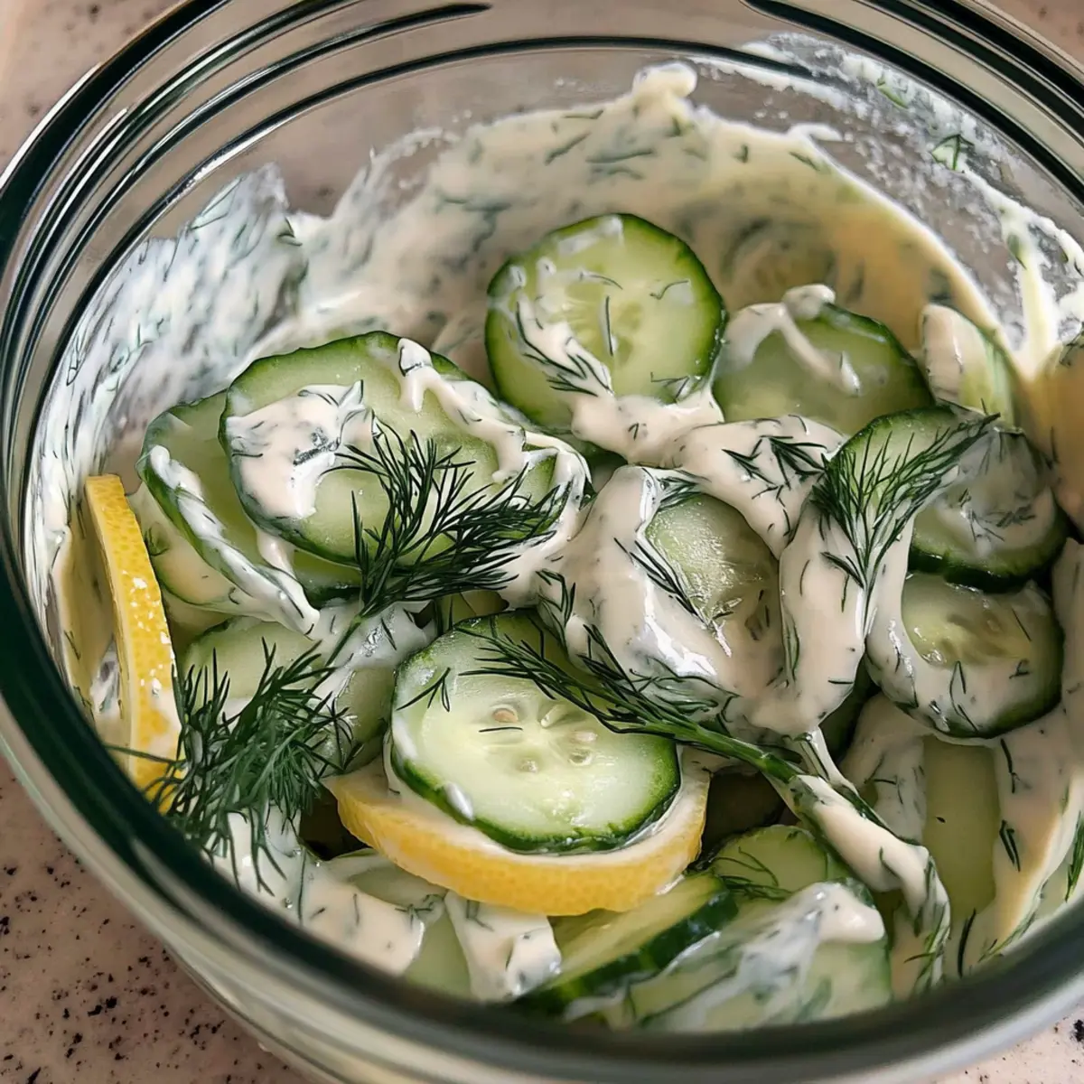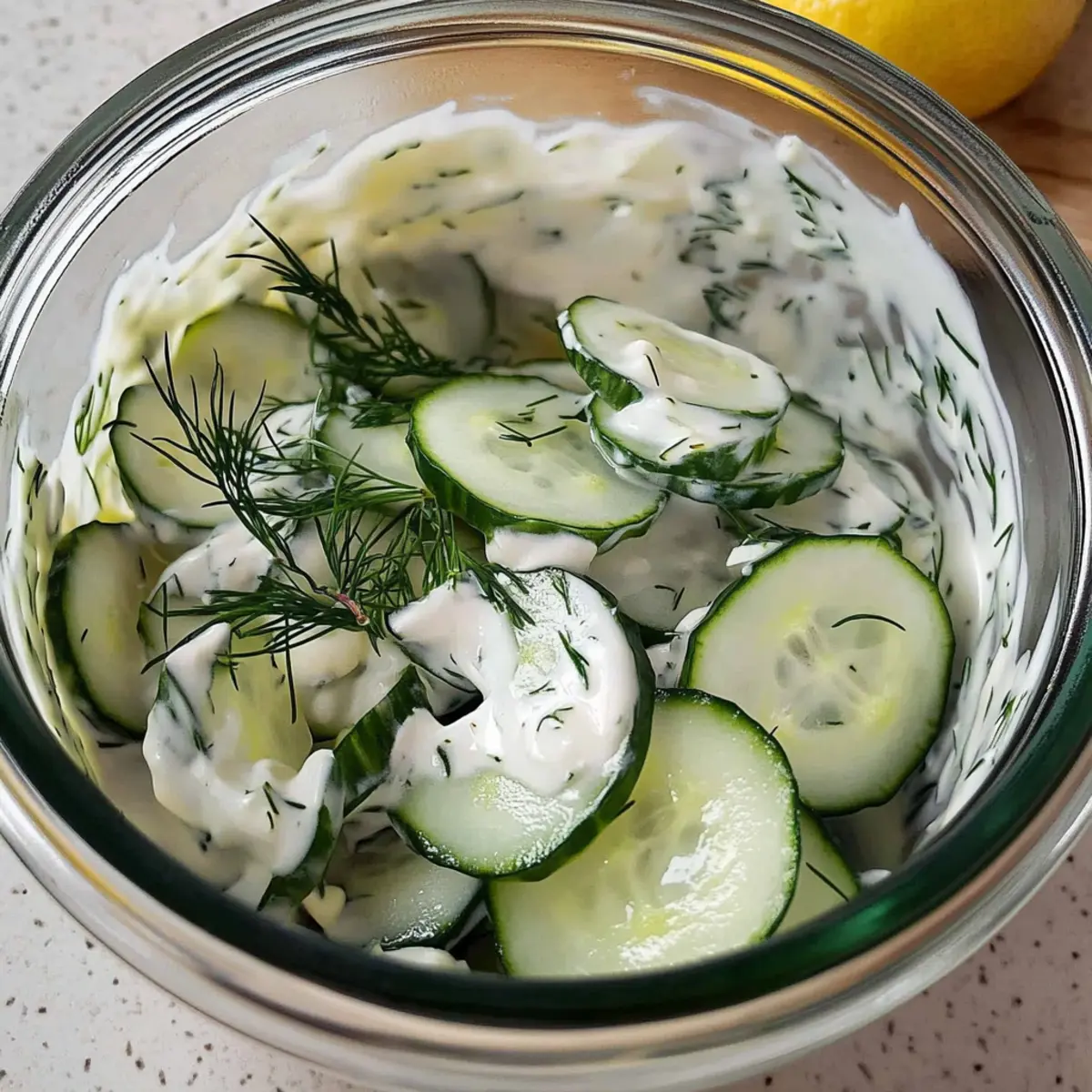 As I stood in my kitchen, my mind drifted to the garden-fresh cucumbers resting on my counter, just waiting to shine. This is when I knew it was time to whip up a Creamy Vegan Cucumber Salad. It’s not just any salad; it’s an easy, rejuvenating dish that brightens up any meal with minimal effort. The creamy dressing wraps around crisp cucumber slices, making it irresistible. With its plant-based goodness, this salad is a fantastic choice for anyone looking to enjoy a quick, guilt-free, and satisfying meal! Whether you’re pairing it with your favorite grilled veggies or enjoying it solo, it’s a delicious way to embrace summer vibes all year round. Curious about how to bring this refreshing dish to life? Let’s dive into the recipe! Why is This Cucumber Salad a Must-Try? Quick & Easy: This recipe requires minimal prep time, making it perfect for busy weeknights. You can whip it up in just a few minutes! Vegan Delight: With plant-based ingredients like Greek yogurt and vegan mayo, this salad caters to both vegans and those seeking healthier options. Versatile Flavor: The creamy dressing complements a variety of dishes, whether served alongside grilled vegetables or as a refreshing stand-alone meal. It pairs beautifully with options like Cheesecake Fruit Salad for a balanced meal! Hydrating & Nutritious: Low in calories and high in hydration, this salad is a guilt-free addition to any meal, making it ideal for summer dining. Crowd-Pleasing: Perfect for gatherings, it’s a dish that family and friends will love, ensuring you won’t have leftovers! Enjoy the fresh taste of summer with every bite! Creamy Cucumber Salad Ingredients • Get ready to make the magic happen with these simple ingredients! For the Salad Cucumber – This crunchy delight is the star of the show; choose firm ones for the best texture. Shallots – Their mild sweetness adds depth to the salad; green onions can be a great substitute for a milder kick. Garlic – Fresh garlic enhances the flavor profile; if you’re in a pinch, garlic powder works too! For the Creamy Dressing Greek Yogurt – Offers a creamy base with delightful tang; you can easily swap this for vegan yogurt like coconut or almond for a completely plant-based option. Mayonnaise – Adds richness to the dressing; vegan mayo ensures it’s 100% plant-based. Fresh Dill – This herb adds fragrant notes that brighten up every bite; feel free to use parsley or cilantro if that’s what you have on hand. Lemon Juice – It provides the acidity and brightness needed for balance; lime juice is a fabulous alternative if that’s what you prefer. Salt – A pinch enhances the overall flavor; adjust according to your taste. Sugar – It balances out flavors beautifully; you can omit it or use maple syrup or agave for a twist! Now that you’re equipped with these ingredients, you’re one step closer to creating a deliciously creamy cucumber salad that will refresh every bite! Step‑by‑Step Instructions for Creamy Cucumber Salad Step 1: Slice the Cucumbers Begin by thoroughly washing the cucumbers, then using a mandolin or sharp knife, thinly slice them into circular rounds, aiming for about 1/8 inch thick. These slices should be uniform to ensure even coating with the dressing. Place the sliced cucumbers in a large lidded jar or mixing bowl for easy tossing later. Step 2: Prepare Shallots and Garlic Next, take your shallots and slice them thinly to release their mild sweetness, adding them directly to the bowl with the cucumbers. Then, mince the fresh garlic, ensuring it’s finely chopped, so it disperses well in the dressing. Mix the shallots and garlic gently with the cucumbers to combine their flavors. Step 3: Create the Creamy Dressing In the same bowl or jar, add the Greek yogurt and vegan mayonnaise, blending their creamy textures together. Then incorporate the chopped fresh dill, tangy lemon juice, salt, and sugar, balancing the dressing’s flavors. As you stir, visualize how the creamy dressing will envelop the cucumbers, enhancing their crunch. Step 4: Coat the Salad Secure the lid on the jar or cover the mixing bowl tightly, and shake vigorously to ensure the cucumber slices are fully coated with the creamy dressing. If using a bowl, gently toss the mixture with a spatula until all the ingredients are well combined. This step should take about 30 seconds, and you’ll see the cucumbers glisten with the creamy goodness. Step 5: Chill and Serve For the best flavor, let the creamy cucumber salad rest covered in the refrigerator for about 10 to 15 minutes before serving. This allows the flavors to meld beautifully. When ready to enjoy, give it a gentle stir and present it chilled, savoring the refreshing taste of your Creamy Cucumber Salad! Make Ahead Options These Creamy Cucumber Salad preparations are perfect for busy cooks looking to save time! You can slice the cucumbers and mix in the shallots and garlic up to 24 hours in advance, storing them in an airtight container in the refrigerator to keep them crisp. Additionally, you can prepare the creamy dressing (Greek yogurt, vegan mayo, dill, lemon juice, salt, and sugar) up to 3 days ahead; simply refrigerate it in a sealed jar. When you’re ready to enjoy your salad, combine the prepped cucumbers with the dressing, shaking or tossing gently to coat everything evenly. This allows for a quick assembly while ensuring your salad remains just as delicious and refreshing! What to Serve with Creamy Vegan Cucumber Salad Looking to create a delightful meal around this refreshing dish? Let’s explore some perfect pairings that will elevate your dining experience. Grilled Veggies: The smoky, charred flavors of grilled vegetables add depth and warmth, beautifully contrasting the cooling crispness of the salad. Vegan Burgers: A hearty plant-based burger complements the light nature of the salad, creating a satisfying and balanced meal for everyone. Pasta Salad: Pair it with a colorful pasta salad for a