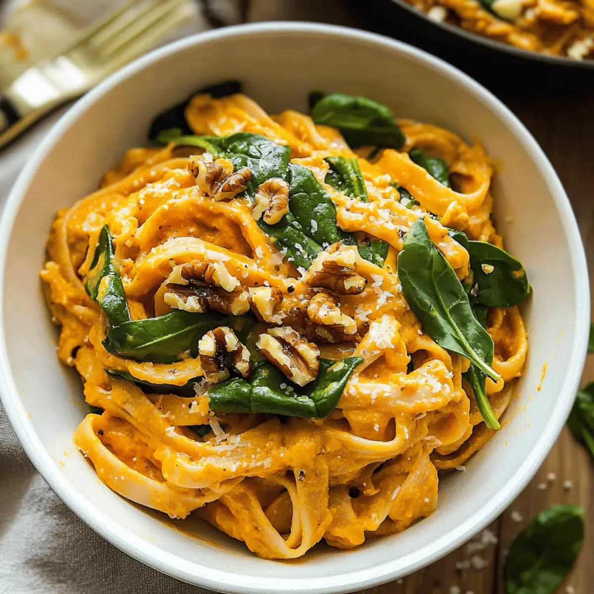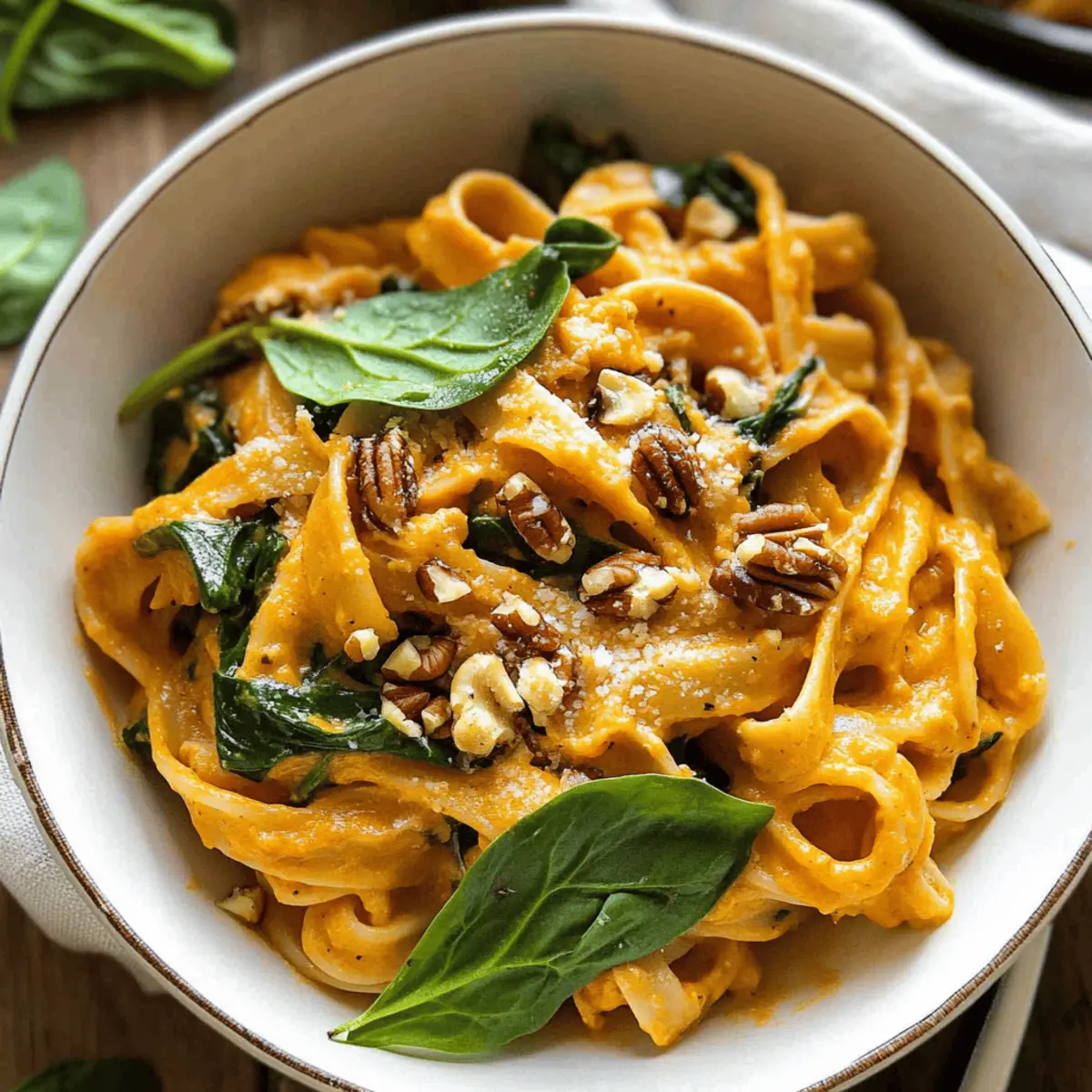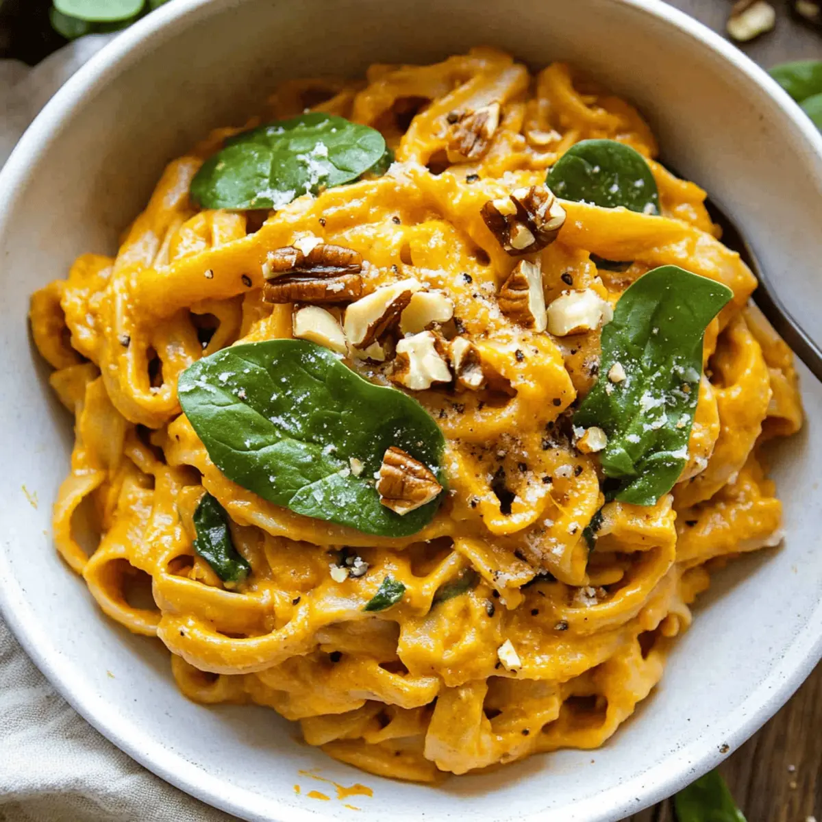 As the crisp air of autumn settles in, I find myself craving the rich, warm flavors that define this season. One dish that captures this essence beautifully is my Creamy Pumpkin Pasta Recipe. This delightful vegetarian meal not only comes together in just 30 minutes, making it perfect for busy weeknights, but it also serves as a genuine comfort food that nourishes both body and soul. The combination of creamy pumpkin purée, fragrant fresh sage, and a touch of garlic creates a sauce that envelops your pasta in a velvety embrace. Plus, it’s packed with wholesome ingredients that keep you feeling good without sacrificing flavor. Are you ready to bring the taste of fall to your dinner table? Let’s dive in! Why is this Creamy Pumpkin Pasta Recipe so special? Simplicity at its Core: You’ll love how easy it is to whip up this flavorful dish in just 30 minutes, perfect for busy weeknights. Velvety Comfort: The creamy pumpkin sauce melds beautifully with fresh sage and garlic, creating a warm, comforting hug for your taste buds. Nutritional Powerhouse: Packed with wholesome ingredients like spinach and walnuts, this recipe is both nutritious and satisfying. Versatile and Adaptable: Feel free to swap in gluten-free pasta or add roasted red peppers for extra flavor! Crowd-Pleasing Appeal: This dish is bound to impress family and friends, making it a go-to for gatherings. Serve it alongside a crisp green salad or try it with a hearty Garlic Parmesan Pasta for a delightful meal! Creamy Pumpkin Pasta Ingredients For the Sauce Pumpkin Purée – This is the core ingredient for a creamy sauce; using real pumpkin purée amps up flavor and nutrition. Olive Oil – A base for sautéing garlic; it enhances flavor and adds healthy fats essential for a satisfying dish. Minced Garlic – Provides aromatic depth; fresh garlic is recommended for the best taste. Vegetable Broth – Adds moisture and enhances the pumpkin flavor; can be substituted with chicken broth for non-vegetarians. White Wine Vinegar – Offers a tangy element to brighten the sauce; if unavailable, lemon juice makes a fine backup. Milk – Creates that luscious creaminess; feel free to swap it with unsweetened almond or cashew milk for a dairy-free option. For the Greens and Proteins Fresh Sage – Gives an earthy, herbal flavor; opt for fresh leaves for the best experience. Spinach – A nutritious addition that brings a vibrant color to the pasta; kale can be used for a different texture. Grated Parmesan – Elevates the dish with its salty, cheesy goodness; nutritional yeast is a great dairy-free substitute if desired. Chopped Walnuts – Adds a crunchy texture and healthy fats; pine nuts are a wonderful alternative or you can omit for a nut-free version. Roasted Pepitas – Offers extra crunch and nutrition; sunflower seeds make a solid substitute or you can choose to omit them. This Creamy Pumpkin Pasta recipe is not just a meal; it’s a warm embrace on chilly nights! Step‑by‑Step Instructions for Creamy Pumpkin Pasta Recipe Step 1: Cook the Pasta Bring a large pot of salted water to a boil over high heat. Add your favorite pasta and cook according to package directions, usually around 10-12 minutes, until al dente. Stir occasionally to prevent sticking. Once done, drain the pasta and set it aside in a large bowl while you prepare the creamy pumpkin sauce. Step 2: Sauté the Aromatics In a medium saucepan, heat 2 tablespoons of olive oil over medium heat. Once hot, add 3 cloves of minced garlic and sauté for 2-3 minutes until fragrant and golden. Be sure to stir continuously to prevent the garlic from burning. This step is key for building the flavor base of your creamy pumpkin pasta. Step 3: Create the Sauce Add 1 cup of pumpkin purée, 1 cup of milk, 2 tablespoons of white wine vinegar, and 1 cup of vegetable broth into the saucepan. Whisk the mixture thoroughly and bring it to a gentle simmer over medium-low heat. Allow the sauce to simmer for 5 minutes, stirring occasionally, until it is well combined and slightly thickened, creating a luscious, creamy texture. Step 4: Add the Sage and Cheese Stir in 1 tablespoon of fresh chopped sage and ½ cup of grated Parmesan cheese into the pumpkin sauce. Let the mixture simmer for an additional 2-3 minutes until the cheese melts and the sauce becomes beautifully thick. The aroma should fill your kitchen, showcasing that delightful comfort food quality of the creamy pumpkin pasta. Step 5: Incorporate the Spinach Remove the saucepan from heat and gently fold in 2 cups of fresh spinach. Stir until the spinach wilts down and integrates into the creamy sauce, which should look rich and inviting. This addition not only enhances the nutritional profile but also adds a vibrant color to your dish. Step 6: Combine Pasta and Sauce Pour the creamy pumpkin sauce over your cooked pasta, tossing gently to coat every strand evenly. Ensure the sauce clings beautifully to the pasta. The combination of the smooth creamy sauce with the pasta creates a perfectly satisfying meal that embodies the essence of cozy fall dining. Step 7: Serve with Toppings Transfer the creamy pumpkin pasta to serving plates and generously sprinkle with chopped walnuts and roasted pepitas for added crunch. Finish each serving with an extra sprinkle of Parmesan and a few sage leaves for garnish. Serve immediately and watch as this dish brings warmth and joy to your dining experience. What to Serve with Creamy Pumpkin Pasta As the golden leaves scatter and the air turns crisp, it’s time to complement your comforting bowl of creamy goodness with delightful sides and sustainable sips. Garlic Bread: This classic side provides a crunchy texture that perfectly contrasts the creamy sauce. Just imagine tearing off a warm, garlic-buttered slice with each bite! Crisp Green Salad: A fresh mixture of greens dressed lightly in lemon vinaigrette offers a bright, zesty counterpoint to the richness of the pasta. The crunchy veggies bring 