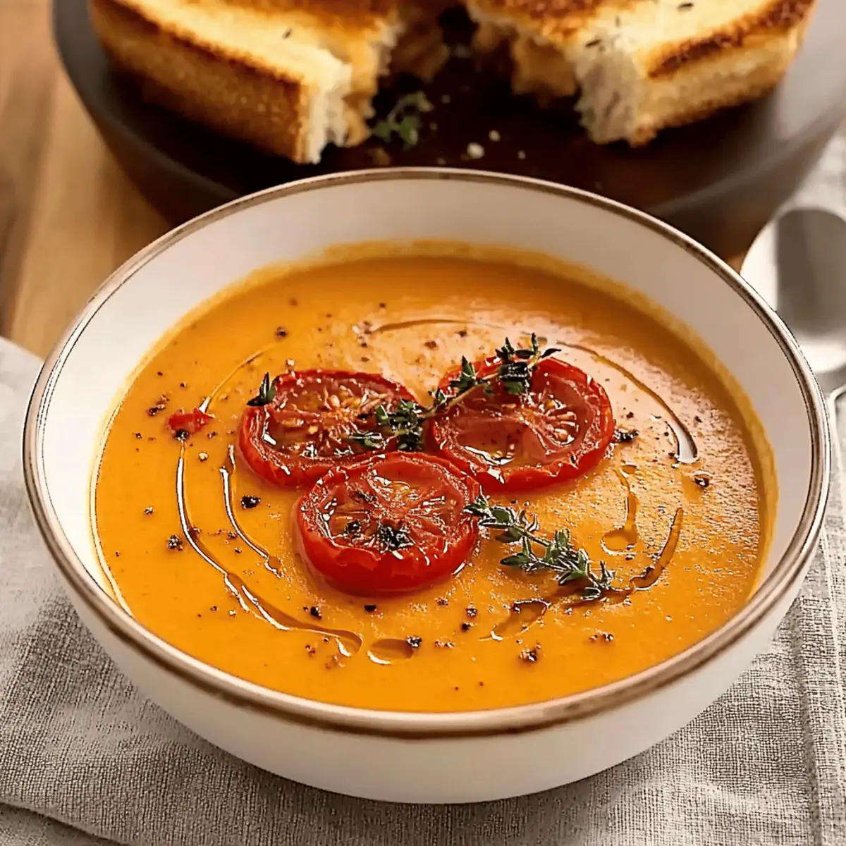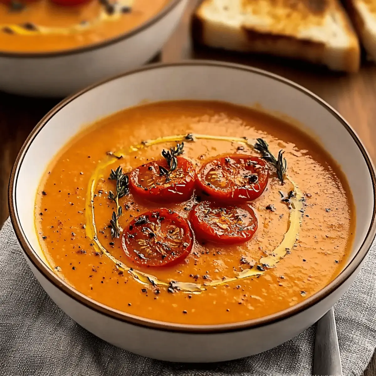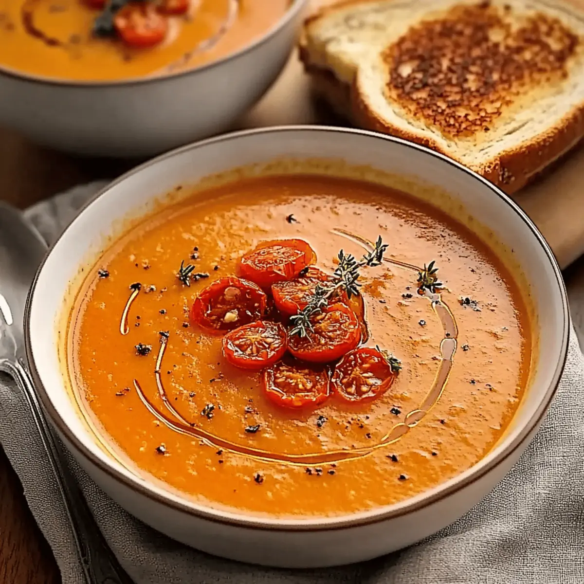 As I stood in my kitchen, the rich, toasty aroma of roasted garlic filled the air, instantly transporting me to a cozy café in the heart of Italy. Today, I’m thrilled to share my take on a cozy classic—Creamy Roasted Garlic Tomato Soup. Not only is this dish a heartfelt hug in a bowl, but it’s also an effortless recipe that’s a true crowd-pleaser. With just a few wholesome ingredients, it strikes the perfect balance between hearty comfort food and a healthy upgrade. Whether you’re preparing it for a quick weeknight dinner or simply meal prepping for the week, this soup offers both convenience and satisfaction. Are you ready to dive into a bowl of warmth and flavor? Let’s explore this delightful recipe together! Why is this soup a must-make? Comforting, warm flavors: This Creamy Roasted Garlic Tomato Soup wraps you in a cozy embrace with every spoonful. Easy preparation: With minimal fuss, you can whip up this gourmet delight in no time—perfect for busy nights! Versatile pairing: Serve it with a classic grilled cheese or a fresh Caesar salad for a wholesome meal. Make-ahead friendly: Batch it out and keep it in the fridge or freezer for a quick, warming meal anytime. Vegetarian goodness: Enjoy the rich flavors while keeping your meal plant-based and healthy! Creamy Roasted Garlic Tomato Soup Ingredients For the Soup Base • Ripe organic tomatoes – Essential for a vibrant flavor; opt for seasonal varieties like Roma or San Marzano for the sweetest result. • Garlic – Roasting it mellows its pungency, adding a sweet touch to your soup. Roast whole bulbs until soft for the best flavor. • Onion – Brings a natural sweetness; yellow or white onions work perfectly here. • Extra-virgin olive oil – Vital for sautéing and depth of flavor; feel free to substitute with any neutral oil if needed. • Vegetable broth – This enriches the soup’s flavor; homemade or low-sodium is best for a healthier option. • Tomato paste – Concentrates and amplifies the tomato taste; pureed sun-dried tomatoes make a great alternative. • Sea salt – Essential for enhancing flavors; adjust according to your taste preferences. For the Creamy Element • Heavy cream – Adds a luxurious creaminess to the soup; replace with coconut milk for a lighter version or omit for a dairy-free option. • All-purpose seasoning blend – For an extra layer of flavor; Italian seasoning can be used as a substitute. • Smoked paprika – Adds a warm smokiness but can be swapped with regular paprika for a milder taste. For Garnishing • Reserved roasted tomatoes (optional) – They bring a burst of flavor; reserved from roasting to enhance your presentation. • Grilled cheese sandwich (for serving) – The perfect accompaniment; use a mix of sharp cheddar and Gruyère for a delicious contrast with the soup. Dive into creating this tasty Creamy Roasted Garlic Tomato Soup, and let it warm your heart! Step‑by‑Step Instructions for Creamy Roasted Garlic Tomato Soup Step 1: Roast Tomatoes and Garlic Preheat your oven to 400°F (200°C). On a baking sheet, arrange wedges of ripe organic tomatoes and whole garlic bulbs, then drizzle them generously with extra-virgin olive oil. Sprinkle with sea salt to enhance their flavors. Roast in the oven for 35-40 minutes, until the tomatoes are caramelized and soft, giving off a rich aroma that fills your kitchen with warmth. Step 2: Sauté Onions While the tomatoes and garlic are roasting, grab a medium pot and add a splash of olive oil. Heat it over medium-high heat, then add diced yellow or white onions. Sauté the onions for about 1-2 minutes, or until they turn translucent and fragrant—this will bring a nice depth to your creamy roasted garlic tomato soup. Step 3: Blend Ingredients Once the tomatoes and garlic are roasted to perfection, let them cool slightly before transferring them to a blender. Add the sautéed onions, along with tomato paste and vegetable broth for a delightful flavor boost. Blend the mixture until smooth and creamy, capturing the heart of the creamy roasted garlic tomato soup in a luscious texture. Step 4: Simmer Soup Pour the blended mixture back into the pot you used for the onions. Stir in heavy cream, sea salt, all-purpose seasoning blend, and smoked paprika. Bring the soup to a gentle boil, then reduce the heat and let it simmer for about 5-6 minutes until it thickens slightly, enveloping your kitchen in a comforting aroma. Step 5: Serve Ladle the rich and creamy roasted garlic tomato soup into warm bowls, and for an elegant touch, top with the reserved roasted tomatoes you set aside. Pair this delightful soup with a perfectly grilled cheese sandwich, adding a delicious contrast that will warm both your heart and your palate. Expert Tips for Creamy Roasted Garlic Tomato Soup Perfectly Roasted Tomatoes: Ensure your tomatoes are roasted until caramelized to achieve concentrated flavor and avoid excess moisture in your creamy roasted garlic tomato soup. Garlic Precision: Don’t rush the roasting process; adjust the heat if necessary to ensure the garlic becomes sweet and soft. Temper the Cream: Gradually add some hot soup to the heavy cream before mixing it in fully to prevent curdling and achieve a velvety texture. Season at the End: Always taste and adjust seasoning at the end, as flavors can concentrate differently with each batch of creamy roasted garlic tomato soup. Smooth Blending: Allow roasted ingredients to cool before blending to avoid steam build-up, which can result in a messy kitchen encounter! Creamy Roasted Garlic Tomato Soup Variations Feel free to get creative with this recipe! Each twist adds a unique flavor to your warm, cozy bowl. Dairy-Free: Substitute heavy cream with coconut milk for a vegan-friendly version that’s still creamy and comforting. Herb-Infused: Add fresh basil or thyme while blending for a burst of freshness that elevates the soup’s flavor. Spicy Kick: Throw in a pinch of red pepper flakes 