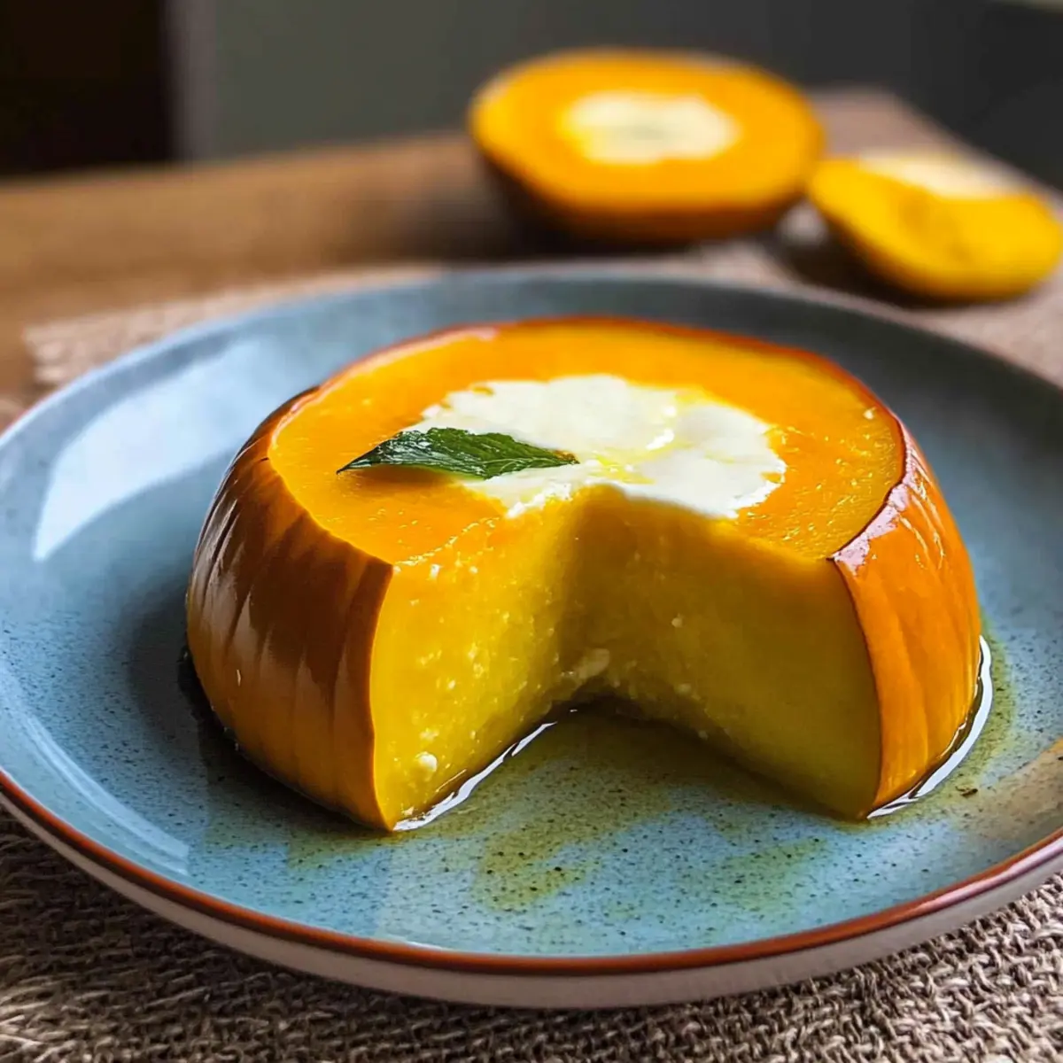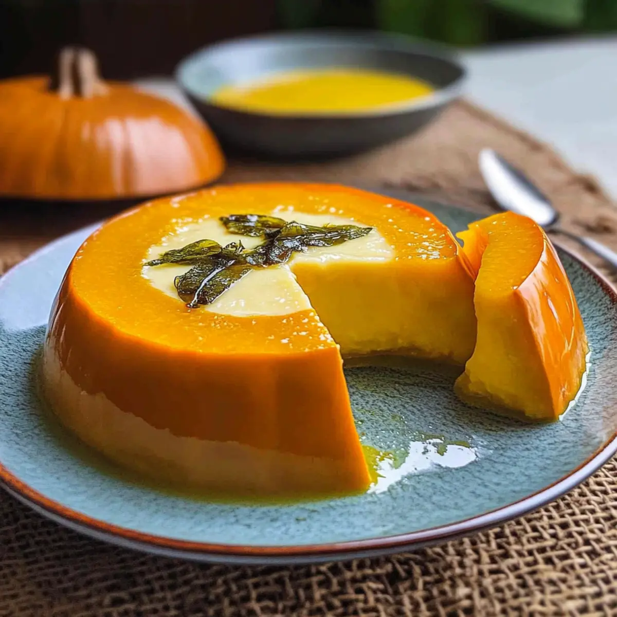 As I gazed out at the golden sunset, I couldn’t help but think about the flavors of Thailand that had danced around my senses. One dish that instantly comes to mind is Sangkaya Faktong—an exquisite Thai dessert that brings together creamy pumpkin custard bliss and vibrant coconut milk. This delightful treat not only captures the essence of Thai cuisine but also offers an impressive presentation that’s bound to wow your guests. With its quick prep and vegetarian-friendly twist, it’s perfect for a cozy weeknight indulgence or a special occasion that calls for something extraordinary. Are you ready to embark on a culinary adventure into the heart of Thailand with this creamy custard delight? Why is Creamy Thai Pumpkin Custard Bliss Special? Rich, Comforting Flavor: The combination of sweet kabocha pumpkin and coconut milk creates a dessert that’s both soothing and indulgent. Beautiful Presentation: Serving the custard in the pumpkin not only makes for a striking centerpiece but enhances the overall dining experience. Easy Preparation: With just a few simple steps, you can whip up a Thai dessert that impresses without overwhelming your culinary skills. Vegetarian-Friendly: Perfect for those adhering to a vegetarian lifestyle, this dish provides a delightful and satisfying alternative to conventional sweets. Versatile Serving Options: Pair it beautifully with a cup of Thai iced tea or fresh fruit to elevate your dessert experience. Cultural Tradition: Enjoying Sangkaya Faktong connects you to rich Thai traditions, making it a meaningful addition to any festive occasion or family gathering. Creamy Thai Pumpkin Custard Ingredients • Dive into the world of Creamy Thai Pumpkin Custard Bliss with these simple ingredients! For the Custard Kabocha Pumpkin – This sweet, hearty pumpkin serves as both the bowl and base for your custard. Eggs – Provide essential structure and richness; you can substitute them with cornstarch for a vegan alternative if desired. Coconut Milk – Offers a tropical, creamy flavor; using room-temperature coconut milk ensures a smooth texture. Palm Sugar – Sweetens the custard and brings authentic Thai flavor; if too hard, soften it in warm coconut milk. White Sugar – Balances the sweetness; feel free to adjust according to your taste preferences. Salt – A little pinch enhances all the flavors beautifully. Vanilla Extract – Adds lovely aromatic depth for a well-rounded custard experience. For Serving (Optional) Powdered Sugar – A light dusting for an elegant finish on top of your dessert. Toasted Coconut Flakes – Adds a delightful crunch and extra coconut flavor for that tropical touch. Now you’re all set to create this delightful dessert that embodies Creamy Thai Pumpkin Custard Bliss! Step‑by‑Step Instructions for Creamy Thai Pumpkin Custard Bliss Step 1: Prepare the Kabocha Pumpkin Begin by cutting the top off the kabocha pumpkin, creating a lid. Scoop out the seeds and fibers, ensuring the pumpkin is hollow. Place the pumpkin in a steamer basket and steam it over boiling water for about 15 minutes, or until slightly softened but still firm to hold its shape. This step creates the perfect vessel for your creamy Thai pumpkin custard bliss. Step 2: Make the Custard Mixture In a large mixing bowl, whisk together the eggs until they are fully blended and smooth. Gradually add in the room-temperature coconut milk along with the palm sugar, white sugar, salt, and vanilla extract. Once combined, strain the mixture through a fine-mesh sieve into another bowl to ensure a velvety custard texture, free of any lumps that might disrupt its creaminess. Step 3: Fill the Pumpkin Carefully pour the custard mixture into the hollowed kabocha pumpkin, filling it about ½ inch from the top to allow room for expansion while cooking. Gently place the pumpkin lid back on top to seal in the flavors and moisture. This not only keeps the custard luscious but also makes for a stunning presentation once cooked. Step 4: Steam the Dessert Set the filled pumpkin back into the steamer, making sure there are about 2 inches of boiling water in the bottom. Cover the steamer with a lid and let the pumpkin steam for 30 to 40 minutes. Check for doneness; the custard should jiggle slightly but remain firm when it’s finished—perfectly set for your creamy Thai pumpkin custard bliss. Step 5: Cool and Serve Once fully cooked, carefully remove the pumpkin from the steamer and allow it to cool completely at room temperature. After cooling, slice into wedges or spoon out servings of the custard, showcasing its creamy texture. Serve your dessert warm or chilled, optionally garnished with a dusting of powdered sugar or toasted coconut flakes for an added tropical touch. Make Ahead Options These Creamy Thai Pumpkin Custard Bliss servings are perfect for busy home cooks looking to save time! You can prepare the custard mixture (eggs, coconut milk, sugars, salt, and vanilla) and refrigerate it for up to 24 hours before pouring it into the steamed pumpkin. Additionally, the kabocha pumpkin can be steamed a day in advance—just cover and store in the fridge to maintain its quality. When you’re ready to enjoy the dessert, simply combine the custard mixture with the prepared pumpkin and steam it as instructed. This meal prep strategy allows you to serve a delightful, homemade dessert with minimal effort, making your busy weeknights much sweeter! Expert Tips for Creamy Thai Pumpkin Custard Pumpkin Preparation: Ensure the kabocha is well-scrubbed and fully hollowed out to prevent any raw spots in the dessert. Perfect Custard Texture: Always strain the custard mixture for a silky consistency; skipping this step can leave you with lumps in your creamy Thai pumpkin custard bliss. Monitor Cooking Time: Adjust steaming time based on pumpkin size; larger pumpkins may require a bit more time to set fully. Check for Doneness: Use a toothpick or knife; it should come out clean from the center when 