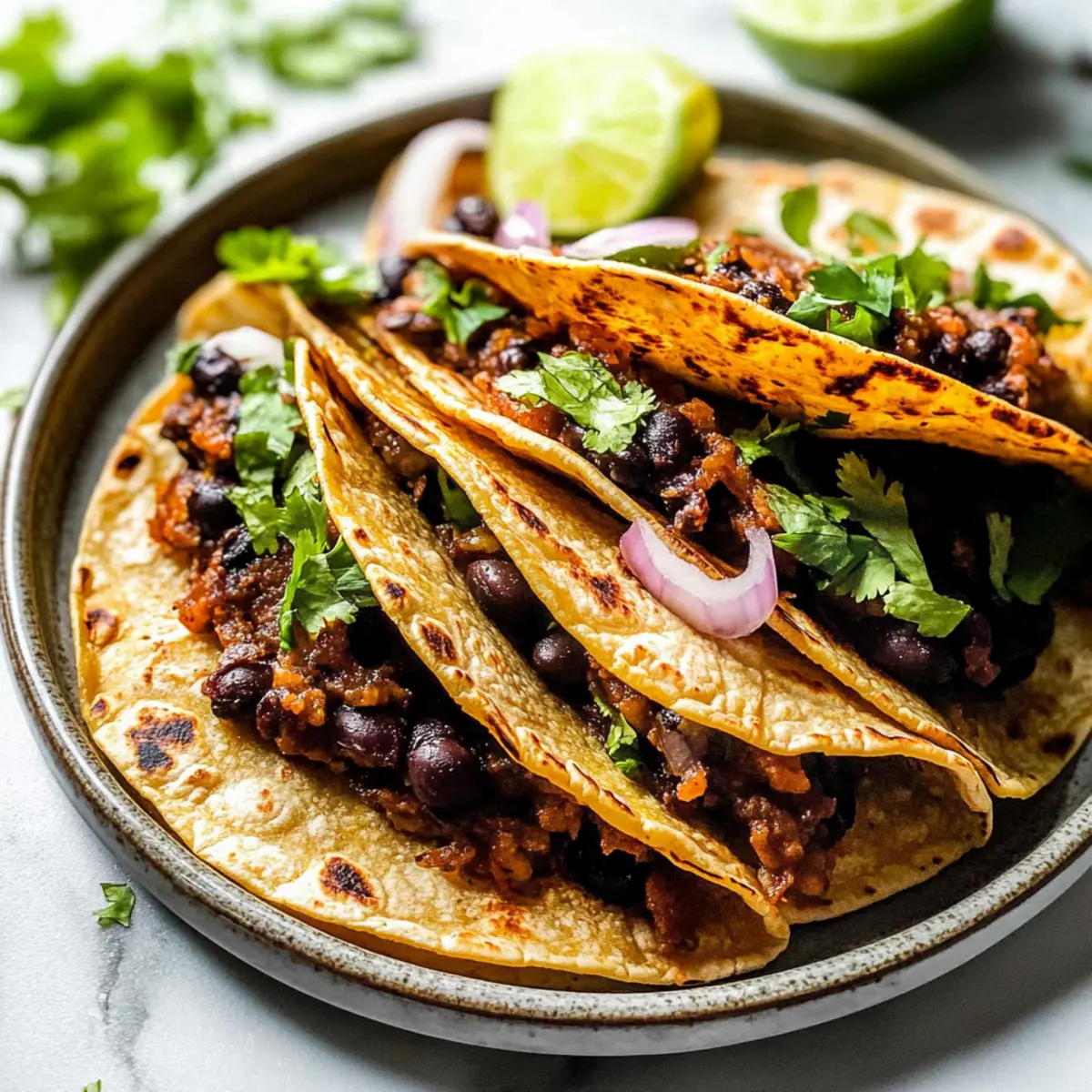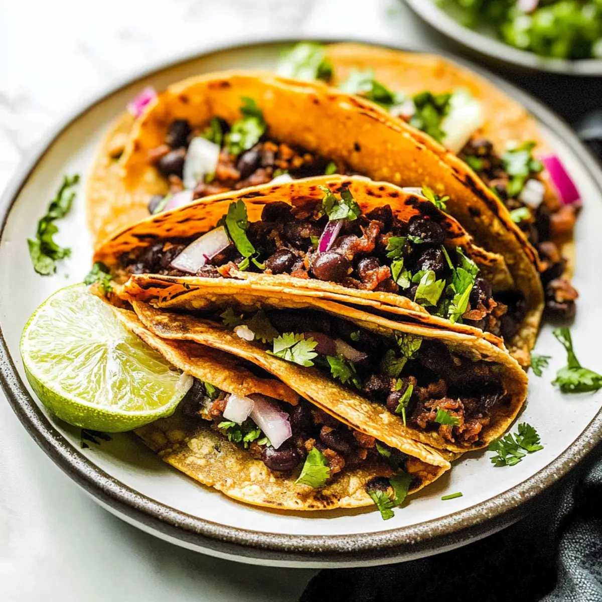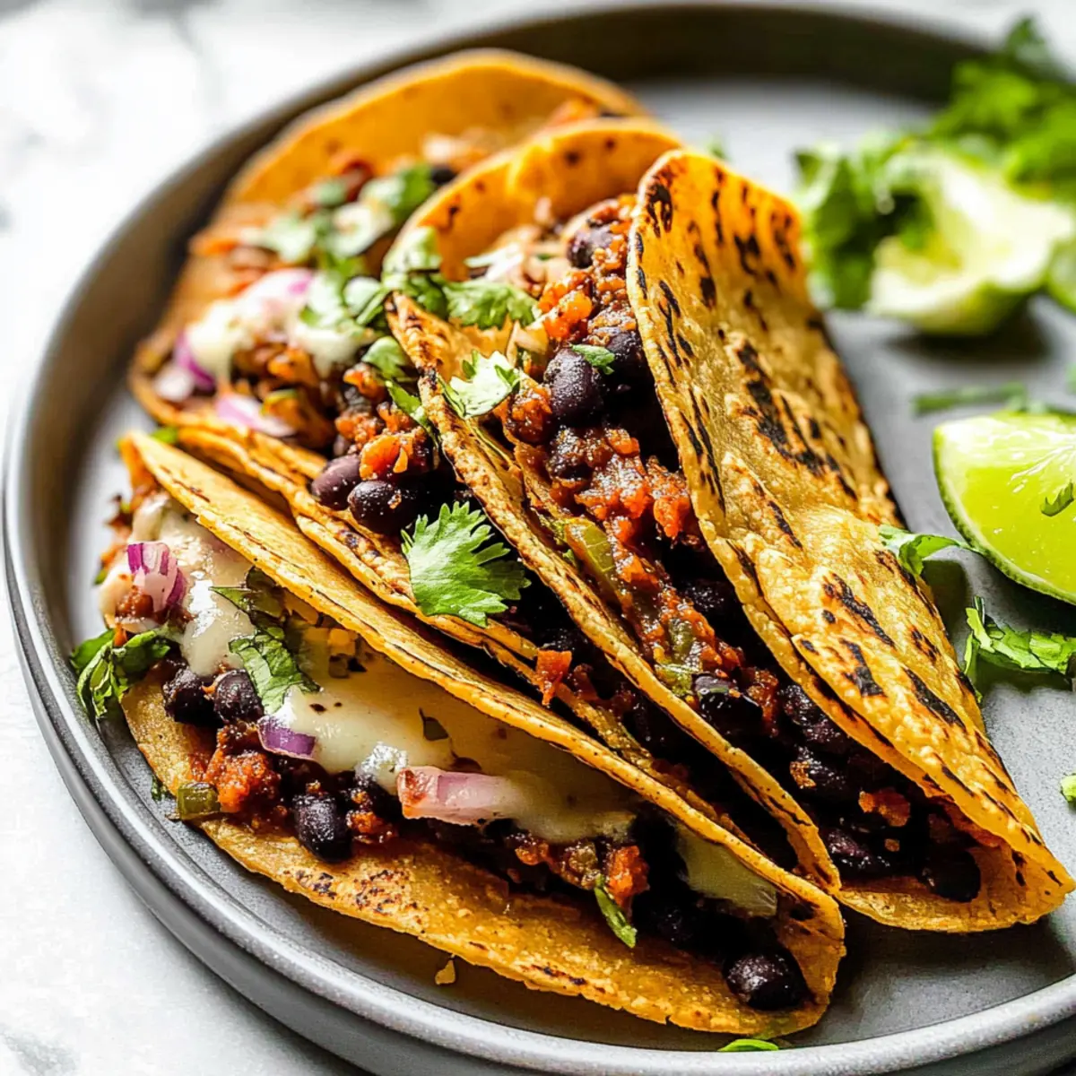 As I stared at the clock, it dawned on me—dinner was fast approaching, and my usual options felt painfully uninspired. That’s when I remembered my Crispy Black Bean Tacos, a magical mash-up that marries the essence of tacos and the comfort of quesadillas. With a zesty filling of seasoned black beans stacked snugly between crispy tortillas, this dish invites you to savor each bite. What I love most? Not only is this vegetarian delight ready in a mere 45 minutes, but it’s also easy to adapt for vegan diets. Whether you’re feeding a crowd or just seeking a quick weeknight meal, these tacos are a satisfying solution. Curious how to make this flavor-packed recipe come to life? Let’s dive in! Why are Crispy Black Bean Tacos a Must-Try? Quick & Easy: With only 45 minutes from start to finish, you’ll have a delightful dinner on the table in no time! Flavor-Packed: The smoky black bean filling brings an irresistible taste that will leave everyone asking for seconds. Customizable: Easily adapt these tacos for a vegan feast by simply omitting the cheese or swapping it for a dairy-free option. Crowd-Pleaser: Perfect for gatherings, serve these with fresh salsa or guacamole for added flair, making them a hit at any party. Healthy & Wholesome: Packed with protein and fiber, these tacos are as nutritious as they are delicious. For more tasty taco ideas, check out my Buffalo Chicken Tacos and Chicken Birria Tacos for delicious alternatives! Crispy Black Bean Tacos Ingredients Get ready to indulge in the flavors of this vegetarian masterpiece with these essential ingredients! For the Filling Olive Oil (3 tablespoons) – Used for sautéing vegetables and oiling the baking sheet; avocado oil can add a new flavor twist. Yellow Onion (1 medium, diced) – Provides sweetness and depth; any onion variety can work perfectly! Garlic (4 cloves, finely chopped) – Adds aromatic flavor; fresh garlic is preferred, but powdered can be used too. Chipotle Pepper or Adobo Sauce (optional) – Imparts a smoky, spicy punch; adjust according to your heat tolerance. Tomato Paste (2 tablespoons) – Adds richness and depth; fresh tomatoes can be a nice alternative with some moisture adjustments. Chili Powder (1 ½ teaspoons) – Delivers a nice spice; feel free to swap with cayenne or your favorite spice blend. Ground Cumin (1 ½ teaspoons) – Adds warm, earthy notes; no need to adjust unless altering spice levels. Smoked Paprika (1 ½ teaspoons) – Elevates the smokiness; regular paprika can be used for a milder flavor. Black Beans (2 x 14-ounce cans, drained and rinsed) – The heart of our filling. Pinto beans can be swapped for variety! Vegetable Broth (½ cup) – Adds necessary moisture to the filling; water or chicken broth can work too. Lime (1, juiced) – Brightens all the flavors; vinegar can be a quick substitute if needed. For Assembly Corn Tortillas (8-10) – Serve as the crunchy taco shells; flour tortillas can be used as a substitute, but may change the texture. Pepper Jack Cheese (6 ounces, freshly shredded) – Adds creaminess; easily replaced with a non-dairy option or omitted for vegan Crispy Black Bean Tacos. Kosher Salt & Ground Black Pepper – To taste; be sure to adjust according to dietary needs. Let flavors unfold as you whip up these easy, crispy tacos that your family is sure to love! Step‑by‑Step Instructions for Crispy Black Bean Tacos Step 1: Preheat Oven Begin by preheating your oven to 450°F (232°C) and lining a baking sheet with parchment paper or lightly greasing it with olive oil. This ensures your Crispy Black Bean Tacos will bake evenly and achieve that golden, crispy texture that everyone loves. Step 2: Sauté Onion In a large skillet over medium heat, add 1 tablespoon of olive oil and sauté the diced yellow onion. Cook for approximately 3-4 minutes, or until the onion is translucent and starts to soften. This will form the base of the aromatic flavor in your filling, so keep an eye on it as it cooks. Step 3: Toast Aromatics Next, stir in the finely chopped garlic and any optional chipotle pepper you like. Cook for about 30 seconds—until fragrant—then add the chili powder, ground cumin, smoked paprika, and tomato paste. Sauté this mixture for another 1-2 minutes to enhance the flavors, stirring until everything is well combined and aromatic. Step 4: Cook Black Bean Filling Add the drained and rinsed black beans along with ½ cup of vegetable broth into the skillet. Use a fork or potato masher to slightly mash the beans, then let the mixture simmer for about 5 minutes. Cook until thickened and heated through, and finish off by squeezing in the lime juice for that vibrant punch. Step 5: Warm Tortillas While the filling simmers, take a dozen corn tortillas and wrap them in a damp paper towel. Microwave the wrapped tortillas for about 30 seconds to make them pliable and easy to fold, preventing any tears when you assemble your Crispy Black Bean Tacos. Step 6: Assemble Tacos Now, brush your prepared baking sheet with a little olive oil. Place the warm tortillas on the baking sheet and fill each one with the black bean mixture, topped with freshly shredded pepper jack cheese. Fold the tortillas in half, making sure they are sealed tight to hold in all the delicious filling. Step 7: Bake Slide the baking sheet into the preheated oven and bake your assembled Crispy Black Bean Tacos for 8-10 minutes. After that time, carefully flip the tacos and bake for an additional 8-10 minutes, or until they are crispy and golden brown on both sides. Step 8: Cool & Serve Once your Crispy Black Bean Tacos are baked to perfection, remove them from the oven and let them cool for a couple of minutes. This makes it easier to handle them. Serve warm with an array of toppings like guacamole, salsa, or sour cream for a delightful finish to your meal! Crispy Black Bean Tacos Variations Feel free to unleash your creativity and tailor these tacos to suit your taste buds! Vegan Delight: Omi