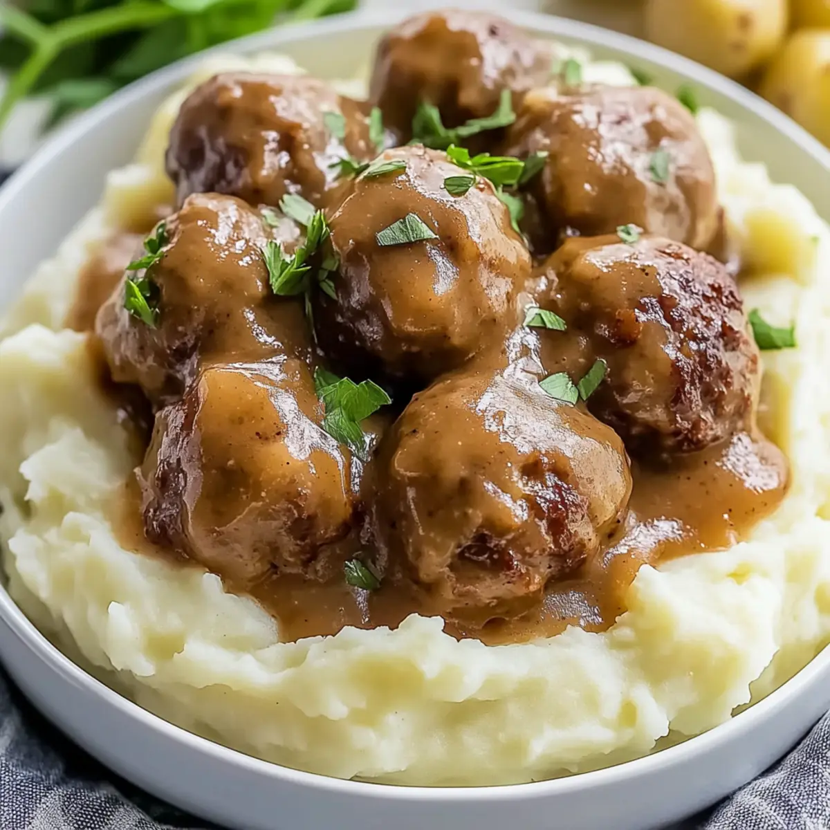There’s a certain warmth that fills my kitchen when I’m greeted by the rich aroma of Crockpot Mississippi Meatballs slowly cooking away. This dish is a perfect blend of creamy and tangy goodness, making it the ultimate comfort food for those bustling weeknights. As someone constantly juggling work and life, these meatballs save me time without sacrificing flavor; simply toss in a handful of ingredients and let the slow cooker do its magic. Not only are they a family favorite, but they also make for irresistible appetizers when gathering with friends. Ready to uncover how simple ingredients can create a meal that warms both the heart and stomach? Let’s dive into this easy and delightful recipe together! Why are these meatballs a must-try? Effortless Preparation: Just toss everything in your slow cooker, and the magic happens! Perfect for busy weekdays. Bold, Balanced Flavor: The zing of ranch paired with zesty pepperoncini creates a mouthwatering sauce you’ll crave again and again. Versatile Options: Enjoy as a comforting meal over mashed potatoes or serve as dazzling appetizers at your next gathering. Family-Approved: Whether you’re feeding kids or hosting friends, these meatballs get rave reviews from everyone at the table. Pair with fun sides like easy mashed potatoes for a complete meal! Meal Prep Friendly: Make-ahead goodness means you can whip up the sauce without stress, making dinnertime a breeze. Crowd-Pleasing Appeal: With their irresistible taste and convenient preparation, these Crockpot Mississippi Meatballs will become a beloved staple in your kitchen! Crockpot Mississippi Meatballs Ingredients For the Meatballs • Frozen Meatballs – Use quality frozen beef or homestyle meatballs for the best flavor and texture. For the Sauce • Au Jus Seasoning Mix – Provides savory depth; can be swapped with brown gravy mix for a saltier taste. • Ranch Dressing – Adds creaminess and tang; choose a quality brand for optimal results. • Beef Broth – Enhances moisture and flavor; homemade broth adds richness. • Pepperoncini Juice – Introduces a tang that balances the sauce’s richness; don’t omit for that perfect zip. • Whole Pepperoncini Peppers – Adds gentle heat and acidity; more can be added for extra spice. • Heavy Cream – Enriches the sauce with a creamy texture; half-and-half is a lighter alternative for a similar effect. This collection of ingredients works wonders together, creating mouthwatering Crockpot Mississippi Meatballs that are sure to delight everyone around the table! Step‑by‑Step Instructions for Crockpot Mississippi Meatballs Step 1: Mix Sauce In a medium bowl, whisk together the Au Jus seasoning mix, ranch dressing, beef broth, heavy cream, and pepperoncini juice until the mixture is smooth and well combined. This creamy sauce will serve as the flavorful base for your Crockpot Mississippi Meatballs, so take a moment to ensure everything is incorporated thoroughly. Step 2: Prepare Meatballs Sprinkle the frozen meatballs evenly in the bottom of your slow cooker, spreading them out to ensure even cooking. The meatballs should be arranged in a single layer, allowing the sauce to envelop each one. This step is crucial for ensuring that your meatballs absorb all that delicious flavor as they cook. Step 3: Combine Pour the prepared sauce over the frozen meatballs, ensuring they are all well-coated in the creamy mixture. For an extra burst of flavor, tuck whole pepperoncini peppers throughout the meatballs. Their gentle heat and acidity will elevate the overall taste of the dish, complementing the richness of the sauce perfectly. Step 4: Cook Cover the slow cooker with the lid and set it to cook on low for 6-7 hours or on high for 3-4 hours. As the Crockpot Mississippi Meatballs simmer, the sauce will thicken, and the meatballs will soak up all that savory goodness. Check for doneness by ensuring the meatballs are heated through and tender, ideally when they reach an internal temperature of 165°F. Step 5: Serve Once cooked, carefully spoon the meatballs and the sumptuous sauce onto your favorite serving dish. These delightful Crockpot Mississippi Meatballs can be served over mashed potatoes, rice, or buttered noodles, or kept as cocktail meatballs for parties. Garnish with fresh herbs if desired, and enjoy the heartwarming flavors with family and friends! Expert Tips for Crockpot Mississippi Meatballs • Select Quality Meatballs: Use high-quality frozen or homemade meatballs to ensure a flavorful base. Avoid overly processed options that can detract from the dish. • Balance the Sauce: Taste the sauce before cooking and adjust seasoning as needed; not all Au Jus mixes are created equal, so you may want to add a pinch of salt or seasoning. • Avoid Overcooking: Keep an eye on cook times. Cooking the Crockpot Mississippi Meatballs too long can lead to tough meatballs, so follow the recommended times carefully. • Prep Ahead: For easy meal prep, prepare and refrigerate the sauce up to 24 hours before cooking. It saves time and lets the flavors meld beautifully. • Customize to Taste: Don’t shy away from making it your own! Experiment with different flavors, like adding garlic or extra peppers, to suit your family’s preferences. Make Ahead Options These Crockpot Mississippi Meatballs are perfect for meal prep enthusiasts! You can prepare the sauce up to 24 hours in advance and store it in the refrigerator to save time on busy weeknights. Simply whisk together the Au Jus seasoning mix, ranch dressing, beef broth, heavy cream, and pepperoncini juice, then refrigerate in a sealed container. Additionally, you can also arrange the frozen meatballs in the slow cooker a day ahead—just ensure they’re covered with the sauce before cooking. When you’re ready to serve, reheat the meatballs in the slow cooker for 3-4 hours on high or 6-7 hours on low. This way, you’ll enjoy all the rich, savory flavors just as delicious as if made fres