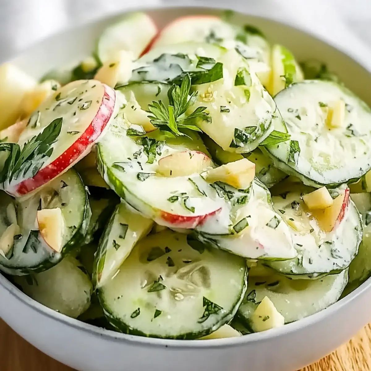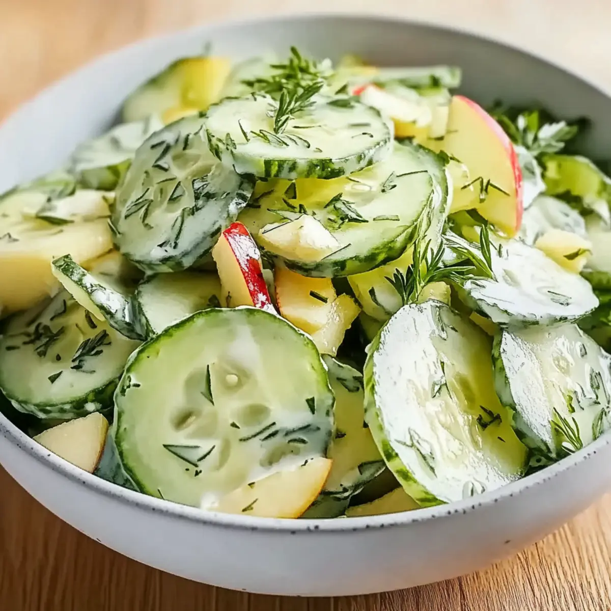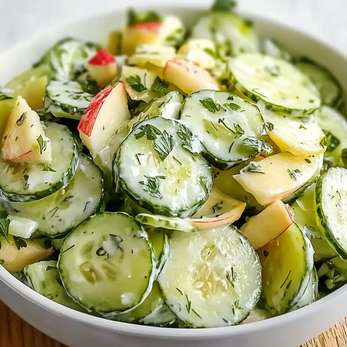As I chopped the cool, crisp cucumbers and sweet apples, a wave of excitement washed over me. There’s something undeniably uplifting about creating a salad that’s as vibrant as it is simple. My Crunchy Cucumber Apple Salad with Fresh Dressing is a delightful blend of textures and flavors, perfect for those busy days when you crave something refreshing yet satisfying. Not only is this recipe incredibly quick to prepare—truly just a matter of chopping and tossing together—but it’s also versatile, allowing you to swap out ingredients based on what you have on hand. Whether you’re looking for a light side at dinner or a flavorful snack, this salad delivers deliciously every time. So, what unique twist will you add to make it your own? Why is this salad a must-try? Flavorful and Fresh: The Crunchy Cucumber Apple Salad bursts with vibrant flavors, simply enhanced by a creamy dressing that balances sweetness and tang. Quick to Make: This dish is perfect for those on-the-go moments; just chop, mix, and enjoy in mere minutes! Versatile Ingredients: Feel free to customize with your favorite nuts or herbs for a personal touch—try added bell peppers or carrots for extra crunch! Healthy and Nutritious: Packed with vitamins, it’s a guilt-free option that fits perfectly in any healthy eating plan. Crowd-Pleasing Appeal: Whether served at a summer barbecue or as a weekday snack, this salad is bound to impress your family and friends! For more fresh ideas, don’t miss my Mediterranean Chickpea Salad or a refreshing Cucumber Strawberry Salad. Cucumber Apple Salad Ingredients For the Salad • Cucumbers – Adds crisp texture; opt for English or pickling cucumbers for the best crunch. • Apples – Provides sweetness; Granny Smith adds tartness while Fuji gives a sweeter taste. Consider substituting with Honeycrisp or Gala for variety. • Celery – Offers extra crunch; feel free to swap with bell pepper for a hint of sweetness or shredded carrots for color. • Nuts (Walnuts/Pecans/Almonds) – Provides flavor and added crunch; for a nut-free version, sunflower seeds work wonderfully! For the Dressing • Yogurt – Adds creaminess to the dressing; Greek yogurt enhances the texture. • Mayonnaise – Contributes to richness; consider using vegan mayo for a plant-based option. • Honey/Maple Syrup – Sweetens the dressing; maple syrup works well for a vegan touch. • Apple Cider Vinegar/Lemon Juice – Brings brightness to the flavors; adjust the amount to suit your taste preferences. • Dijon Mustard – Adds a tangy kick; a delightful component in the creamy dressing. For Garnishing • Herbs (Fresh Parsley/Cilantro) – Brightens the dish; mint can be a refreshing alternative. Step‑by‑Step Instructions for Cucumber Apple Salad with Fresh Dressing Step 1: Prepare the Ingredients Begin by washing the cucumbers and apples thoroughly under cool running water. Using a sharp knife and a cutting board, slice the cucumbers and apples into thin, even pieces to ensure a pleasant crunch. Aim for a thickness of about ¼ inch for each slice, making them easy to mix and enjoy. This vibrant Cucumber Apple Salad with Fresh Dressing is all about fresh, crisp ingredients! Step 2: Add Crunch with Celery and Onion Next, wash and thinly slice the celery into small, bite-sized pieces. If you’re using red onion, slice it into thin rings or small dice, depending on your preference for flavor intensity. Combine the chopped celery and onion with the cucumber and apple slices in a large mixing bowl. This mixture will add a delightful crunch and a pop of color, setting the stage for your salad. Step 3: Incorporate the Nuts If you’re using nuts like walnuts, pecans, or almonds, roughly chop about ¼ cup and add them to the salad mixture. Toss everything together gently with a large spoon to distribute the ingredients evenly. The crunchy texture of the nuts enhances the Cucumber Apple Salad with Fresh Dressing, making each bite satisfying and delicious. Step 4: Whisk Up the Dressing In a separate medium mixing bowl, whisk together the yogurt, mayonnaise, honey or maple syrup, apple cider vinegar or lemon juice, and Dijon mustard until smooth and creamy. Aim for a well-blended texture, ensuring there are no lumps. This dressing will bring the salad to life, offering a tangy, sweet element that perfectly complements the salad’s freshness. Step 5: Combine Salad and Dressing Pour the creamy dressing over the salad mixture in the large bowl. Using a spatula or wooden spoon, gently toss the ingredients together, ensuring that every piece is evenly coated with the dressing. Be careful not to bruise the fruits and veggies as you combine them, maintaining the crunch of your Cucumber Apple Salad with Fresh Dressing. Step 6: Garnish and Chill Chop up fresh herbs like parsley or cilantro, then sprinkle them over the top of the salad. For an optional refreshing twist, consider adding mint. Cover the bowl with plastic wrap or transfer the salad to an airtight container and refrigerate for at least 15-20 minutes. Chilling allows the flavors to meld and intensifies the overall taste of the salad, making it even more enjoyable when served. Expert Tips for Cucumber Apple Salad • Choose the Right Cucumbers: Use medium English or pickling cucumbers for the best crunch; avoid waxy varieties that can compromise fresh flavor. • Optimal Apple Choices: Select apples that balance sweetness and tartness—Granny Smith is ideal for tartness, while Fuji or Honeycrisp adds sweetness to the Cucumber Apple Salad with Fresh Dressing. • Customize Smartly: Experiment with different nuts or add-ins. If you’re going nut-free, sunflower seeds provide a delightful crunch without losing flavor. • Fresh Herbs Matter: Always opt for fresh herbs like parsley or cilantro—dried herbs lack the vibrant aroma that your salad craves. • Let It Chill: Allow your salad to refrigerate for at least 15-20 minutes. Chilling helps the flavor