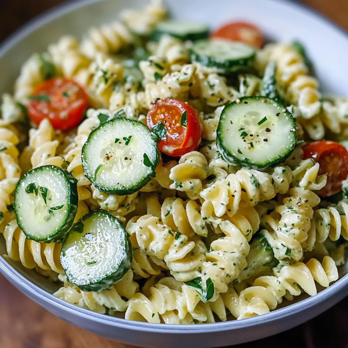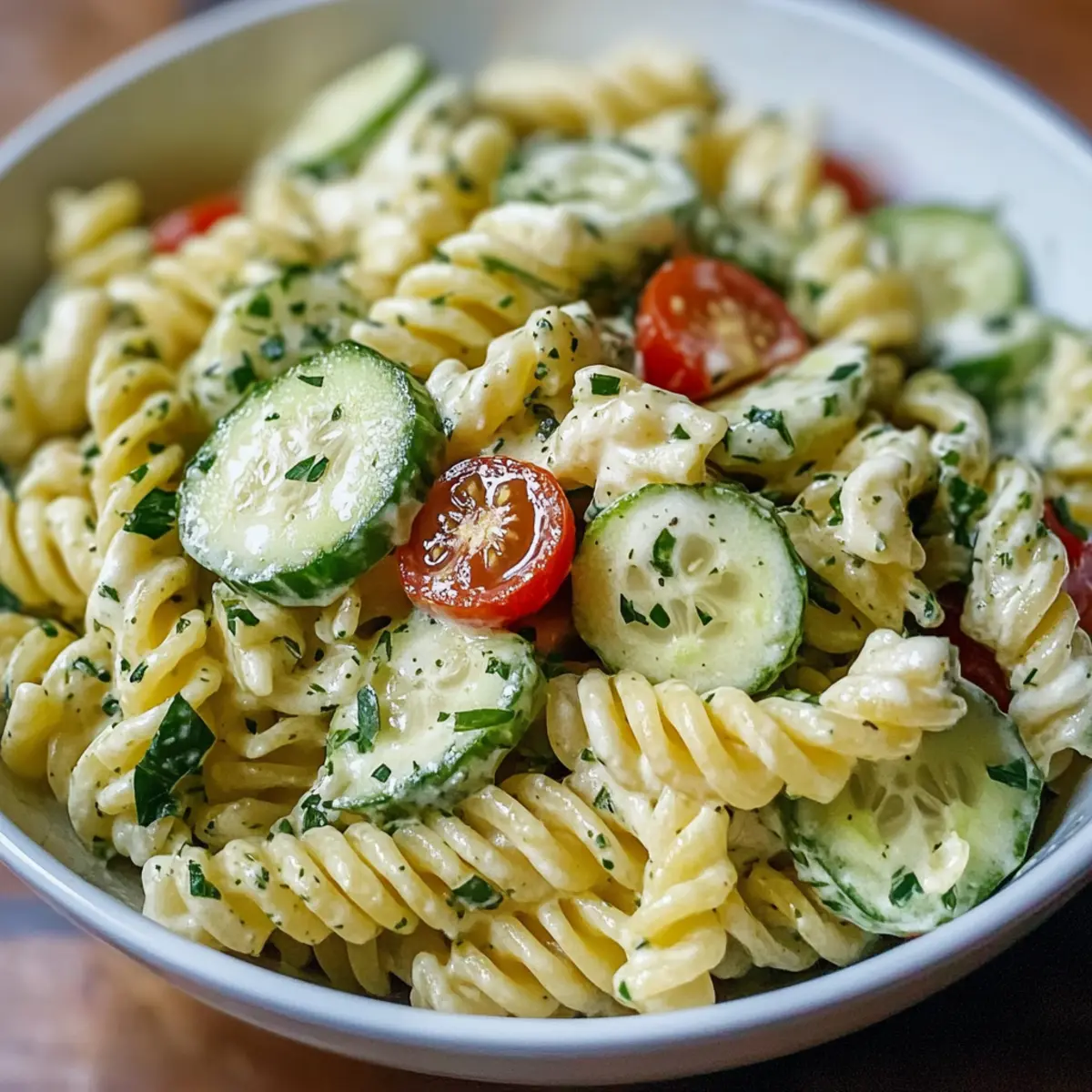 On a sunny afternoon, I found myself hungry for something fresh and vibrant, a dish that could awaken my palate without keeping me in the kitchen for hours. Enter my Quick and Easy Cucumber Pasta Salad—a delightful blend of cool cucumbers and tender rotini, wrapped in a creamy dressing that dances on your taste buds. Whipping this salad up takes just 15 minutes, making it the ideal choice for spontaneous picnics, summer gatherings, or even a light lunch at home. Plus, it’s adaptable; you can easily swap ingredients or dressings to suit your taste. Ready to make this refreshing dish that everyone will love? Let’s dive into the details and elevate your salad game! Why is Cucumber Pasta Salad a Must-Try? Freshness in Every Bite: This Cucumber Pasta Salad is the epitome of summer, combining crunchy cucumbers with tender rotini for a refreshing meal. Quick and Easy: With just 15 minutes of prep time, you can whip it up effortlessly—ideal for busy days or impromptu gatherings! Versatile Ingredients: Adapt the recipe to your liking by swapping in different vegetables like bell peppers or using Greek yogurt instead of mayonnaise for a lighter touch. Crowd-Pleasing Appeal: Its vibrant colors and delightful flavors make it a guaranteed hit whether at picnics or family dinners. Try it alongside other fresh dishes like Cucumber Strawberry Salad for a complete summer spread! Perfect Make-Ahead Option: Make it a day in advance; the flavors meld beautifully overnight, making it taste even better when chilled for serving. Cucumber Pasta Salad Ingredients For the Pasta • Rotini Pasta – Provides structure and holds the dressing well; substitute with fusilli or penne. For the Vegetables • Cucumber – Offers a cool crunch; choose large, firm cucumbers or English cucumbers for fewer seeds. • Cherry Tomatoes – Adds sweetness and color; consider using halved grape tomatoes as an alternative. • Parsley – Enhances flavor and freshness; can be swapped for fresh dill for a unique twist. For the Dressing • Mayonnaise or Greek Yogurt – Provides creaminess; swap for sour cream or a mix of both for a tangy flavor. • Olive Oil – Adds richness and smoothness to the dressing. • Lemon Juice or White Vinegar – Infuses brightness; replace with apple cider vinegar for a different flavor profile. • Garlic Powder – Enhances flavor depth; fresh garlic can be used for a stronger taste. • Dried Oregano – Complements the other flavors; basil is a great substitute for a different herb. • Salt and Pepper – For seasoning; adjust to taste. This Cucumber Pasta Salad is a versatile choice that combines a delightful mix of fresh ingredients, making it a perfect addition to your summer meal repertoire. Step‑by‑Step Instructions for Cucumber Pasta Salad Step 1: Cook the Pasta Begin by bringing a large pot of salted water to a rolling boil over high heat. Add the rotini pasta and cook according to package instructions until al dente, usually about 8-10 minutes. Once done, drain the pasta in a colander, then rinse it under cold water to halt the cooking process and cool it down completely. Step 2: Prepare the Vegetables While the pasta is cooking, wash and slice your cucumbers into thin half-moons and halve your cherry tomatoes for vibrant pops of color. In a large mixing bowl, combine the cooled rotini, sliced cucumbers, halved cherry tomatoes, and freshly chopped parsley. Make sure everything is evenly distributed for a delightful Cucumber Pasta Salad. Step 3: Make the Dressing In a separate bowl, whisk together the mayonnaise (or Greek yogurt) with olive oil, fresh lemon juice (or vinegar), garlic powder, dried oregano, and a pinch of salt and pepper. Mix until the dressing is smooth and creamy. This flavorful dressing will bring together the ingredients in your Cucumber Pasta Salad beautifully. Step 4: Toss the Salad Pour the creamy dressing over the mixed pasta and vegetables in the large bowl. Using a spatula or wooden spoon, gently fold and toss the salad until everything is evenly coated with the dressing. Take a moment to taste the mixture and adjust the seasoning, adding more salt or pepper if needed. Step 5: Chill and Serve Cover the bowl with plastic wrap or a lid and refrigerate the salad for at least 30 minutes. This chilling step enhances the flavors and ensures a refreshing taste when served. Once ready, serve your Cucumber Pasta Salad cold, perfect for warm summer days or as a delightful side dish at gatherings. Expert Tips for Cucumber Pasta Salad • Choose Fresh Ingredients: Use fresh, crisp cucumbers and flavorful herbs for the best taste in your Cucumber Pasta Salad. • Cook Pasta Al Dente: Ensure your rotini is cooked just right—al dente is key to maintaining the perfect bite and preventing sogginess. • Chill for Flavor: Letting the salad chill for at least 30 minutes allows the flavors to meld beautifully, improving the overall taste. • Customize Dressings: Feel free to experiment with different dressings; swapping mayonnaise for Greek yogurt can lighten the salad without sacrificing creaminess. • Don’t Skimp on Seasoning: Adjust salt and pepper to your preference; a well-seasoned dish can elevate your Cucumber Pasta Salad to new heights. What to Serve with Cucumber Pasta Salad? This delightful salad pairs wonderfully with various sides and drinks, enhancing a delicious summer meal. Grilled Chicken: Juicy grilled chicken adds satisfying protein and smoky flavors, making the meal more filling and balanced. Roasted Veggies: Colorful, caramelized vegetables complement the salad’s fresh ingredients while adding a hearty touch to your plate. Chilled White Wine: A glass of crisp Sauvignon Blanc or Pinot Grigio refreshes the palate, perfectly matching the light flavors of the salad. Caesar Salad: The distinct, creamy dressing of a Caesar Salad creates a delightful contrast to the light Cucumber Pasta Salad, making for a vibrant lunch spread. Watermelon Feta Sala