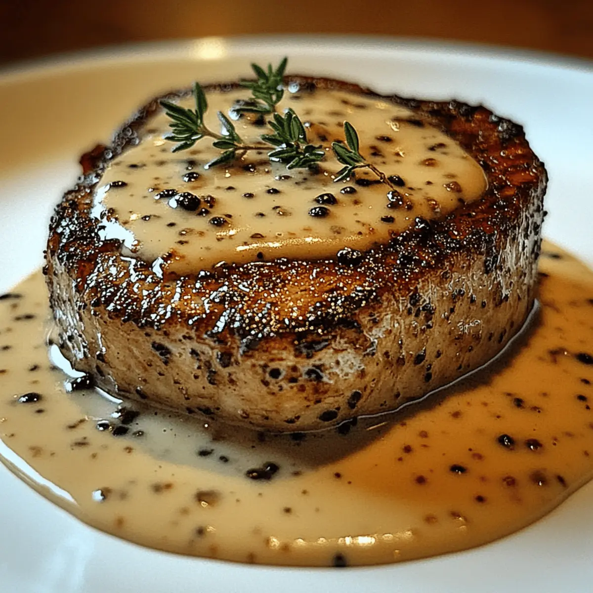 There’s a certain magic that happens when you take a beautiful filet mignon and give it a proper sear. The aroma fills the kitchen, instantly promising a dining experience that feels luxurious and special. This Elegant Filet Mignon with Savory Peppercorn Sauce is not just a dish; it’s an invitation to elevate mealtime into a memorable occasion. With its quick prep and indulgent flavors, this steak makes for an ideal centerpiece at your next romantic dinner or any celebration worth savoring. The buttery tenderness of the filet paired with a creamy, pepper-infused sauce will have your taste buds singing. Are you ready to bring gourmet cooking into your home? Let’s dive into making this unforgettable dish! Why Is This Filet Mignon Special? Gourmet Experience: This stylish dish elevates your dinner table, making it feel like a five-star restaurant. Indulgent Flavors: The creamy peppercorn sauce creates a taste explosion that pairs beautifully with the steak’s rich, buttery flavor. Quick Prep: With straightforward instructions, you can impress guests in less than an hour. Crowd-Pleaser: Perfect for any celebration—birthdays, anniversaries, or even a cozy date night. Versatile Pairing: Serve it with seasoned vegetables or creamy mashed potatoes for a balanced meal, similar to our Savory Ground Beef or Elegant Black Forest Cake Roll for a sweet finish. Elevated Technique: Impress your friends with your cooking skills as they marvel at your perfectly seared filet mignon! Elegant Filet Mignon Ingredients • Discover the essential components to create this gourmet masterpiece! For the Steak Filet Mignon Steaks – Choose high-quality, well-marbled cuts for optimal tenderness. Kosher Salt – Essential for enhancing the natural flavors of the steak. Freshly Ground Black Pepper – Use just before cooking for the freshest taste. Olive Oil – Ideal for searing due to its high smoke point and ability to create a delicious crust. Butter – Adds richness and helps with flavor while basting the steak. For the Peppercorn Sauce Shallots – Provides a mild sweetness and depth to enhance the sauce. Mixed Peppercorns (Black, Green, White) – For a complex flavor profile; can use all black if needed for this Elegant Filet Mignon. Brandy or Cognac – Deglazes the pan and adds a rich depth; red wine is a good substitution. Heavy Cream – Creates a velvety base for the sauce, ensuring a luxurious coating. Beef Stock – Contributes to the sauce’s depth of flavor; homemade adds a special touch! Fresh Thyme – Adds aromatic notes that perfectly complement the beef. Step‑by‑Step Instructions for Elegant Filet Mignon with Savory Peppercorn Sauce Step 1: Prepare the Steaks Begin by allowing the filet mignon to sit at room temperature for 30 minutes, ensuring even cooking. Generously season both sides with kosher salt and freshly ground black pepper, creating a flavorful crust that will enhance the dish’s richness. Step 2: Sear the Filets Heat a heavy skillet over medium-high heat and add a splash of olive oil. Once shimmering, gently place the seasoned filet mignon into the pan, searing for 3-4 minutes on each side. Look for a beautifully golden-brown crust to form before flipping, ensuring a mouthwatering texture. Step 3: Add Flavor In the last minute of cooking, introduce a couple of tablespoons of butter, smashed garlic cloves, and fresh thyme into the skillet. As the butter melts, baste the filet mignon by spooning the melted mixture over the steaks. This adds incredible depth of flavor while ensuring the meat remains succulent. Step 4: Rest the Steaks Once the filet mignon reaches your desired doneness (135°F for medium-rare), transfer the steaks to a plate and tent with foil. Allow them to rest for 5-10 minutes, which helps redistribute juices and guarantees a tender, delightful bite when served. Step 5: Make the Sauce Using the same skillet, carefully pour off excess fat while retaining the delicious drippings. Sauté finely chopped shallots over medium heat until softened. Deglaze the pan with brandy or cognac, scraping the bottom to lift any flavorful bits, and let it simmer for a minute before continuing. Step 6: Create the Peppercorn Sauce Stir in crushed mixed peppercorns and heavy cream into the shallots, bringing the mixture to a gentle simmer. Allow it to cook for 3-5 minutes until thickened to your liking. Adjust the seasoning with salt and pepper, if necessary, to enhance the flavors of this elegant sauce. Step 7: Serve To plate your Elegant Filet Mignon, place the rested steak on a serving dish and generously spoon the savory peppercorn sauce over the top. For a touch of elegance, garnish with extra thyme or a sprinkle of fresh ground pepper, transforming your meal into a gourmet experience. Elegant Filet Mignon with Savory Peppercorn Sauce Variations Feel free to get creative and put your personal touch on this elegant dish for unforgettable dining experiences! Herb Swap: Try using rosemary instead of thyme for a different aromatic profile. The earthy notes will enhance the rich flavor of the filet mignon beautifully. Lower-Fat Sauce: Substitute half-and-half for heavy cream to lighten the sauce while still keeping it creamy. It’s a perfect way to indulge without the extra calories. Cognac Twist: Use whiskey instead of brandy for deglazing, providing a distinctive flavor. The unique depth will surprise your guests and elevate your sauce even further. Mushroom Medley: Add sautéed mushrooms to the peppercorn sauce for a gourmet twist. They offer an earthiness that pairs wonderfully with the beef, creating a richer flavor profile too! Spicy Kick: For a bit of heat, incorporate red pepper flakes into the sauce. Just a pinch will add an exciting layer of flavor to this luxurious dish. Fruity Finish: Stir in a splash of balsamic vinegar at the end of cooking for a tangy sweetness that complements the savory sauce remarkably. It’s a delightful way to surprise your taste buds