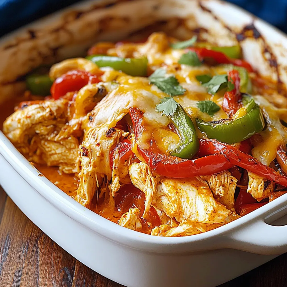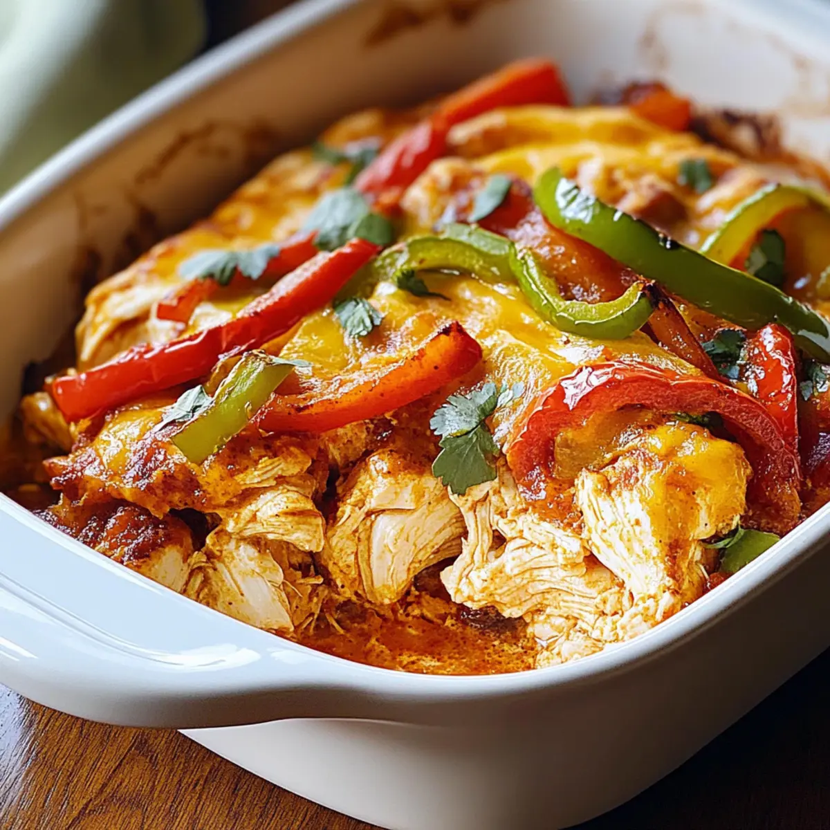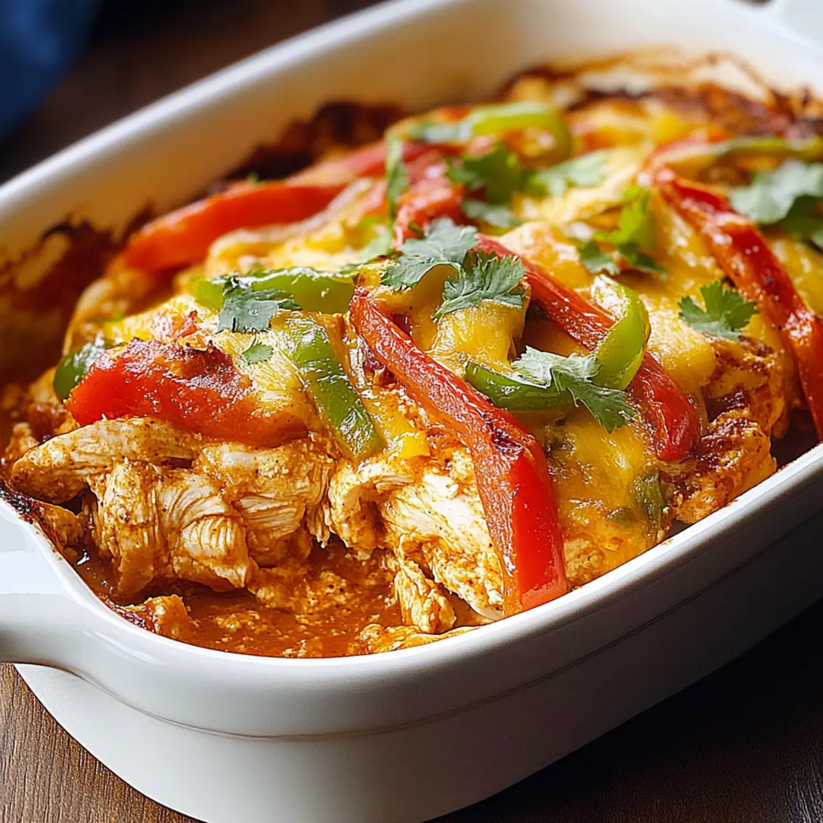 While rummaging through my pantry one evening, the bright colors of bell peppers and the enticing aroma of Tex-Mex spices whispered to me. It was time to whip up a comforting Fajita Chicken Casserole, a dish that marries tender chicken with a symphony of veggies and creamy cheese, perfect for cozy nights in or easy entertaining. This one-pan wonder not only fits beautifully into a low-carb lifestyle but also makes meal prep a breeze. With just a few simple ingredients and a quick bake, you’ll have a hearty meal ready to impress family or serve as leftovers that pack a flavorful punch. Are you ready to dive into this delightful casserole with me? Why Is Fajita Chicken Casserole a Must-Try? One-Pan Wonder: This casserole simplifies your cooking by combining everything in one pan, saving you time on both cooking and cleanup. Vibrant Flavors: Each bite bursts with Tex-Mex spices, creating a mouthwatering experience that will leave everyone asking for seconds. Customizable Ingredients: Make it your own! Swap chicken for ground turkey or even grill up some tofu to cater to different tastes. Keto-Friendly Delight: Packed with lean protein and colorful veggies, it’s a fantastic low-carb option that doesn’t skimp on flavor. Quick & Easy Prep: With minimal prep time and a straightforward baking process, this dish is perfect for busy weeknights or meal prepping. If you’re looking for other delicious options, try out my Tzatziki Chicken Veggie Naan Pizza or for a family favorite, check out my Buffalo Chicken Tacos. Enjoy the journey to your next favorite meal! Fajita Chicken Casserole Ingredients For the Casserole • Chicken Breasts (2 large) – The main protein source; you can save time by using shredded rotisserie chicken. • Red, Yellow, Green Bell Peppers (1 each) – These colorful veggies not only add crunch but are also rich in vitamin C; feel free to swap them for zucchini or other bell pepper colors. • Red Onion (1 small) – Enhances the flavor with sweetness; yellow onion can be a good substitute for a different taste. • Garlic (2 cloves, minced) – Adds an aromatic flavor; garlic powder is a quick alternative if you’re in a pinch. • Sour Cream (1/2 cup) – Adds creaminess; Greek yogurt can be a healthier option for a similar taste. • Cream Cheese (4 oz, softened) – Provides richness and texture; use reduced-fat cream cheese for a lighter version. • Cheddar Cheese (1 cup, shredded) – Provides a sharp flavor and good melting quality; consider Monterey Jack or Pepper Jack for an extra kick. • Mozzarella Cheese (1 cup, shredded) – Adds stretchiness; substitutes can include a blend of your favorite melting cheeses. • Olive Oil (2 tablespoons) – Used for sautéing; avocado oil can offer a different flavor profile. • Chili Powder (1 teaspoon) – Adds warmth to the dish; you can swap it with taco seasoning for a convenient spice blend. • Cumin (1 teaspoon) – Gives an earthy flavor; coriander is a great substitute if you prefer. • Paprika (1/2 teaspoon) – Enhances depth of flavor; smoked paprika can add a delightful smoky touch. • Salt (1/2 teaspoon) & Black Pepper (1/2 teaspoon) – Essential for enhancing overall flavor; adjust according to your taste. • Fresh Cilantro (for garnish) – Adds a refreshing touch; omit if you’re not a fan. • Lime Wedges (for serving) – Brightens flavors beautifully; while optional, they are highly recommended. Embark on your cooking adventure with this flavorful Fajita Chicken Casserole, bringing warmth and comfort to your table! Step‑by‑Step Instructions for Fajita Chicken Casserole Step 1: Preheat the Oven Begin your culinary adventure by preheating your oven to 375°F (190°C). This is a crucial step for ensuring your Fajita Chicken Casserole bakes evenly and achieves that heavenly golden crust. Set aside a 9×13-inch casserole dish for later use, ready to hold all those delicious layers. Step 2: Sauté the Chicken In a large skillet over medium heat, pour in the olive oil and let it warm for a moment. Add the chicken breasts, seasoned with chili powder, cumin, paprika, salt, and pepper. Sauté for about 5-6 minutes, stirring occasionally, until the chicken is beautifully browned and cooked through. Remove the skillet from heat and let it cool slightly. Step 3: Prepare the Creamy Mixture In a large mixing bowl, combine the sour cream, softened cream cheese, and half of the shredded cheddar and mozzarella cheeses. Use a spatula or whisk to mix until the mixture is smooth and creamy, creating a luscious base for your Fajita Chicken Casserole. This step adds richness and flavor to your dish. Step 4: Combine the Ingredients Now, gently fold in the sautéed chicken, sliced bell peppers, onion, and minced garlic into the creamy mixture. Ensure every piece of chicken and vegetable is well-coated, creating a delightful combination of flavors and textures that will come together beautifully as it bakes. Step 5: Transfer to Casserole Dish Carefully transfer the chicken and vegetable mixture into the greased casserole dish. Spread it evenly to ensure that every bite is filled with the vibrant flavors of the Fajita Chicken Casserole. Pat it down a bit to compact the filling and make room for the cheesy topping. Step 6: Add More Cheese Top the casserole with the remaining shredded cheddar and mozzarella cheeses. This will create a deliciously gooey topping that complements the savory flavors beneath. Make sure to cover the mixture well with the cheese, ensuring that it melts beautifully during baking. Step 7: Bake Until Golden Place the casserole in the preheated oven and bake uncovered for 20-25 minutes. Keep an eye on it as it bakes; you’re looking for a bubbling, hot center and a beautifully golden, crispy cheese topping. The aroma will start to fill your kitchen, tempting everyone nearby! Step 8: Garnish and Serve Once baked, remove the casserole from the oven and let it cool for a few minutes. Sprinkle fre
