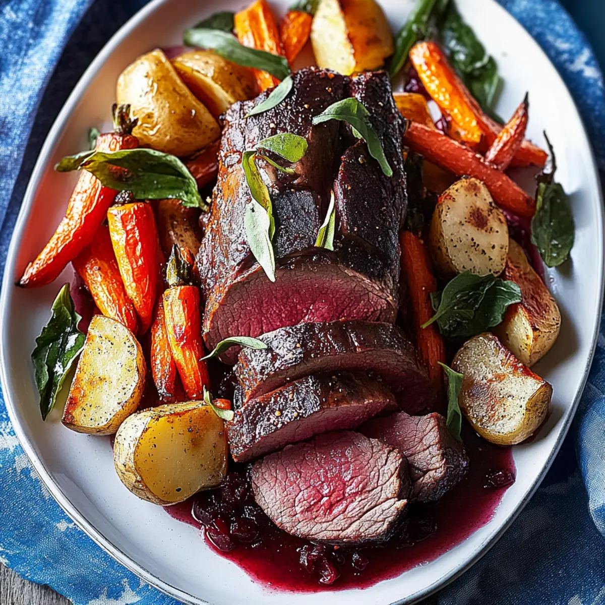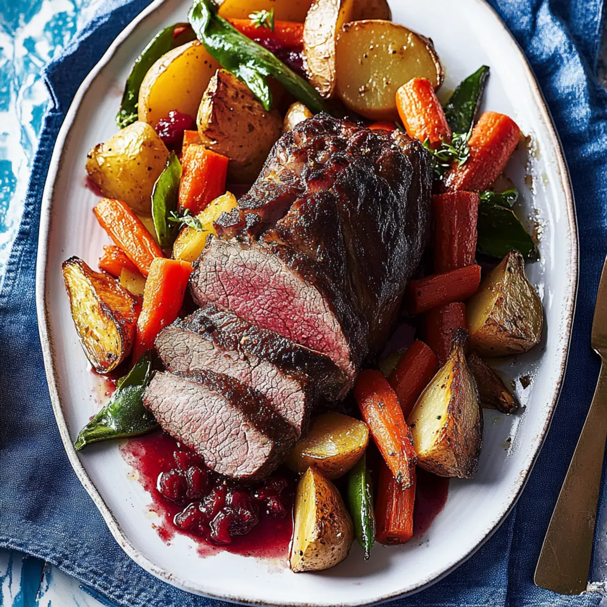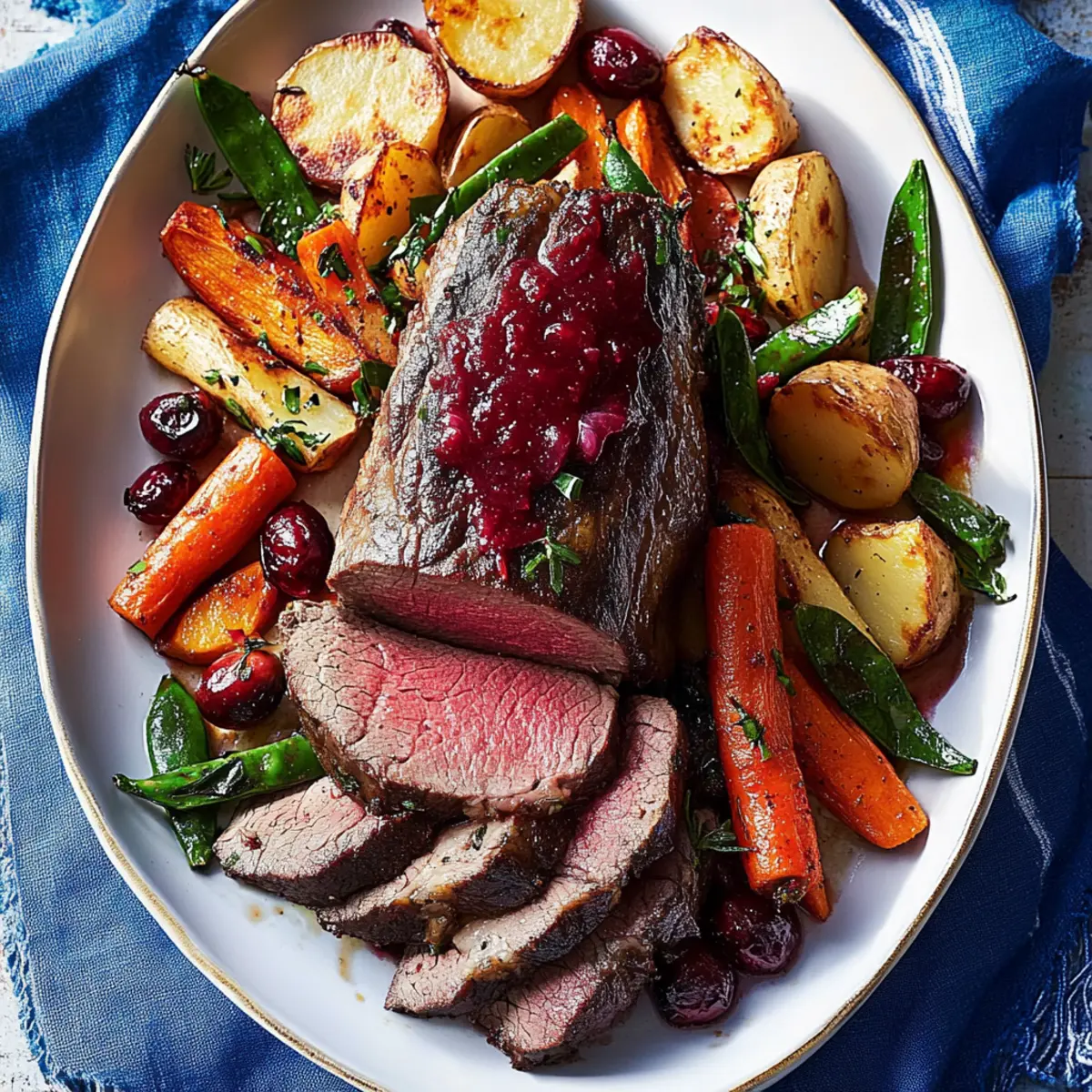 The aroma of slow-roasted beef wafting through your kitchen can transport you to the heart of a cozy holiday gathering, even in the middle of summer. I’m thrilled to share my recipe for a Classic Beef Roast with Cranberry Sauce and Baked Veggies—a showstopper for any dinner table that beautifully combines savory flavors with vibrant sides. This family beef roast is not only impressive but also surprisingly easy to prepare, making it perfect for a quick weeknight meal or a special occasion. The tender beef, enriched with tangy cranberry sauce, paired with perfectly baked vegetables offers a delightful balance that everyone will love. So, are you ready to elevate your dinner game and indulge in this festive dish any time of the year? Why is this roast a culinary delight? Savory Sensation: The combination of tender beef and rich gravy creates a mouthwatering experience that will have everyone coming back for seconds. Festive Flavors: Infused with tangy cranberry sauce, this roast adds a delightful twist to your regular dinner routine. Easy Preparation: With straightforward steps, even novice cooks can create an impressive meal, freeing you up to enjoy quality time with family. Versatile Veggies: Accompanied by baked vegetables, you can mix and match seasonal produce, ensuring freshness and color on your plate. Crowd-Pleasing Appeal: Whether it’s a special occasion or a cozy family dinner, this beef roast is sure to impress your guests and ignite joy at the table. If you enjoy hearty beef dishes, you might also love the flavors in my Cheesy Rotel Beef Dip or the simplicity of Savory Ground Beef. Family Beef Roast Ingredients For the Roast • Beef fillet (1.6 kg) – Choose tender cuts like eye fillet for optimal flavor and juiciness. • Sea-salt flakes and black pepper – Essential seasonings; always season just before cooking to maintain tenderness. • Extra virgin olive oil (¼ cup) – Great for searing and roasting, adding healthy fats and flavor. For the Vegetables • Carrots (4) – Adds natural sweetness and texture; substitute with sweet potatoes for a unique twist. • Parsnips (4) – Offers an earthy flavor; can be replaced with turnips if preferred. • Medium potatoes (4) – Provide hearty starch; Yukon Gold is a fantastic option for creaminess. • Red capsicum (2) – Contributes sweetness and color; swap for any bell pepper variety you like. • Garlic (8 cloves, crushed) – Delivers aromatic flavor; adjust quantity based on your taste. • Thyme leaves (½ bunch) – Fresh herb for flavor; rosemary can also complement beautifully. For the Sauce • Cranberry sauce (½ cup) – Adds a zesty sweetness; homemade or store-bought both work wonderfully. • Juice of limes (2) – Provides acidity, balancing flavors in the dish; lemons can work as a substitute. • Ready-to-use gravy (2 cups) – A base sauce perfect for richness; homemade gravy can enhance the overall flavor. • Port (½ cup) – Infuses depth into the gravy; sherry is a good alternative if needed. • Smoky barbecue sauce (2 Tbsp) – Adds a touch of sweetness and smokiness; optional depending on your preference. • Mixed spice (½ tsp) – Elevates flavor complexity; consider cinnamon for warmth. For the Greens • Baby spinach leaves (2 cups) – Adds a fresh element to the vegetable mix; can be swapped with kale for variety. Step‑by‑Step Instructions for Savory Family Beef Roast with Festive Veggies and Gravy Step 1: Preheat and Prepare Begin by preheating your oven to 200°C fan-forced (220°C conventional). While the oven heats up, take the beef fillet and season it generously with sea-salt flakes and black pepper on all sides. Drizzle with extra virgin olive oil to enhance flavor and moisture, making sure the seasoning clings well to the meat. Step 2: Sear the Beef In a large frying pan, heat a tablespoon of olive oil over medium-high heat until shimmering. Carefully place the seasoned beef fillet in the pan and sear it for about 3-4 minutes on each side until a rich brown crust forms. This step locks in juices and flavor, giving your family beef roast a delicious exterior. Step 3: Roast the Beef Once seared, transfer the beef fillet to a roasting pan and place it in the preheated oven. Roast for 35-40 minutes, or until the internal temperature reaches about 60°C for medium-rare. Remember, it should have a nice golden crust but remain juicy inside; keep an eye on it as you approach the cooking time. Step 4: Prepare the Vegetables While the beef roasts, wash and cut the carrots, parsnips, medium potatoes, and red capsicum into even wedges. In a large bowl, toss the chopped veggies with crushed garlic, thyme, and a drizzle of olive oil. Spread them evenly on a separate baking sheet and roast for the last 40 minutes, until golden and tender, stirring halfway through for even cooking. Step 5: Make the Cranberry Sauce Glaze In a small saucepan, combine the cranberry sauce and juice of two limes. Heat over medium-low, melting the sauce until smooth and warmed through, about 5-7 minutes. As the beef roasts, baste it with the warm cranberry glaze in the last 10 minutes of cooking for added flavor and a beautiful sheen. Step 6: Prepare the Gravy In another saucepan, mix the ready-to-use gravy, port, smoky barbecue sauce, and mixed spice. Cook over low heat, stirring occasionally, until the mixture thickens slightly, about 5-10 minutes. This savory gravy will perfectly complement the flavors of your beef roast and baked veggies. Step 7: Combine and Serve Once everything is cooked to perfection, remove the beef from the oven and let it rest for 10 minutes. Meanwhile, combine the roasted vegetables with baby spinach in a serving bowl, allowing the warmth to wilt the greens slightly. Slice the beef fillet and arrange it on a platter, drizzling with the prepared gravy and serving the vibrant veggie mix on the side for a delightful presentation. Expert Tips for Family Beef Roast • Room Temperature Be