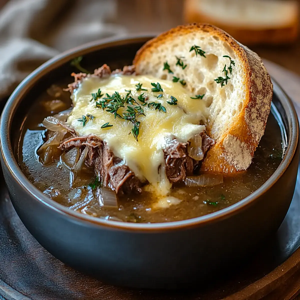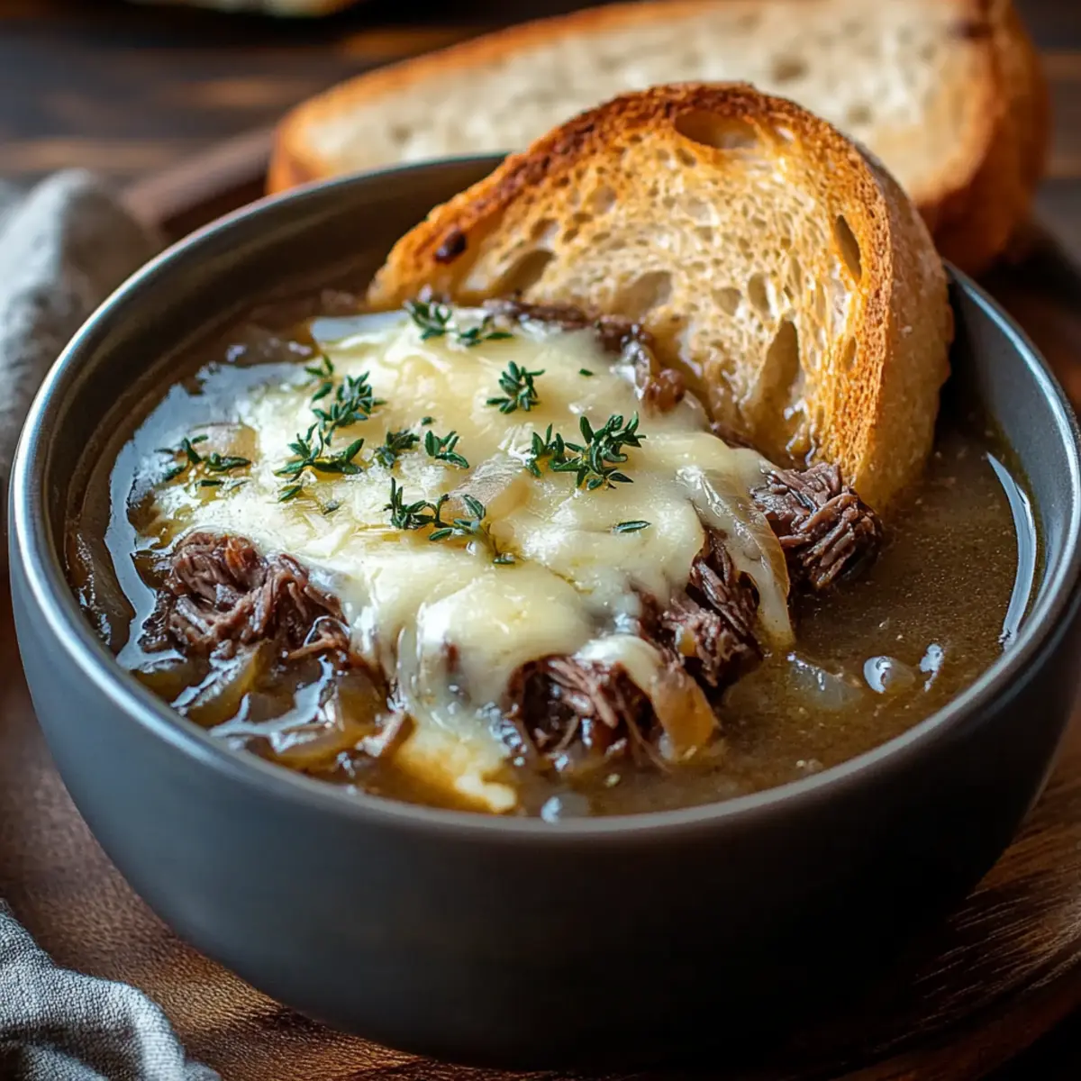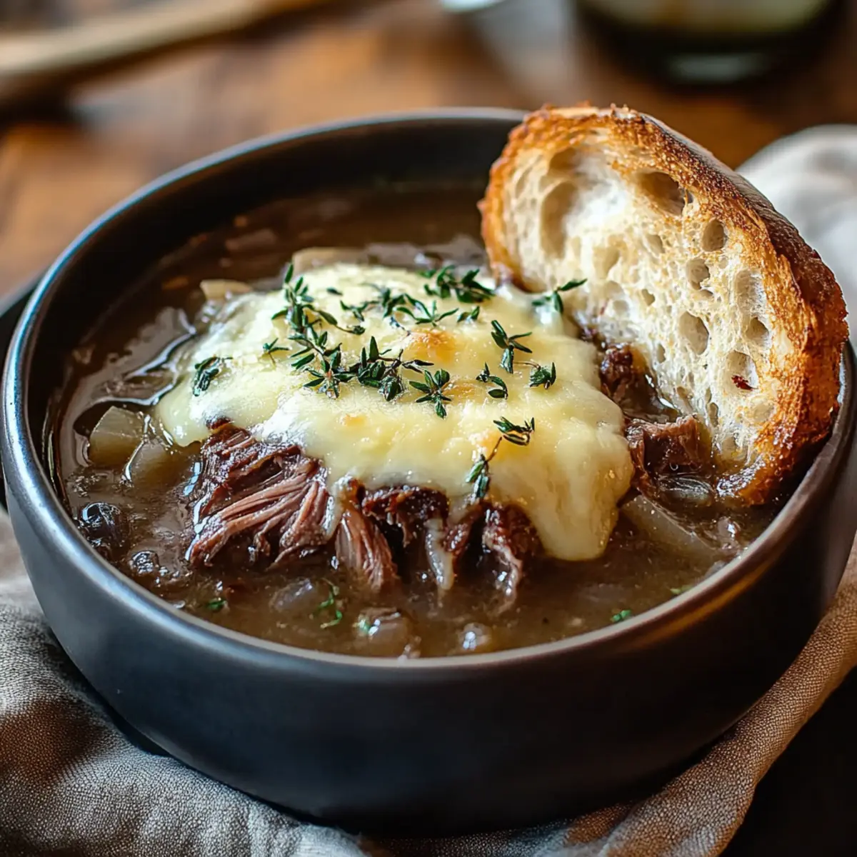 Slipping into a warm, hearty bowl of French Onion Short Rib Soup with Gruyère Toast is like wrapping yourself in a cozy blanket on a chilly evening. With layers of sweet, caramelized onions and tender short ribs simmering in a rich, savory broth, this comforting dish is a delightful departure from the fast food hustle. Not only is it an impressive crowd-pleaser for gatherings but it also allows for a wonderful slow-cooking experience that fills your home with irresistible aromas. The crowning glory is the toasty, cheesy Gruyère topping, adding a satisfying crunch that elevates each bite. Curious about how to create this luxurious meal that warms both the body and soul? Let’s dive in! Why is This Soup a Must-Try? Unparalleled Comfort: This French Onion Short Rib Soup wraps you in warmth with its rich, savory broth and melt-in-your-mouth beef. Layered Flavors: The harmonious blend of caramelized onions, garlic, and thyme offers a depth that elevates each spoonful. Crowd-Pleasing Delight: Perfect for entertaining, it’s a guaranteed hit at dinner parties or cozy nights in. Easy Preparation: With simple ingredients, it requires minimal effort—perfect for busy schedules. Versatile Enjoyment: Enjoy it on its own or paired with a refreshing salad, and if you’re looking for more comforting flavors, why not try Hearty Longevity Soup? Make Ahead Friendly: This soup actually improves in flavor, making it ideal for meal prep or a delicious next-day lunch. French Onion Short Rib Soup Ingredients • Discover the secret to a hearty, comforting French Onion Short Rib Soup with Gruyère Toast. For the Soup • Bone-in Beef Short Ribs – Adds richness and depth to the broth; substitute with boneless short ribs if preferred. • Olive Oil – Used for searing the short ribs; can substitute with vegetable oil. • Salt and Black Pepper – Essential for seasoning; adjust to taste. • Garlic Powder – Adds flavor; fresh garlic can be used as an alternative. • Dried Thyme – Enhances earthy flavor; fresh thyme can replace it. • Butter – Key for caramelizing onions; unsalted butter is preferred for better control over seasoning. • Yellow Onions – The main flavor source; yellow onions are traditional, but sweet onions can work too. • Garlic Cloves – Provides aromatic depth; fresh garlic is preferred. • Sugar – Aids in caramelization of onions; brown sugar can also be used for added flavor. • All-Purpose Flour – Slightly thickens the soup; can be omitted for gluten-free diets. • Beef Broth – The flavorful base; low-sodium broth can be used for a less salty soup. • Worcestershire Sauce – Adds umami; soy sauce can be a substitute for a distinct flavor profile. • Bay Leaf – Infuses aromatic depth to the broth; remember to remove before serving. For the Gruyère Toast • Baguette – Perfect for making Gruyère toast; any crusty bread can be used. • Gruyère Cheese – Provides a melty, cheesy topping; Swiss or mozzarella are suitable substitutes. Step‑by‑Step Instructions for French Onion Short Rib Soup with Gruyère Toast Step 1: Sear Short Ribs In a large pot, heat 2 tablespoons of olive oil over medium-high heat. Season the bone-in beef short ribs with salt and black pepper, then add them to the hot pot. Sear the ribs for about 3-4 minutes on each side until they are golden brown. This step is essential for building a rich flavor base for your French Onion Short Rib Soup. Step 2: Caramelize Onions In the same pot, reduce heat to medium and add 3 tablespoons of unsalted butter. Once melted, add 4 sliced yellow onions and stir well to coat. Allow the onions to cook slowly, stirring occasionally, for about 25-30 minutes until they are deeply caramelized and golden brown, bringing out their natural sweetness. Step 3: Add Garlic and Flour Once the onions are perfectly caramelized, stir in 3 minced garlic cloves and a pinch of sugar. Cook for another 2-3 minutes until the garlic is fragrant. Next, add 2 tablespoons of all-purpose flour, stirring continuously for about a minute to cook out the raw flavor and thicken the soup slightly. Step 4: Build the Broth Pour in 6 cups of beef broth, scraping the bottom of the pot to release any browned bits. Add 1 tablespoon of Worcestershire sauce, 1 dried bay leaf, and a teaspoon of dried thyme. Bring the mixture to a gentle simmer, allowing all the flavors to meld together, which will take about 5-10 minutes. Step 5: Slow Cook Short Ribs Return the seared short ribs to the pot, ensuring they are submerged in the broth. Cover the pot and reduce heat to low, allowing the soup to simmer gently for 2-3 hours. This slow cooking process will make the beef tender and enhance the overall richness of the French Onion Short Rib Soup. Step 6: Adjust Seasoning After the short ribs have cooked to perfection, remove the bay leaf and taste the soup. Adjust the seasoning with additional salt and black pepper as desired. This step is crucial for ensuring your soup has the perfect balance of flavors before serving. Step 7: Prepare Gruyère Toast While the soup is simmering, preheat your broiler. Slice a baguette into thick pieces and lay them on a baking sheet. Top each slice with a generous portion of grated Gruyère cheese and a little melted butter. Broil for about 3-5 minutes, until the cheese is bubbly and golden, creating a delightful crunchy topping for the soup. Step 8: Serve Ladle the hearty French Onion Short Rib Soup into bowls, ensuring each serving has a piece of the tender short rib. Top with the crispy Gruyère toast for a delicious finish. Serve warm and enjoy the comforting flavors of this delightful soup that brings joy to any meal. How to Store and Freeze French Onion Short Rib Soup Fridge: Store your soup in an airtight container for up to 3 days. Make sure it’s cooled before refrigerating to maintain the best flavor. Freezer: For longer storage, freeze soup in a freezer-safe container for up to 3 months. Leave out the 