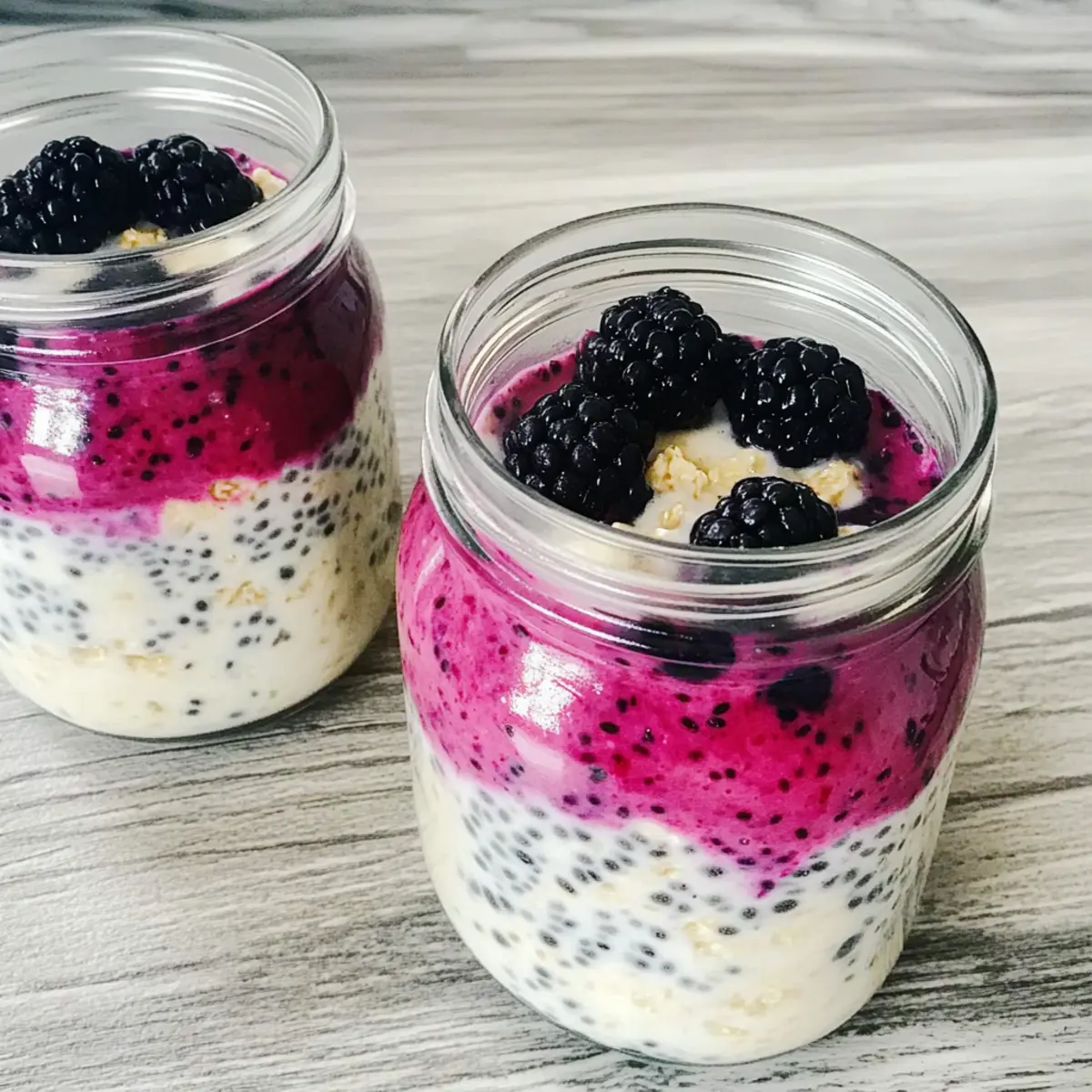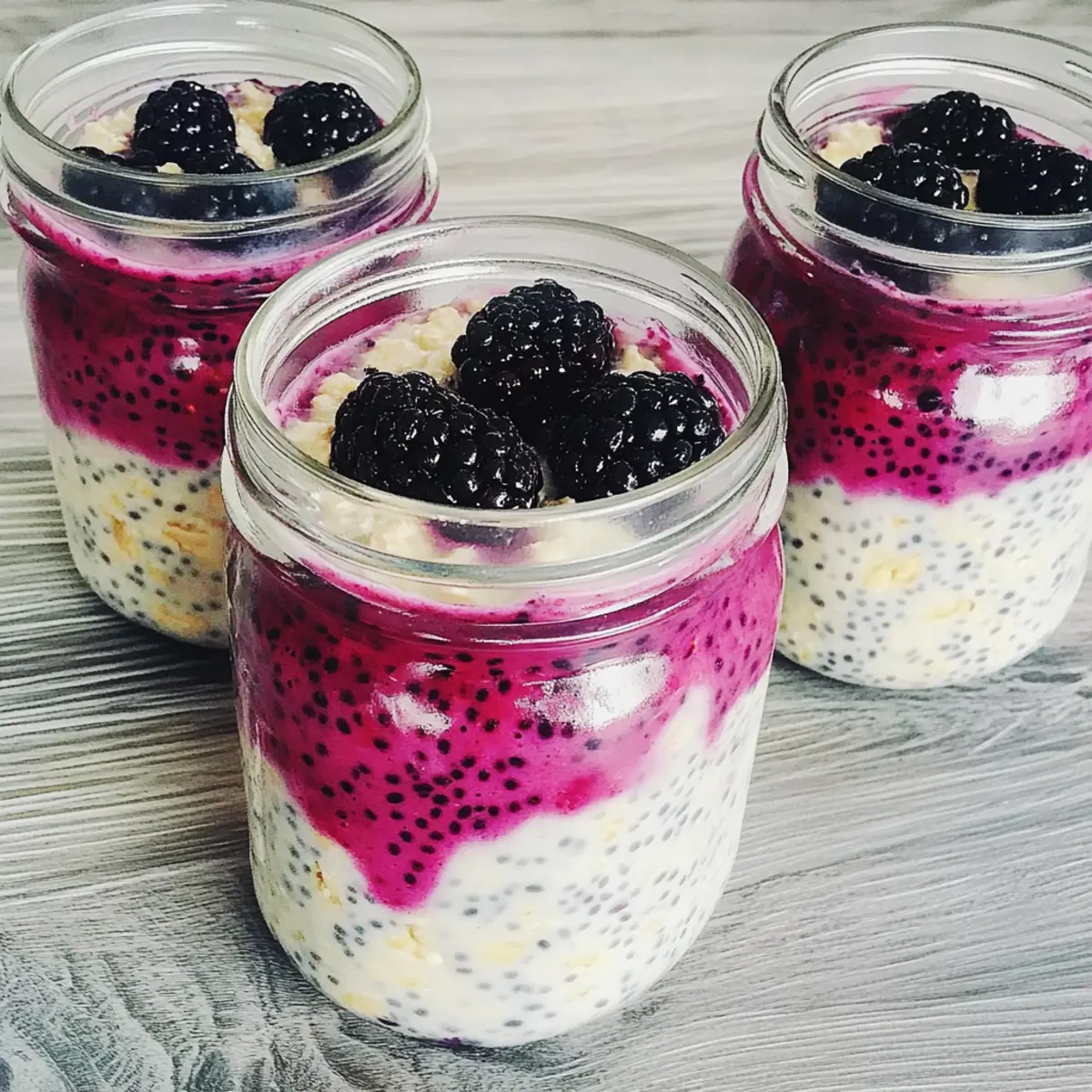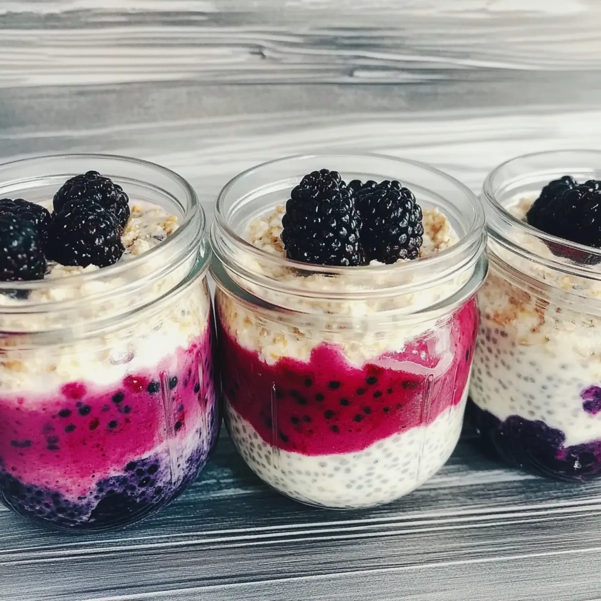 As the sun rises, the kitchen bubbles with anticipation. I often find myself pondering the perfect start to my day, and lately, it’s been all about Fresh Blackberry Protein Overnight Oats. This recipe is a delightful blend that not only fills me up but also keeps my energy soaring through the hectic mornings. The beauty of these oats lies in their effortless preparation—whip them up the night before, and you’re all set for a healthy breakfast or snack without any morning rush hassle. With every spoonful, you’ll enjoy a creamy, satisfying texture enhanced by chia seeds, and the naturally sweet burst of blackberries paired with protein powder. Trust me, these oats are not just nutritious; they truly feel like a treat. Curious about how to make this delightful breakfast? Let’s dive in! Why are Fresh Blackberry Oats a Game-Changer? Deliciously Creamy: Each spoonful offers a thick, velvety texture that makes breakfast feel indulgent without the guilt. Quick & Easy: Simply mix and chill overnight; perfect for busy mornings when time is of the essence. High in Protein: Packed with 26 grams of protein per serving, they fuel your day and keep you satisfied longer. Naturally Sweet: The burst of fresh blackberries adds delightful sweetness without any added sugars, making it a healthier option. Versatile Base: Feel free to mix in your favorite fruits or toppings, like nuts or granola, to customize your experience! Enjoy these Fresh Blackberry Protein Overnight Oats and discover why they make such a fantastic breakfast. Make sure to check out our recipe for a Strawberry Salad Refreshing to pair with your morning oats! Fresh Blackberry Protein Overnight Oats Ingredients • Get ready to whip up a deliciously healthy breakfast! For the Oats Blackberries – These provide natural sweetness and vibrant flavor; feel free to substitute with other berries for variety. Rolled Oats – They offer structure and hearty texture; quick-cooking oats can also be used for a different mouthfeel. Chia Seeds – These act as a thickener and are great sources of omega-3 fatty acids; you can swap them with flaxseeds if needed. Homemade Soy Milk – This serves as a creamy base liquid; substitute with any non-dairy milk for a personalized touch. Vanilla Protein Powder – It adds a boost of protein and a hint of sweetness; experiment with different plant-based protein powders if desired. Dive into the delight of making Fresh Blackberry Protein Overnight Oats—it’s a wholesome treat you won’t want to miss! Step‑by‑Step Instructions for Fresh Blackberry Protein Overnight Oats Step 1: Prepare Berry Mixture In a small saucepan, heat half of the blackberries over medium heat for about 5 minutes, stirring occasionally until they break down and form a slightly thickened puree. This mixture should become fragrant and vibrant in color. Once done, remove from heat and let it cool slightly before using it in your overnight oats. Step 2: Mix Dry Ingredients In a large mixing bowl, combine 1 cup of rolled oats, 2 tablespoons of chia seeds, and 1 scoop of vanilla protein powder. Stir these dry ingredients together until they are well mixed, ensuring an even distribution of the chia seeds and protein powder. This base will create the hearty structure for your Fresh Blackberry Protein Overnight Oats. Step 3: Combine Ingredients Gradually pour in 1 cup of homemade soy milk into the dry mixture, stirring continuously. Aim for a creamy consistency as you blend these together; this should take about 2 minutes. As the oats begin to absorb the liquid, they’ll loosen up, resulting in a smooth mixture that will set beautifully overnight. Step 4: Layering Grab your mason jars or a medium-sized container to layer your ingredients. Start by placing a few spoonfuls of the oat mixture in the bottom, then add a layer of the blackberry puree. Repeat this process, alternating layers until you fill your jars, finishing with the oat mixture on top for an appealing presentation. Step 5: Chill Top the jars with the reserved whole blackberries for an extra pop of color and freshness. Seal the jars with lids and place them in the refrigerator for at least 2 hours, but overnight is best. This chilling time allows the oats to thickly absorb the liquid, achieving a perfect texture that is ready for you to enjoy in the morning. What to Serve with Fresh Blackberry Protein Overnight Oats With a delicate balance of creamy oats and bursting blackberries, a delightful meal awaits to complement your morning routine! Crunchy Granola: Top your oats with a sprinkle of crunchy granola for added texture and a delightful crunch that contrasts beautifully with the creamy oats. Sweet Banana Slices: Fresh banana slices add a rich sweetness and creamy contrast, enhancing the overall flavor without overpowering the dish. Nut Butter Swirl: A dollop of almond or peanut butter brings a savory depth to the sweetness of the oats, creating a satisfying and hearty experience in each bite. Chilled Herbal Tea: A refreshing glass of chilled herbal tea pairs perfectly, cleansing your palate and balancing the richness of the oats while keeping your morning light. Fresh Berry Medley: A mix of blueberries and raspberries alongside the blackberries adds vibrant color and a variety of flavors, making each spoonful a fruity celebration. Coconut Yogurt: A spoonful of coconut yogurt brings a creamy tanginess and a hint of tropical flavor, enhancing the overall enjoyment without adding refined sugars. Almond Milk Latte: For coffee lovers, an almond milk latte serves as a comforting and energizing addition, offering a warm beverage that perfectly complements the sweet and creamy oats. Fresh Blackberry Protein Overnight Oats Variations Feel free to unleash your culinary creativity and customize your oats with these exciting twists! Berry Medley: Swap blackberries for a mix of strawberries, blueberries, and raspberries for a vibrant, fruity explosion. The combined flavors will tan