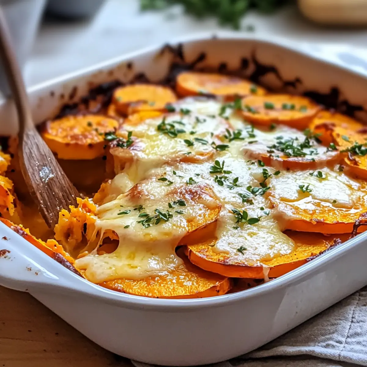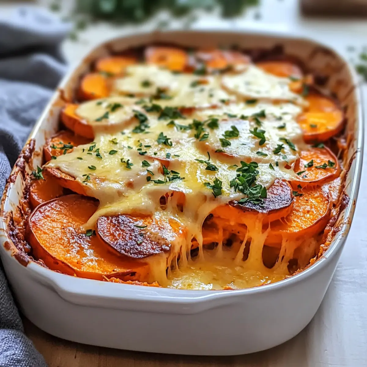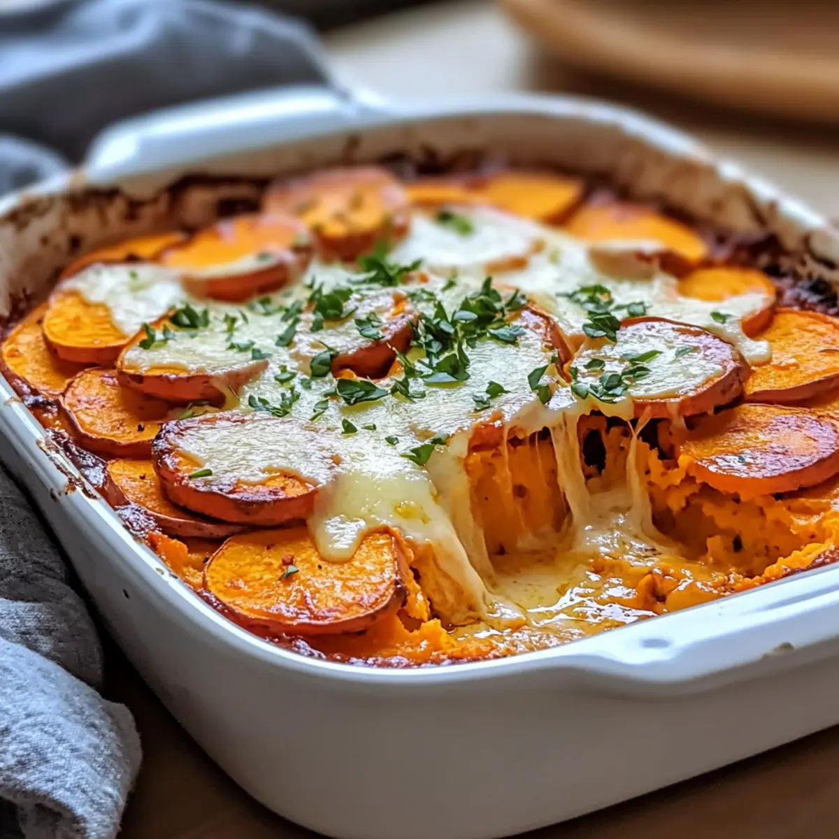 As the autumn leaves start to fall, I often find myself drawn to the warm, inviting aroma of comfort food wafting from the kitchen. Today, I’m thrilled to share my Homemade Garlic Butter Sweet Potato Bake—a dish that marries the natural sweetness of tender sweet potatoes with the rich allure of garlic butter. This recipe isn’t just about hearty indulgence; it’s also a make-ahead wonder, perfect for busy weeknights or delightful dinner gatherings. Each layer becomes a decadent canvas, topped with a golden cheese crust that calls out for seconds. Whether you’re a vegetarian or simply seeking a comforting side dish, this bake will not only satisfy your hunger but also warm your heart. Curious about how to create this buttery delight? Let’s dive in! Why is Garlic Butter Sweet Potato Bake irresistible? Comforting warmth fills your kitchen as you create this delightful bake, perfect for gathering friends and family. Customization is a breeze; swap herbs or cheeses to suit your taste! Make-ahead friendly, this dish can be prepared in advance, saving you time on busy weeknights. Flavorful garlic and creamy sweet potatoes unite for a melty, savory experience that mesmerizes your taste buds. Pair it with roasted chicken or grilled vegetables for a complete meal, or savor it solo as a heartwarming vegetarian delight. Garlic Butter Sweet Potato Bake Ingredients • Discover the essential components for a delightful dish! For the Sweet Potato Bake Sweet Potatoes – The star of the dish, bringing natural sweetness and nutrition; opt for orange-fleshed varieties for a vibrant flavor. Heavy Cream – Adds richness and creaminess to the bake; warm gently before using to prevent curdling. Unsalted Butter – Contributes buttery flavor and creaminess; can be replaced with olive oil for a dairy-free option. Garlic (Fresh) – Infuses the dish with aromatic flavor; freshly minced garlic yields the best taste. Fresh Thyme – Enhances the overall flavor with earthy notes; rosemary or sage can be used for a twist. Kosher Salt – Balances flavors; use to taste for enhancing the natural sweetness of the sweet potatoes. Freshly Cracked Black Pepper – Provides a hint of heat and depth; adjust according to personal preference. Parmesan Cheese – Melts beautifully on top for a savory finish; Gruyère makes a great alternative, or use nutritional yeast for a vegan option. To create the perfect Garlic Butter Sweet Potato Bake, gather these ingredients and let the magic begin! Step‑by‑Step Instructions for Garlic Butter Sweet Potato Bake Step 1: Preheat the Oven Begin by preheating your oven to 375°F (190°C). While waiting for the temperature to rise, take a 9×13-inch baking dish and generously grease it with butter or cooking spray. This ensures that your Garlic Butter Sweet Potato Bake will come out easily after baking and prevents sticking. Step 2: Prepare the Cream Sauce In a medium saucepan, gently heat the heavy cream over medium-low heat until it is warm but not boiling. Whisk in cornstarch until it’s dissolved, creating a smooth sauce. Add the butter, minced garlic, thyme, salt, and pepper, stirring until the butter melts and the mixture is well combined, bringing fragrant aromas into your kitchen. Step 3: Arrange Sweet Potatoes Next, meticulously slice your sweet potatoes into uniform 1/8-inch thick slices; this allows for even cooking. Layer them artfully in the greased baking dish, creating a beautiful pattern that showcases the vibrant orange flesh. Ensure all slices are tightly packed for a cohesive Garlic Butter Sweet Potato Bake. Step 4: Combine and Bake Once the sweet potatoes are arranged, pour the warm cream sauce evenly over them, allowing the mixture to soak into the layers. Place the baking dish in the preheated oven and bake uncovered for 30 minutes. The sweet potatoes should be tender and appear lightly golden around the edges. Step 5: Add Cheese and Finish Baking After the initial baking time, carefully sprinkle the freshly grated Parmesan cheese evenly over the top of the sweet potato layers. Return the dish to the oven for an additional 10 minutes until the cheese is melted and bubbly. You’re looking for a glorious, golden crust that will entice everyone at the dining table. Step 6: Optional Broiling for Crispiness For an extra touch of crispiness, switch to the broiler setting and broil for 1-2 minutes, keeping a close eye on it to prevent burning. This step adds a delightful crunch to the top of your Garlic Butter Sweet Potato Bake, enhancing its texture as it comes out of the oven looking irresistible. Step 7: Rest Before Serving Finally, let the bake rest for about 10 minutes before diving in. This allows the flavors to meld together and the dish to set slightly, making it easier to serve. As you wait, your kitchen will be filled with the joyfully rich aroma of your Garlic Butter Sweet Potato Bake, inviting everyone to the table. What to Serve with Homemade Garlic Butter Sweet Potato Bake As you prepare to savor this comforting dish, let’s explore delicious pairings that create a well-rounded meal experience. Roasted Chicken: This savory protein complements the sweet notes of the bake, perfect for a cozy dinner gathering. Grilled Vegetables: Fire-roasted veggies add a smoky flavor and vibrant color, enhancing the meal’s visual appeal and freshness. Fresh Green Salad: A light salad with crisp greens balances the richness of the bake, making every bite feel invigorating. Cranberry Sauce: The tartness of cranberry sauce creates a delightful contrast, especially during the holidays. Garlic Bread: An indulgent side that echoes the garlic goodness in the bake. It’s warm, crispy, and adds a satisfying crunch. Herbed Quinoa: A light yet filling side dish, bursting with flavors that won’t overpower the sweet potatoes while adding nutritious grains. White Wine: A chilled glass of Sauvignon Blanc complements the creamy richness of the bake, making it a perfect pair