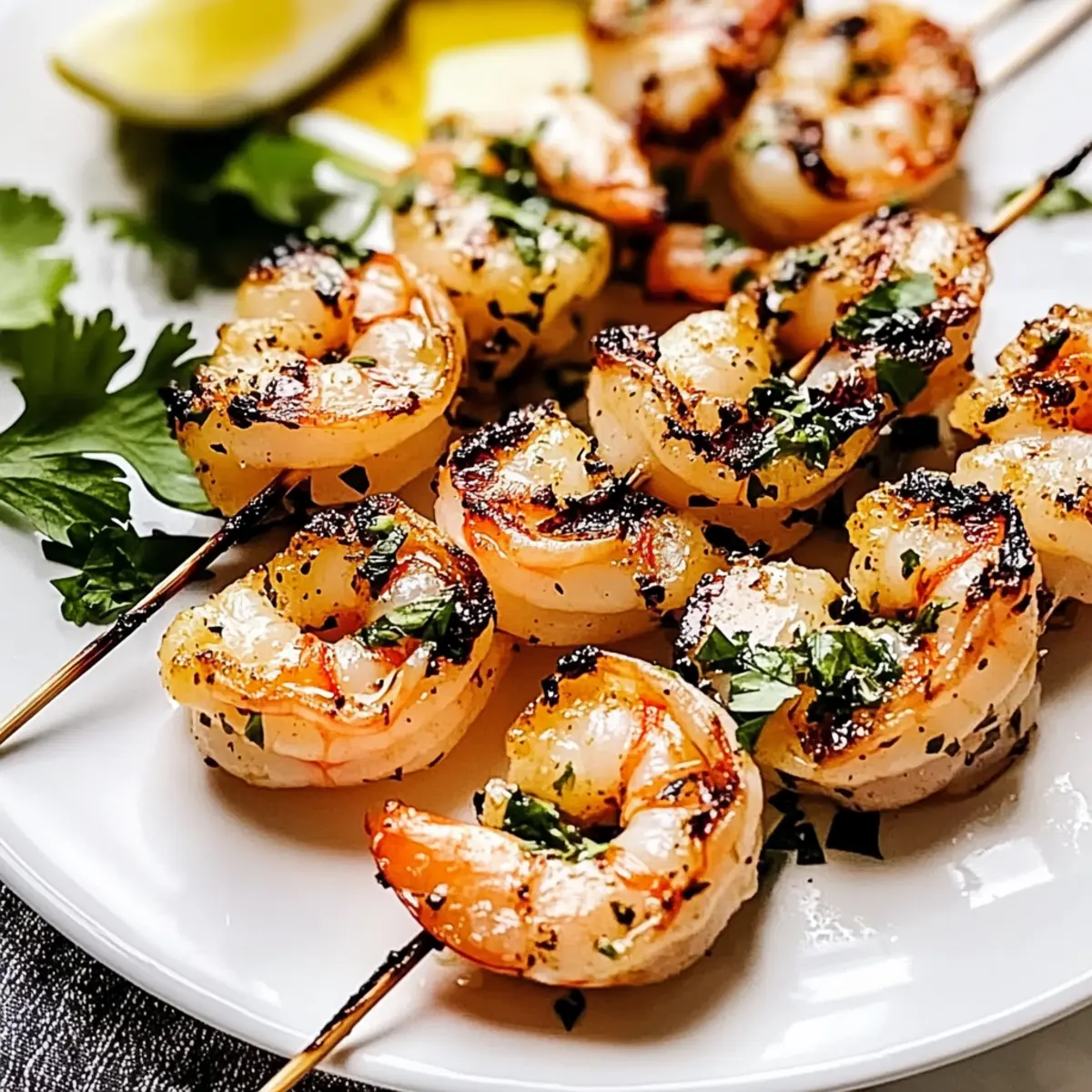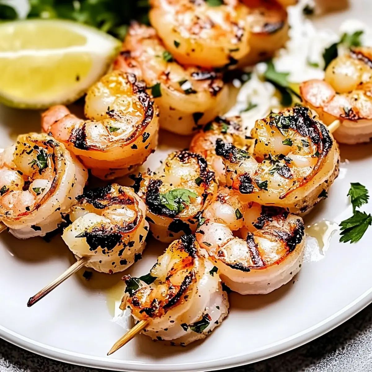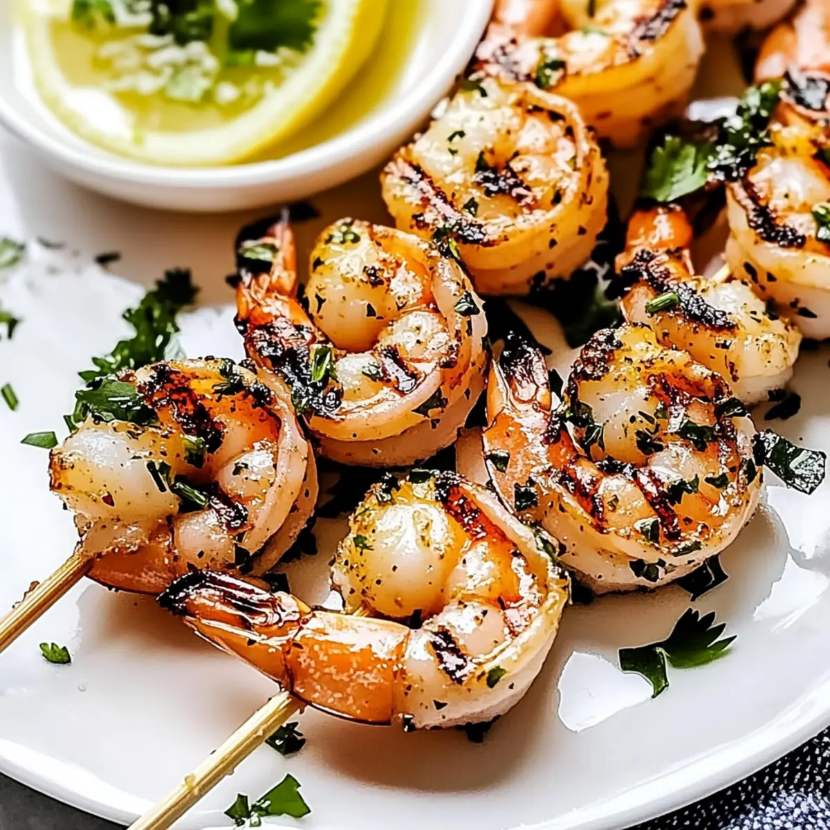The sizzle of shrimp hitting a hot grill is music to my ears, instantly transporting me to warm summer evenings filled with laughter and good food. Today, I’m excited to share my recipe for Garlic Grilled Shrimp Skewers, a delightful seafood dish that brings the flavors of the Mediterranean right to your backyard. These skewers are not only quick to whip up but also high in protein and low in calories, making them a perfect choice for health-conscious food lovers. The combination of fresh herbs and garlic elevates the shrimp, creating a delightful dish that pleases the palate. Plus, you can easily customize them with spicy twists or colorful veggies, ensuring everyone at your table has something to enjoy. So, are you ready to fire up the grill and impress your family and friends with this irresistible recipe? Why Are Garlic Grilled Shrimp Skewers a Must-Try? Irresistible Taste: The succulent shrimp infused with fragrant garlic and fresh herbs create a symphony of flavors that is simply unforgettable. Quick Preparation: With just a few steps, you can have dinner on the table in no time, perfect for those busy weeknights. High Protein, Low Calorie: These skewers pack a nutritious punch, making them a guilt-free meal option for health enthusiasts. Customization Galore: Whether you like it spicy with some cayenne or colorful with added veggies like zucchini, these skewers can be tailored to suit everyone’s tastes. Perfect for Any Occasion: From casual weeknight dinners to festive barbecues, these garlic grilled shrimp skewers will wow your guests every time. If you’re looking for more delicious seafood options, check out my recipe for Garlic Butter Steak where you’ll find flavor inspirations that will keep your taste buds dancing! Garlic Grilled Shrimp Skewers Ingredients Get ready for grilling magic with these essential ingredients! For the Skewers • Large Shrimp – A lean protein source; use jumbo for the best results, ensuring they are peeled and deveined. • Olive Oil – Adds richness and aids in marinating; can substitute with avocado oil if desired. • Fresh Cilantro – Brings a fresh, herbaceous flavor; parsley can be used as a delightful alternative. • Fresh Parsley – Adds brightness to the dish; consider replacing it with more cilantro or herbs like dill. • Garlic – The heart of the flavor; always opt for fresh minced garlic for maximum taste. • Lemon Juice – Infuses acidity and brightness; lime juice works well too as a substitute. • Salt – Essential for enhancing flavor; choose low-sodium options if you prefer. • Black Pepper – Provides mild heat; adjust according to your taste preferences. • Cayenne Pepper – Offers an optional spicy kick; you can reduce or omit it if you like it milder. With these ingredients in hand, you’re just a few steps away from creating mouthwatering Garlic Grilled Shrimp Skewers that are perfect for any gathering! Step‑by‑Step Instructions for Garlic Grilled Shrimp Skewers Step 1: Prepare Marinade In a medium bowl, whisk together the olive oil, fresh lemon juice, minced garlic, chopped cilantro, and parsley. Season with salt, black pepper, and a pinch of cayenne pepper if you like some heat. Mix until all ingredients are well combined and the marinade is fragrant, setting the stage for the flavorful Garlic Grilled Shrimp Skewers. Step 2: Marinate Shrimp Add the cleaned and deveined large shrimp to the marinade, ensuring each piece is thoroughly coated. Cover the bowl with plastic wrap and refrigerate for at least 30 minutes; ideally, let them marinate for 1 hour. This allows the shrimp to absorb the wonderful garlic and herb flavors, enhancing their taste for the grilling process. Step 3: Assemble Skewers Once marinated, remove the shrimp from the fridge and thread them onto skewers. Make sure the shrimp are snug but not overcrowded, allowing for even cooking. Depending on the size of your skewers, aim for about 5-7 shrimp each. This will create beautifully organized Garlic Grilled Shrimp Skewers ready to hit the grill. Step 4: Preheat the Grill Preheat your grill to medium-high heat, aiming for around 400°F (200°C). This step is crucial for achieving a perfect char on the shrimp while keeping them tender and juicy. Consider oiling the grill grates lightly to prevent sticking, ensuring your Garlic Grilled Shrimp Skewers come off easily and intact. Step 5: Grill Shrimp Place the skewers on the preheated grill and cook for 2-3 minutes per side. Watch closely as the shrimp turn pink and opaque, which indicates they are perfectly done. Avoid overcooking, as this can lead to tough shrimp. Once grilled, the Garlic Grilled Shrimp Skewers will have a lovely char that enhances their flavor. Step 6: Serve Remove the skewers from the grill and drizzle them with any reserved marinade that hasn’t touched raw shrimp. Serve warm with fresh lemon wedges, allowing everyone to squeeze some extra zing onto their Garlic Grilled Shrimp Skewers. Enjoy the delightful combination of flavors that will impress your family and friends! Expert Tips for Garlic Grilled Shrimp Skewers Fresh is Best: Always use fresh or fully thawed shrimp for optimal flavor and texture. Frozen shrimp should be completely thawed before marinating. Perfectly Prepped Grill: Preheat your grill to medium-high heat. This step is crucial for achieving that lovely char while keeping shrimp tender; avoid a cold grill! Avoid Overcrowding: Grill shrimp in batches if necessary. Overcrowding can lead to uneven cooking and rubbery results, ruining your Garlic Grilled Shrimp Skewers. Timing is Key: Keep a close eye on the shrimp while grilling. They typically need only 2-3 minutes per side; overcooking will result in tough, chewy shrimp. Let It Shine: Drizzle reserved marinade over the cooked skewers for an extra burst of flavor, ensuring it’s the portion that hasn’t touched raw shrimp. Make Ahead Options These Garlic Grilled Shrimp Skewers are perfect for meal pre