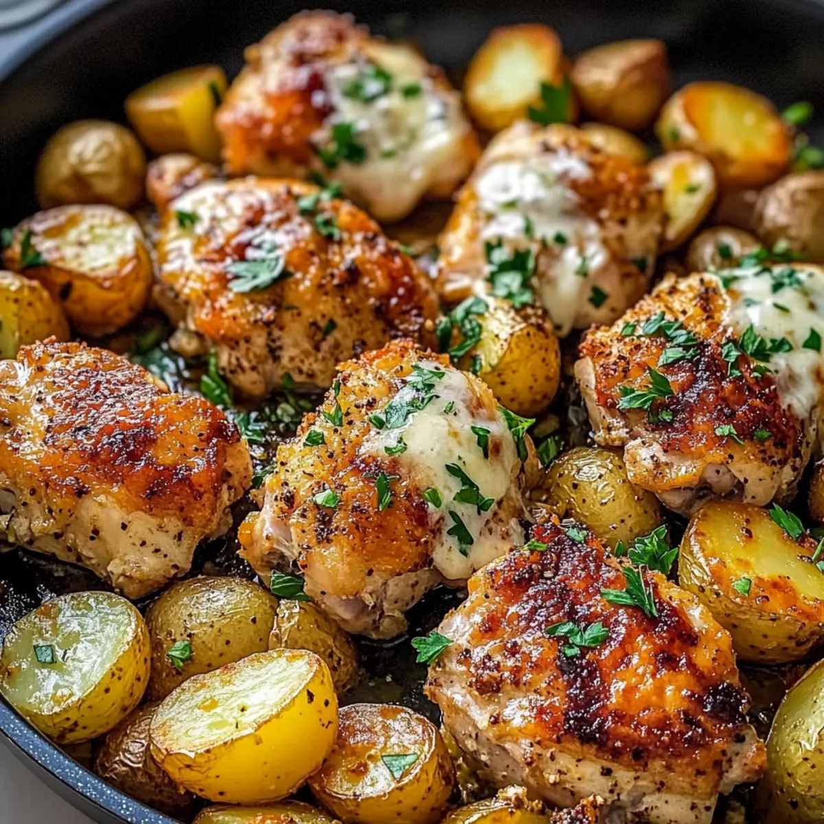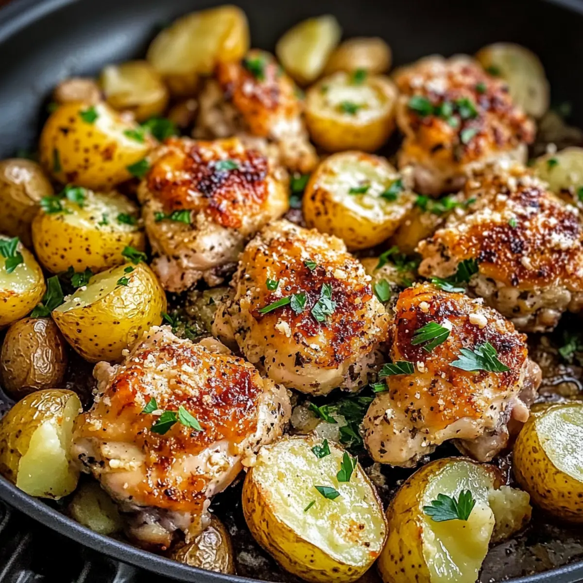 The sizzling sound of garlic hitting hot oil immediately transports me to cozy family dinners, where each dish tells a story. That’s exactly how I feel about this Garlic Parmesan Chicken and Potatoes recipe—it’s a delicious one-pan wonder that balances ease and flavor. In just 45 minutes, you can whip up a meal that looks as good as it tastes, making it perfect for busy weeknights or a relaxed gathering with friends. Not only is it family-friendly, but this customizable dish also allows you to switch ingredients with ease, ensuring everyone’s tastes are catered for. Imagine sitting down to tender chicken paired with crispy, golden potatoes drizzled in savory garlic and rich Parmesan—pure comfort on a plate! Ready to dive into this culinary delight and discover how it can brighten your dinner routine? Why is this Garlic Parmesan Chicken amazing? Ease of Preparation: You’ll love how quickly this dish comes together, making dinnertime a breeze—just 45 minutes! Flavor Explosion: The combination of rich garlic and savory Parmesan creates an irresistible aroma that fills your kitchen. Versatile Ingredients: Feel free to customize it by swapping out chicken or adding colorful veggies like bell peppers or broccoli for extra nutrition. One-Pan Wonder: Enjoy the minimal clean-up—everything cooks together beautifully, making this meal perfect for busy lifestyles. Family-Friendly: Whether it’s a casual night or a gathering with friends, this crowd-pleaser appeals to everyone’s taste buds. It’s like having your own Italian restaurant at home! For more delightful options, check out our Garlic Parmesan One for a pasta twist or Garlic Butter Steak for an elevated dinner! Garlic Parmesan Chicken and Potatoes Ingredients • Dive into the simple yet flavorful ingredients you’ll need for this hearty dish! For the Chicken Boneless Skinless Chicken Thighs or Breasts – Perfect for juicy, tender bites that absorb all the savory flavors. For the Potatoes Potatoes (Russet or Sweet) – Choose your favorite for a hearty texture; sweet potatoes add a delicious twist. For Flavor Garlic – Fresh cloves are ideal for that irresistible aroma and rich flavor infusion. Parmesan Cheese – Use freshly grated for maximum creaminess and umami flavor. Italian Seasoning – A mix of herbs that elevates the dish, or swap for fresh herbs like rosemary or thyme! For Cooking Olive Oil – Helps in roasting the chicken and potatoes to golden perfection. For Garnish Fresh Parsley – Adds a pop of color and freshness on top before serving. This Garlic Parmesan Chicken and Potatoes recipe is all about simple ingredients that deliver delicious results! Step‑by‑Step Instructions for Garlic Parmesan Chicken and Potatoes Step 1: Preheat the Oven Start by preheating your oven to 400°F (200°C). This step is crucial as it ensures your Garlic Parmesan Chicken and Potatoes cook evenly and develop that lovely golden color. While the oven heats up, gather your ingredients and prep your workspace to streamline the cooking process. Step 2: Prepare the Chicken Take your boneless skinless chicken thighs or breasts and place them in a mixing bowl. Season the chicken generously with minced garlic, grated Parmesan cheese, and Italian seasoning. Make sure to coat the chicken thoroughly, allowing the flavors to marry beautifully. Let this rest while you prepare the potatoes to enhance the flavor. Step 3: Chop and Season the Potatoes Next, wash and chop your choice of potatoes into bite-sized pieces, ensuring they are uniform for even cooking. Place the chopped potatoes in a separate bowl and drizzle with olive oil, salt, and pepper. Toss them well until each piece is evenly coated, then set aside to mingle with the seasonings as you prep the baking sheet. Step 4: Arrange on Baking Sheet Line a large baking sheet with parchment paper or lightly grease it with olive oil. Now, spread the seasoned chicken and potatoes evenly across the sheet, ensuring they’re arranged in a single layer. This spacing allows for proper roasting, promoting that desired crispiness on the edges while the chicken remains juicy. Step 5: Bake to Perfection Slide the baking sheet into your preheated oven and bake for approximately 30 minutes. Keep an eye on the chicken and potatoes: they’re done when the chicken reaches an internal temperature of 165°F (74°C), and the potatoes turn a beautiful golden brown. This step will fill your kitchen with mouthwatering aromas. Step 6: Garnish and Serve Once cooked, carefully remove the baking sheet from the oven. Let it cool for a minute before garnishing with freshly chopped parsley for a vibrant finish. Serve your Garlic Parmesan Chicken and Potatoes hot for a comforting meal that’s as delectable as it is visually appealing. Enjoy every bite of this one-pan wonder! How to Store and Freeze Garlic Parmesan Chicken and Potatoes Fridge: Store leftover Garlic Parmesan Chicken and Potatoes in an airtight container for up to 3 days. This keeps the flavors intact while maintaining freshness. Freezer: For longer storage, freeze the dish in a sealed container for up to 3 months. Portioning it into smaller containers makes it easy to thaw. Reheating: To reheat, place the chicken and potatoes in a preheated oven at 350°F (175°C) for about 15-20 minutes. This method ensures everything stays crispy and delicious. Alternatively, use a microwave in short bursts until heated through. Expert Tips for Garlic Parmesan Chicken and Potatoes Even Arrangement: Make sure the chicken and potatoes are spread out in a single layer on the baking sheet. This ensures even cooking and prevents steaming, keeping everything crispy. Check Temperature: Avoid overcooking the chicken! Always check its internal temperature; it should reach 165°F (74°C). This helps you prevent dryness and keeps your chicken succulent. Flavor Boost: For an extra kick, consider adding red pepper flakes to the seasoning mix. It complements the Garlic Par