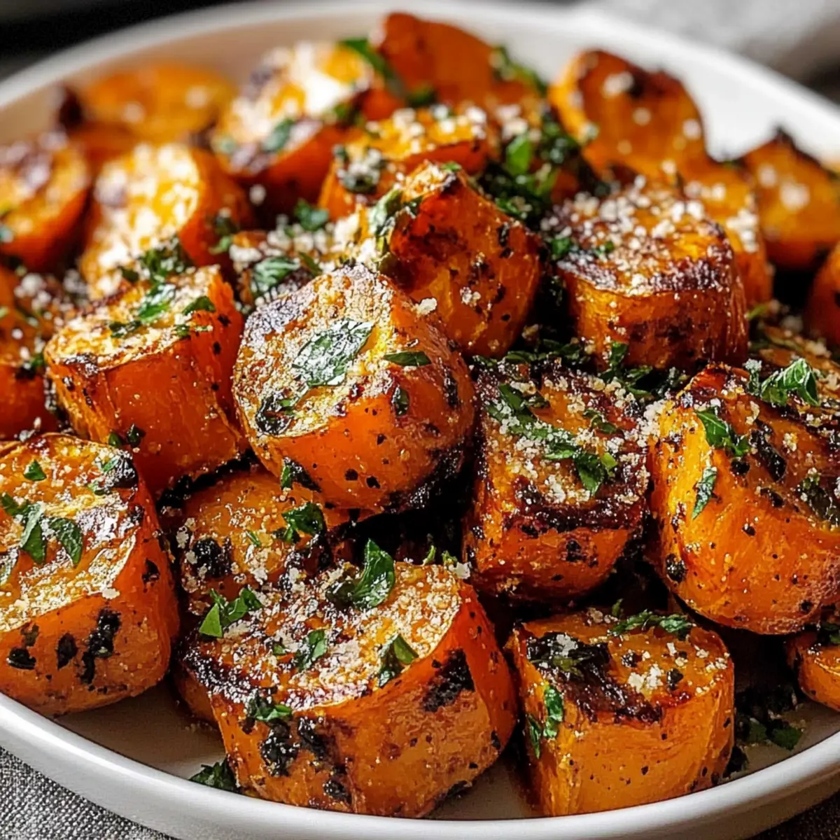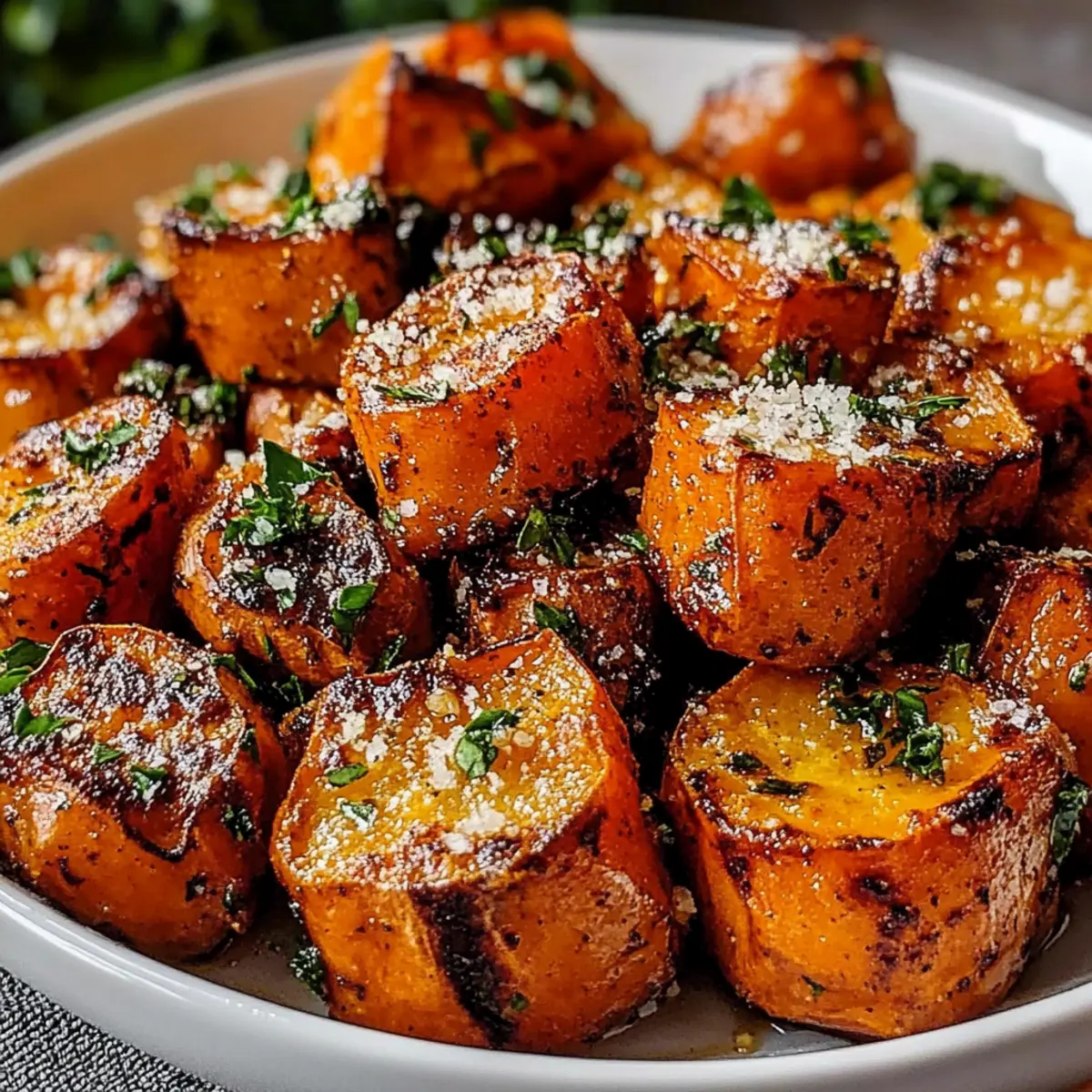 As I pulled the roasted sweet potatoes from the oven, the warm aroma of garlic mingled with the nutty scent of Parmesan, filling my kitchen with an inviting embrace. These Garlic Parmesan Roasted Sweet Potatoes are not just a side dish; they’re a quick and delightful way to elevate any meal. With sweet potatoes rich in nutrients and the savory goodness of cheese and garlic, this recipe strikes the perfect balance between indulgence and health. They are so versatile that you can easily adapt them for both special occasions and cozy weekday dinners. Plus, they’re a fantastic way to impress family and friends without spending hours in the kitchen! Curious to see how this simple dish can transform your dining experience? Let’s dive into the details! Why Are Garlic Parmesan Roasted Sweet Potatoes Amazing? Flavor Explosion: Each bite bursts with the irresistible combination of garlicky goodness and rich Parmesan, making these sweet potatoes anything but ordinary. Quick & Easy: You’ll appreciate how simple it is to prep and roast these beauties, fitting perfectly into busy weekday schedules or spontaneous gatherings. Nutrient-Rich: Packed with vitamins A and C, these potatoes not only taste delightful but also nourish your body—making them a conscious choice. Customizable: Feel free to spice them up with pepper flakes or swap in different herbs, ensuring each batch can feel fresh and unique. Crowd-Pleaser: Perfectly crispy on the outside and creamy inside, they are sure to be a hit, whether served alongside grilled chicken or as a standout vegetarian side. For more delicious options, check out the mouthwatering Garlic Parmesan Chicken or pair them with a robust Beef Sandwich Roasted Garlic Aioli for a meal that will impress! Garlic Parmesan Roasted Sweet Potatoes Ingredients • Get ready to elevate your meal with these delicious and nutrient-rich sweet potatoes! For the Sweet Potatoes Sweet Potatoes – The star of the dish, providing natural sweetness and creaminess. Substitute with butternut squash for a unique twist. Olive Oil – Essential for roasting; it ensures crispy edges while preventing sticking. You can swap it with melted coconut oil for a hint of tropical flavor. For the Garlic Parmesan Coating Garlic – Adds an aromatic depth; feel free to adjust based on your garlic love! Parmesan Cheese – Offers a salty, nutty flavor that pairs perfectly with sweet potatoes. For a vegan option, use nutritional yeast or vegan Parmesan. Italian Seasoning – A flavorful blend that takes this dish to the next level; use dried herbs like oregano, basil, and thyme if needed. Salt & Black Pepper – Key seasonings; adjust to your taste to elevate the flavors. For Garnish Chopped Fresh Parsley – Adds a fresh touch and color; substitute with chives if you prefer something milder. Melted Butter (optional) – Increases richness; try vegan butter for a dairy-free alternative. Elevate your dining experience with these Garlic Parmesan Roasted Sweet Potatoes—they’re bound to impress! Step‑by‑Step Instructions for Garlic Parmesan Roasted Sweet Potatoes Step 1: Prepare Sweet Potatoes Start by washing and peeling 2-3 medium sweet potatoes. Cut them into uniform 1-inch cubes to ensure even cooking. A sharp knife and cutting board will make this process safer and quicker. Once chopped, set the sweet potatoes aside in a large bowl, ready for seasoning. Step 2: Make Garlic Parmesan Coating In a separate mixing bowl, combine minced garlic, grated Parmesan cheese, Italian seasoning, salt, and black pepper. Stir the mixture well until everything is evenly blended. This garlic Parmesan coating is essential for flavoring the sweet potatoes, so make sure it’s aromatic and fragrant. Step 3: Coat Sweet Potatoes Drizzle 2 tablespoons of olive oil over the cubed sweet potatoes in the bowl. Sprinkle on the garlic Parmesan mixture, then toss everything together until the sweet potatoes are fully coated. The oil will help the coating adhere and create a lovely crispiness once roasted, so ensure all pieces are evenly covered. Step 4: Preheat Oven Preheat your oven to 400°F (200°C). This high temperature is crucial for achieving that perfect caramelization on your Garlic Parmesan Roasted Sweet Potatoes. While the oven heats up, prepare a baking sheet by lining it with parchment paper for easy cleanup and to prevent sticking. Step 5: Roast Spread the coated sweet potatoes in a single layer on the prepared baking sheet. Be sure to give each piece enough space to roast evenly. Once the oven is hot, place the baking sheet inside and roast for about 20-25 minutes. The sweet potatoes should become tender and golden, with crisp edges. Step 6: Flip for Even Cooking Around the halfway mark, approximately 10-12 minutes into roasting, take the baking sheet out and carefully flip the sweet potatoes using a spatula. This step ensures all sides brown nicely, so you attain that irresistible crispiness throughout the garlic Parmesan roasted sweet potatoes. Step 7: Finish and Serve Once fully roasted, remove the sweet potatoes from the oven when they’re fork-tender and golden brown. For added richness, you can drizzle melted butter over the top and garnish with freshly chopped parsley. Serve these delectable Garlic Parmesan Roasted Sweet Potatoes immediately to enjoy their delightful warmth and flavor! Expert Tips for Garlic Parmesan Roasted Sweet Potatoes Uniform Cuts: Ensure all sweet potato pieces are cut into 1-inch cubes for even cooking, avoiding overcooked or undercooked bites. Space Matters: Don’t overcrowd the baking sheet; give your sweet potatoes room to roast, which helps achieve that desired crispy texture. Oven Temperature: Maintain the oven temperature at 400°F (200°C) for optimal caramelization. Lower temps can lead to soggy sweet potatoes. Air Fryer Option: If short on time, try air frying at 380°F (190°C) for 12-15 minutes. Just avoid overcrowding the basket for best results! Enhance Flavor: 