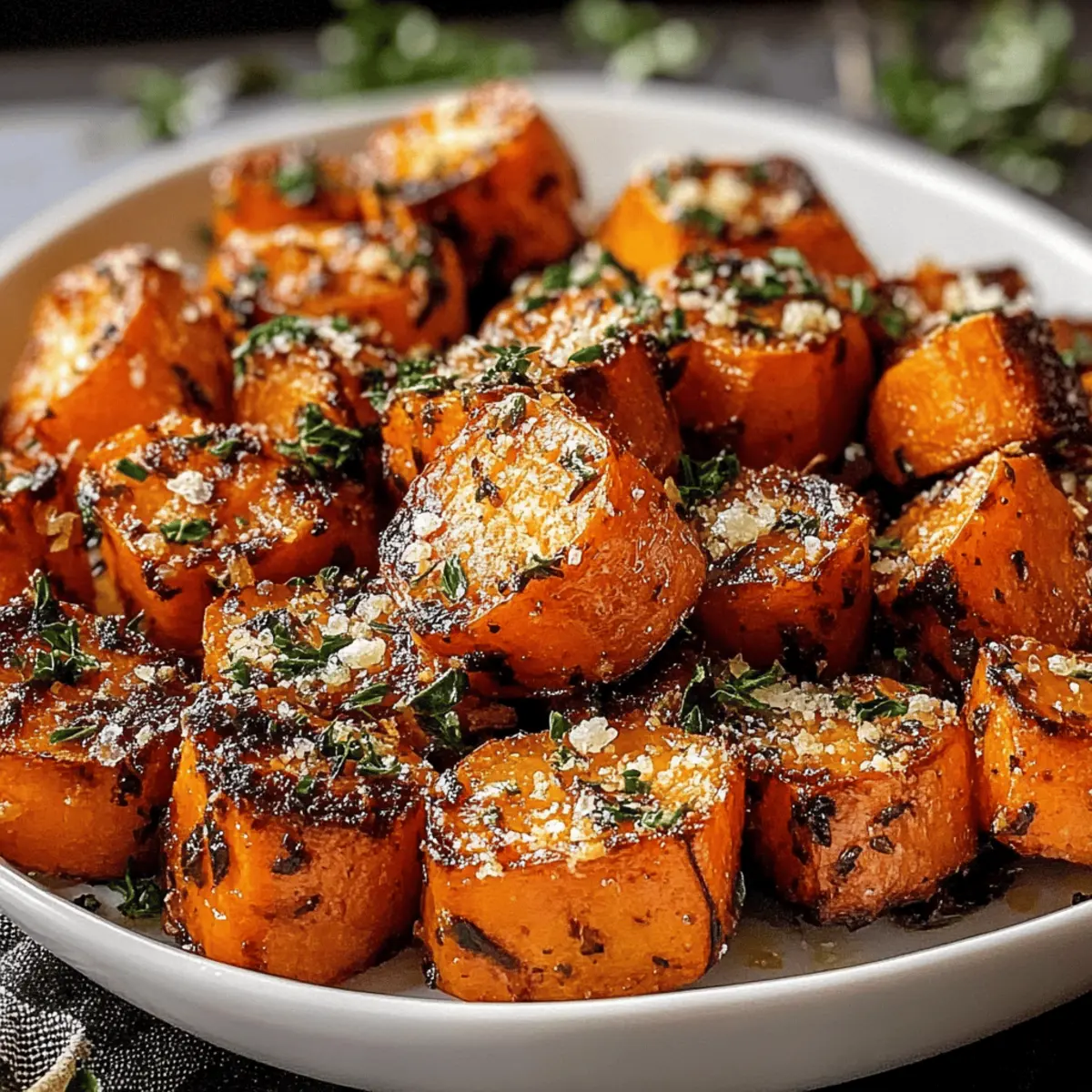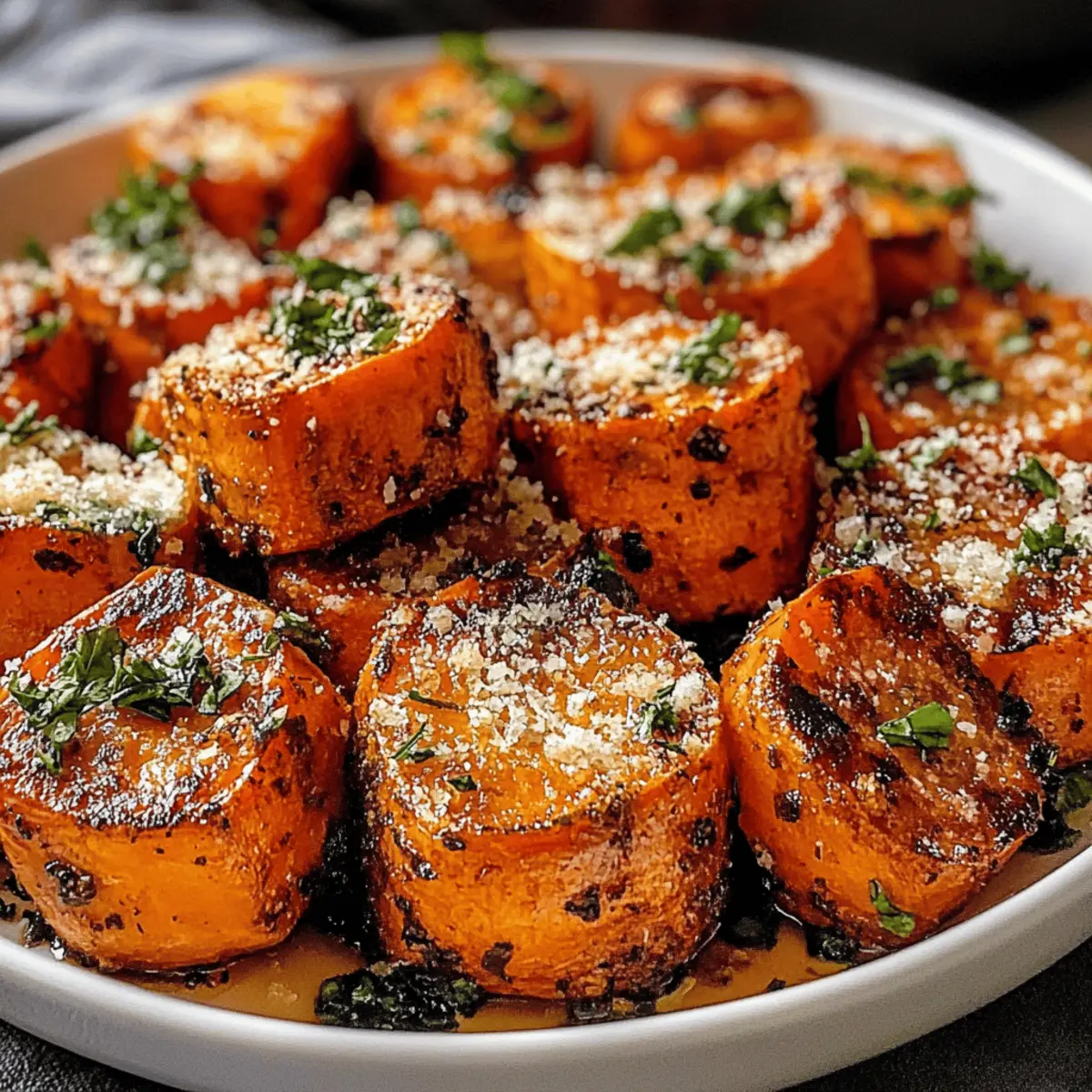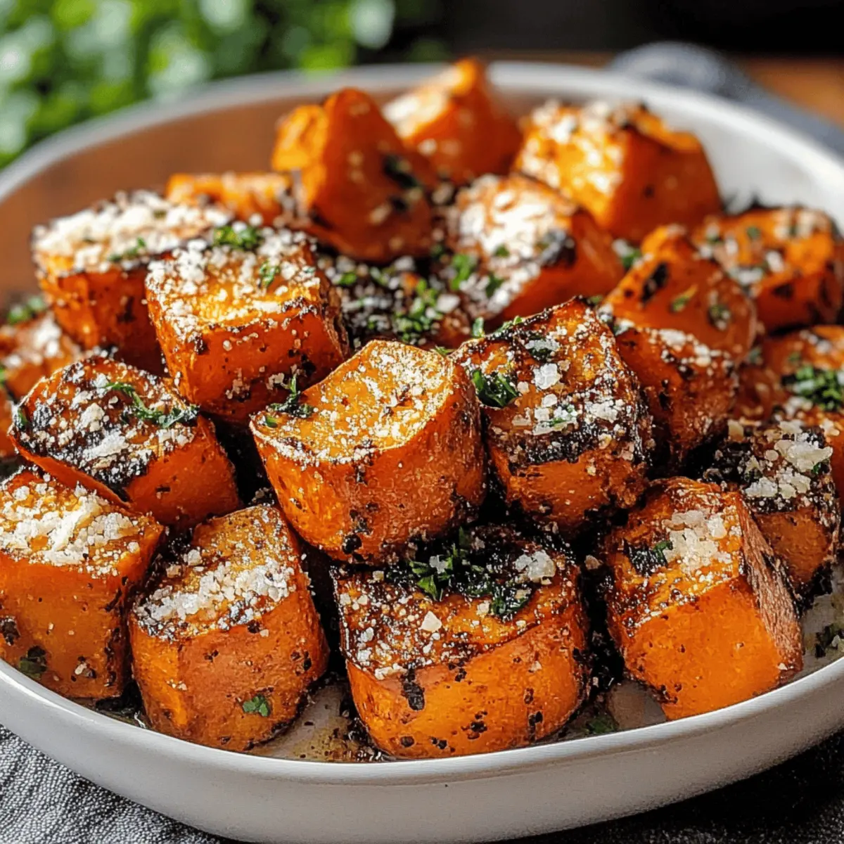 As I stood in my kitchen, a medley of garlic and Parmesan filled the air, instantly transporting me to my favorite cozy bistro. This is my secret for turning simple meals into delightful experiences: Garlic Parmesan Roasted Sweet Potatoes. This recipe merges the natural sweetness of tender roasted sweet potatoes with savory garlic and a satisfying cheesy crust, making it the perfect side dish for any occasion. Not only is this dish incredibly easy to whip up, but it’s also customizable, allowing you to play with flavors to suit your mood. Whether you’re enjoying a quiet night in or hosting friends, this healthy side is sure to impress and take the spotlight on your dinner table. Are you ready to elevate your cooking game with this delicious recipe? Why are Garlic Parmesan Sweet Potatoes a must-try? Simplicity at its Best: This recipe is incredibly easy to follow, requiring just a few ingredients and minimal prep time. Flavor Explosion: The combination of caramelized sweet potatoes, aromatic garlic, and rich Parmesan makes for a mouthwatering dish that adds sophistication to any meal. Customizable Delight: You can easily adjust this recipe to fit your dietary preferences—try adding nuts for crunch or even swapping in vegan cheese for a plant-based option. Crowd-Pleaser: Whether for a weeknight dinner or a festive gathering, these sweet potatoes are sure to wow your guests, providing a comforting yet elegant side. Don’t forget to check out our Garlic Parmesan Chicken for a tasty pairing that complements this side perfectly! Garlic Parmesan Roasted Sweet Potatoes Ingredients For the Sweet Potatoes • Sweet Potatoes – The star of the dish, providing natural sweetness and a lovely creamy texture. You can alternate with butternut squash for an exciting twist. • Olive Oil – Necessary for roasting, enhancing flavor and achieving that delightful crispiness. Avocado oil works well too with its higher smoke point. For the Garlic Parmesan Coating • Garlic – Infuses the dish with savory depth; adjust the amount to your garlic preference. • Parmesan Cheese – Adds a salty, nutty flavor and helps create a golden, crispy exterior; feel free to substitute with vegan Parmesan if desired. • Dried Italian Seasoning – Brings a beautiful herbal note, or you can use fresh herbs like rosemary or thyme instead. • Salt – Necessary for amplifying all flavors; consider using sea salt for a gourmet twist. • Black Pepper – Introduces mild heat; freshly ground pepper is recommended for a richer flavor. For Garnishing • Fresh Parsley – Adds a pop of color and freshness; you can skip it or swap in fresh basil for a different flavor. • Melted Butter – An optional drizzle to add richness; use vegan butter if you’re keeping it plant-based. With these delightful ingredients, your Garlic Parmesan Roasted Sweet Potatoes will transform any meal into a feast! Step‑by‑Step Instructions for Garlic Parmesan Roasted Sweet Potatoes Step 1: Prepare Sweet Potatoes Start by washing and peeling 2 large sweet potatoes, then cut them into 1-inch cubes. This size ensures even roasting, allowing the sweet potatoes to caramelize beautifully. Place the cubed sweet potatoes in a large mixing bowl for easy tossing in the next steps. Step 2: Make Garlic Parmesan Coating In a small bowl, combine 3 cloves of minced garlic, ½ cup of grated Parmesan cheese, 1 teaspoon of dried Italian seasoning, ½ teaspoon of salt, and ¼ teaspoon of freshly ground black pepper. Mix these ingredients thoroughly until you have a fragrant, flavorful garlic Parmesan coating ready to enhance your sweet potatoes. Step 3: Coat Sweet Potatoes Drizzle about 2 tablespoons of olive oil over the cubed sweet potatoes in the bowl. Add the garlic Parmesan mixture on top, then toss everything together until the sweet potatoes are evenly coated and glistening with the oil and seasoning. This step helps achieve a delectable crispy texture during roasting. Step 4: Preheat Oven Preheat your oven to 400°F (200°C) and prepare a baking sheet by lining it with parchment paper. This will prevent any sticking and promote even browning. It’s essential to have the oven hot and ready, as this step is crucial for caramelizing your Garlic Parmesan Roasted Sweet Potatoes to perfection. Step 5: Roast Spread the coated sweet potatoes in a single layer on the prepared baking sheet, ensuring they are not crowded. This allows for proper airflow, which is critical for achieving that crispiness. Roast in the preheated oven for 20-25 minutes, stirring halfway through until they are golden brown and tender when pierced with a fork. Step 6: Finish and Serve Once roasted, remove the sweet potatoes from the oven. If desired, drizzle with melting butter for an extra richness and toss gently to incorporate. Garnish with freshly chopped parsley for a pop of color before serving warm. Your Garlic Parmesan Roasted Sweet Potatoes are now ready to be enjoyed alongside your favorite mains! Expert Tips for Garlic Parmesan Roasted Sweet Potatoes • Even Cuts: Ensure sweet potatoes are cut into uniform cubes for consistent cooking, preventing some pieces from becoming mushy while others remain undercooked. • Avoid Overcrowding: Spread the sweet potatoes in a single layer on the baking sheet. Crowding can lead to steaming instead of roasting, preventing that desired crispy texture. • Customize Flavors: Adjust the garlic and Parmesan cheese amounts based on your taste preferences. Feel free to experiment with different herbs for a unique twist on the Garlic Parmesan Roasted Sweet Potatoes. • Check Doneness: Use a fork to test if the sweet potatoes are tender before removing them from the oven. They should be golden and caramelized, reflecting their sweet, savory goodness. • Air Fryer Method: If using an air fryer, preheat to 380°F (190°C) and avoid overcrowding the basket. This ensures every piece achieves that delightful crunch! How to Store and Freeze Gar