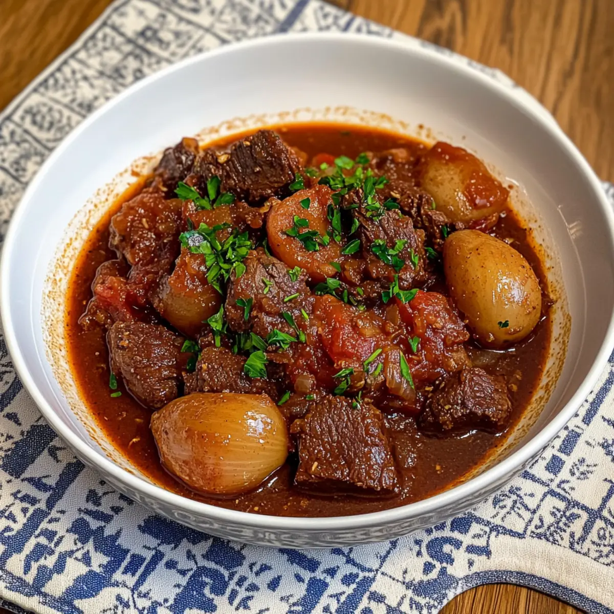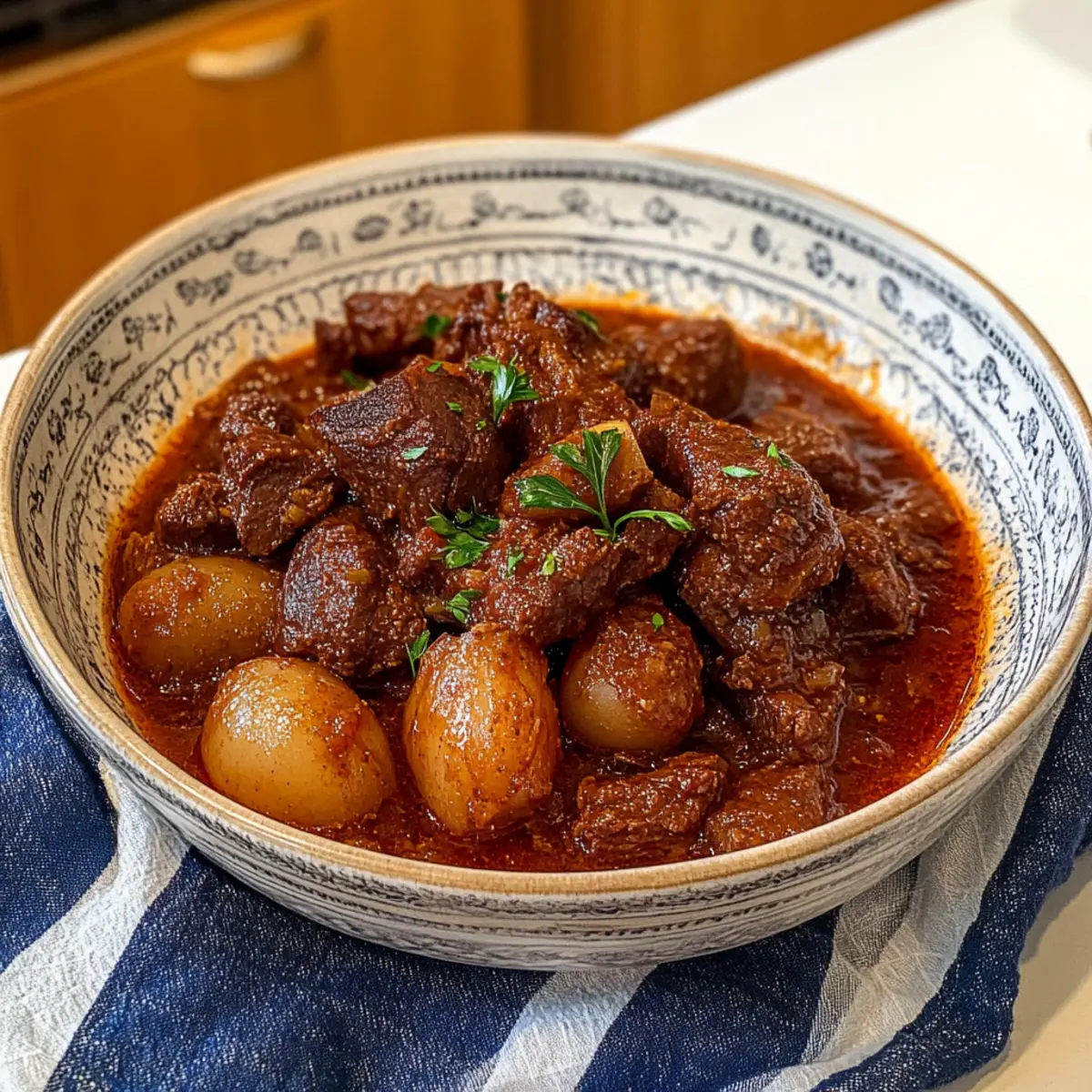 As the sun dips below the horizon, I often find myself craving the comforting warmth of a hearty meal, especially on those chilly evenings. Enter Beef Stifado, a traditional Greek beef stew with shallots that transforms an ordinary dinner into a culinary escape to Greece. This dish is not only a crowd-pleaser but also a wonderful one-pot wonder, meaning less clean-up for us busy home chefs. Slow-cooked beef melds beautifully with a medley of aromatic spices, creating a rich and savory sauce that makes every bite feel like a warm hug. Perfect for family gatherings or quiet nights in, this cozy comfort food will surely elevate your weeknight dinner routine. Are you ready to journey into the heart of Greece with me? Why is Beef Stifado Special? Comforting Tradition: This Greek Beef Stew with Shallots showcases a recipe that has been cherished over generations, combining love and tradition in every bite. One-Pot Wonder: Simplifying your cooking experience, this dish requires only a single pot, allowing you to savor the moment instead of stressing over dishes. Rich Aromatics: With its unique blend of cinnamon and vinegar, each forkful bursts with complex flavors, making it a delightful surprise at the dinner table. Versatile Pairings: Enjoy it with crusty bread or creamy mashed potatoes, making it adaptable to suit your mood or dietary needs. Make-Ahead Friendly: Stifado tastes even better the next day, so feel free to prepare it in advance for those busy weeknights. Enjoy a flavor-packed dish that harmonizes beautifully with other recipes like Savory Ground Beef. Greek Beef Stew with Shallots Ingredients For the Stew Shallots – Adds sweetness and depth to the stew; fresh or frozen pearl onions can work for a milder flavor. Beef Chuck – The main protein; choose tender cuts like chuck, cut into 3-4 inch pieces for optimal slow cooking. Olive Oil – Provides healthy fats and flavor; opt for high-quality olive oil for the best results. Garlic – Adds robust flavor; grate or mince to blend seamlessly into the sauce. Red Wine Vinegar – Introduces acidity and depth; balsamic vinegar can substitute if you prefer extra sweetness. Canned Crushed Tomatoes – Convenient and flavorful; fresh tomatoes can be used but will require crushing. Tomato Paste – Intensifies tomato flavor and adds to the stew’s heartiness. Dried Oregano – Offers herbal notes; if desired, basil can be a good substitute. Sugar – Balances acidity from the tomatoes; adjust to your taste. Bay Leaves – Enhances the savory flavor profile. Peppercorns – Contributes subtle spiciness; feel free to adjust according to your preference. Cinnamon Stick – Brings warmth; pairs beautifully with the stew’s sauce. Whole Cloves – Adds earthy sweetness; used alongside cinnamon for depth. Salt and Pepper – Essential for seasoning; taste as you cook and adjust accordingly. Water – Ensures the sauce adequately covers the beef while simmering. Red Pepper Flakes – Optional for those who enjoy a spicy kick. This Greek Beef Stew with Shallots is a hearty, comforting dish perfect for cozy nights in! Step‑by‑Step Instructions for Greek Beef Stew with Shallots Step 1: Sauté the Shallots In a large pot, heat a generous drizzle of olive oil over medium heat. Add the shallots and sauté for about 5-10 minutes until they turn golden and fragrant. This step lays the foundation for your Greek beef stew with shallots, so stir occasionally to ensure they don’t burn. Once golden, remove the shallots from the pot and set aside for later. Step 2: Brown the Beef With the shallots set aside, increase the heat to medium-high and add batches of beef chuck pieces to the pot. Brown each side for about 5 minutes to develop a rich color; be careful not to overcrowd the pot, as this can lead to steaming instead of browning. Once browned, return all the beef to the pot, creating a flavorful base for your stew. Step 3: Add Garlic and Tomato Paste Stir in the minced garlic with the browned beef, cooking for an additional minute until you can smell its aroma. Next, add the tomato paste, stirring it into the meat for about 30 seconds to let the flavors meld together. This step enhances the depth of your Greek beef stew with shallots before moving on to incorporate the remaining ingredients. Step 4: Combine Remaining Ingredients Now it’s time to stir in all remaining ingredients: canned crushed tomatoes, red wine vinegar, oregano, sugar, bay leaves, cinnamon stick, whole cloves, and enough water to cover the beef completely. Bring this mixture to a boil over high heat, then reduce the heat to low to let it simmer gently. Allow the aromas to fill your kitchen as you wait for the flavors to develop. Step 5: Simmer for Tenderness Cover the pot and let your Greek beef stew simmer for about 1 hour and 15 minutes. During this time, the beef should become incredibly tender while the sauce thickens beautifully. Check occasionally, stirring and tasting to adjust the seasoning with salt and pepper as needed—this is where the magic happens! Step 6: Add the Shallots After the beef has had time to tenderize, gently shake the reserved shallots into the pot to incorporate them. Simmer again for an additional 30 minutes, which allows the sweetness of the shallots to meld beautifully with the savory flavors of the stew. Keep the pot covered, enhancing the final dish’s cozy aroma. Step 7: Serve and Enjoy Once the stew has reached your desired thickness and the beef is fork-tender, it’s time to serve. Ladle the Greek beef stew with shallots into bowls, allowing guests to savor the rich sauce. Pair it with rice, crusty bread, or creamy mashed potatoes to soak up all that deliciousness, making for a truly hearty meal! How to Store and Freeze Beef Stifado Fridge: Store your Greek Beef Stew with Shallots in an airtight container for up to 3 days. Always allow it to cool before transferring to the fridge to maintain its flavor and texture. Freezer: For longer sto