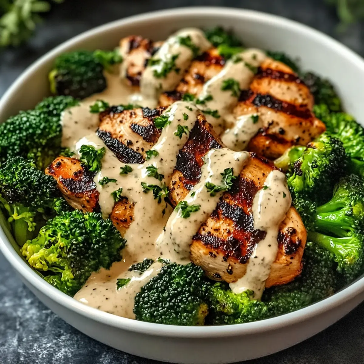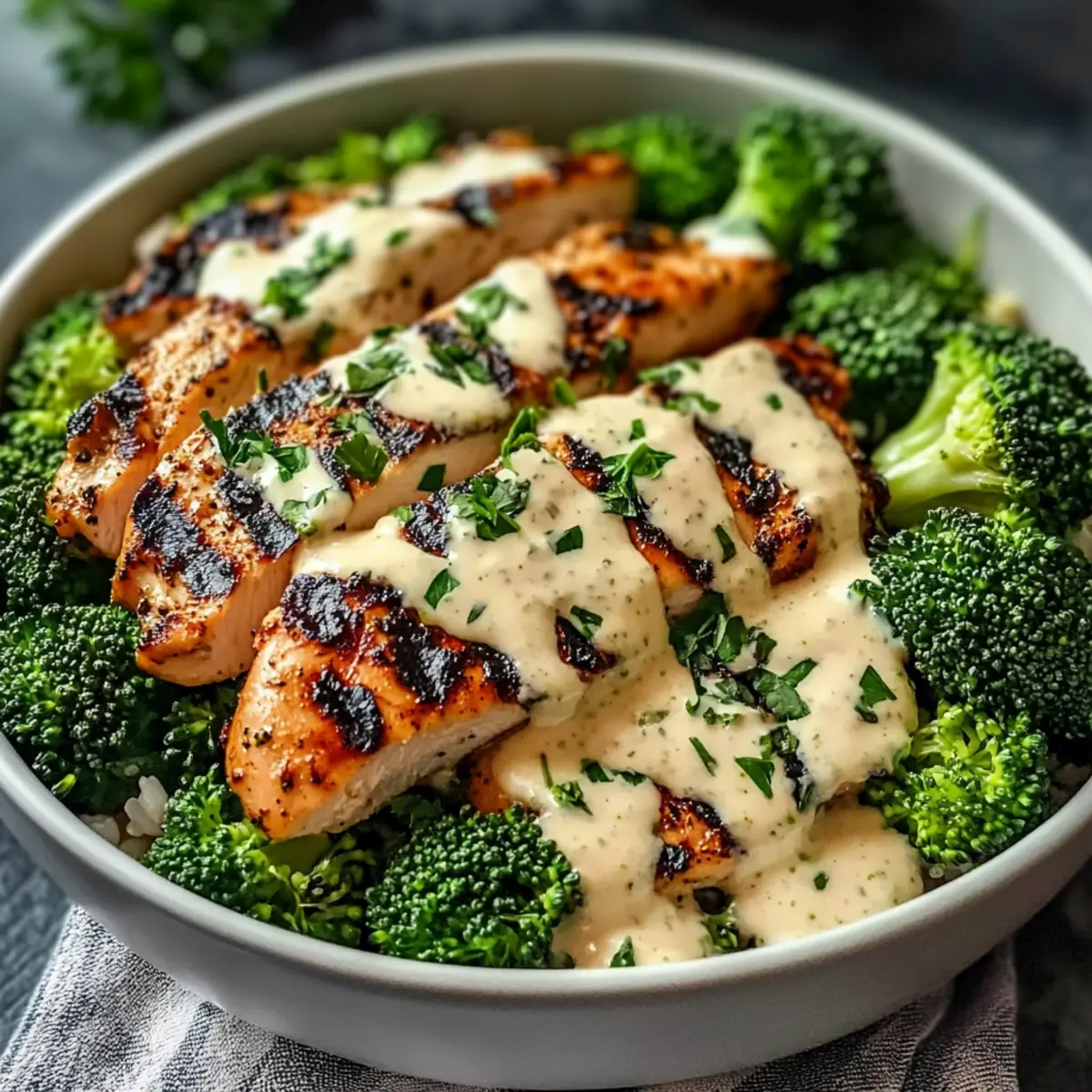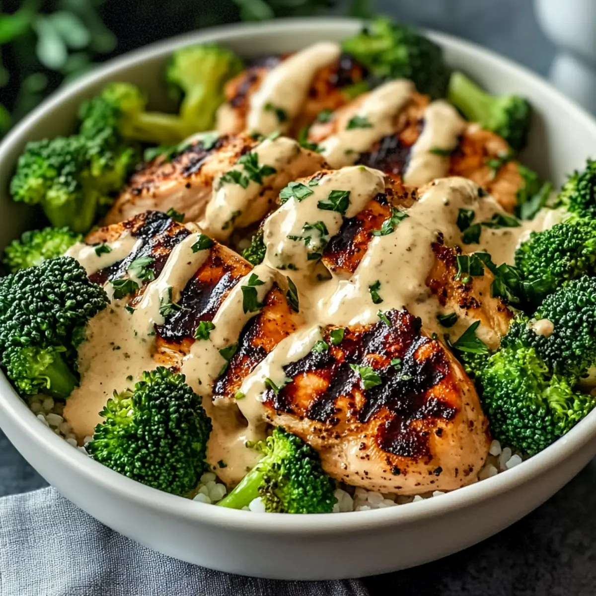 As I was tossing the last of my grilled chicken into a bowl, a warm, garlicky aroma filled my kitchen—nostalgia hit me like a wave. My Grilled Chicken & Broccoli Bowls with Creamy Garlic Sauce aren’t just a meal; they’re a comforting hug after a long day. This quick dinner comes together in a flash, making it perfect for those busy weeknights when you crave something wholesome. With tender, smoky chicken, vibrant roasted broccoli, and a rich creamy sauce, these bowls are not only satisfying but easily customizable. Whether you prefer tofu instead of chicken or a fluffier base of quinoa or cauliflower rice, there’s a version here for everyone. Intrigued? Let’s dive into this deliciously simple recipe that’s sure to steal the spotlight at your dinner table! Why choose Grilled Chicken & Broccoli Bowls? Quick Preparation: This dish comes together in just 30 minutes, making it perfect for those hectic weeknights when you need a wholesome meal fast. Endless Customization: Whether you’re craving grilled chicken, tofu, or chickpeas, this recipe allows you to swap proteins effortlessly, ensuring there’s something for everyone at the table. Delicious Creamy Sauce: The velvety garlic sauce adds a deliciously rich layer of flavor that’s simply irresistible and elevates the entire dish. Healthy and Nutritious: Packed with lean protein and fresh veggies, these bowls provide nutrients without skimping on taste, making them perfect for meal prep or family-friendly dinners. Crowd-Pleasing Appeal: These bowls are ideal for feeding picky eaters, as everyone can build their own dinner just the way they like it—let’s not forget to check out Garlic Parmesan Chicken for more easy meal ideas! Grilled Chicken & Broccoli Bowls Ingredients • Discover the key ingredients for this wholesome meal. For the Chicken • Chicken Breasts – A lean protein source that keeps the dish satisfying; substitute with grilled tofu or chickpeas for a vegetarian twist. For the Vegetables • Broccoli Florets – Adds vital nutrients and a crunchy bite; feel free to mix in roasted bell peppers or zucchini for added flavor. For the Grains • Grains (Rice/Quinoa/Couscous) – Acts as the hearty base for each bowl; cauliflower rice can be a great grain-free alternative. For the Sauce • Garlic – Provides the aromatic flavor in the creamy sauce; increase the amount for garlic lovers. • Heavy Cream – Creates a rich, velvety texture; plant-based cream alternatives work for a dairy-free option. • Butter – Enhances the sauce’s depth of flavor, but olive oil can be used for a dairy-free substitute. For Roasting • Olive Oil – Essential for grilling and roasting; no substitutes needed for this recipe. • Salt & Pepper – Season to taste, adjusting based on personal preference. • Lemon Juice – Brightens the dish and enhances the flavor of the broccoli; no alternatives required. For Garnishing • Optional Herbs (Parsley/Chives) – Adds freshness and flavor; feel free to use thyme or basil for a different twist. Step‑by‑Step Instructions for Grilled Chicken & Broccoli Bowls with Creamy Garlic Sauce Step 1: Prep the Chicken Start by seasoning the chicken breasts liberally with olive oil, salt, pepper, and any optional spices you enjoy. Preheat your grill to medium-high heat, around 400°F. Place the chicken on the grill and cook for about 6-7 minutes on each side, or until the internal temperature reaches 165°F. Once cooked through, remove the chicken and let it rest before slicing. Step 2: Roast the Broccoli While the chicken is grilling, preheat your oven to 400°F. In a mixing bowl, toss the broccoli florets with olive oil, lemon juice, and salt. Spread the broccoli evenly on a baking sheet and roast for 15-20 minutes. The broccoli should be crisp-tender and slightly browned when done, providing a lovely contrast to the creamy elements of the Grilled Chicken & Broccoli Bowls. Step 3: Cook the Grains Prepare your choice of grains, such as rice, quinoa, or couscous, according to the package instructions. Typically, this will involve boiling water and simmering the grains for about 15-20 minutes, depending on the type. Keep the grains warm as you proceed with the rest of the recipe. They will serve as the hearty base for your delicious bowls. Step 4: Make the Creamy Garlic Sauce In a saucepan over medium heat, melt 2 tablespoons of butter. Add minced garlic and sauté for about 1-2 minutes, until fragrant but not browned. Carefully stir in heavy cream and season with salt and pepper to taste. Allow the sauce to simmer gently for 5-7 minutes, stirring occasionally, until it thickens and is creamy, perfect for drizzling over the bowls. Step 5: Assemble the Bowls Now it’s time to create your Grilled Chicken & Broccoli Bowls! In serving bowls, start with a generous layer of warm grains. Next, add sliced grilled chicken on top, followed by the golden roasted broccoli. Drizzle the creamy garlic sauce generously over each bowl and finish with a sprinkle of your choice of fresh herbs for added flavor and vibrancy. Grilled Chicken & Broccoli Bowls Variations Feel free to make this recipe your own by trying out exciting variations that will tantalize your taste buds! Tofu Swap: Use grilled tofu instead of chicken for a delightful vegetarian alternative that’s equally satisfying. Chickpea Twist: Replace chicken with chickpeas for added protein and a nutty flavor; simply roast them until golden for a crispy texture. Cauliflower Rice: Opt for cauliflower rice instead of grains for a delicious low-carb option that retains the dish’s hearty essence. Extra Veggies: Boost nutrition by adding roasted bell peppers or zucchini; simply toss them in olive oil and roast alongside the broccoli. Spicy Kick: Sprinkle red pepper flakes or cayenne pepper on your dish for some heat; it elevates the comforting flavors with a zesty bite. Creamy Vegan Sauce: Swap heavy cream for a plant-based cream alternative to creat
