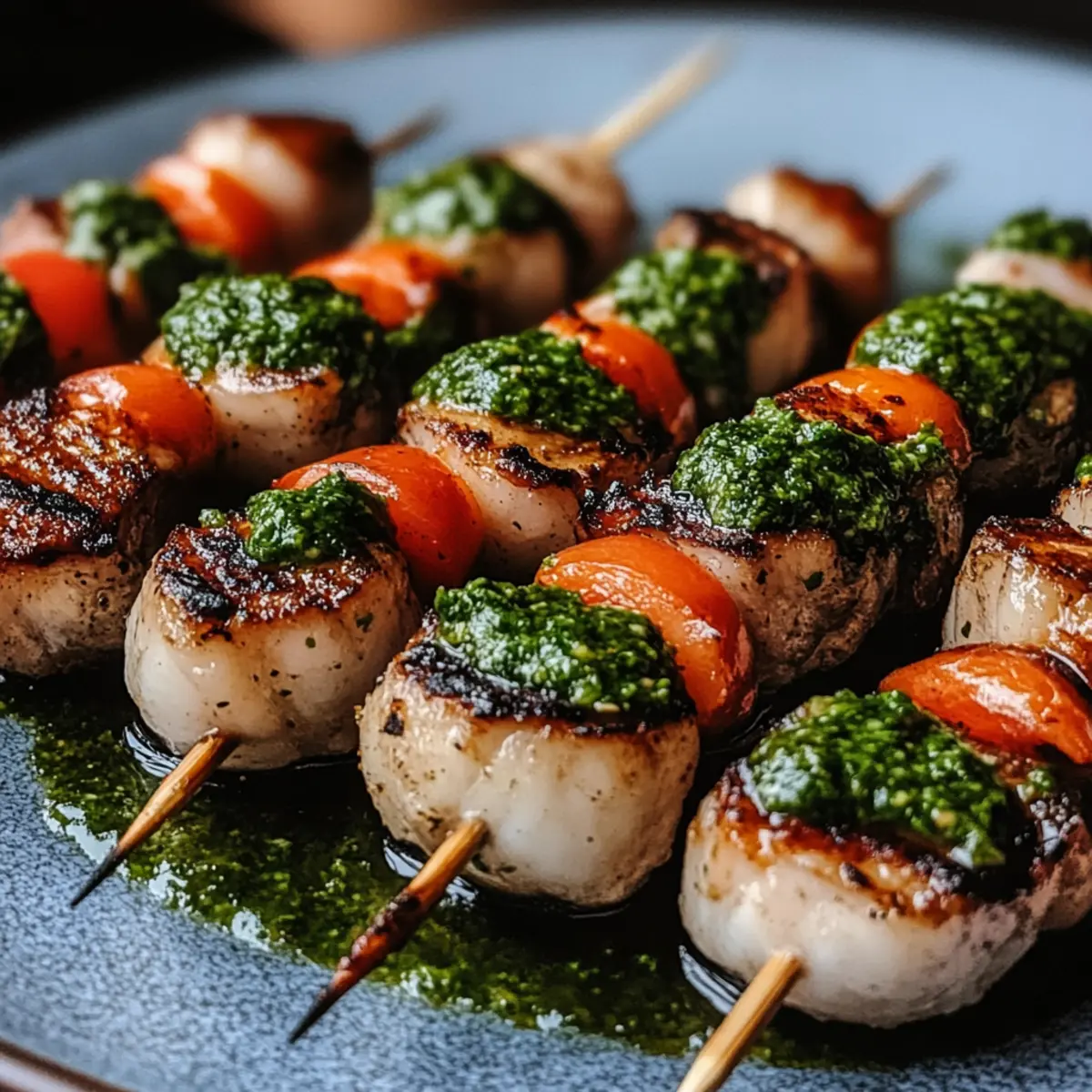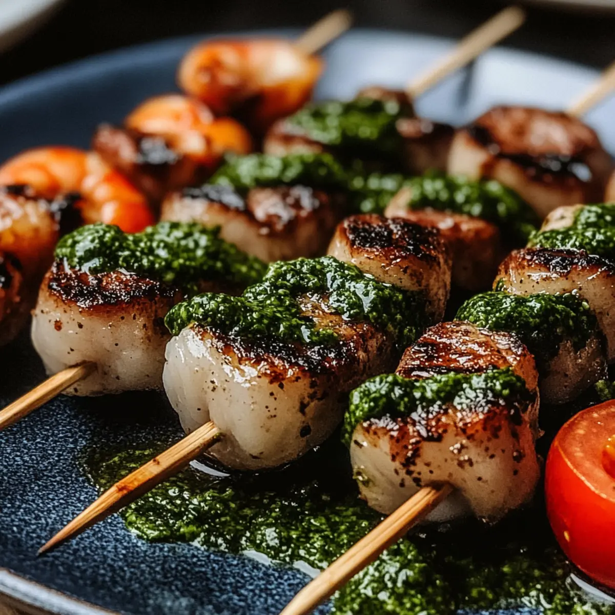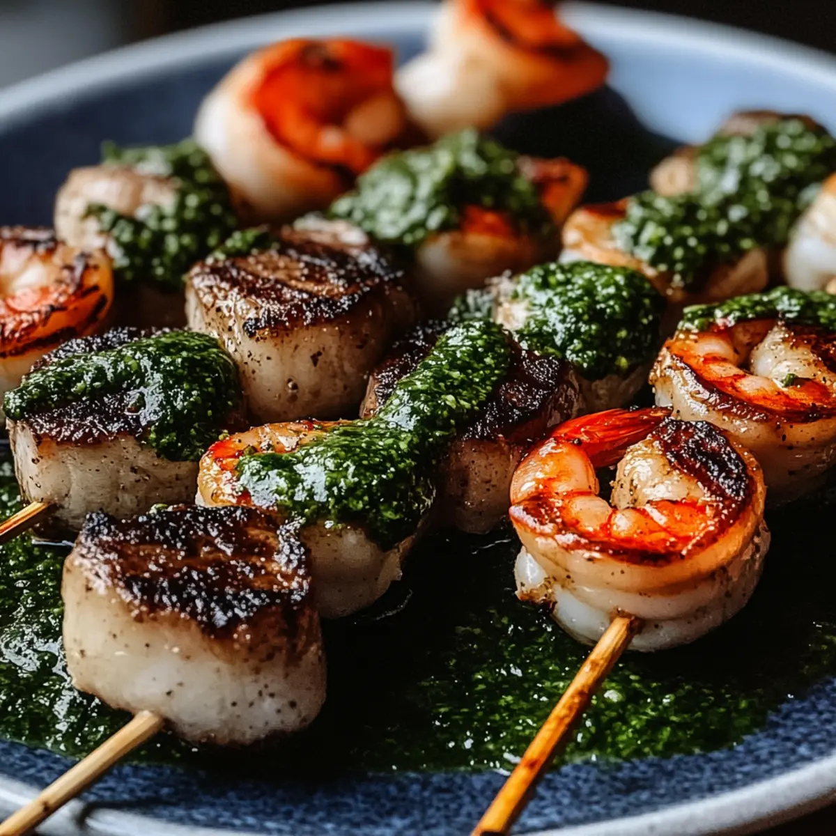 As I pulled out the grill for a weekend backyard celebration, I couldn’t help but feel the excitement in the air—the promise of friends, laughter, and delicious food. You’re going to love these Grilled Surf & Turf Skewers with Chimichurri! They’re a delightful blend of succulent steak and juicy shrimp, drizzled with a zesty chimichurri sauce that adds a fresh kick to every bite. Not only are these skewers quick to prepare—making them perfect for last-minute gatherings—but they’re also incredibly versatile; you can mix up your proteins to suit any palate. Ready to fire up the grill and create your favorite summer memories? Let’s get cooking! Why Are These Skewers a Must-Try? Flavor Explosion: Each bite of these Grilled Surf & Turf Skewers with Chimichurri delivers a burst of savory goodness, combining the rich taste of steak with succulent shrimp. Quick Prep: Ready in under 30 minutes, these skewers are perfect for those spontaneous summer BBQs or weeknight dinners. Crowd-Pleasing: A guaranteed hit with friends and family, they appeal to all taste buds and can be easily customized with your favorite proteins, like swapping shrimp for scallops. Fresh & Vibrant: The zesty chimichurri sauce brightens the dish, making it refreshingly wholesome. Try these alongside our Grilled BBQ Chicken Skewer Salad for added flavor variety! Easy Clean-Up: With minimal cookware and prep, you can enjoy your meal without the hassle of a lengthy clean-up. These skewers embody everything you love about summer grilling—fun, flavor, and friends! Grilled Surf & Turf Skewers Ingredients • Dive into a flavor fiesta! For the Skewers Steak – Choose sirloin or ribeye for a juicy experience! Shrimp – Opt for large, peeled, and deveined shrimp for the best seafood flavor. For the Marinade Olive Oil – Essential for moisture and flavor; avocado oil makes a great alternative. Garlic – Fresh garlic delivers a deeper flavor, but powdered garlic can be used in a pinch. Lemon Juice – Brightens the dish; substitute with lime juice if desired. Salt & Pepper – Always add to taste for perfect seasoning. For the Chimichurri Sauce Parsley – Fresh parsley adds that vibrant color and herbaceous kick! Red Pepper Flakes – For a hint of heat, adjust according to spice preference. Vinegar – A splash of red wine or apple cider vinegar enhances the tangy flavor. For Assembly Skewers – Use either metal or soaked wooden skewers to prevent burning (soak for at least 30 minutes). Get ready to savor the deliciousness of Grilled Surf & Turf Skewers with Chimichurri! Step‑by‑Step Instructions for Grilled Surf & Turf Skewers with Chimichurri Step 1: Preheat the Grill Begin by preheating your grill or grill pan over medium-high heat, aiming for a temperature around 400°F (200°C). This will ensure that the Grilled Surf & Turf Skewers achieve a delightful sear while locking in the juices of the steak and shrimp. While the grill heats, prepare your ingredients for the marinade, setting the stage for tasty skewers. Step 2: Combine Ingredients In separate bowls, combine steak cubes and peeled, deveined shrimp, tossing them individually with olive oil, minced garlic, lemon juice, salt, and pepper. Make sure to coat each piece evenly to maximize flavor. Allow the steak and shrimp to marinate for about 15 minutes at room temperature, letting them soak up the bold seasoning as you prepare the skewers. Step 3: Prepare Skewers If using wooden skewers, soak them in water for at least 30 minutes to prevent burning on the grill. Meanwhile, gather your metal skewers or prepare the soaked wooden ones for the Grilled Surf & Turf Skewers assembly. This key step ensures that your skewers will hold up well during grilling and enhance the overall presentation of your dish. Step 4: Assemble Skewers Once your shrimp and steak are ready, thread them alternately onto the skewers, leaving a bit of space between pieces to allow for even cooking. Aim for a colorful arrangement with both proteins, which will not only look stunning but also provide a delicious variety of flavors in each bite. Set your assembled skewers aside while the grill reaches the desired heat. Step 5: Grill the Skewers Carefully place the assembled Grilled Surf & Turf Skewers on the preheated grill. Cook for about 2-3 minutes on each side, turning until the shrimp turns a lovely pink and the steak develops a nice charred crust. For optimal doneness, check the steak’s internal temperature—medium-rare should reach 130-135°F (54-57°C) and feel slightly firm. Step 6: Rest & Serve Once the skewers are cooked to perfection, remove them from the grill and let them rest for about 2-3 minutes. This resting period allows the juices to redistribute within the meat. Just before serving, drizzle the Grilled Surf & Turf Skewers generously with chimichurri sauce, garnishing your creation with this zesty condiment, which complements the smoky flavors beautifully. Make Ahead Options These Grilled Surf & Turf Skewers with Chimichurri are perfect for meal prep enthusiasts looking to save time during busy weeknights! You can marinate the steak and shrimp up to 24 hours in advance, allowing the flavors to deepen. Simply combine the olive oil, garlic, lemon juice, salt, and pepper with the proteins, and refrigerate them in separate containers until you’re ready to cook. Additionally, prepare the chimichurri sauce a day ahead so the flavors meld beautifully overnight. When you’re ready to serve, just thread the marinated seafood and steak onto skewers and grill for about 2-3 minutes per side. This way, you’ll enjoy restaurant-quality results with minimal effort! Storage Tips for Grilled Surf & Turf Skewers with Chimichurri Fridge: Store leftover grilled skewers in an airtight container in the refrigerator for up to 2 days. This keeps them fresh while saving those delicious flavors for later! Freezer: If you want to enjoy them longer, you can freeze the skewers for up to 2 m
