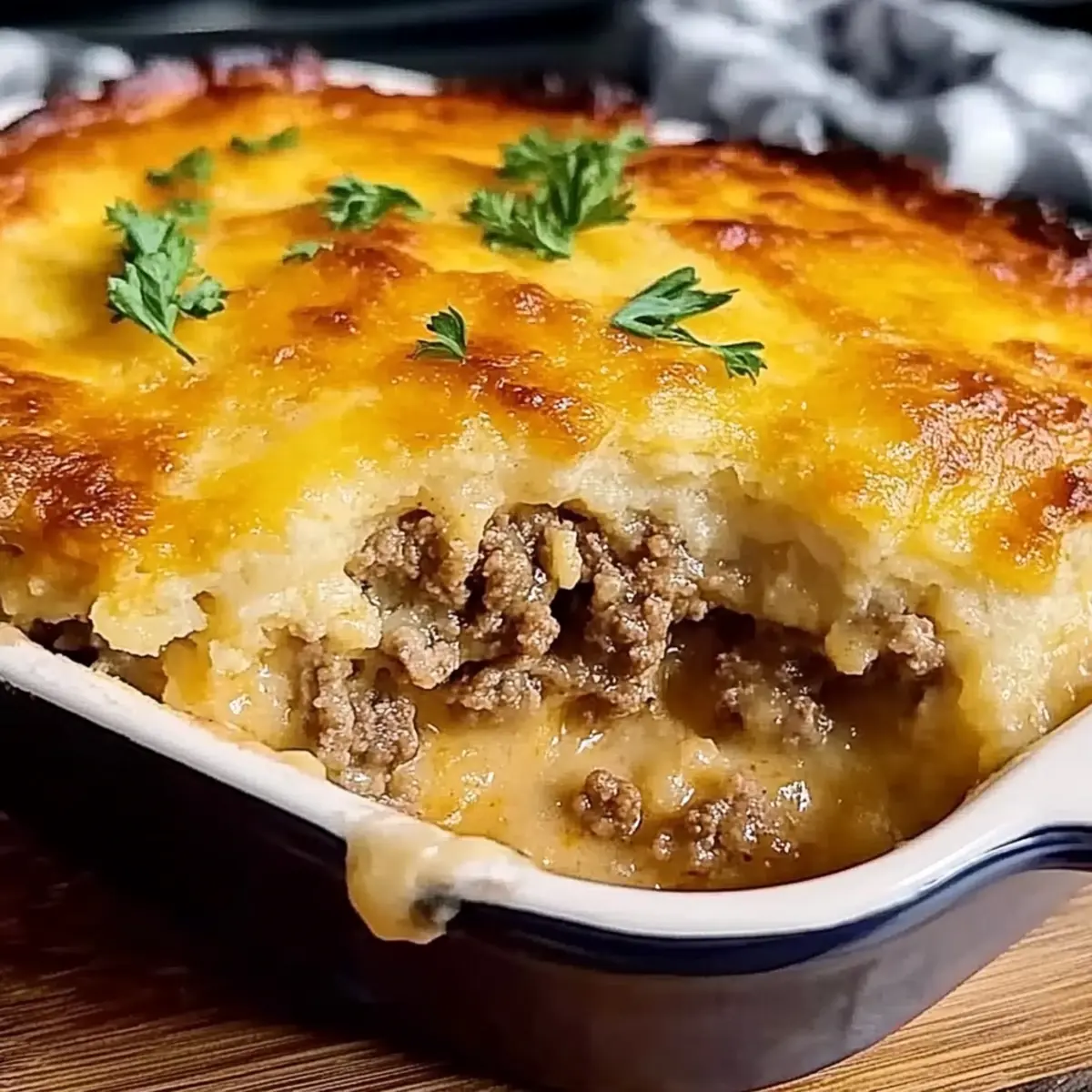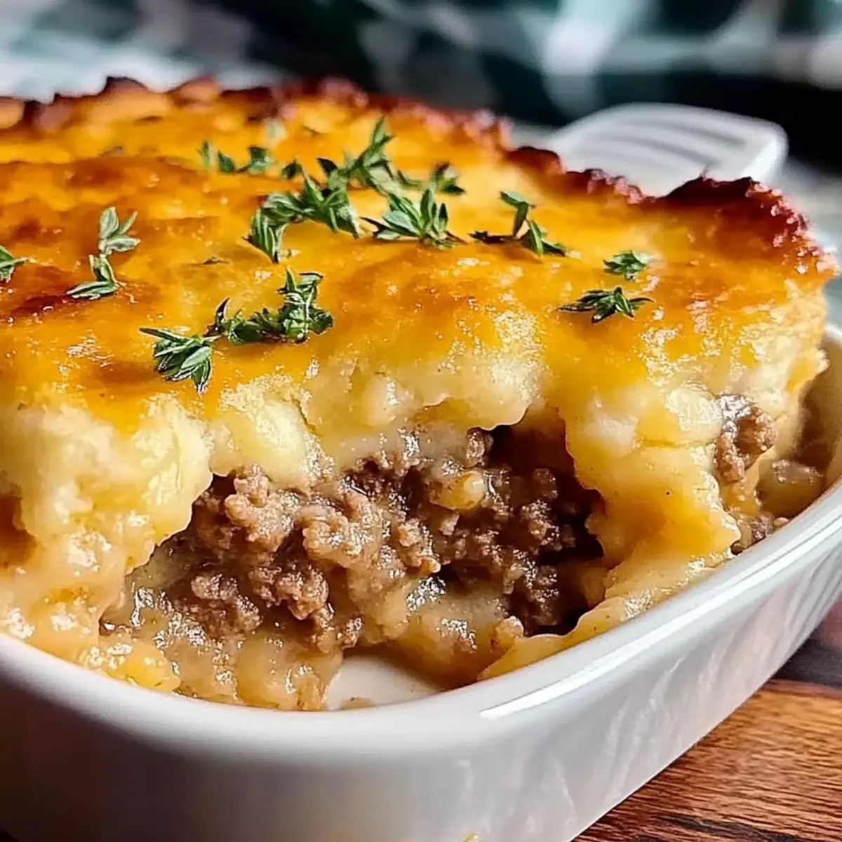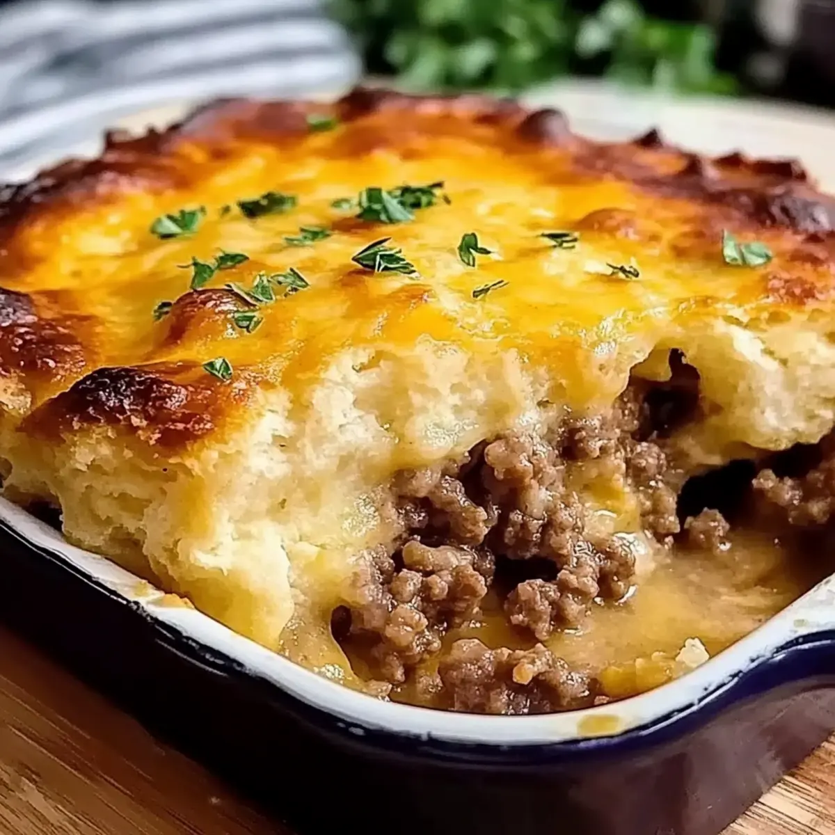 In the cozy heart of Southern kitchens, there’s a comforting dish that never fails to bring smiles—Cheddar Bay Ground Beef Cobbler. As I savored each bite, a delightful explosion of rich beef and colorful veggies nestled under a golden, cheesy biscuit topping warmed my spirit. This mouthwatering Ground Beef Cobbler is not only quick to whip up, making it perfect for busy weeknights, but it also doubles as a showstopper for gathering friends and family around the dinner table. Imagine the aroma wafting through your home, inviting loved ones to come share a hearty meal that feels like a warm hug. Do you find yourself craving comfort food that’s both satisfying and easy to prepare? Let’s dive into this delicious recipe that might just become your new favorite! Why is Ground Beef Cobbler a Must-Try? Comforting Warmth: Each bite of this Ground Beef Cobbler wraps you in a cozy embrace, making it the ultimate comfort food to chase away any blues. Satisfying Layers: You’ll love the way the savory beef filling mingles with vibrant veggies, all blanketed under a golden, flaky biscuit topping. Quick and Easy: With minimal prep time, you can have this delightful dish ready in just over 30 minutes—ideal for hectic weeknights! Endless Adaptations: Whether you opt for a classic version or use lentils for a hearty vegetarian twist, this recipe is versatile enough to please everyone at the table. Perfect for Sharing: Expect smiles and compliments when you serve this, making it a fantastic centerpiece for family gatherings or casual get-togethers. Explore more hearty meals like Korean Ground Beef and Savory Ground Beef as well! Ground Beef Cobbler Ingredients For the Filling • Ground Beef – Provides a hearty protein base; substitute with ground turkey or chicken for a leaner option. • Onion (1/2 diced) – Adds flavor depth; use shallots for a milder taste. • Garlic (2 cloves minced) – Enhances aroma and flavor; use garlic powder for a milder taste. • Paprika (1/2 tsp) – Adds mild heat and color; cayenne can be used for a spicier kick. • Dried Thyme (1/2 tsp) – Contributes herbal notes; can be substituted with oregano. • Worcestershire Sauce (1 tbsp) – Adds umami; soy sauce is a good alternative for a different flavor profile. • Tomato Paste (2 tbsp) – Contributes richness; can be replaced with ketchup in a pinch. • Beef Broth (1/2 cup) – Moisture and flavor; use vegetable broth for a vegetarian option. • Salt and Pepper – Basic seasoning; adjust to taste. For the Biscuit Topping • Shredded Cheddar Cheese (1 cup) – Delivers creaminess and flavor; substitute with mozzarella for a milder flavor. • All-Purpose Flour (1 1/4 cups) – Structure for biscuit topping; consider gluten-free flour as a substitute. • Baking Powder (1 tbsp) – Helps biscuits rise; ensure it’s fresh for best results. • Garlic Powder (1/2 tsp) – Adds flavor to biscuit topping; omit if sensitive to garlic. • Salt (1/4 tsp) – Basic seasoning; adjust as necessary. • Cold Unsalted Butter (1/2 cup cubed) – Adds flakiness; coconut oil can be used for dairy-free. • Whole Milk (1/2 cup) – Binds ingredients; non-dairy milk can be used as an alternative. Optional Finish • Chopped Fresh Parsley (1 tbsp) – Garnish for color and freshness; omit if unavailable. • Melted Butter (2 tbsp) for brushing – Enhances flavor and browning of biscuits; can be flavored with herbs. Step‑by‑Step Instructions for Ground Beef Cobbler Step 1: Preheat and Prepare Begin by preheating your oven to 400°F (200°C). While the oven warms, grease a 9×13-inch baking dish to ensure the cobbler doesn’t stick. This will be the vessel for your delicious Ground Beef Cobbler, holding all those savory flavors and your golden biscuit topping. Step 2: Brown the Beef In a large skillet over medium heat, brown 1 pound of ground beef for about 5-7 minutes, breaking it apart as it cooks. You’ll know it’s ready when it’s no longer pink and has a nice, browned color. After cooking, drain off any excess fat to keep your cobbler light and flavorful. Step 3: Sauté the Aromatics Add ½ diced onion and 2 minced garlic cloves to the skillet with the beef. Sauté for 3-4 minutes, stirring occasionally until the onion turns translucent and fragrant. This step enhances the base of your Ground Beef Cobbler, combining savory notes with the rich flavor of beef. Step 4: Mix in Seasonings Stir in ½ teaspoon paprika, ½ teaspoon dried thyme, 1 tablespoon Worcestershire sauce, 2 tablespoons tomato paste, and ½ cup beef broth. Allow this mixture to simmer for about 5 minutes, stirring until the ingredients meld. You’ll see the sauce thicken slightly, creating a rich filling for the cobbler. Step 5: Add Cheese and Transfer Once simmered, mix in 1 cup of shredded cheddar cheese until melted. This will create a creamy filling that binds all the flavors together. Carefully transfer the beef mixture to your prepared baking dish, spreading it evenly across the bottom for a solid foundation of your Ground Beef Cobbler. Step 6: Combine Biscuit Ingredients In a mixing bowl, whisk together 1¼ cups of all-purpose flour, 1 tablespoon baking powder, ½ teaspoon garlic powder, and ¼ teaspoon salt. Cut in ½ cup of cold cubed unsalted butter using a pastry cutter or your fingers until the mixture resembles coarse crumbs. This will form a flaky topping on your cobbler. Step 7: Incorporate Cheese and Milk Stir in 1 cup of shredded cheddar cheese and ½ cup of whole milk into the flour mixture until just combined. Be careful not to overmix; a little lumpiness is okay! This step creates a tender biscuit topping that will elevate the Ground Beef Cobbler with its cheesy goodness. Step 8: Top the Beef Filling Using a large spoon, drop spoonfuls of the biscuit dough over the beef filling in the baking dish. Space them out evenly, allowing some gaps for steam to escape while baking. This will create a beautiful, rustic appearance 