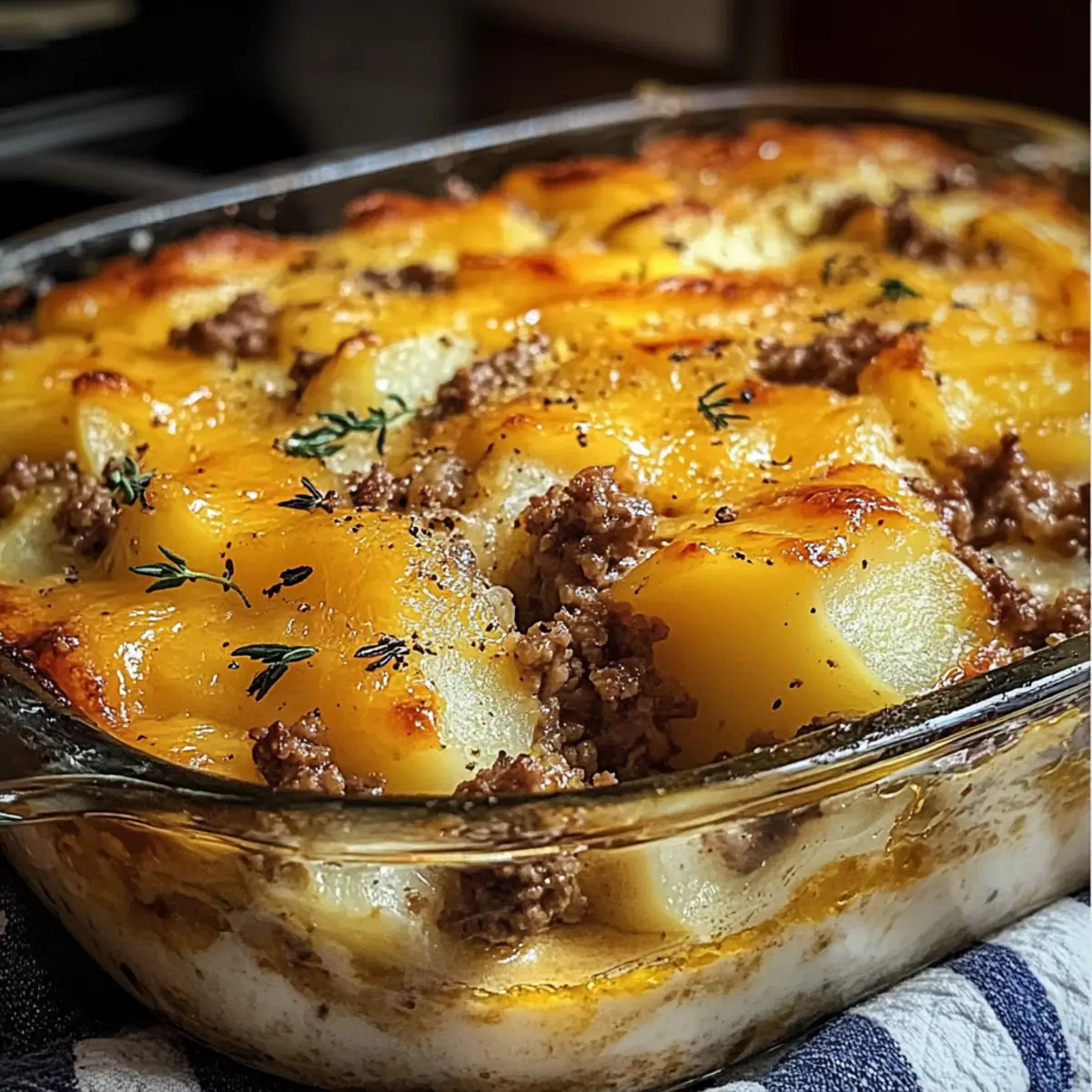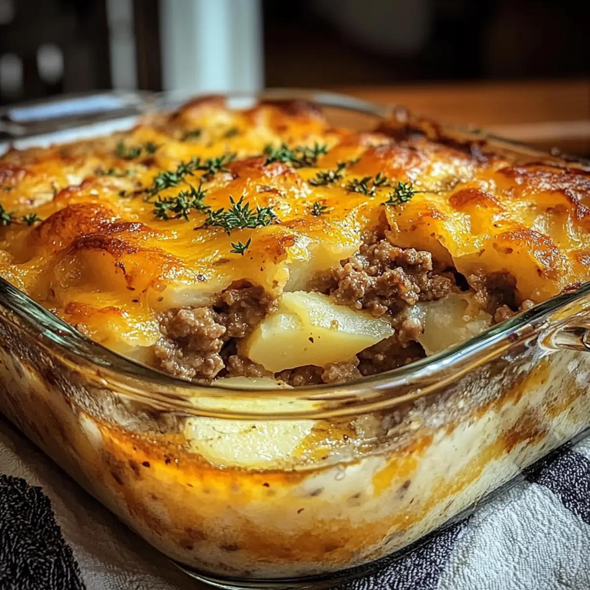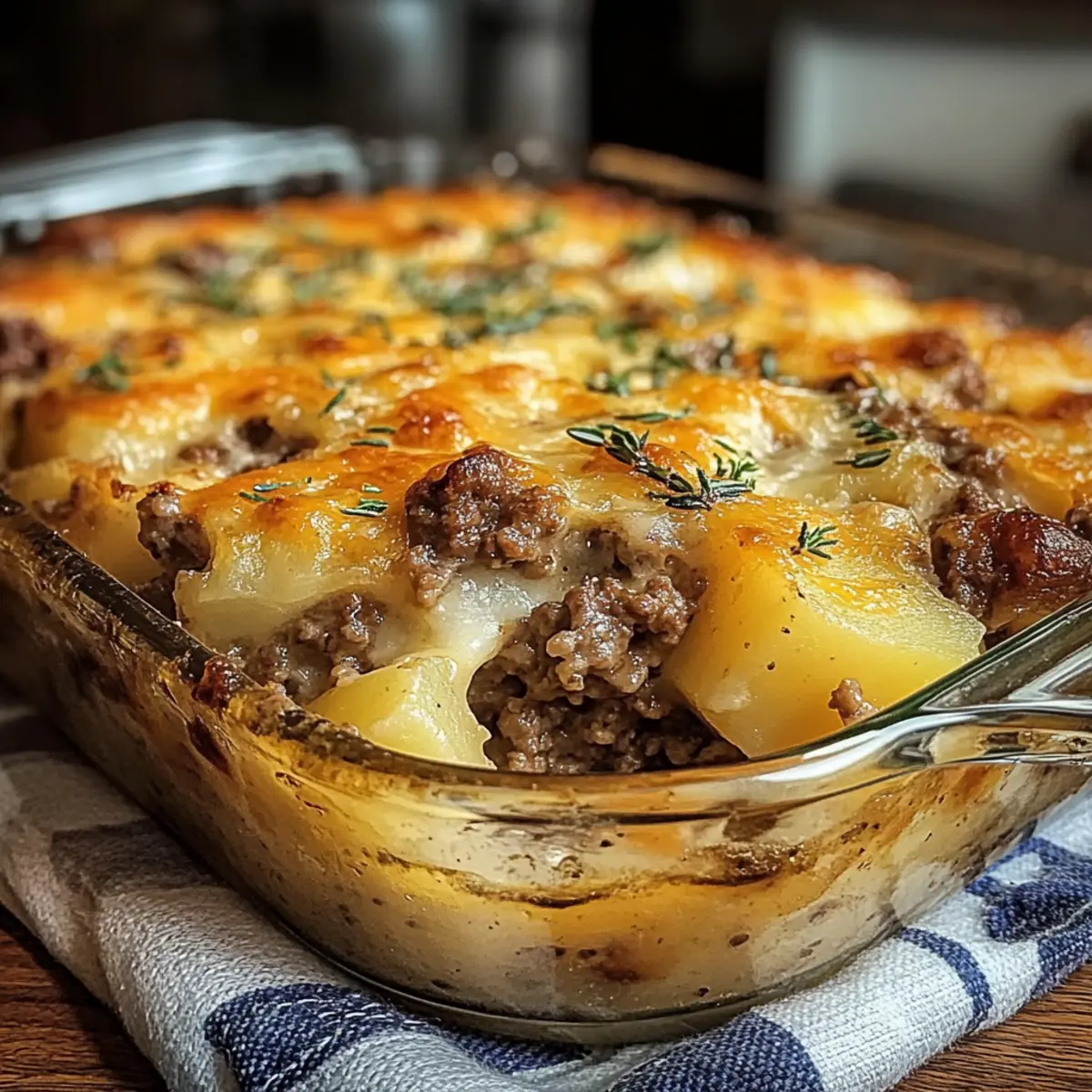 This Hamburger Potato Casserole combines savory ground beef and creamy potatoes, making it a family favorite for dinner.