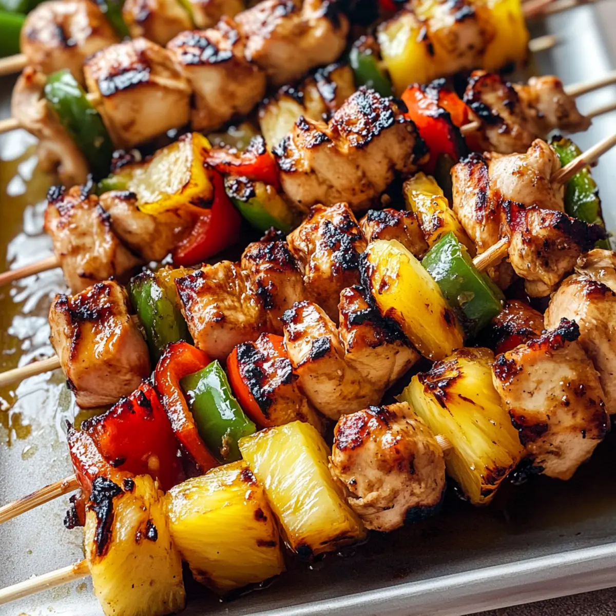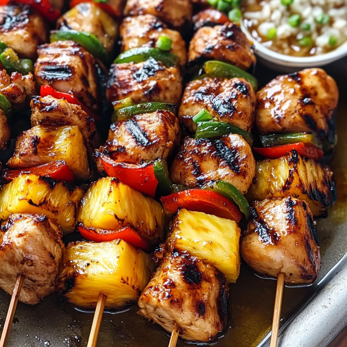 The aroma of summer fills the air as I flip the sizzling Hawaiian Chicken Skewers on the grill, each piece perfectly caramelized and infused with flavor. Bursting with tropical goodness, these skewers showcase juicy chicken marinated in a delicious blend of barbecue and soy sauce, paired with sweet, grilled pineapple and colorful veggies like bell peppers and red onion. This recipe is not only a quick prep option for busy weeknight dinners but also a fantastic crowd-pleaser for weekend parties. Whether you’re planning a family gathering or a cozy meal at home, these Hawaiian Chicken Skewers are sure to steal the show. Are you ready to elevate your grilling game and dive into a tropical feast? Why Are Hawaiian Chicken Skewers Essential? Tropical Flavors: Experience the irresistible taste of the tropics with the sweet and savory marriage of marinated chicken and caramelized pineapple. Quick and Easy: Perfect for those busy weeknights, these skewers come together effortlessly, ensuring you won’t spend hours in the kitchen. Crowd-Pleaser: Ideal for gatherings, impress your friends and family with a dish that is both beautiful and bursting with flavor, making every bite memorable. Versatile Options: Customize your skewers with variations like beef teriyaki skewers or a health-conscious vegetarian version that satisfy different tastes. Vibrant Presentation: The combination of colorful veggies and juicy pineapple ensures your dish is not just delicious but also stunning to behold. Hawaiian Chicken Skewers Ingredients For the Marinade • Barbecue Sauce – Adds sweetness and depth; can substitute with teriyaki sauce for a tangier flavor. • Soy Sauce – Provides umami richness; use tamari for a gluten-free option. • Rice Wine Vinegar – Contributes acidity to balance sweetness; regular vinegar can substitute if unavailable. • Sesame Oil – Adds nutty depth; substitute with olive oil for a different flavor profile. • Garlic (2 cloves, minced) – Enhances flavor complexity; fresh is preferable to powdered. • Fresh Ginger (1 tablespoon, minced) – Provides warmth and spice; ground ginger can be used in a pinch. • Honey (1 teaspoon) – Mild sweetness that can be replaced with agave nectar. • Kosher Salt – Enhances all flavors; adjust based on personal taste. • Crushed Red Pepper Flakes (1 teaspoon) – Adds heat; adjust quantity for spiciness preference. For the Skewers • Chicken Breasts (2, cut into 1-inch pieces) – The protein base for skewers; ensure pieces are uniform for even cooking. • Fresh Pineapple (2 cups, cubed) – Offers tropical sweetness; can substitute with mango for variety. • Green Bell Peppers (2, diced) – Adds crunch and color; bell pepper varieties may be mixed. • Red Onion (1, diced) – Provides a mild tang; can use sweet onion for a sweeter flavor. For Serving • White Rice – A perfect base to pair with the skewers; substitute with cauliflower rice for a low-carb option. • Fresh Cilantro (2 teaspoons, chopped) – Garnish that adds freshness to your Hawaiian Chicken Skewers. Step‑by‑Step Instructions for Hawaiian Chicken Skewers Step 1: Prepare Marinade In a medium mixing bowl, whisk together the barbecue sauce, soy sauce, rice wine vinegar, sesame oil, minced garlic, fresh minced ginger, honey, kosher salt, and crushed red pepper flakes. This flavorful marinade will set the stage for your Hawaiian Chicken Skewers. Aim for a smooth mixture that combines all the ingredients beautifully to ensure an even taste throughout. Step 2: Marinate Chicken Add the 1-inch pieces of chicken breast to the marinade, ensuring they’re well coated. Cover the bowl with plastic wrap and refrigerate for at least 30 minutes, or up to overnight for deeper flavor infusion. During this time, the chicken will absorb the savory and sweet notes, making each skewer irresistibly delicious and perfectly suited for grilling. Step 3: Prep Vegetables While the chicken marinates, wash and prepare your vegetables. Cut the fresh pineapple, green bell peppers, and red onion into 1-inch pieces to ensure they cook evenly. This colorful mix adds a refreshing twist to your Hawaiian Chicken Skewers, enhancing both the flavor and visual appeal of your dish. Step 4: Preheat Grill As you finish prepping, preheat your grill to a medium-high temperature of around 400°F. Once heated, brush the grill grates lightly with oil to prevent your Hawaiian Chicken Skewers from sticking. This step ensures a beautiful char and grill marks on your skewers, enhancing the overall flavor while keeping everything intact. Step 5: Assemble Skewers Thread the marinated chicken and your prepared vegetables onto skewers, alternating between chicken, pineapple, bell pepper, and onion pieces. Aim for a snug fit without overcrowding to allow for even cooking and proper heat circulation. This assembly creates a stunning presentation and maximizes the delightful tropical medley in each bite of your Hawaiian Chicken Skewers. Step 6: Grill Skewers Place the assembled skewers on the grill, cooking for 12 to 15 minutes. Turn them every 3 to 4 minutes to achieve uniform grilling. Keep an eye out for the chicken to reach an internal temperature of 165°F, indicated by a firm texture and a golden-brown exterior. The caramelization of the pineapple will also add a hint of sweetness. Step 7: Finish with Marinade In the last few minutes of grilling, brush the skewers with the reserved marinade to enhance the flavors further. This step not only adds an extra layer of richness but also coats the skewers in a delightful glaze. Monitor closely to prevent any burning while achieving that perfect, flavorful finish on your Hawaiian Chicken Skewers. Step 8: Rest and Serve Once cooked, remove the skewers from the grill and let them rest for 2 to 3 minutes. This resting period allows the juices to redistribute, ensuring tender chicken. Serve the skewers over a bed of fluffy white rice, garnished with freshly chopped ci